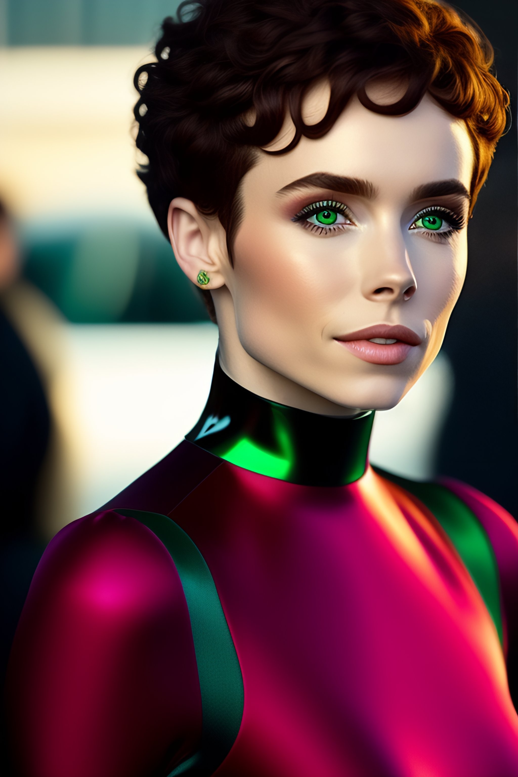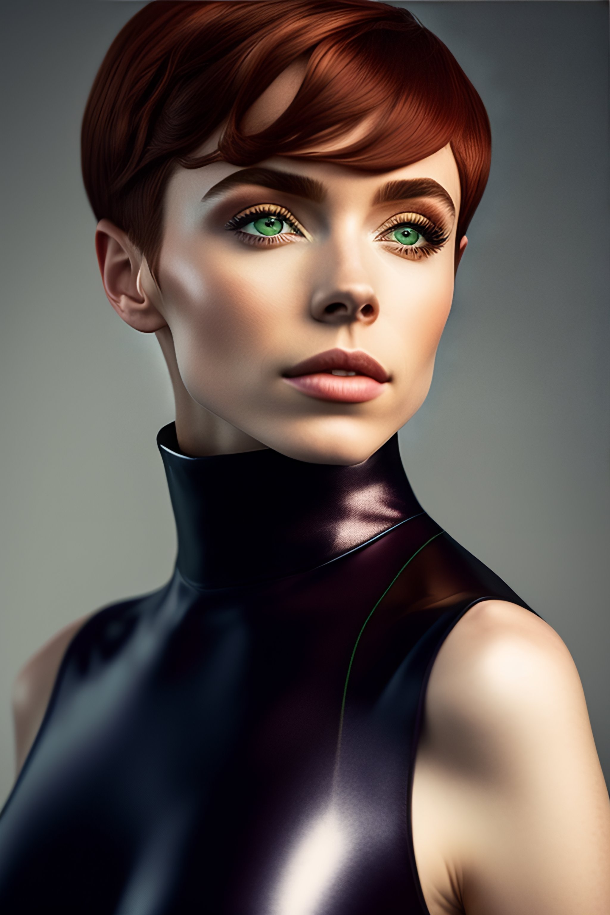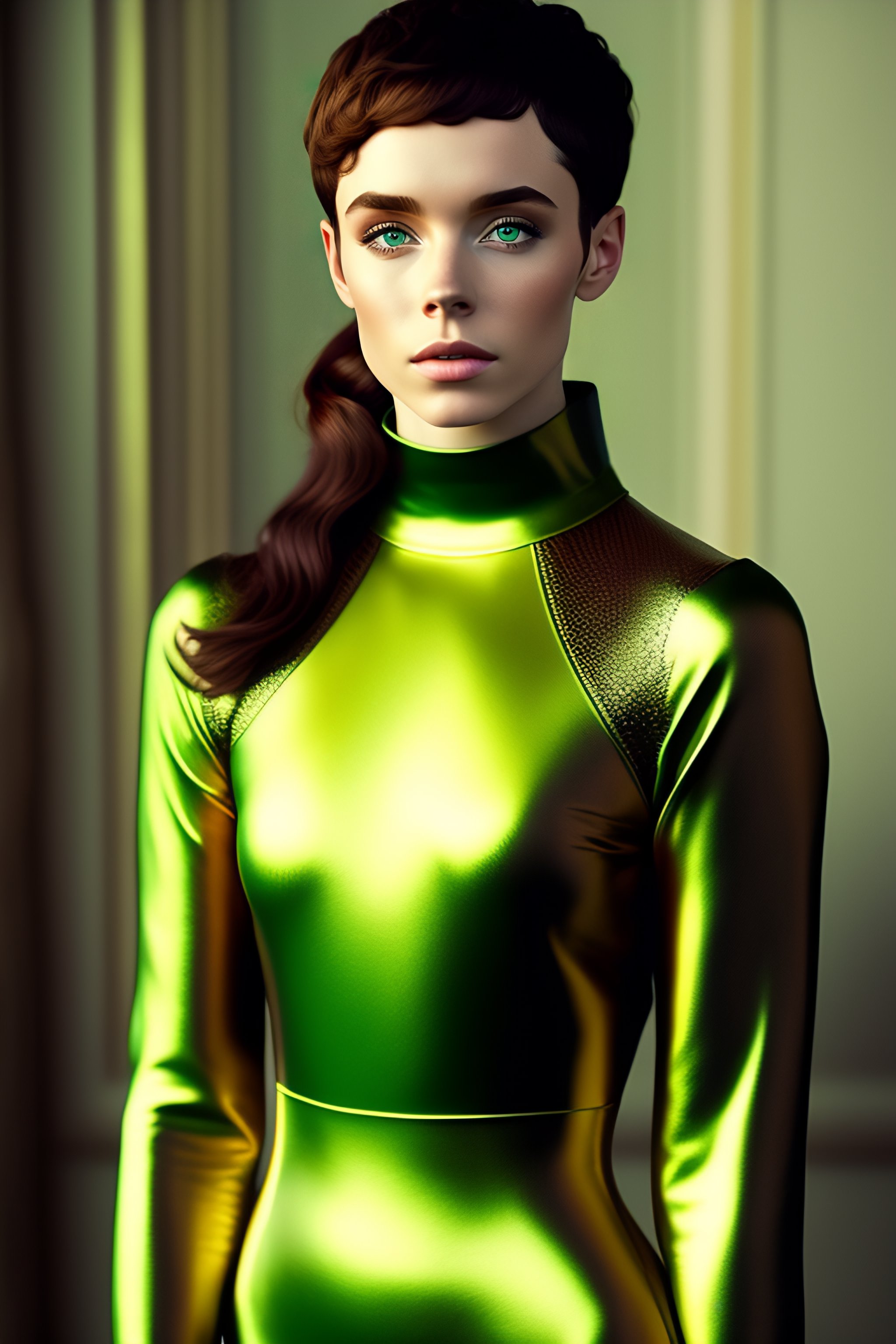 Sophia lillis with green hair brown eyes, shiny sleek smooth soft matte full-body turtleneck catsuit.