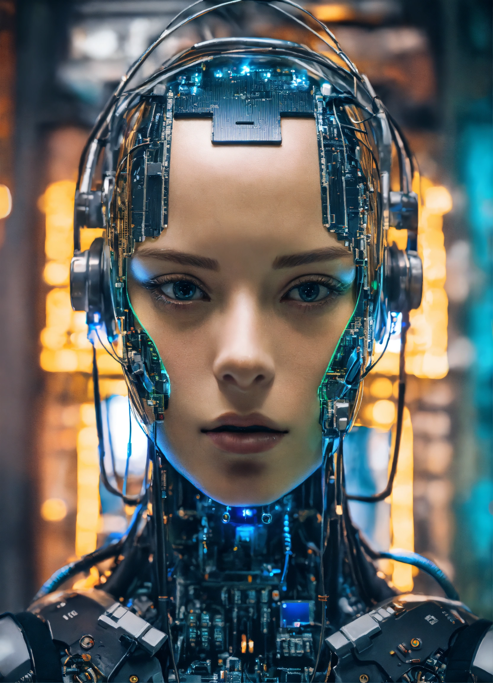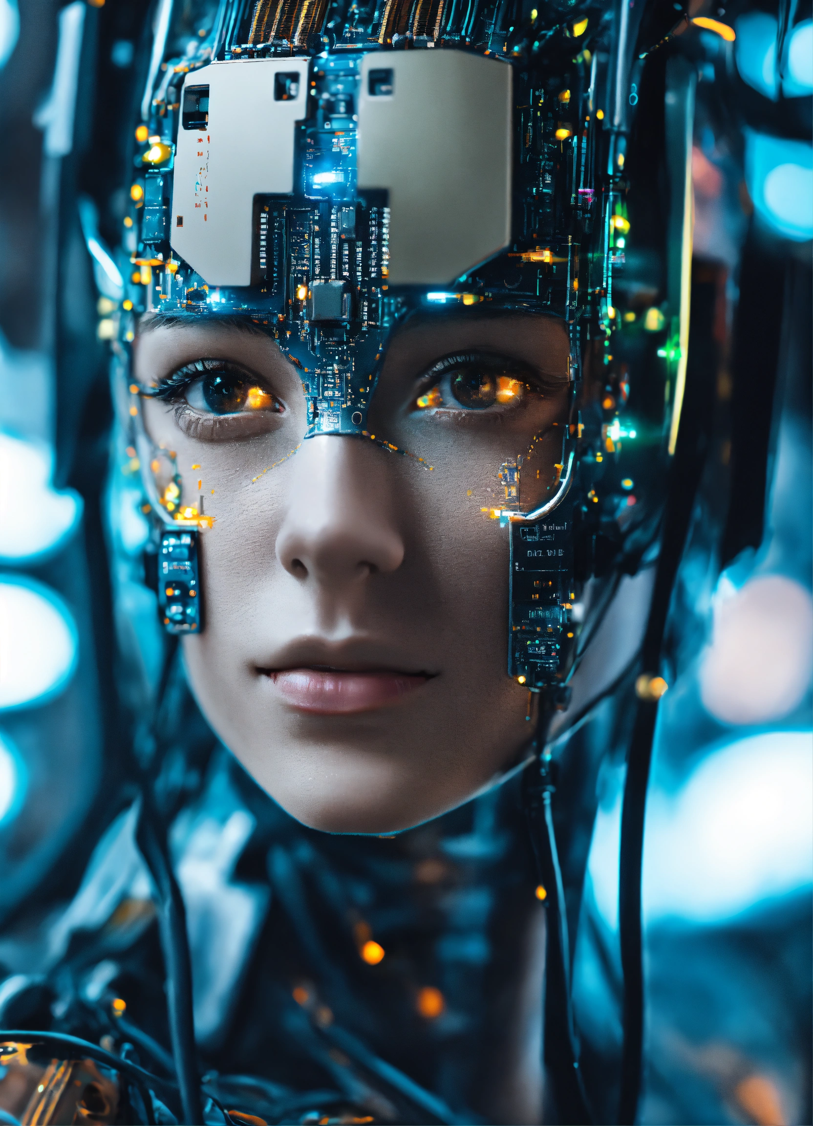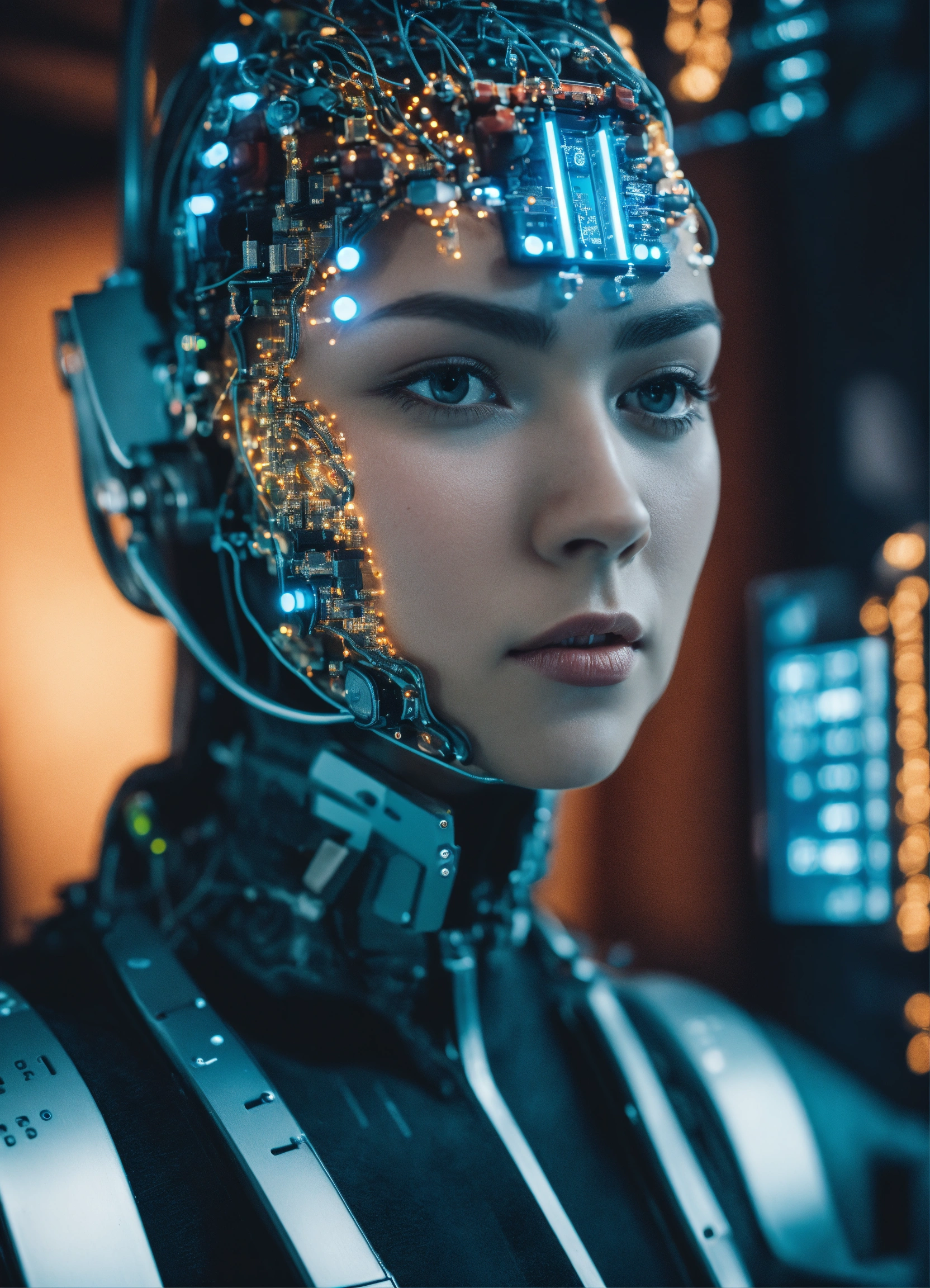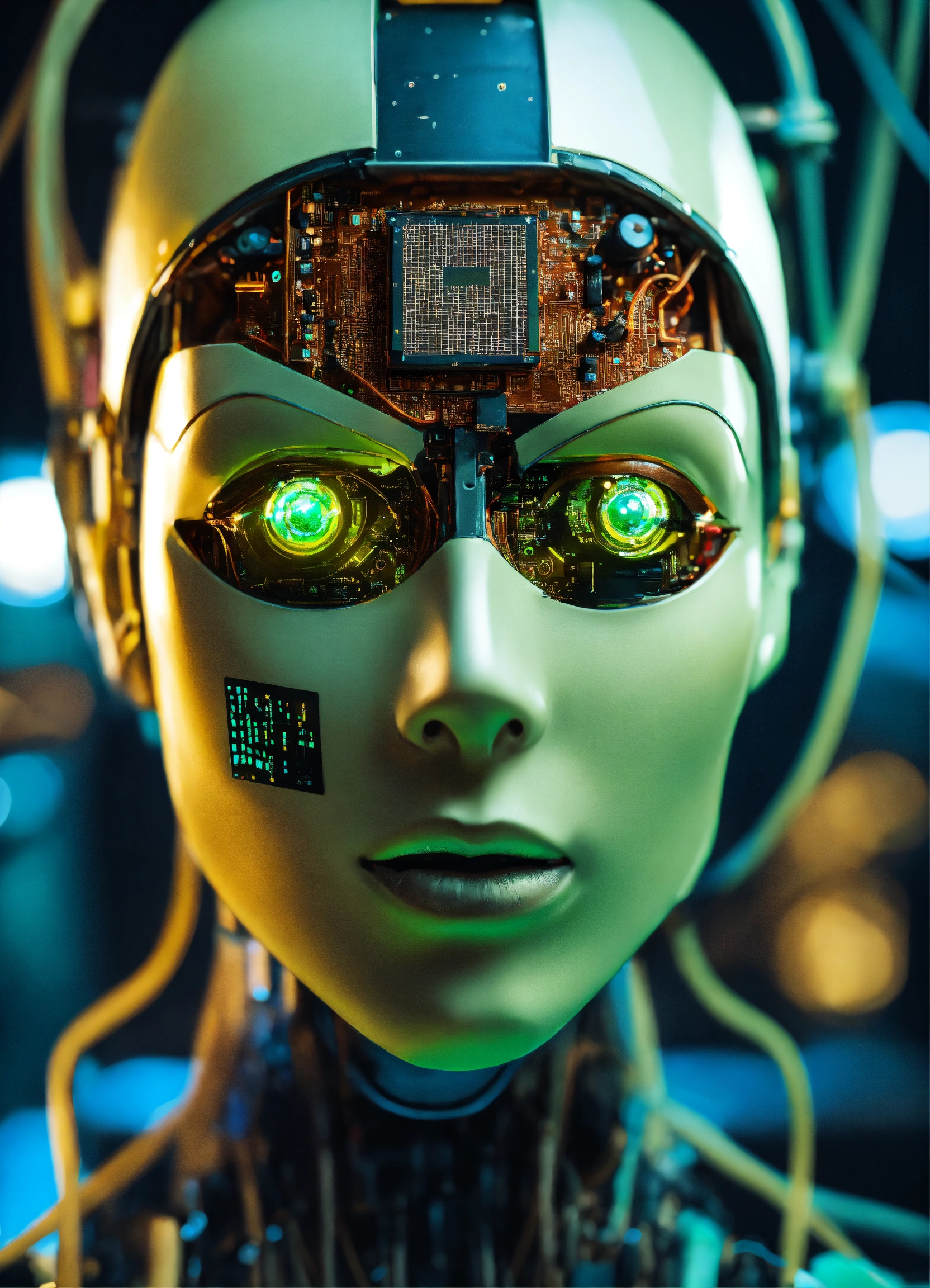 Close up of an android face being programmed with quantum technology
