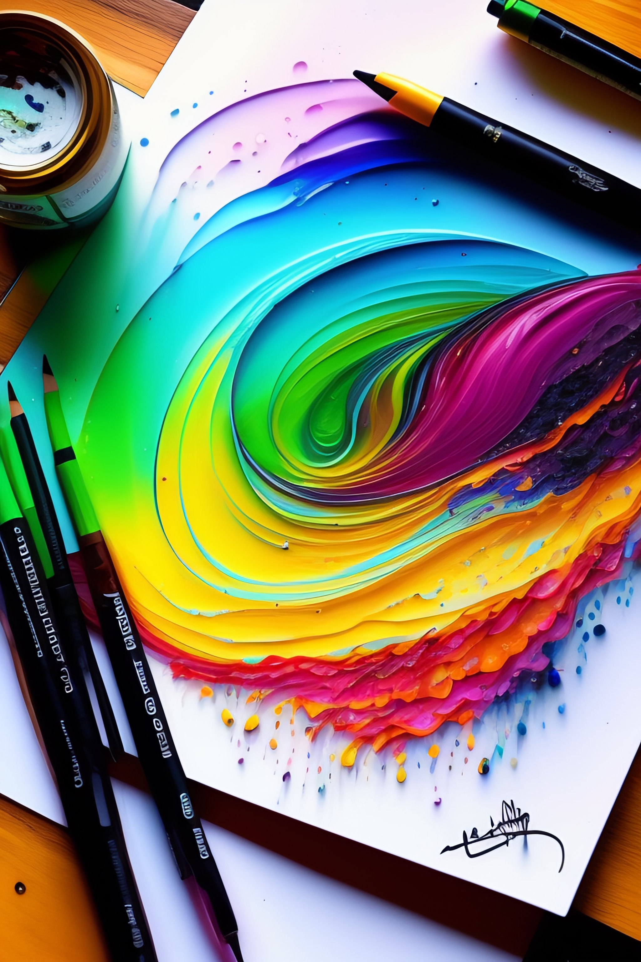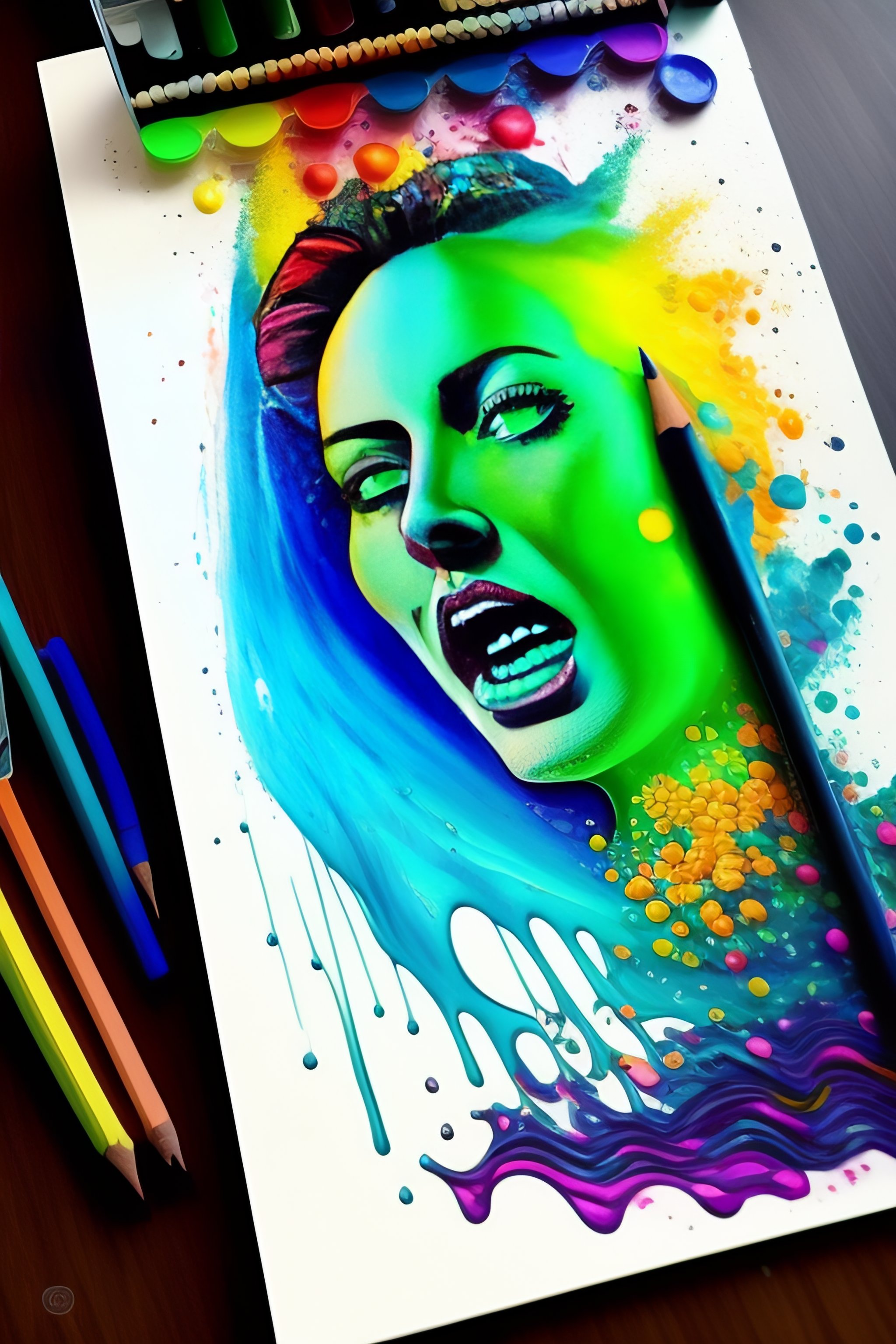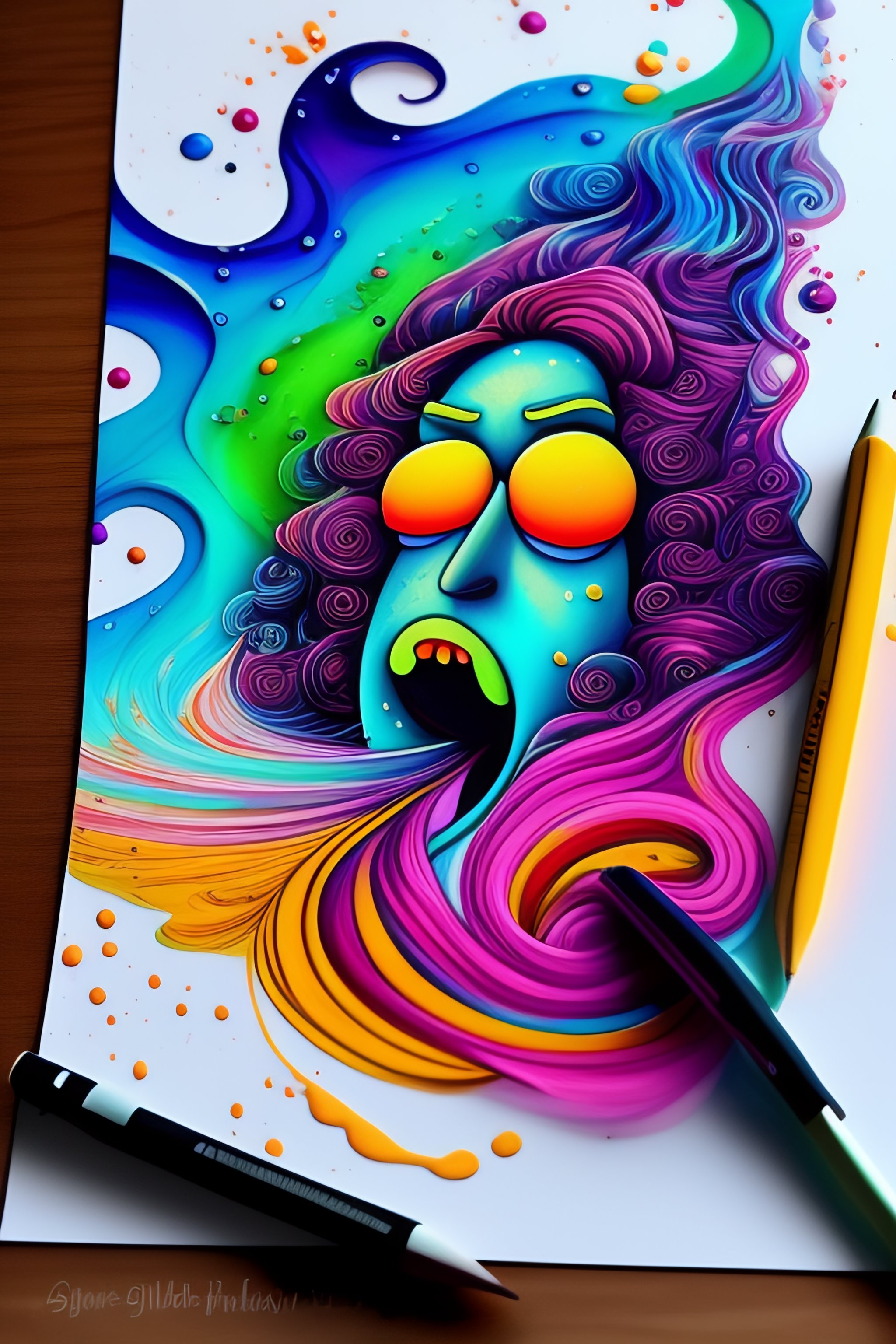 Scribble art with pens and pencils next to the paper and paints splashing on the paperrick and morty