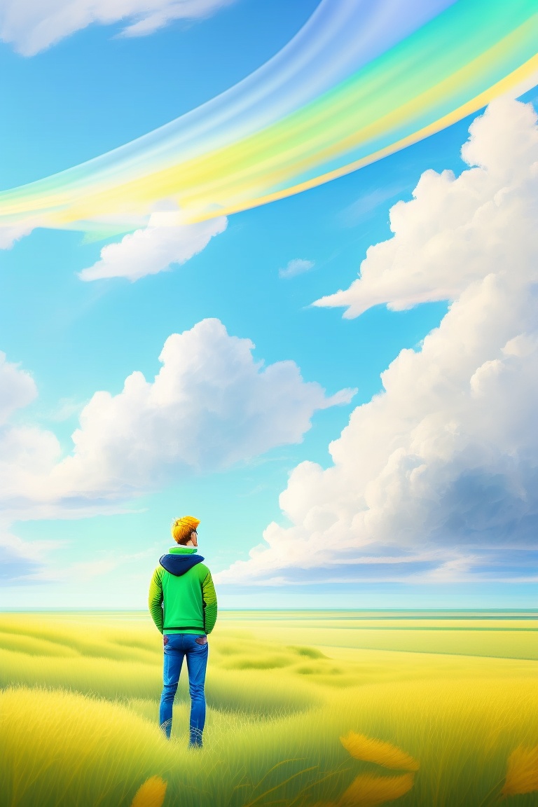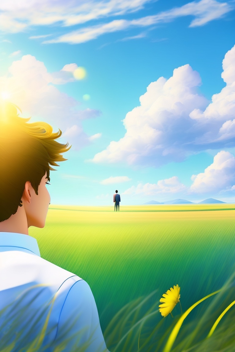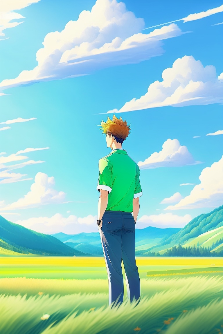 A young man standing in a green field, looking at the blue sky with white clouds, wind patterns blowing around, white clouds, yellow sunshine, bright colors, full of youth energy, a little beauty. serenity and contemplation, anime style