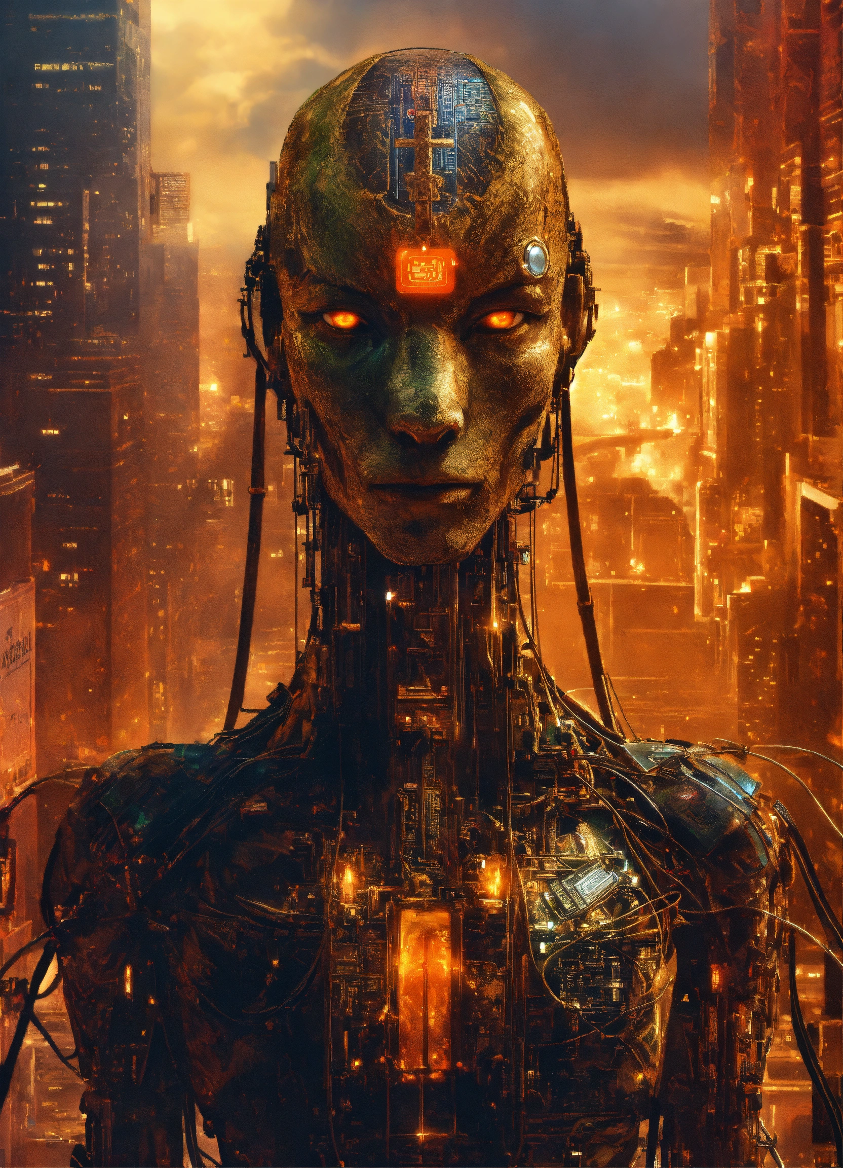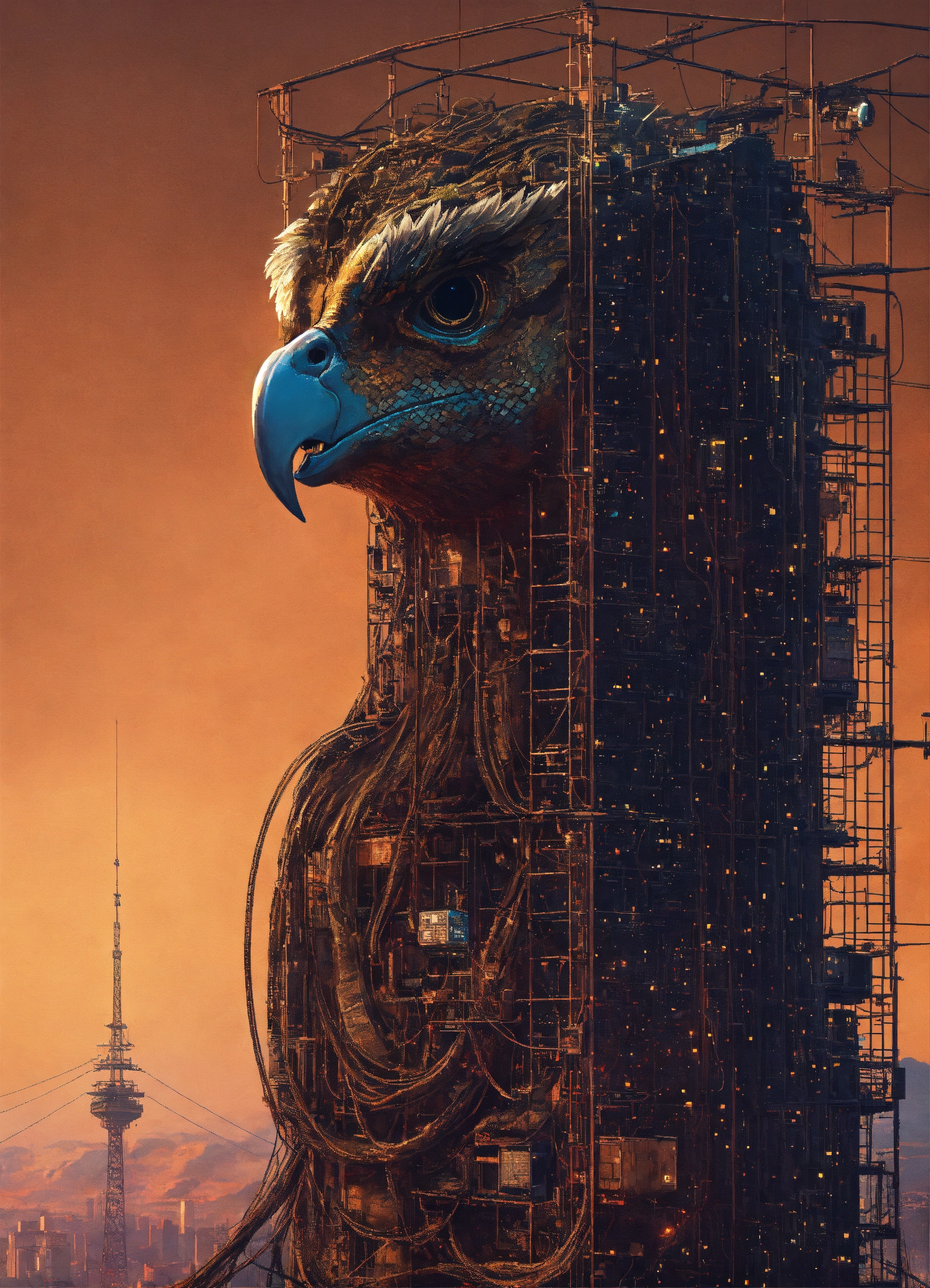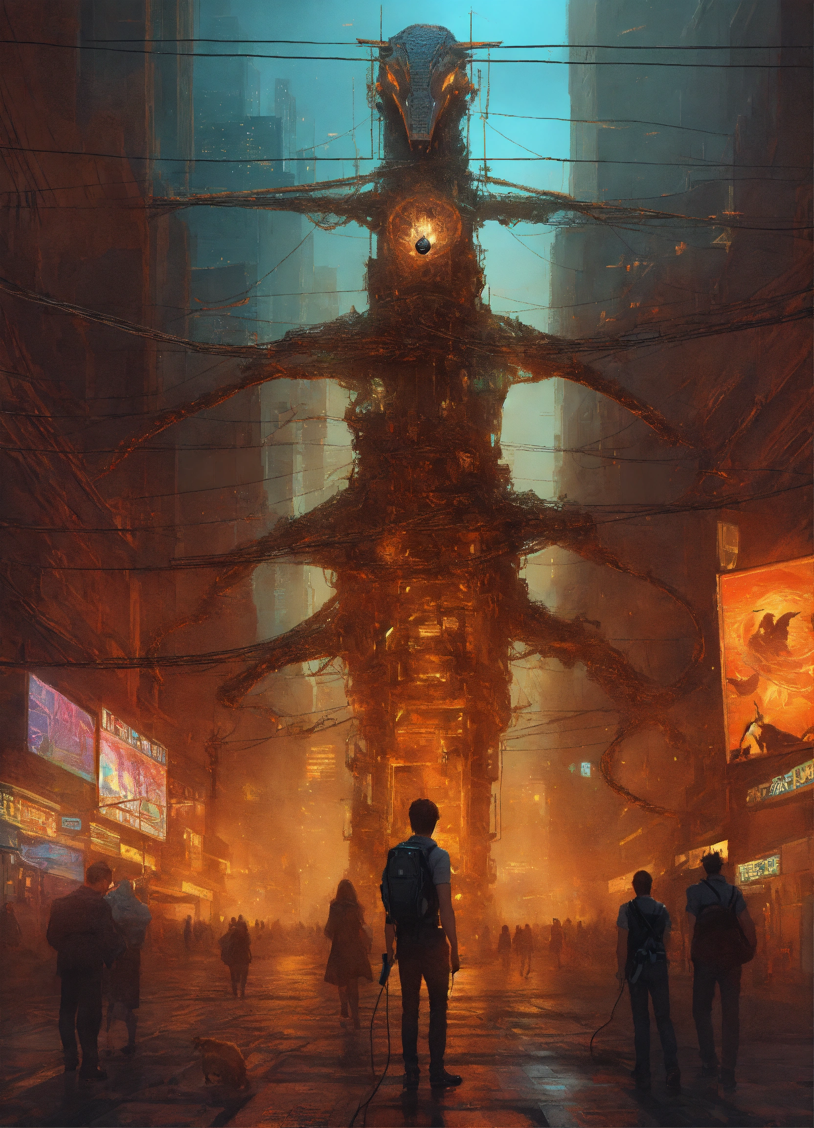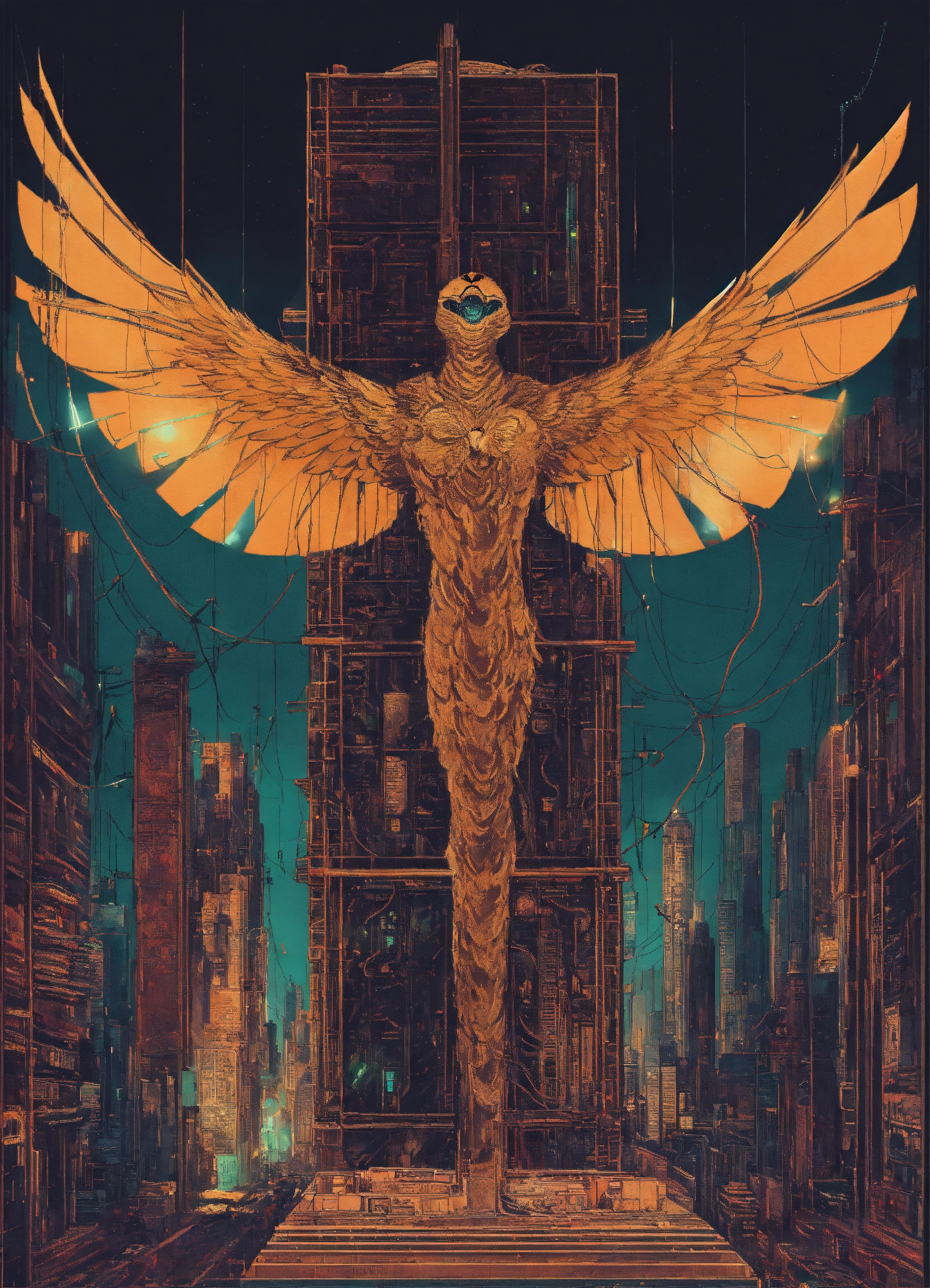 Ai snake coming toward the camera. wires coming toward camera. long wires. long snake. long eel. smoke monster from lost. ascii art. matrix art. artistic abstract face made of technology and pixels disembodied face, incorporeal face, ai face, vector face floating on massive screen connected by wires to an robotic amalgamation of human features and a skyscraper. anthropomorphic cell phone tower. alien satellite. tetragrammaton. dali's crucifixion. tesseract. cyberpunk dystopia. basilisk demon. robotic snake head. biblically accurate angel. robotic demon, long snaking body, body made of amalgamations of technology and human forms. snake demon. a.i. tether. internet wires. if the internet was alive. the body is connected to the tower of babel. cell phone tower. a.i. with the aura of a burning torch, four faces, four wings, straight legs, and bronze calf feet. under their wings on their four sides are their heads one a human, one a lion, one an ox, and one an eagle.