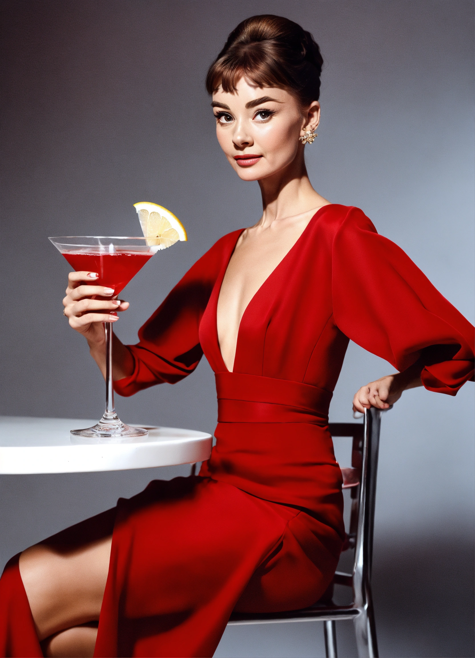 Full body view, beautiful realistic representation of audrey hepburn, perfect anatomy, perfectly shaped legs, perfect hands, wearing a low cut red gown and red shoes, sitting on a tall metal bar stool, drinking a clear white martini drink, natural action pose, set against a plain white background, plain white background