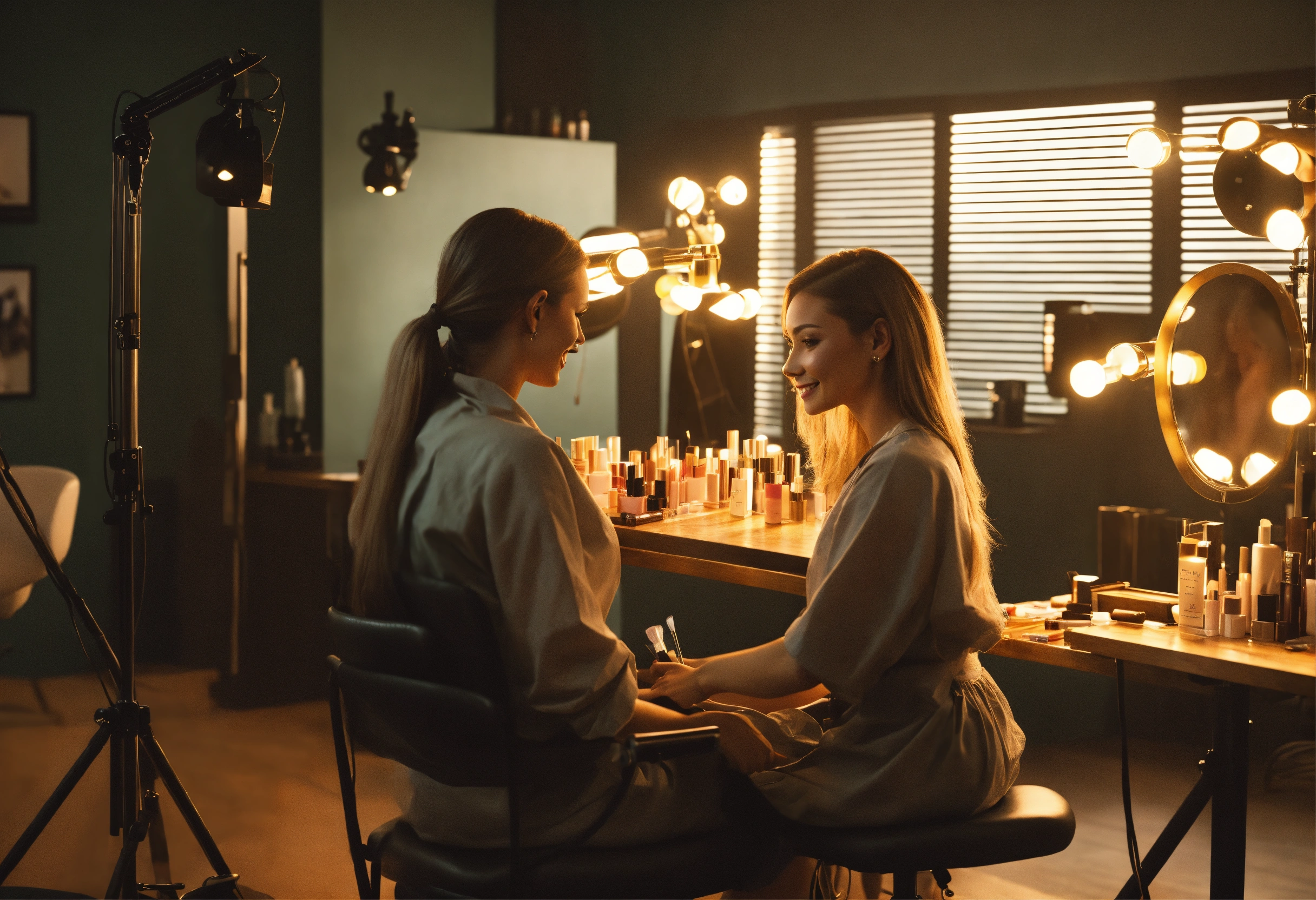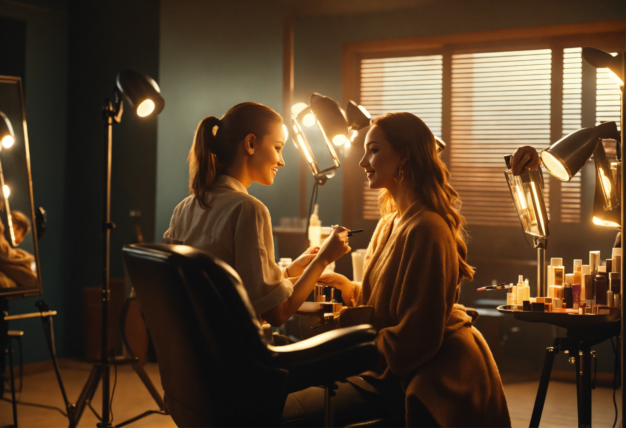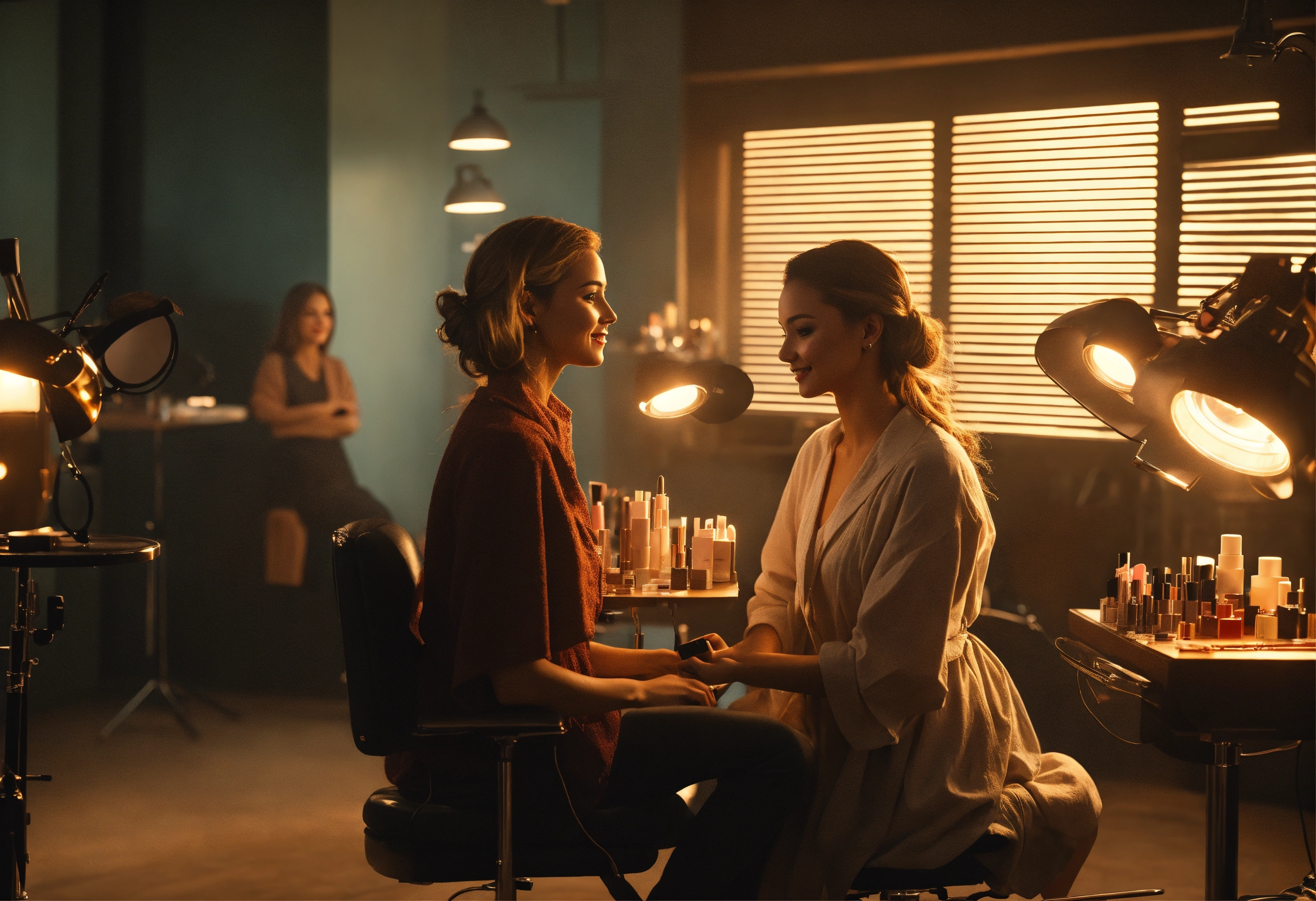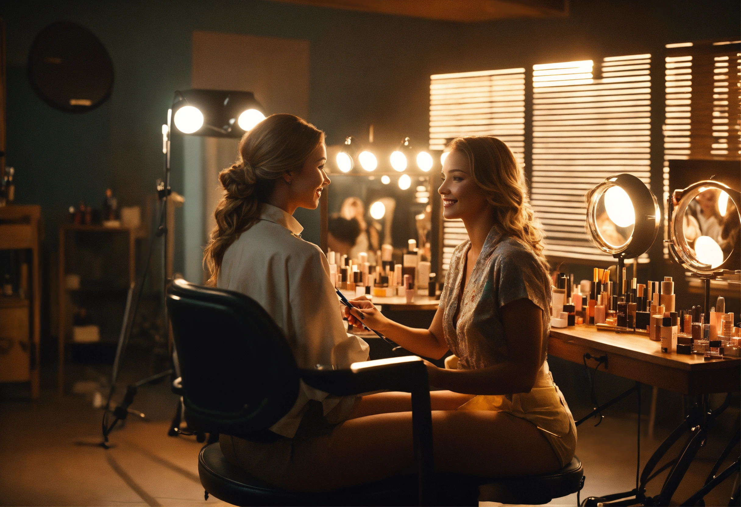 A beautiful actress girl is sitting in an actor's chair, opposite a table with a backlight.cosmetics are on the table. on the right, a makeup artist paints it, on the left, a hairdresser does styling. side view. they smile and talk. realistic. a clear correct focus. full frame. 3d, 4k, soft light, complex details, depth of field, beautiful lighting. symmetrical bodies, beautiful, detailed faces.