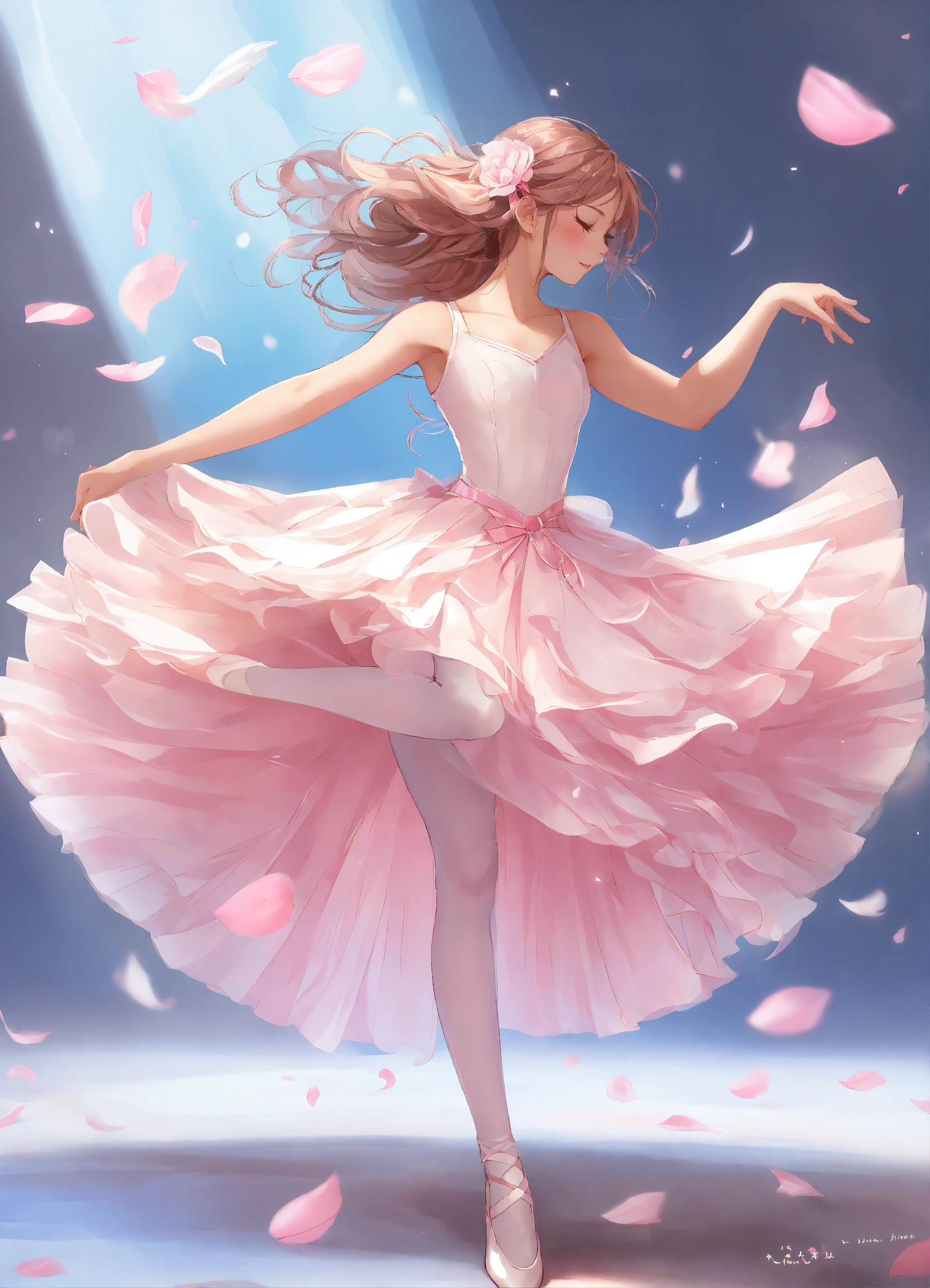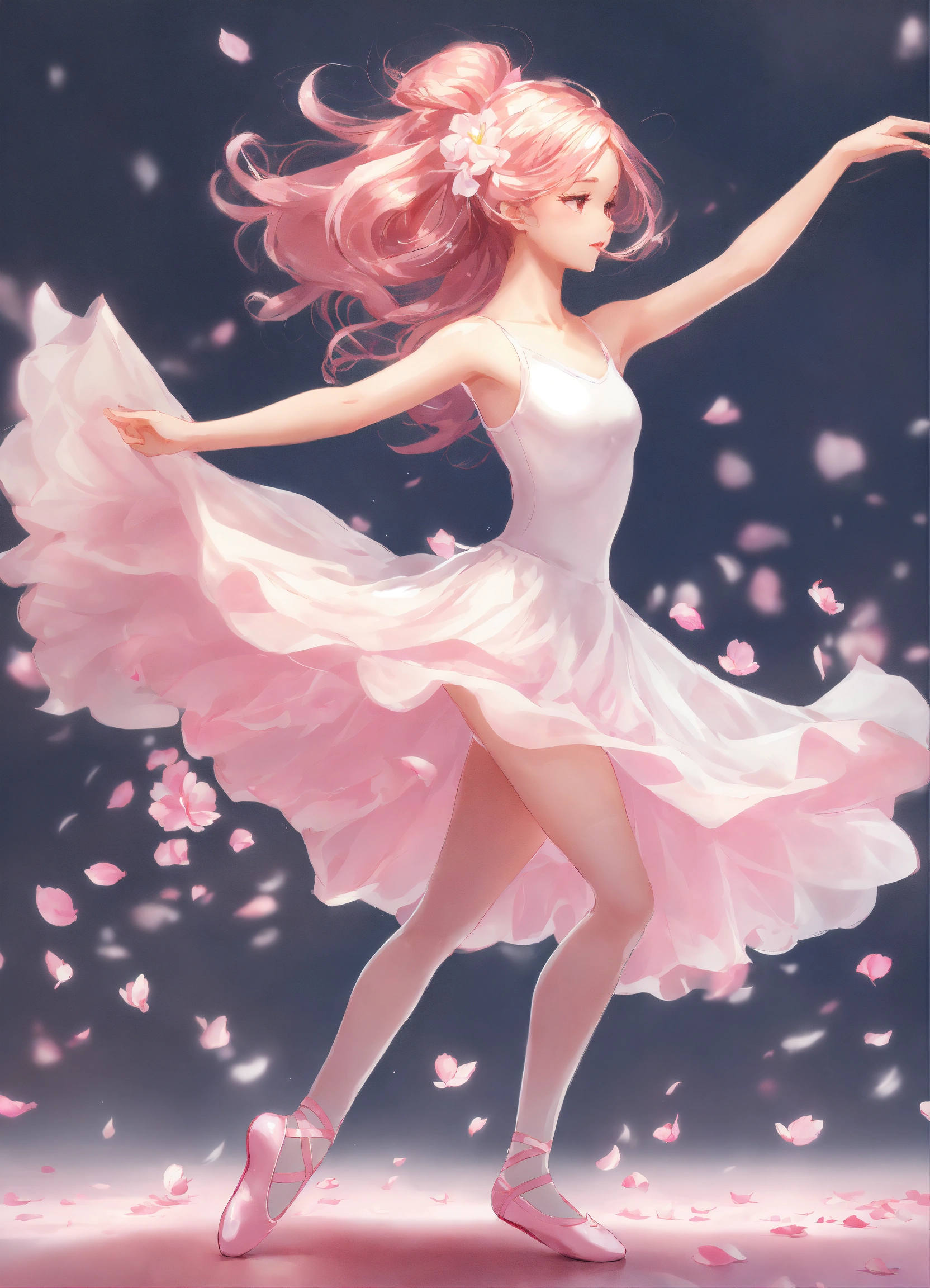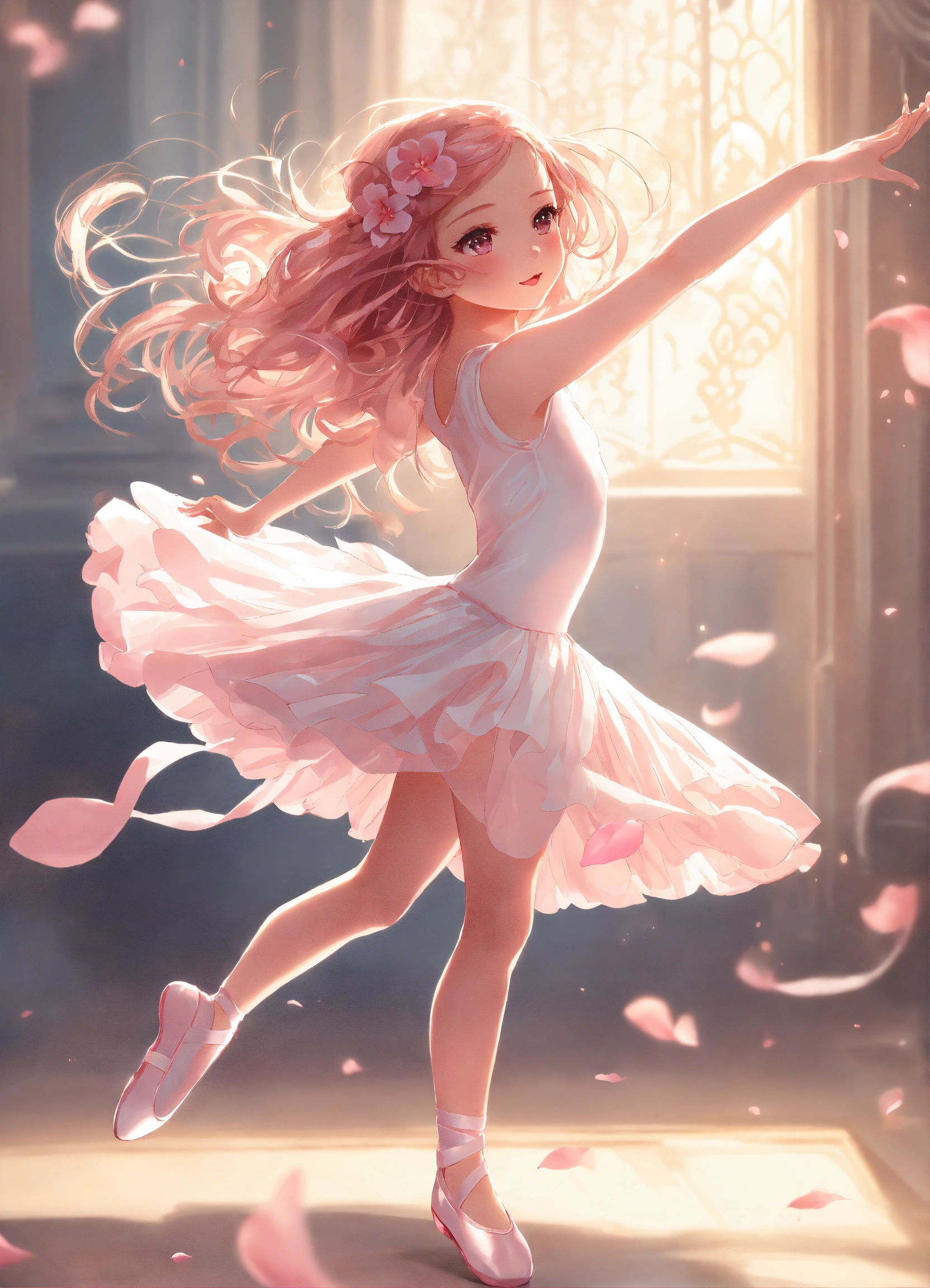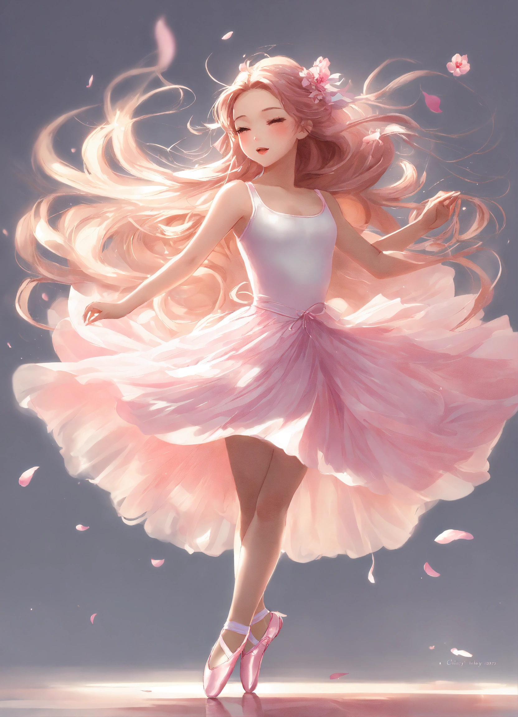 A girl dancing ballet, wearing a pure white ballet dress, a pair of light pink silk ballet shoes, curled long hair, wearing a pink petal hairpin, attention dance posture, dynamic pose, full body, soft shapes, chibifantasy, creativity, white background, digital art artgerm style art, very detailed, 2k