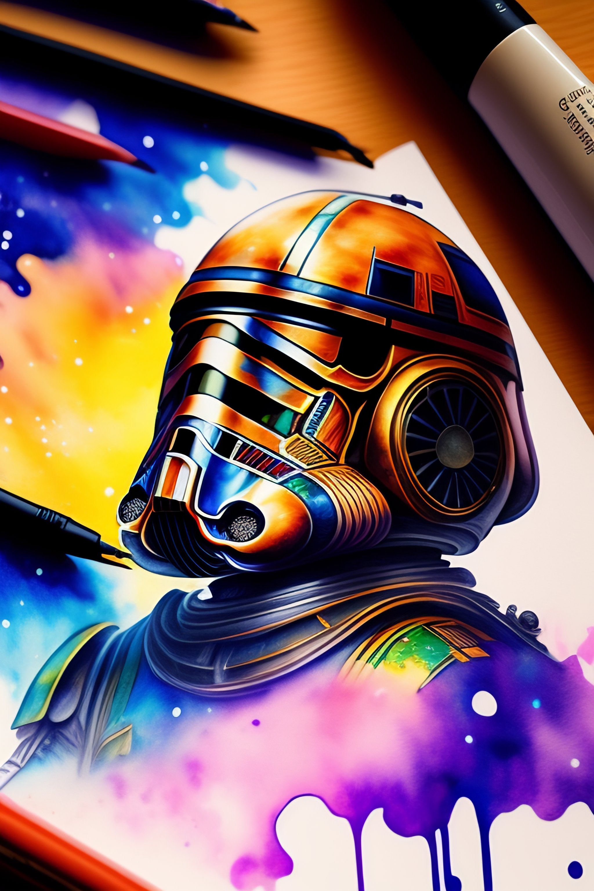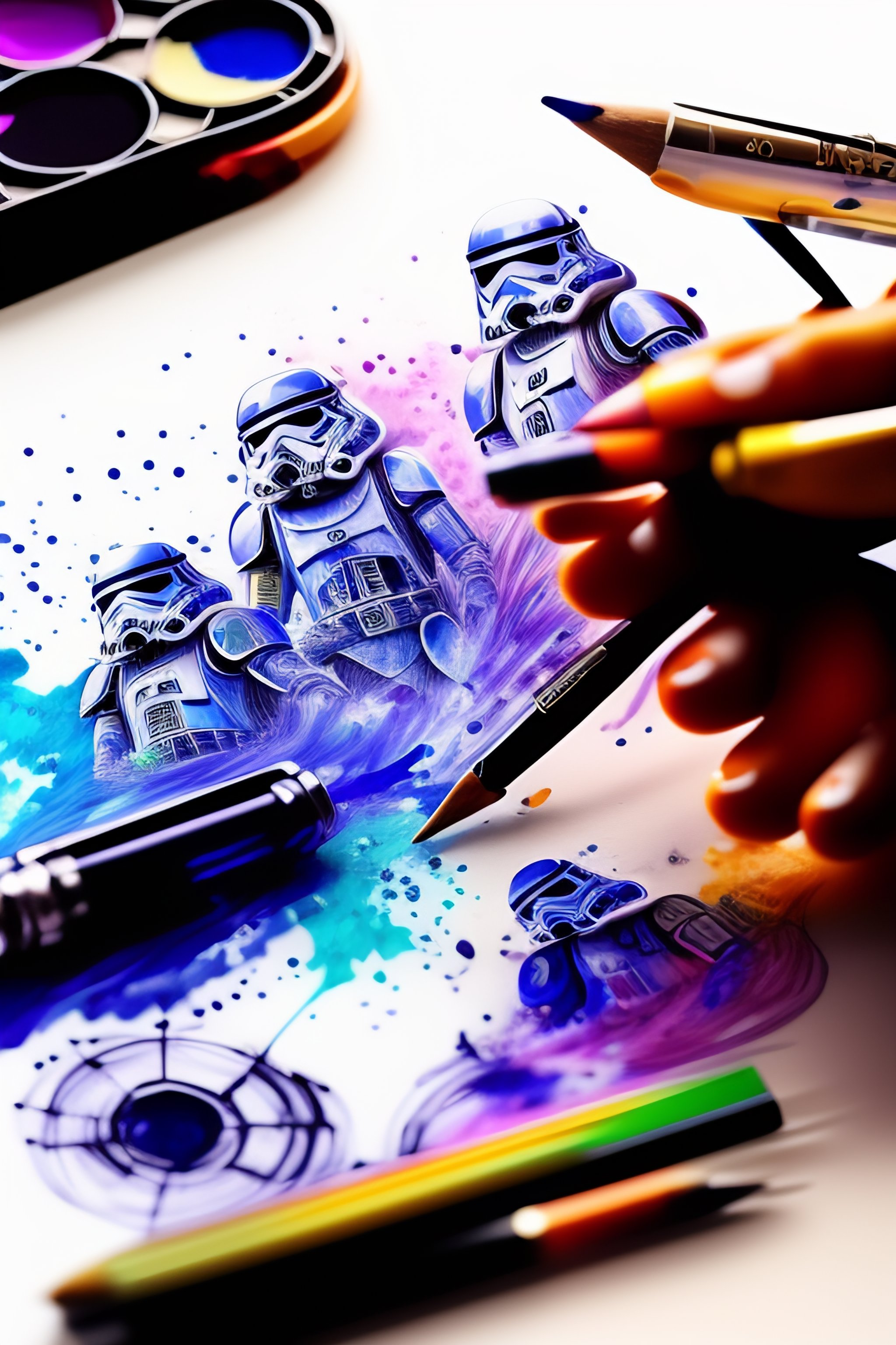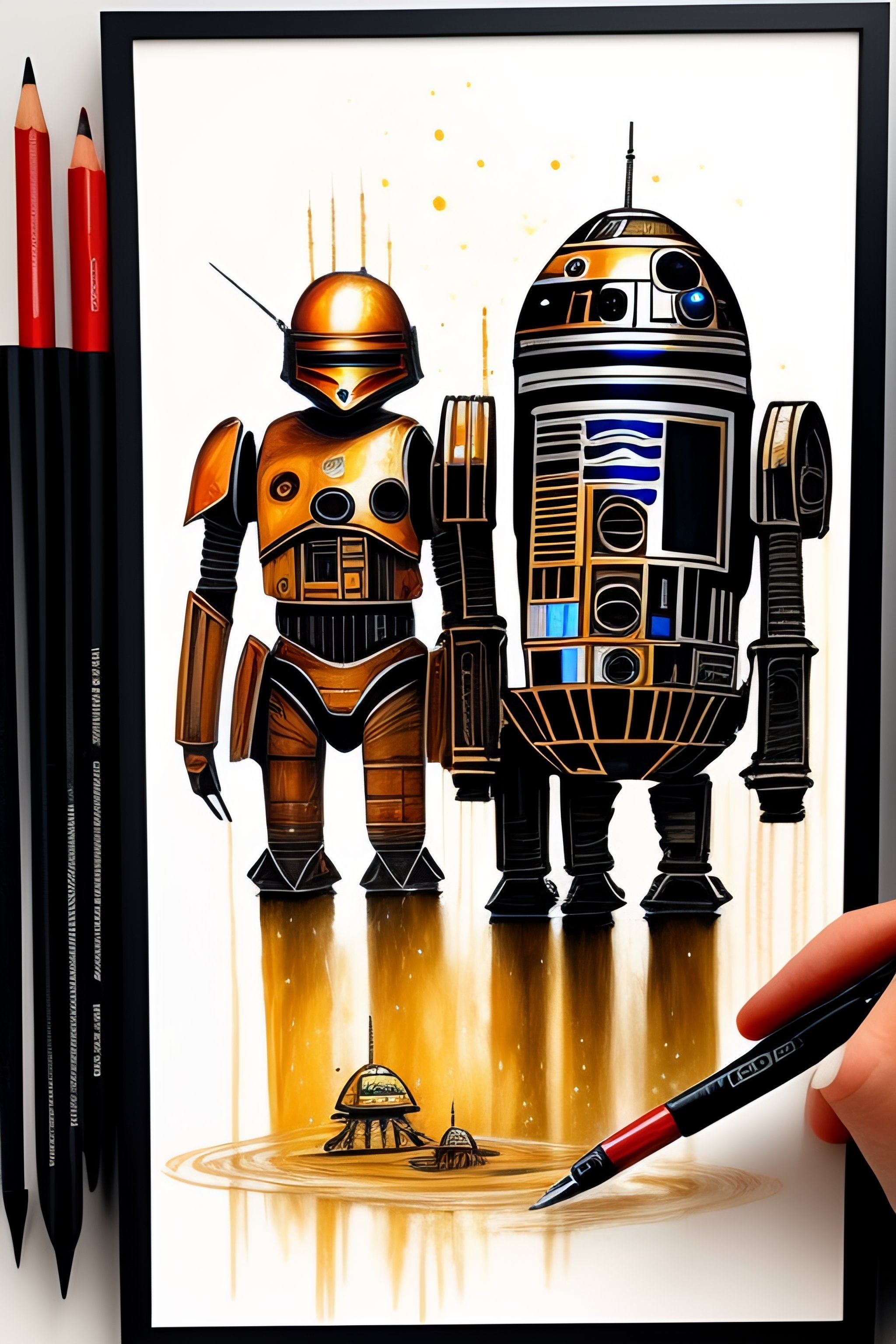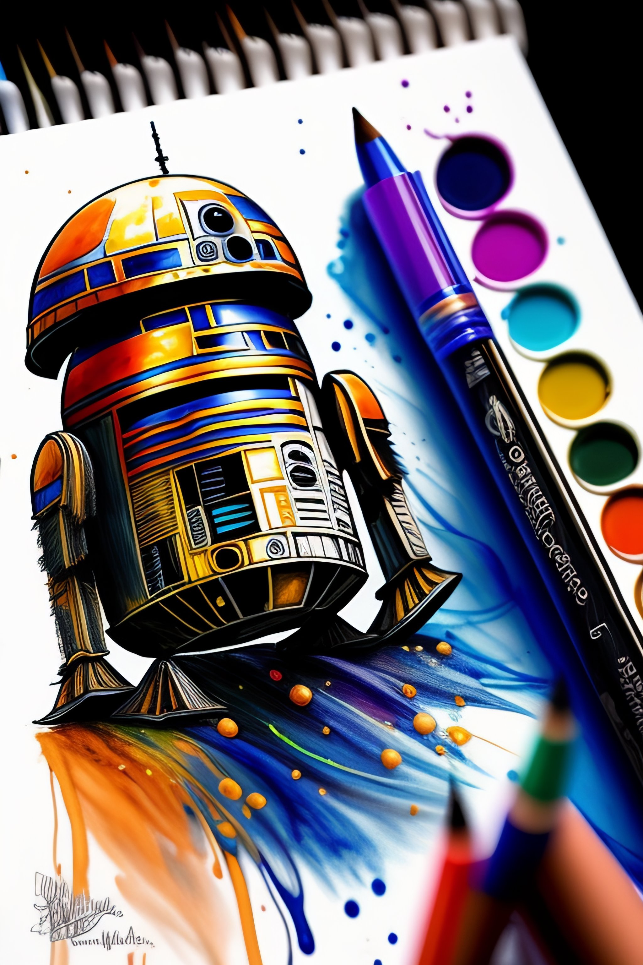 Scribble art with pens and pencils next to the paper and paints splashing on the paper star wars new droids