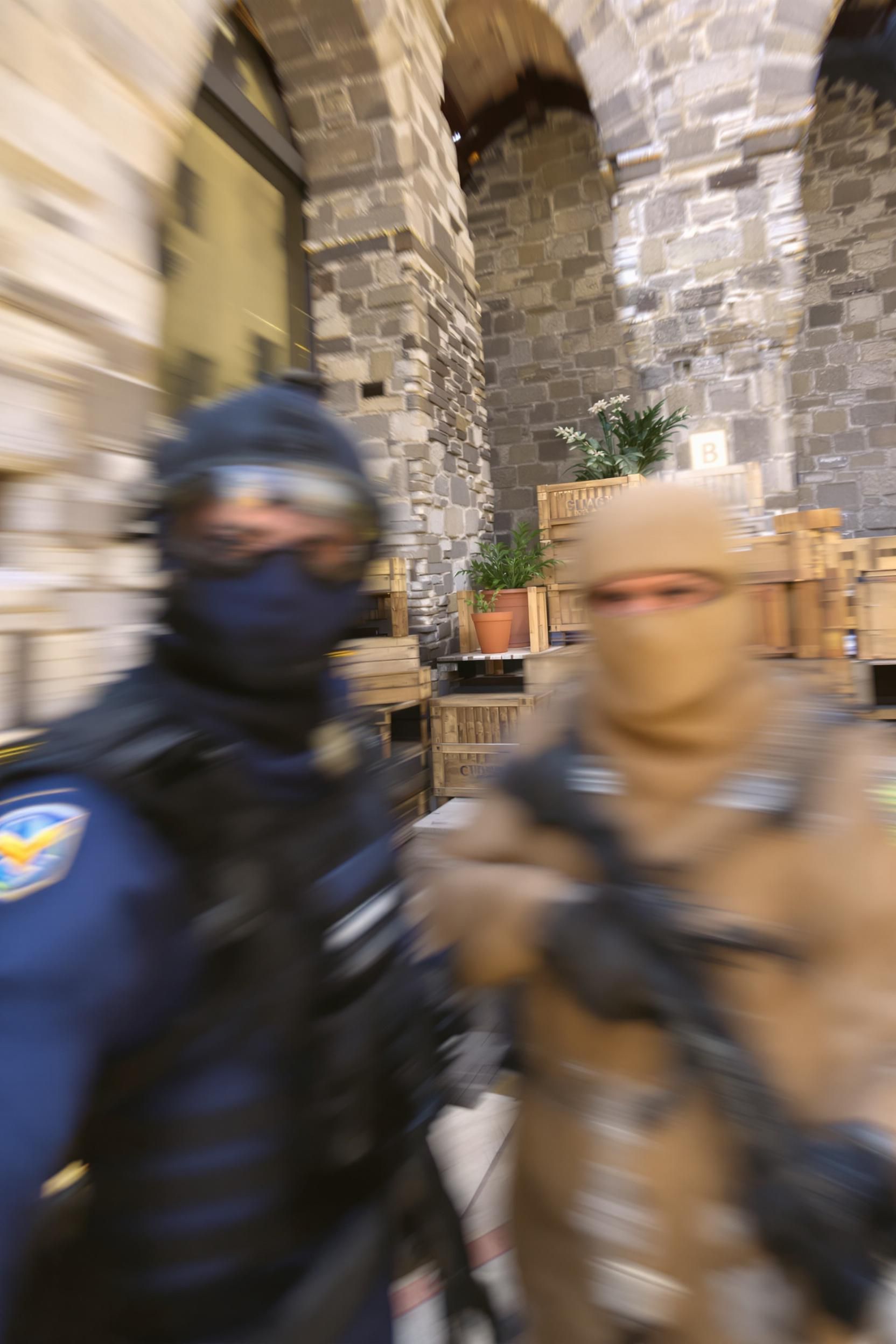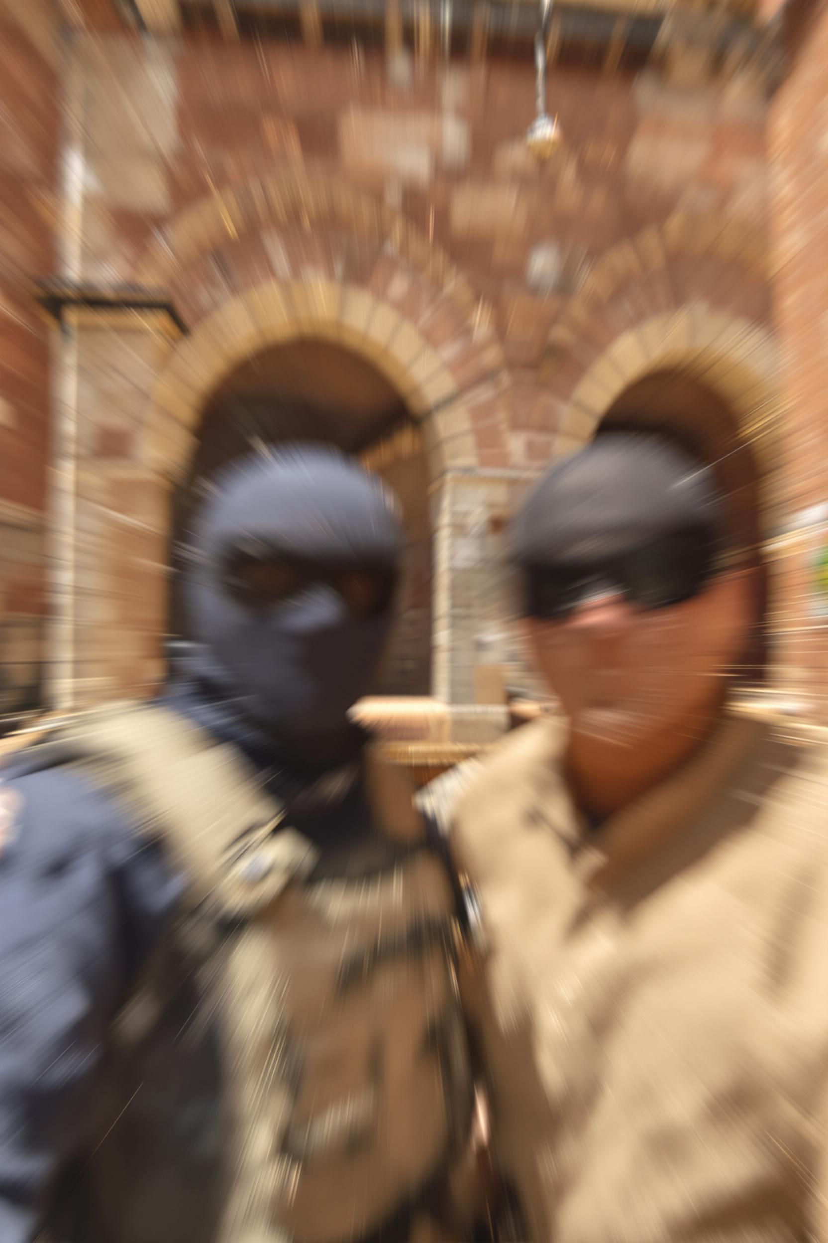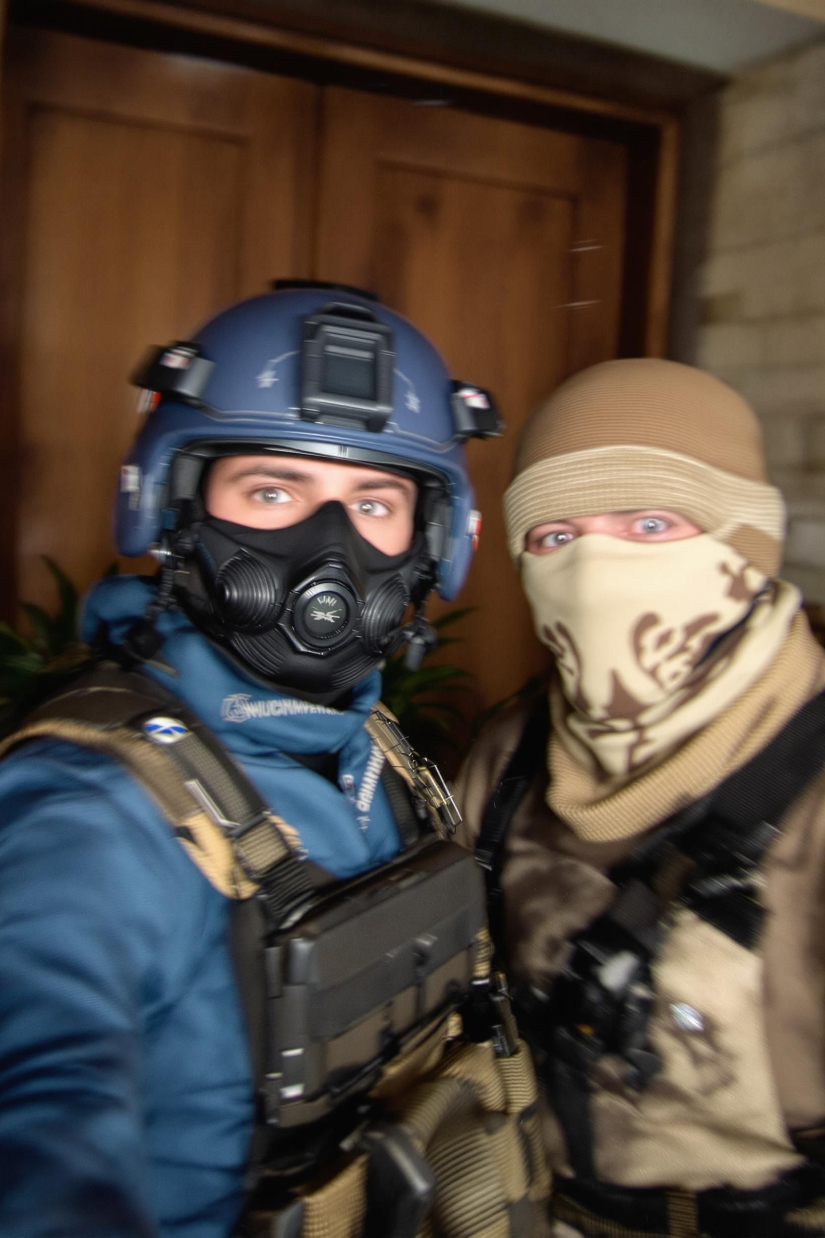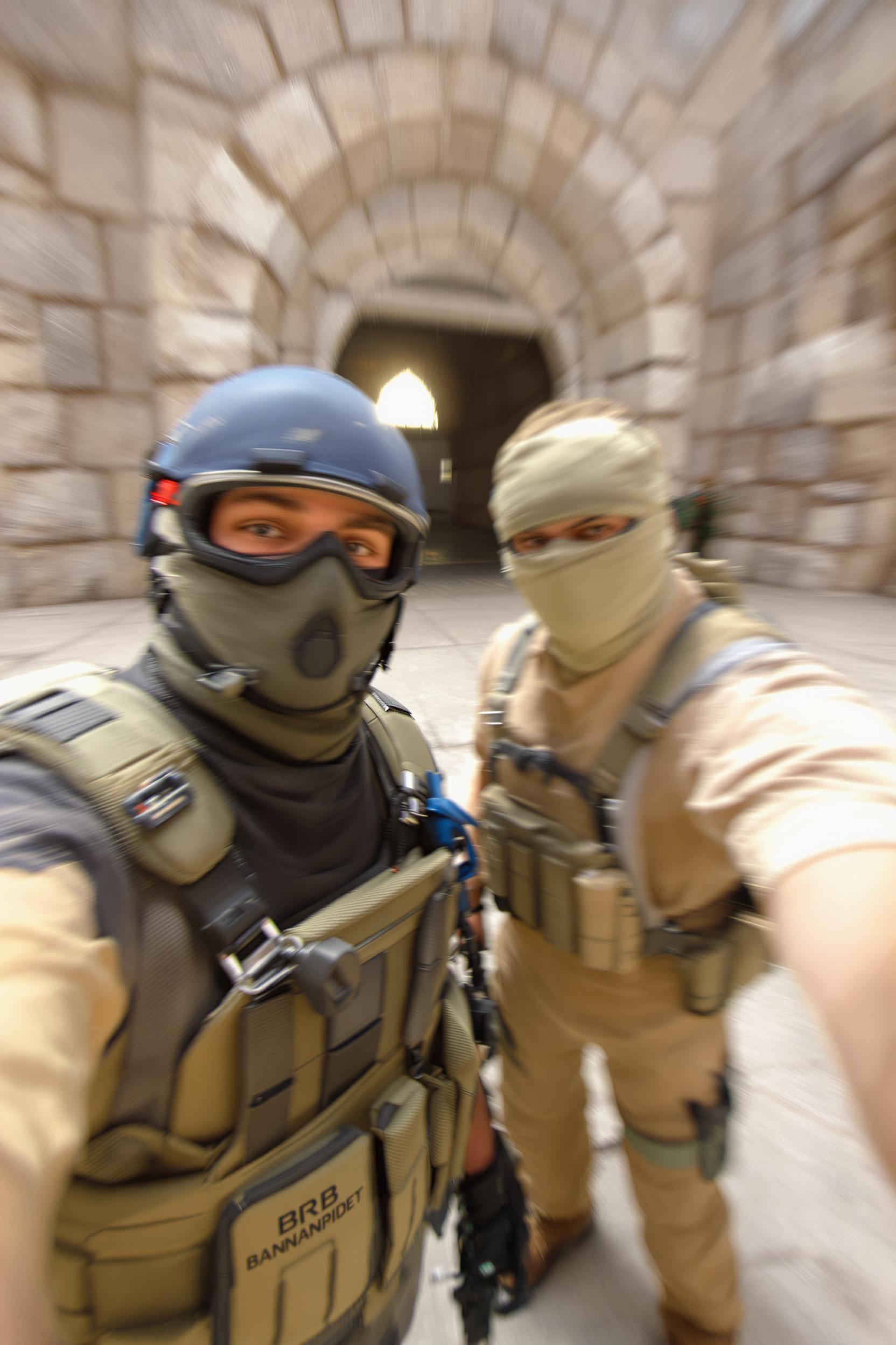 Please draw an extremely ordinary and unremarkable iphone selfie, with no clear subject or sense of composition—like a quick, casual snapshot. it should have motion blur and slight overexposure due to uneven sunlight or indoor lighting. the angle should be awkward, the composition messy, and the overall feel should be deliberately accidental—like a selfie accidentally taken while pulling the phone out of a pocket. the main characters are the default ct agent and t agent from the game counter-strike, and the setting is the inferno map's b bombsite in counter-strike