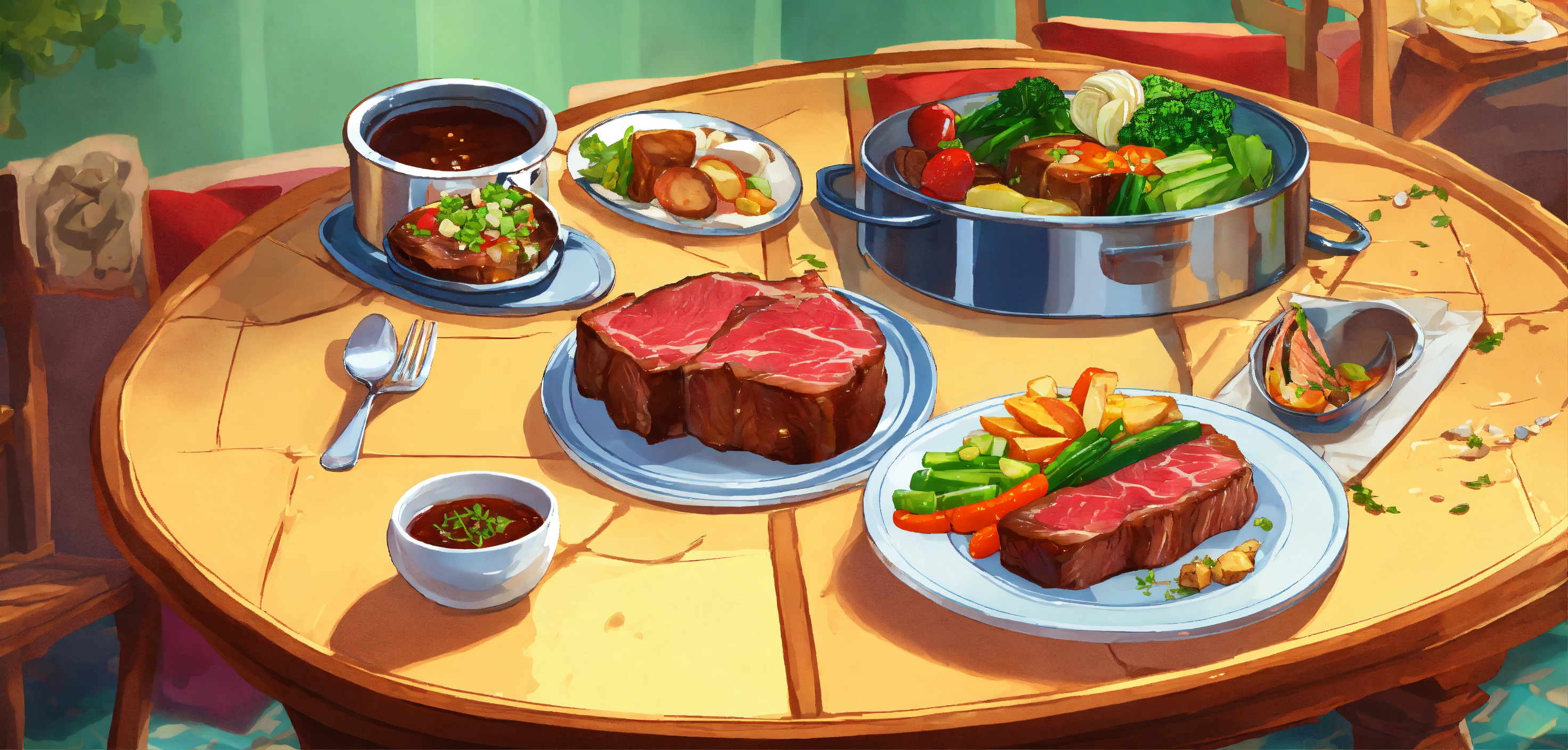 A table centered with steak food on it, beef steak, toasts and vegetables. the graphics style is the one used in the game homescapes created by playrix