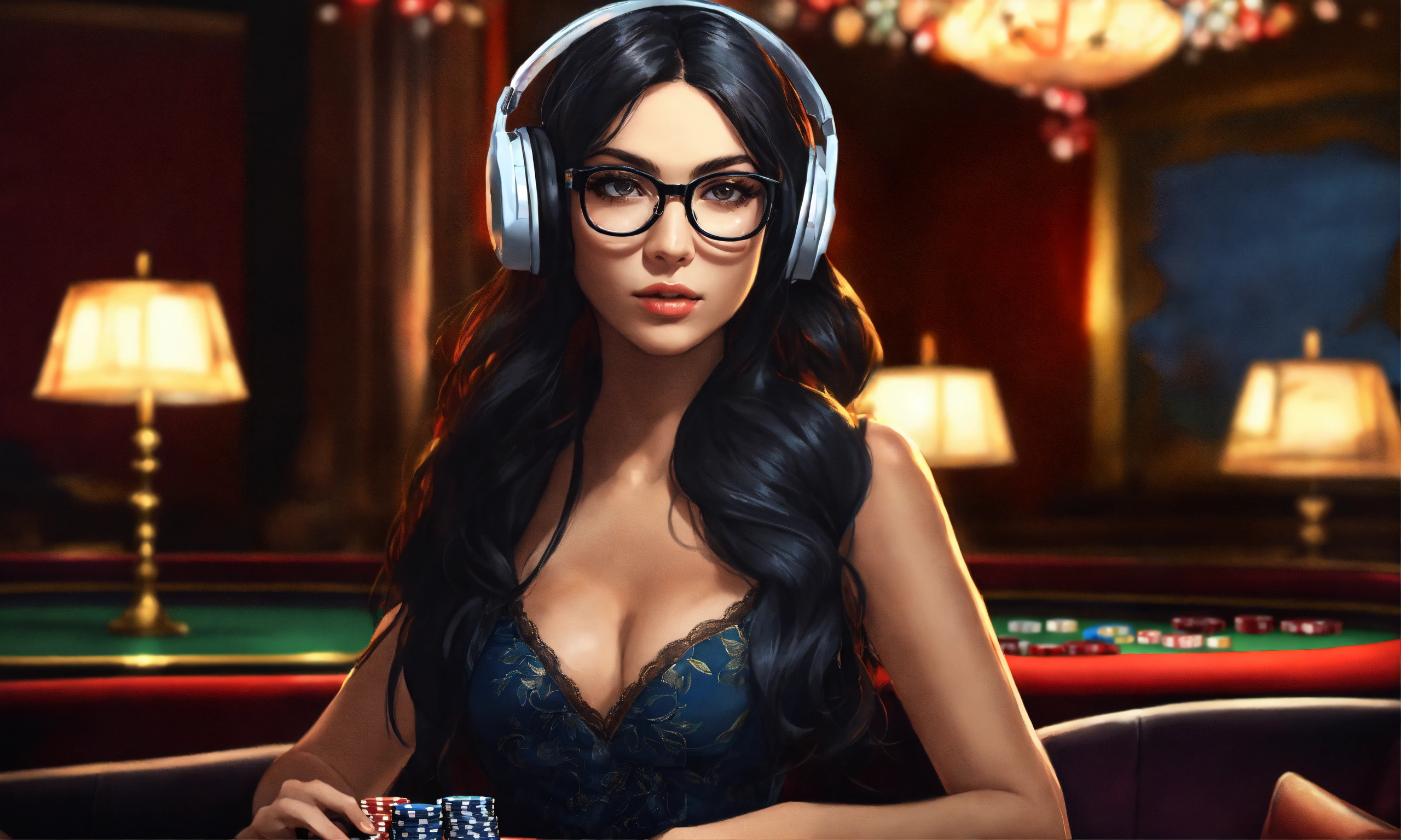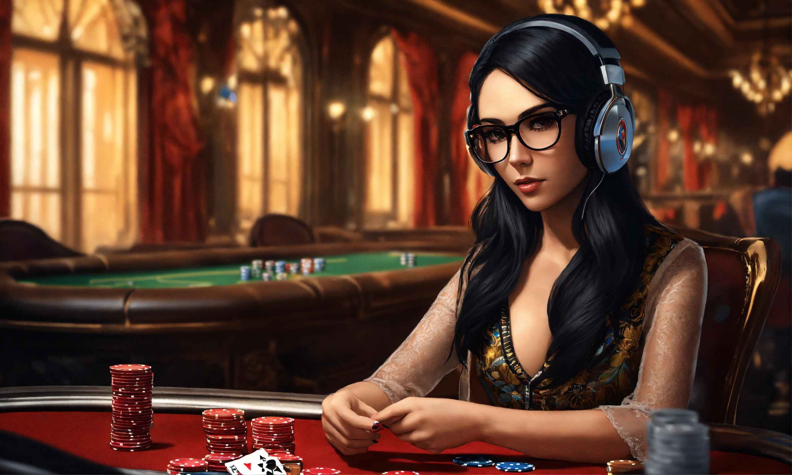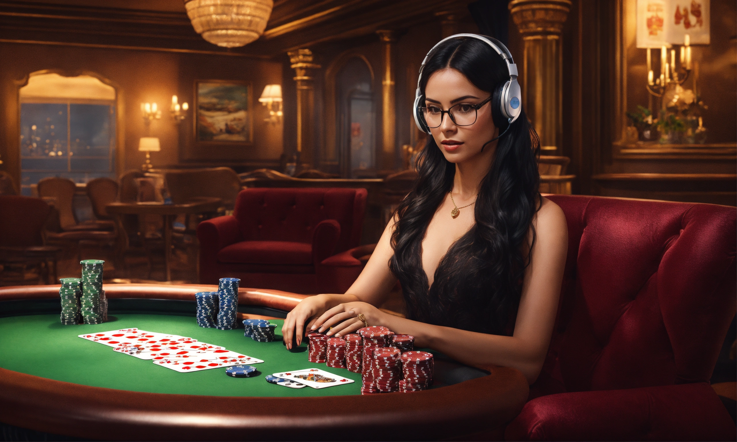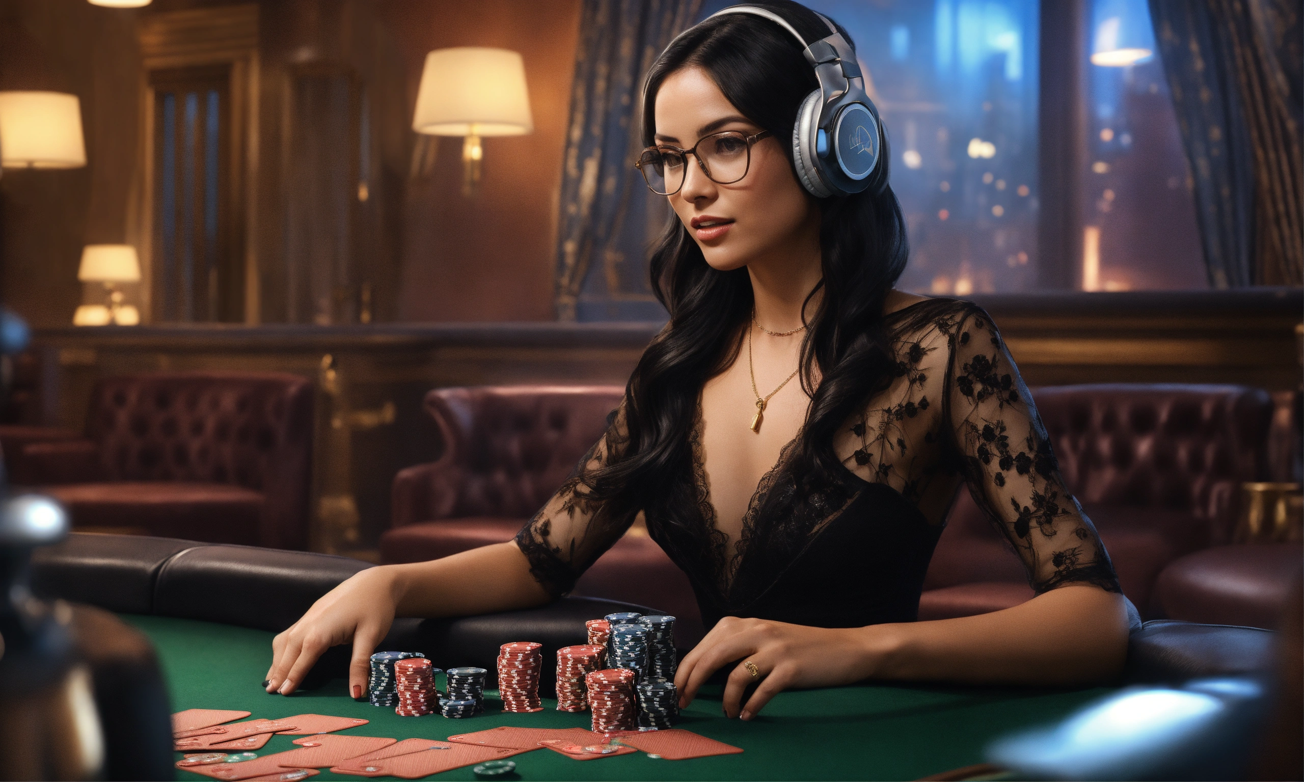 A realistic woman with black long hair, wearing glasses and headphones, in an elegant dress, enters a lounge and playing poker cards.