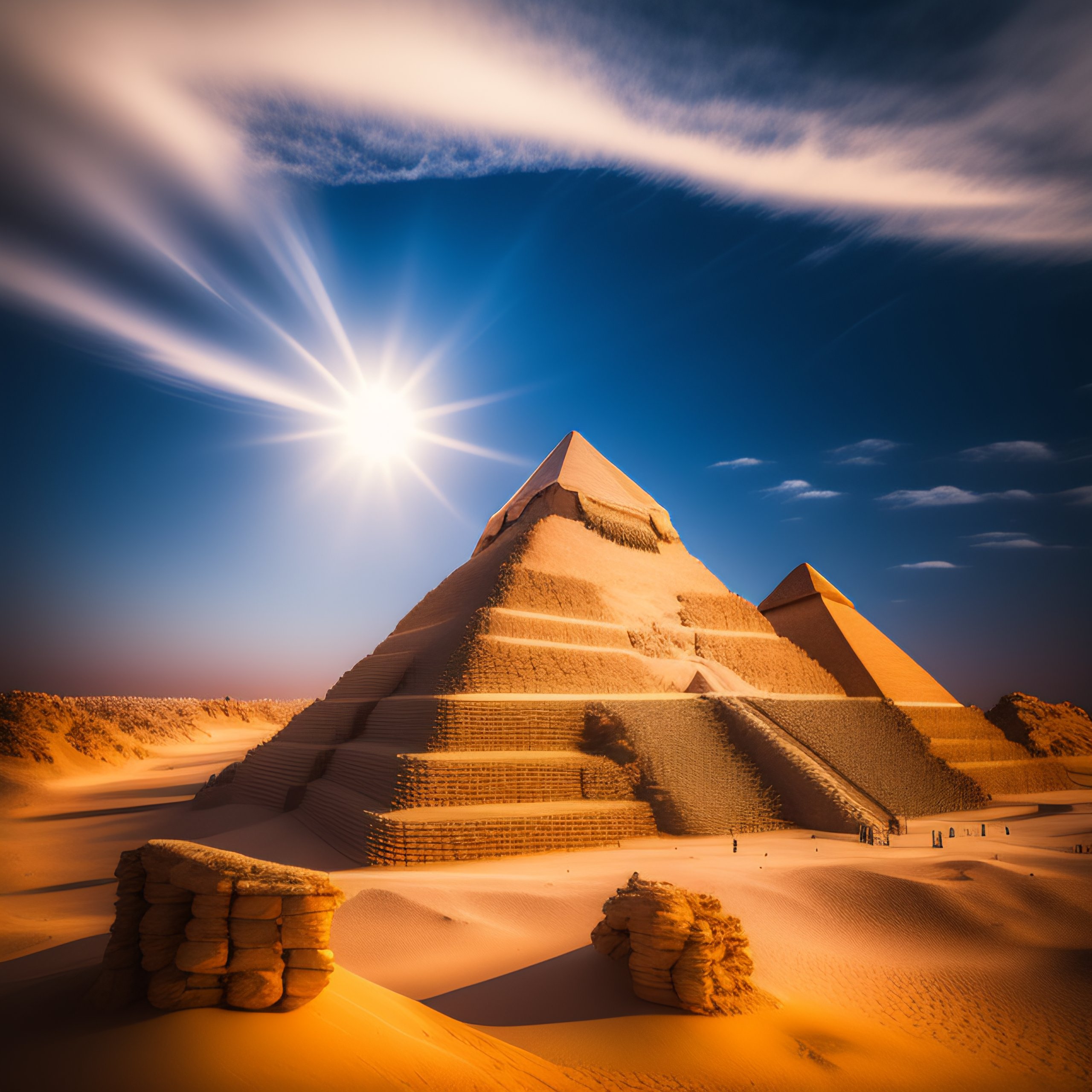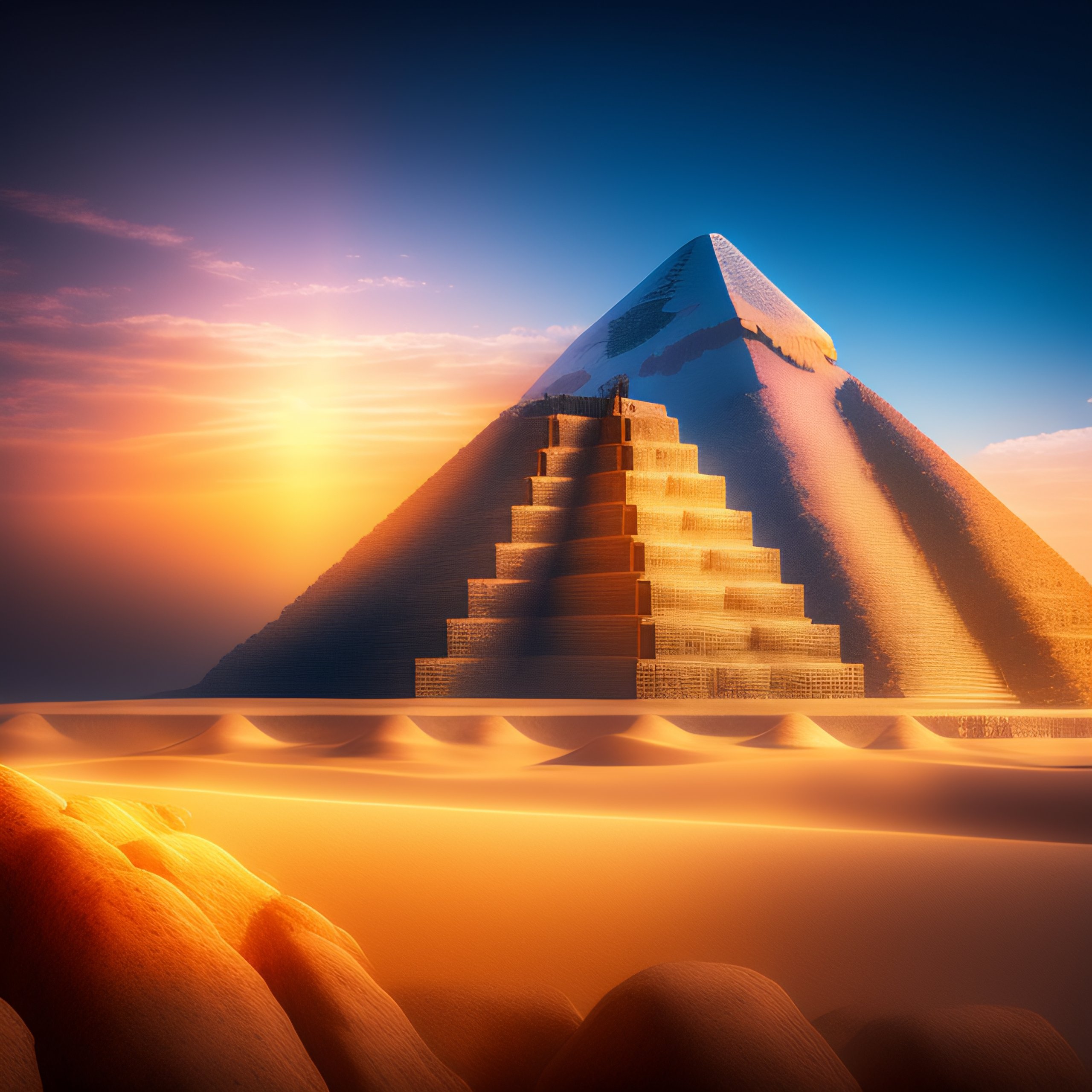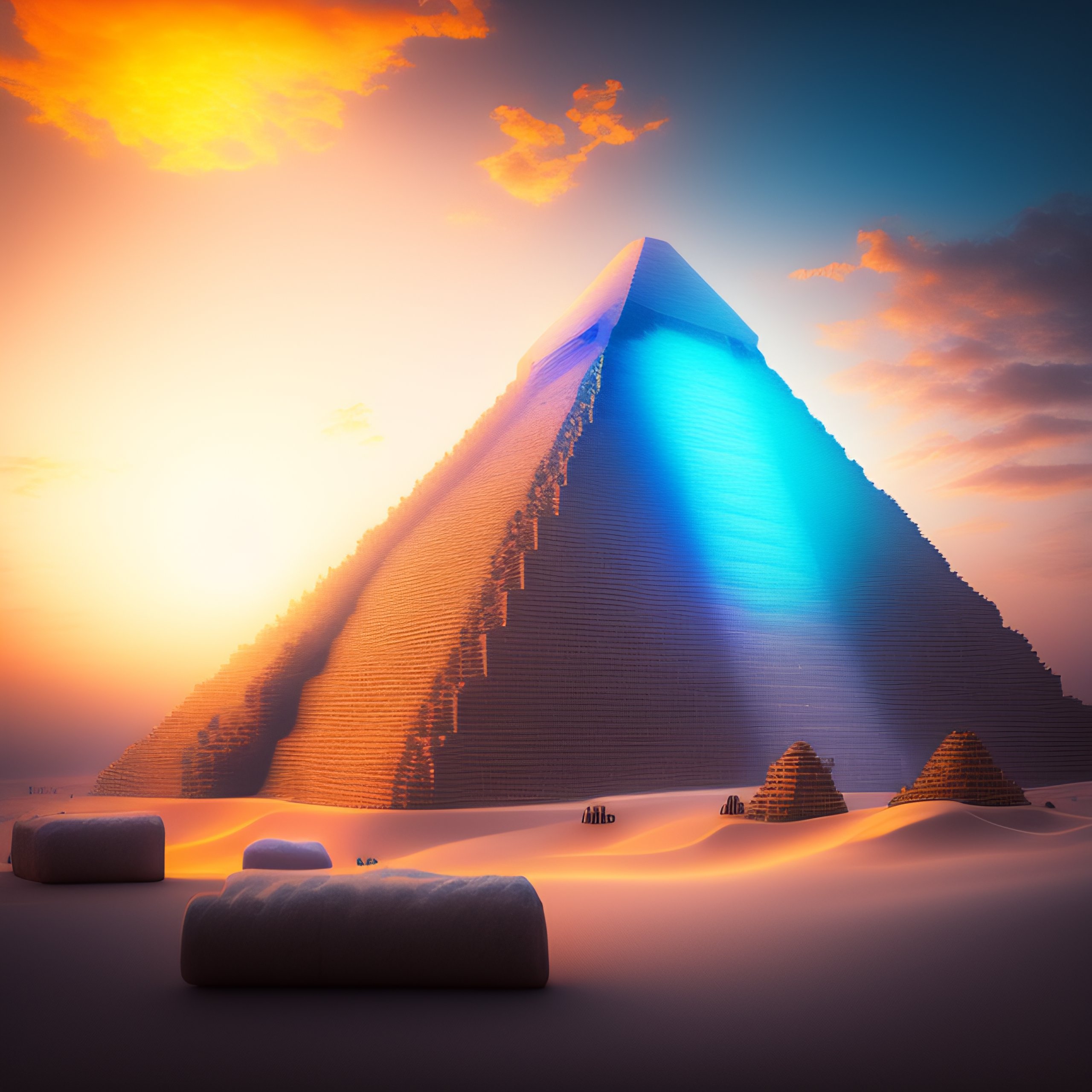 Tilt-shift photo of the three pyramids of giza in white color, in the sky, nostalgic lighting, with bright colors.