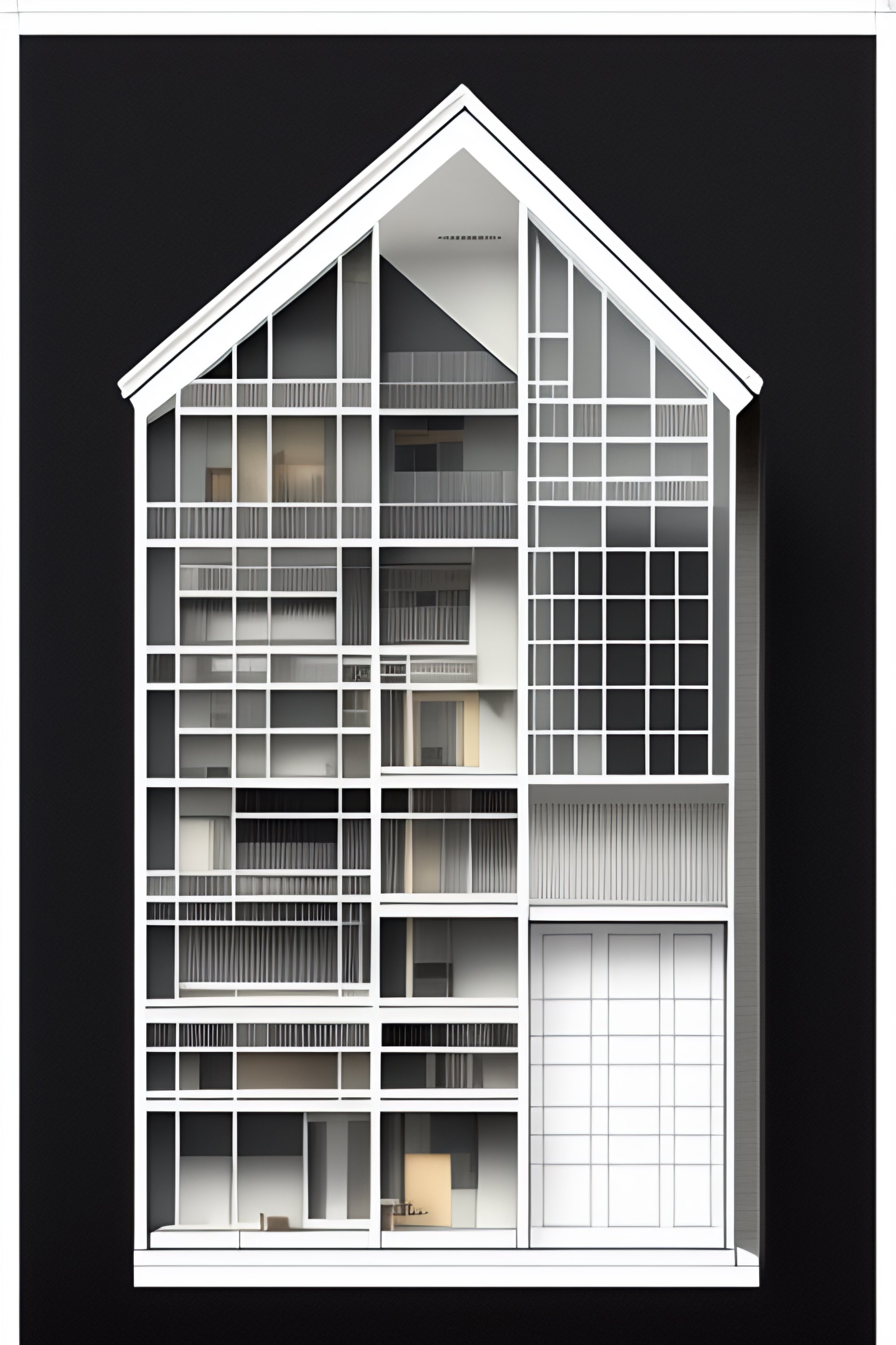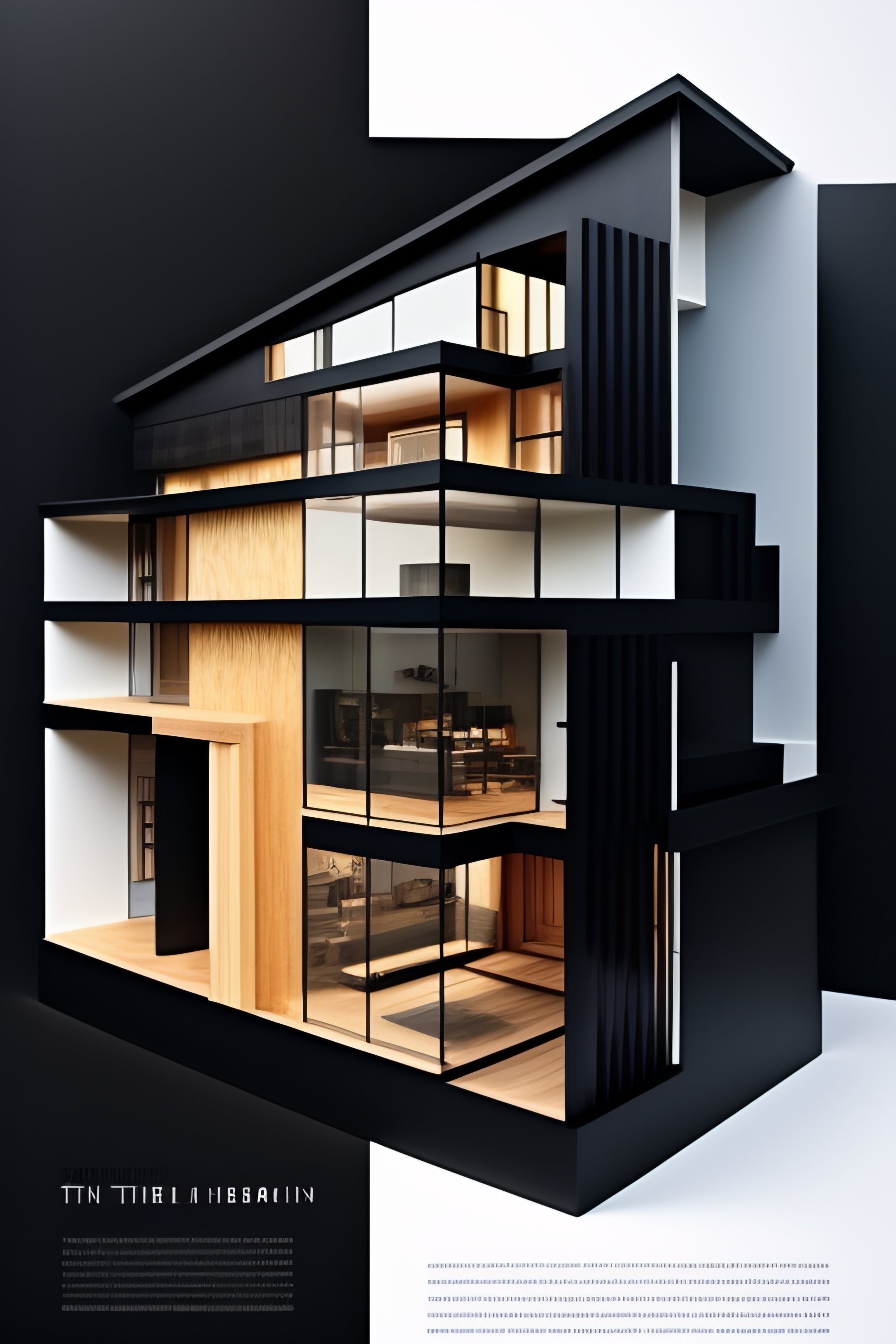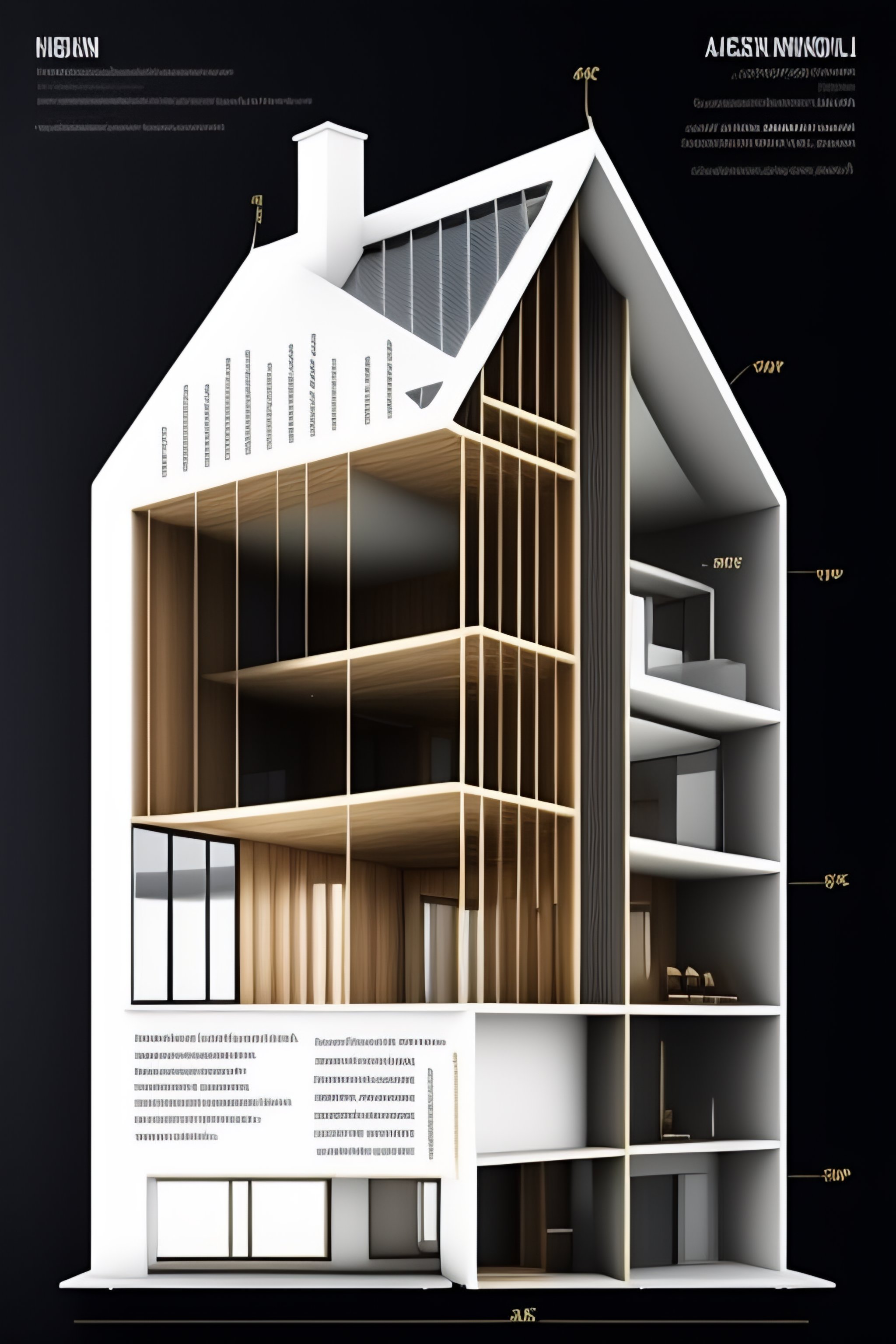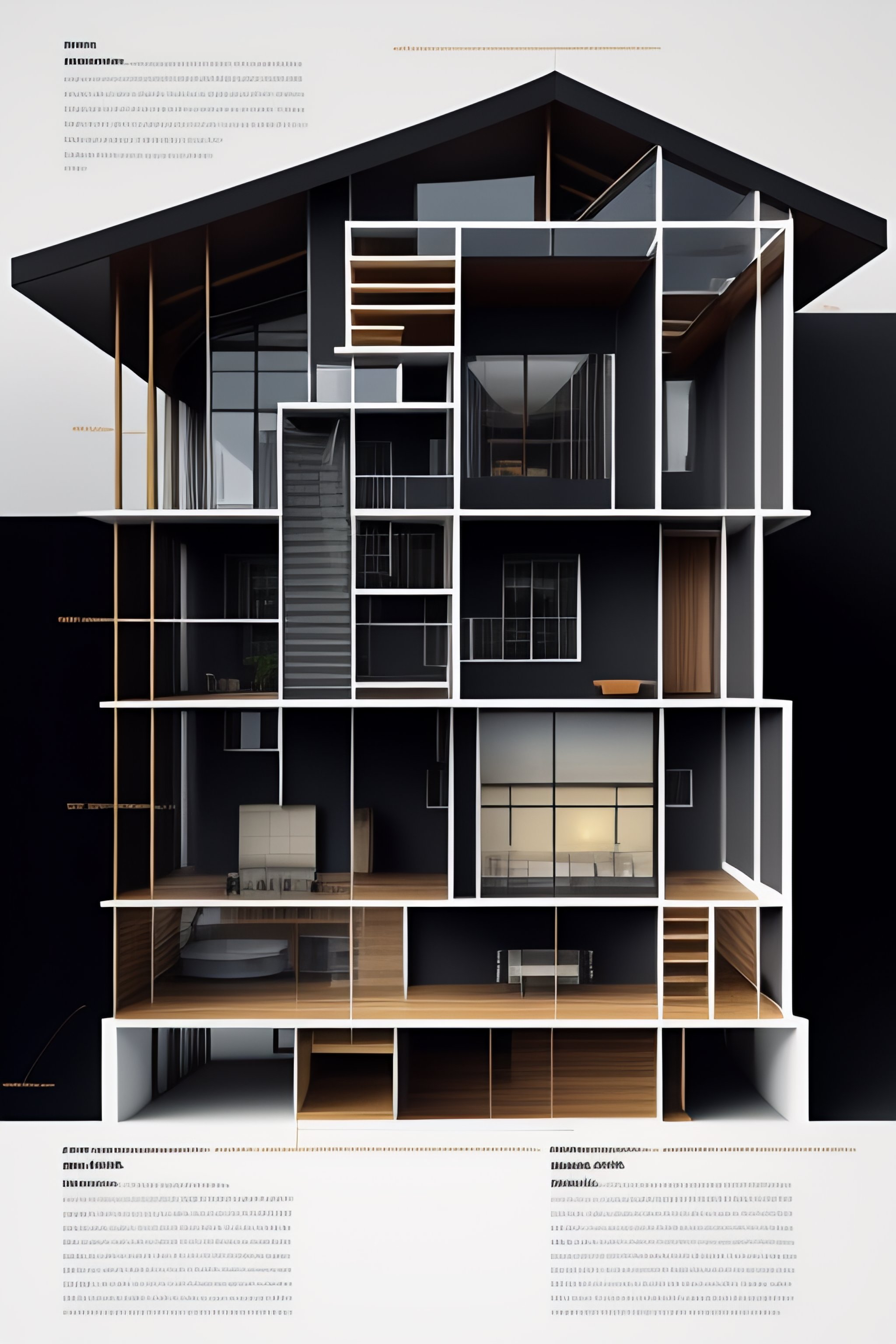 Architecture cross-section of a house made of black metal, diagram, technical drawing, stunning design