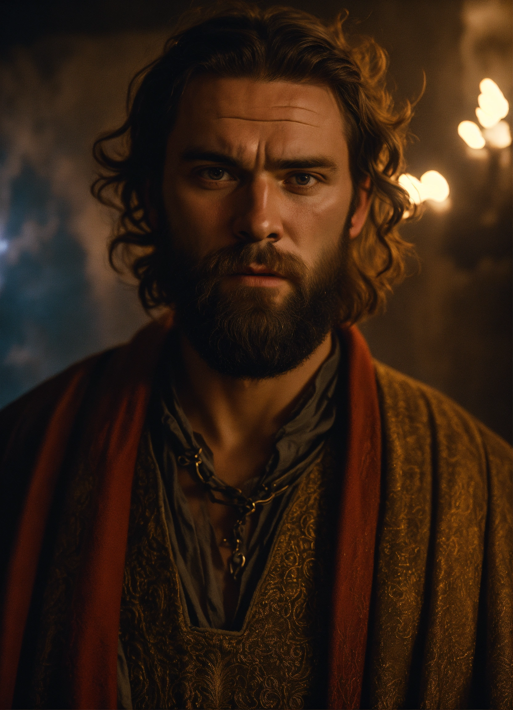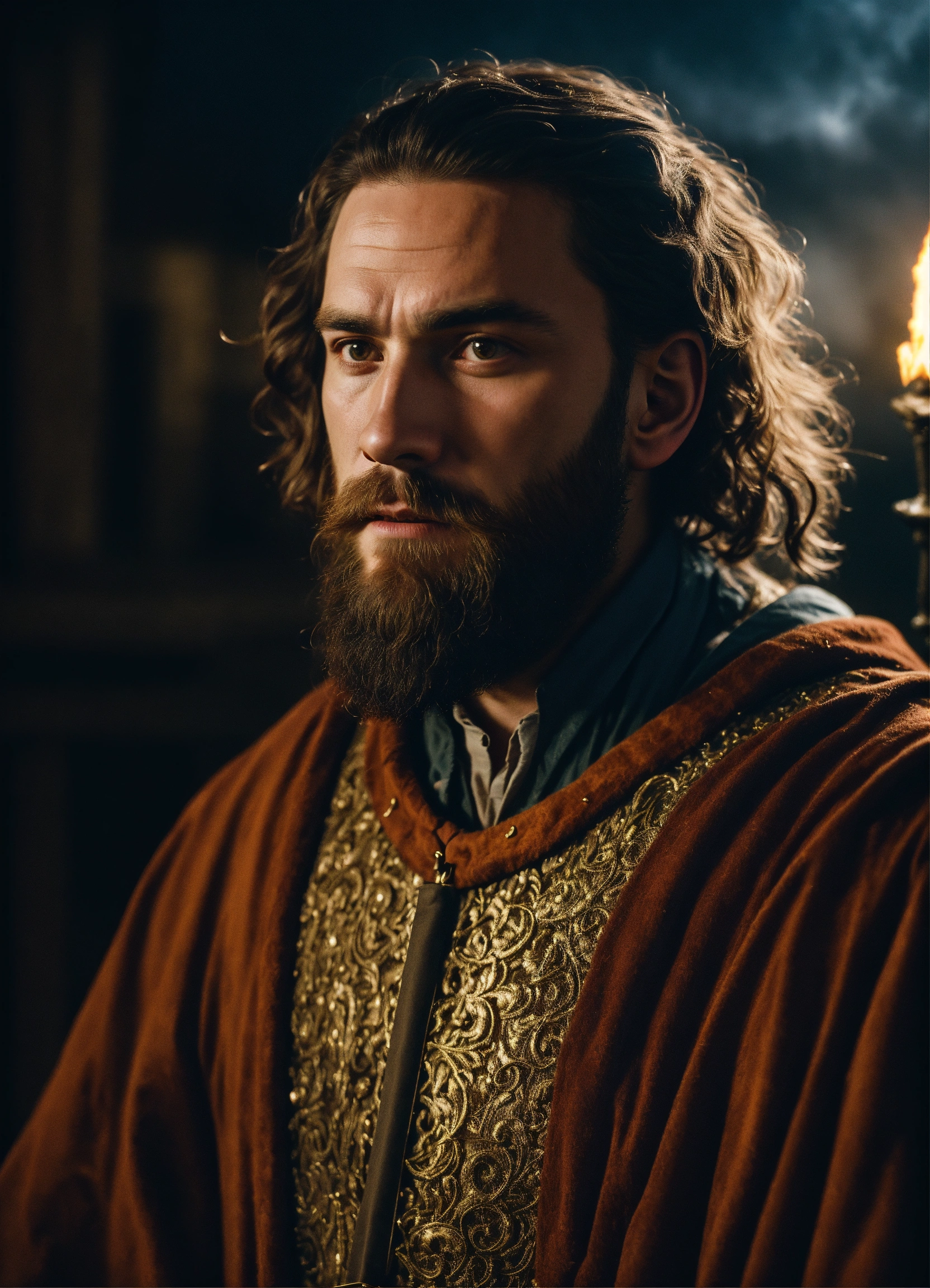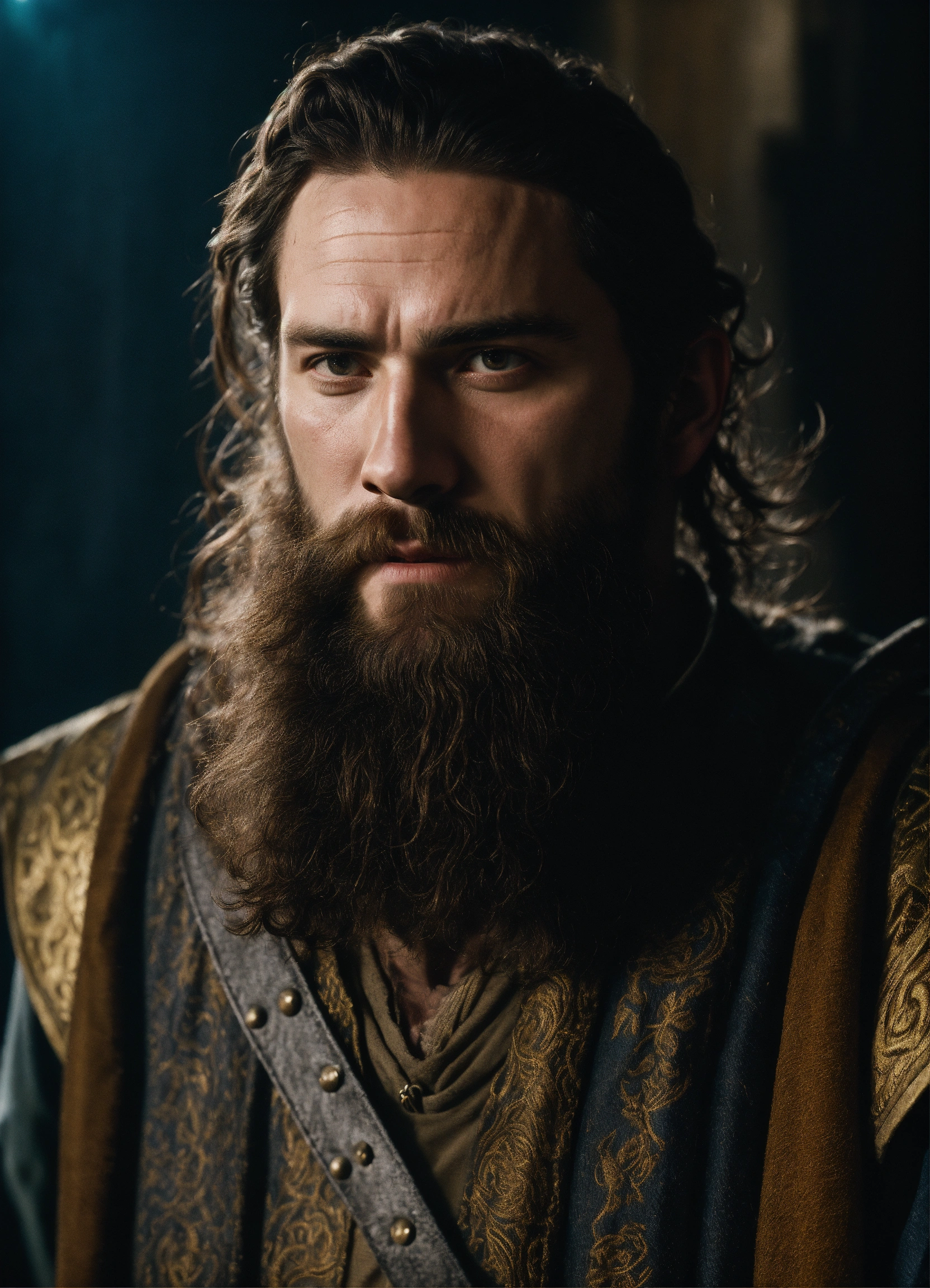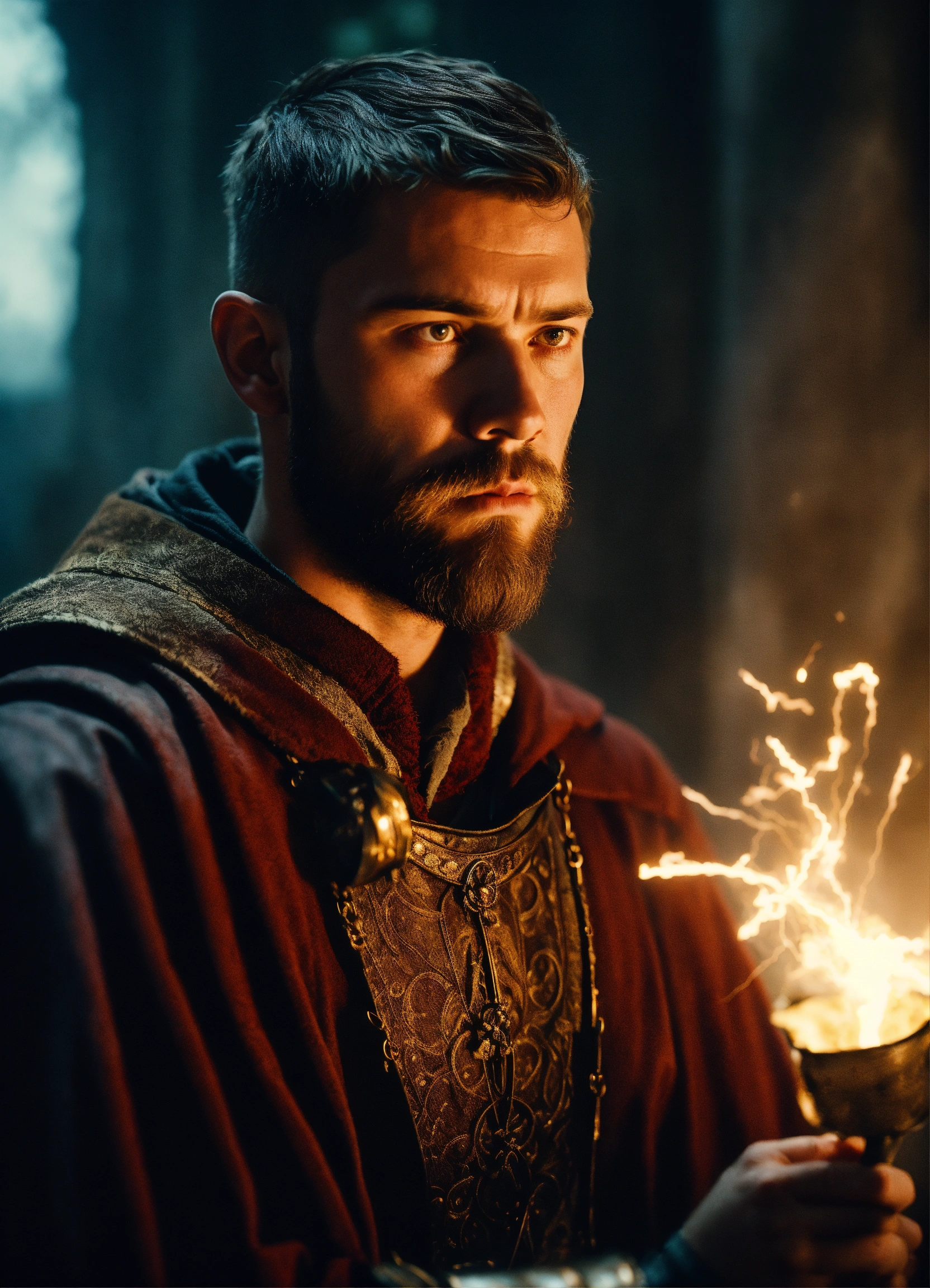 A cinematic portrait of a young medieval wizard with very short beard and hair in a magical medieval wizard style, from [2022, drama genre, the northmen movie], [dutch angle shot], [captured by panavision 35mm millennium xl2], [film directed by robert eggers], [dramatic lightning], [dramatic lightning]
