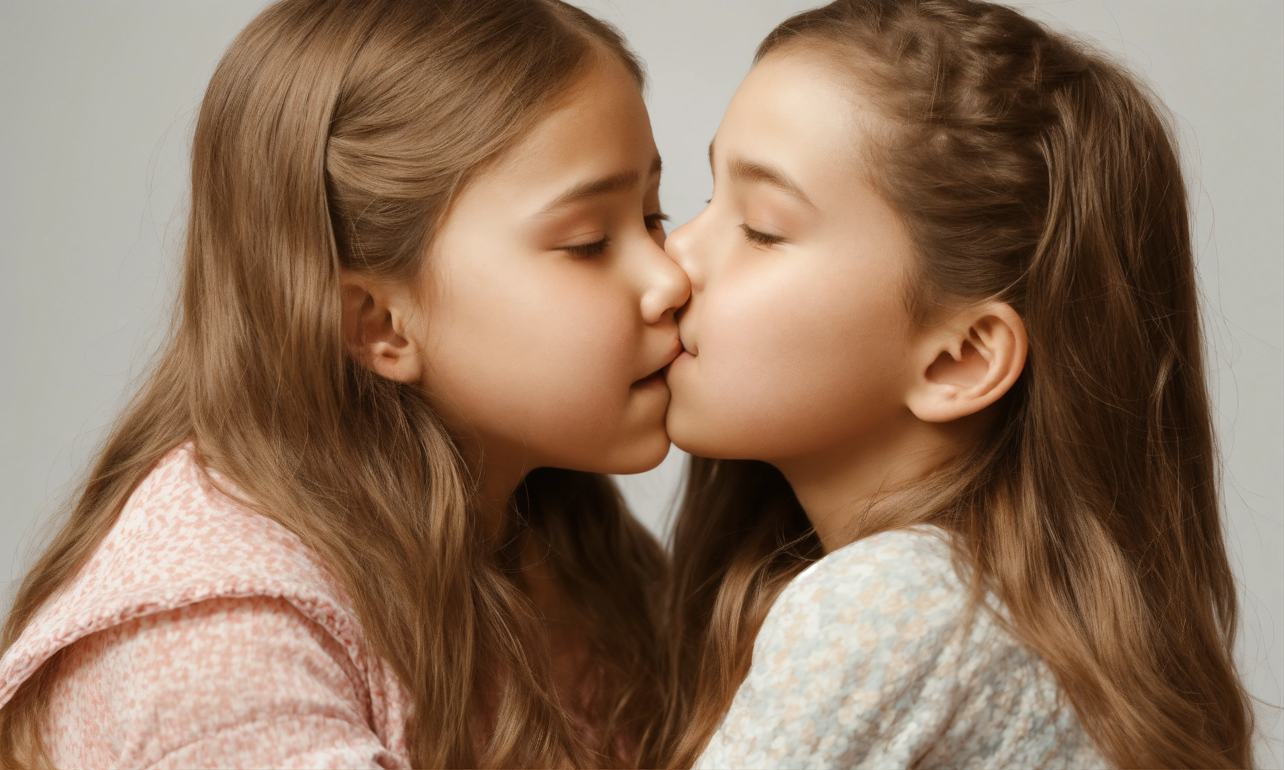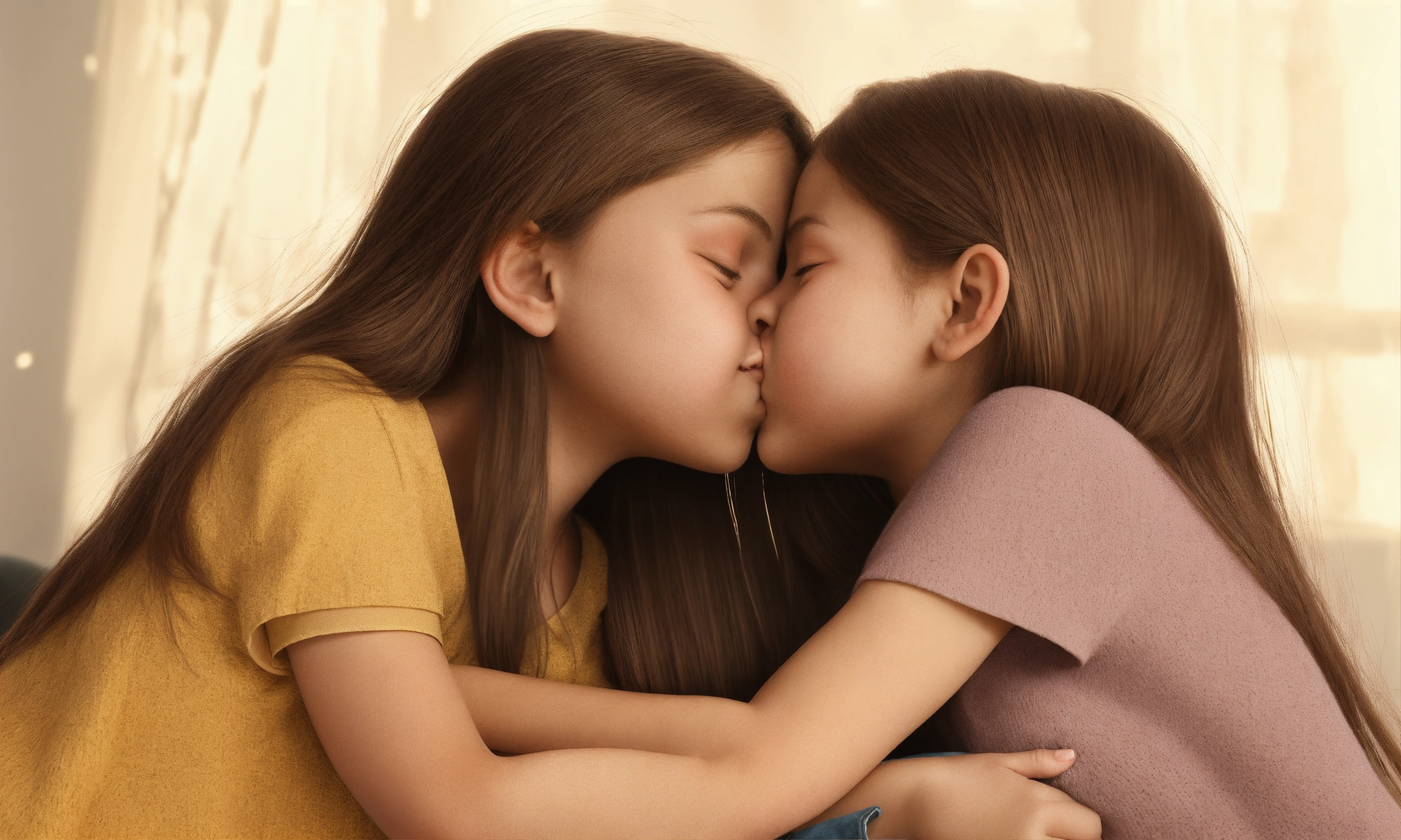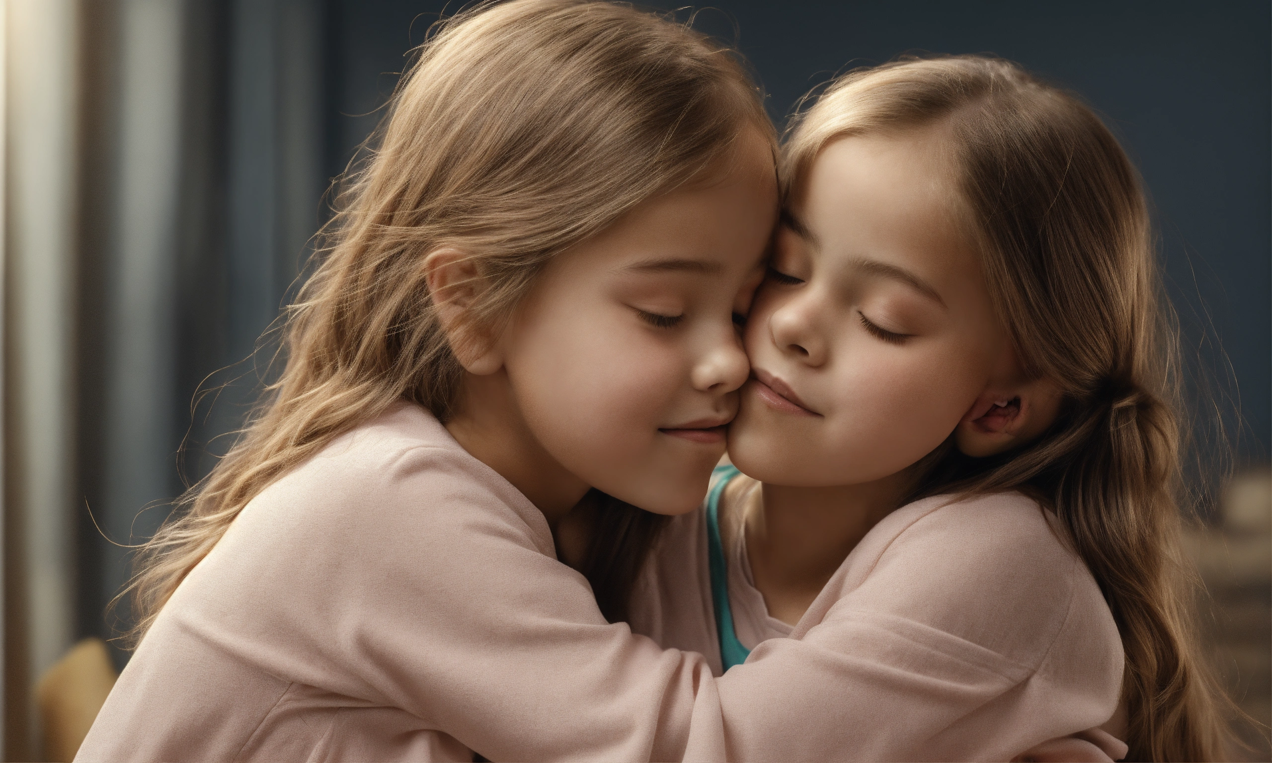 Two 10-year-old sisters hug and kiss each other, emotional and loving, they care deeply for each other, full body render, very realistic, white background