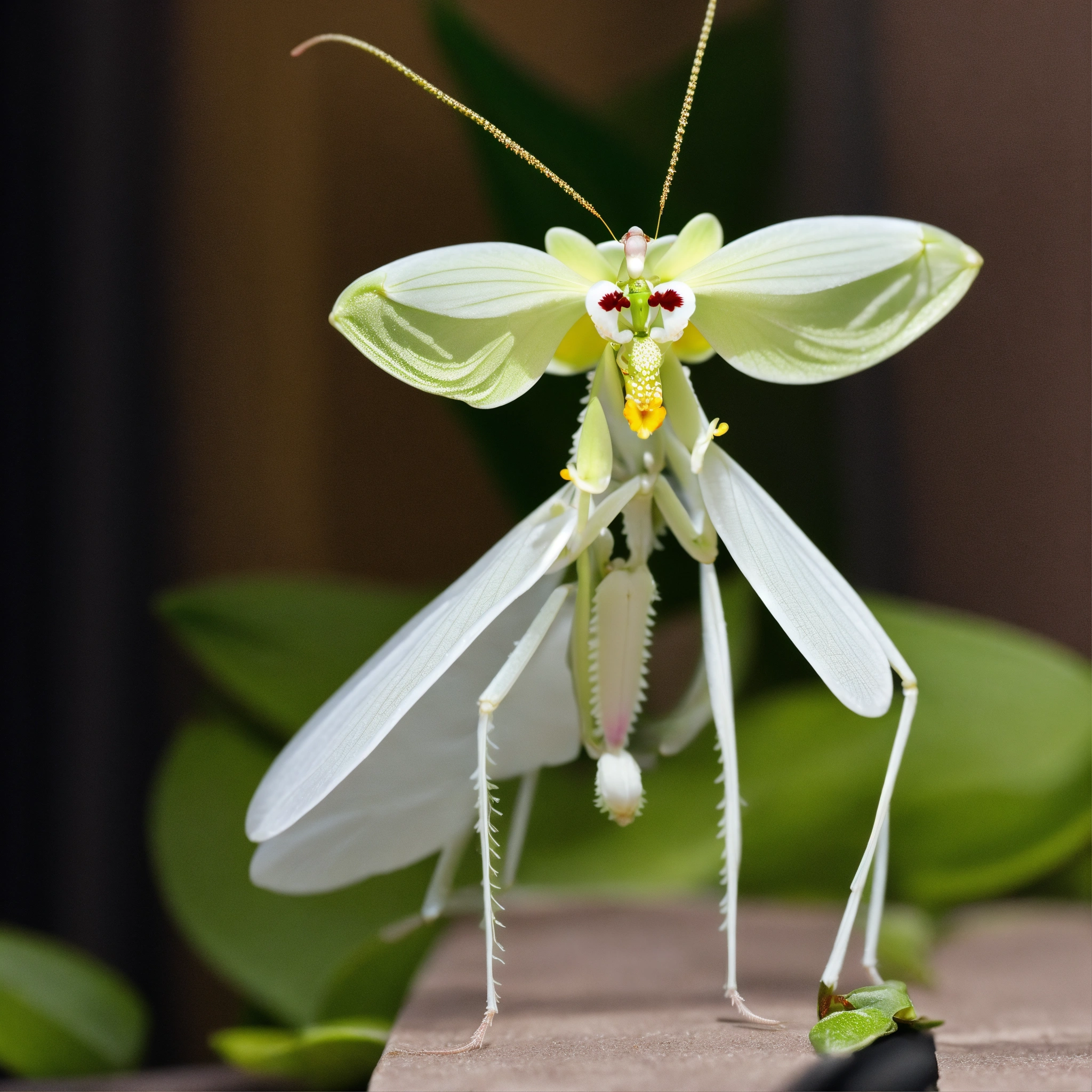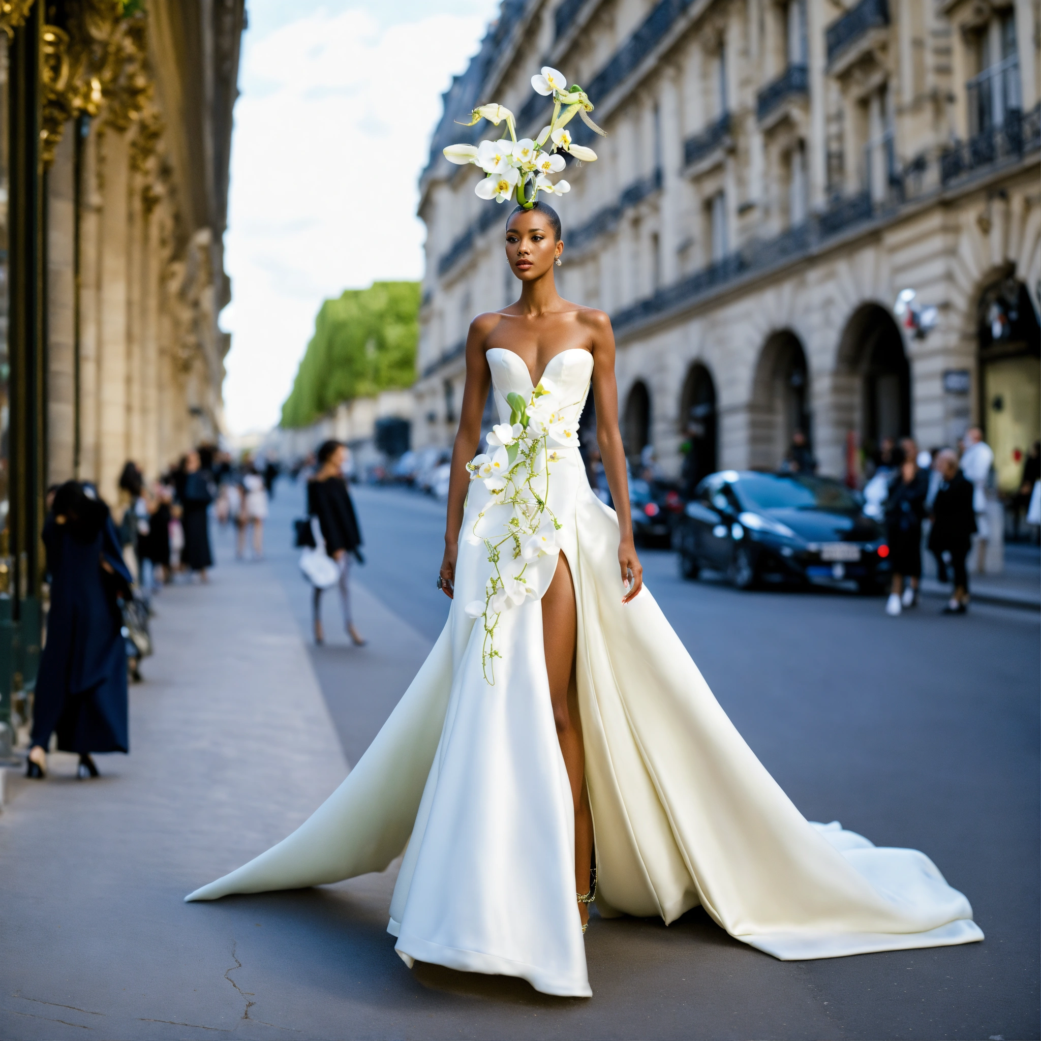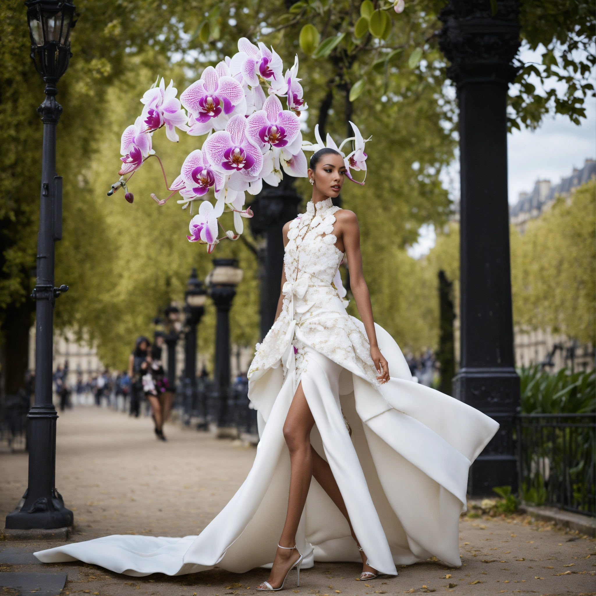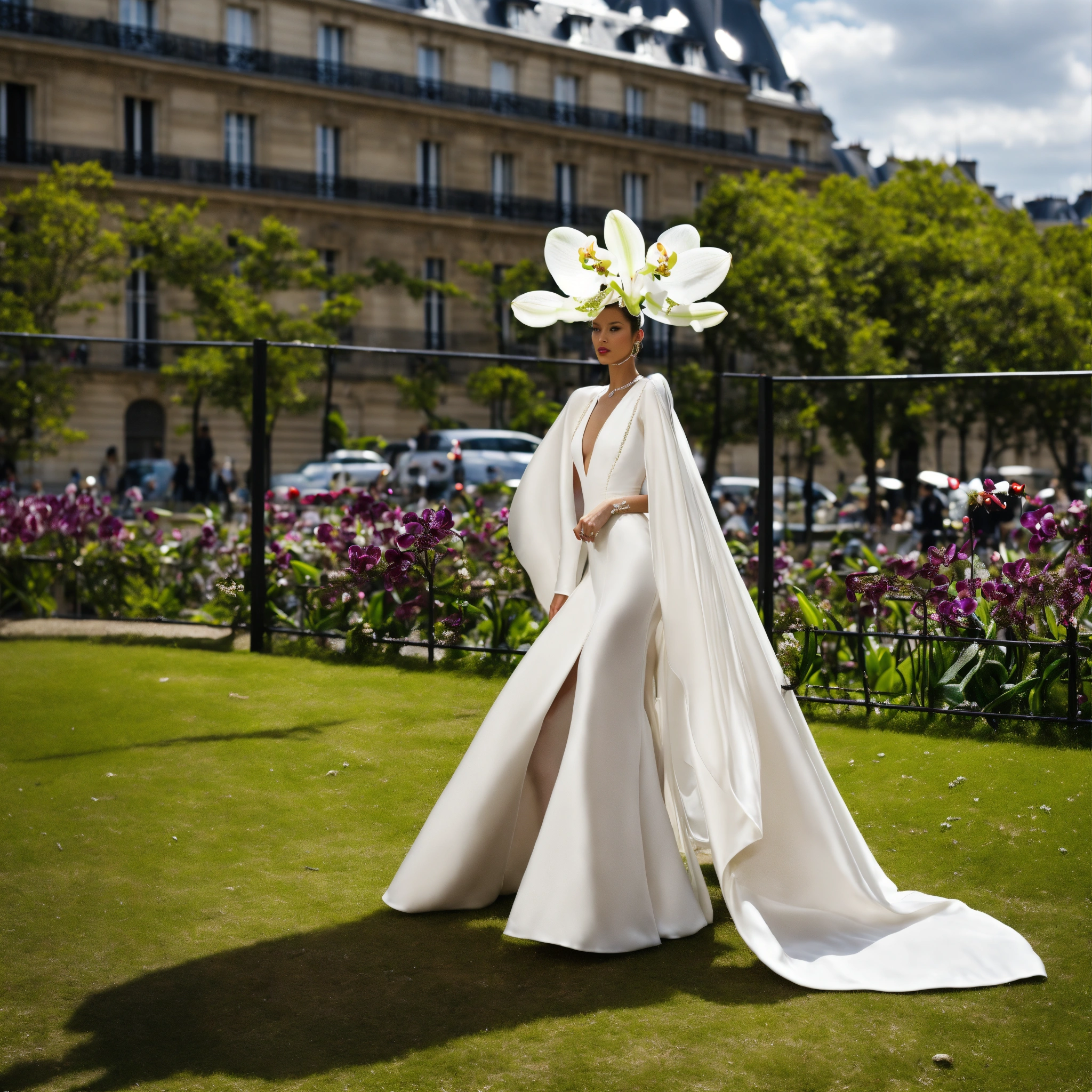 An orchid praying mantis wearing a haute couture white dress at paris fashion week