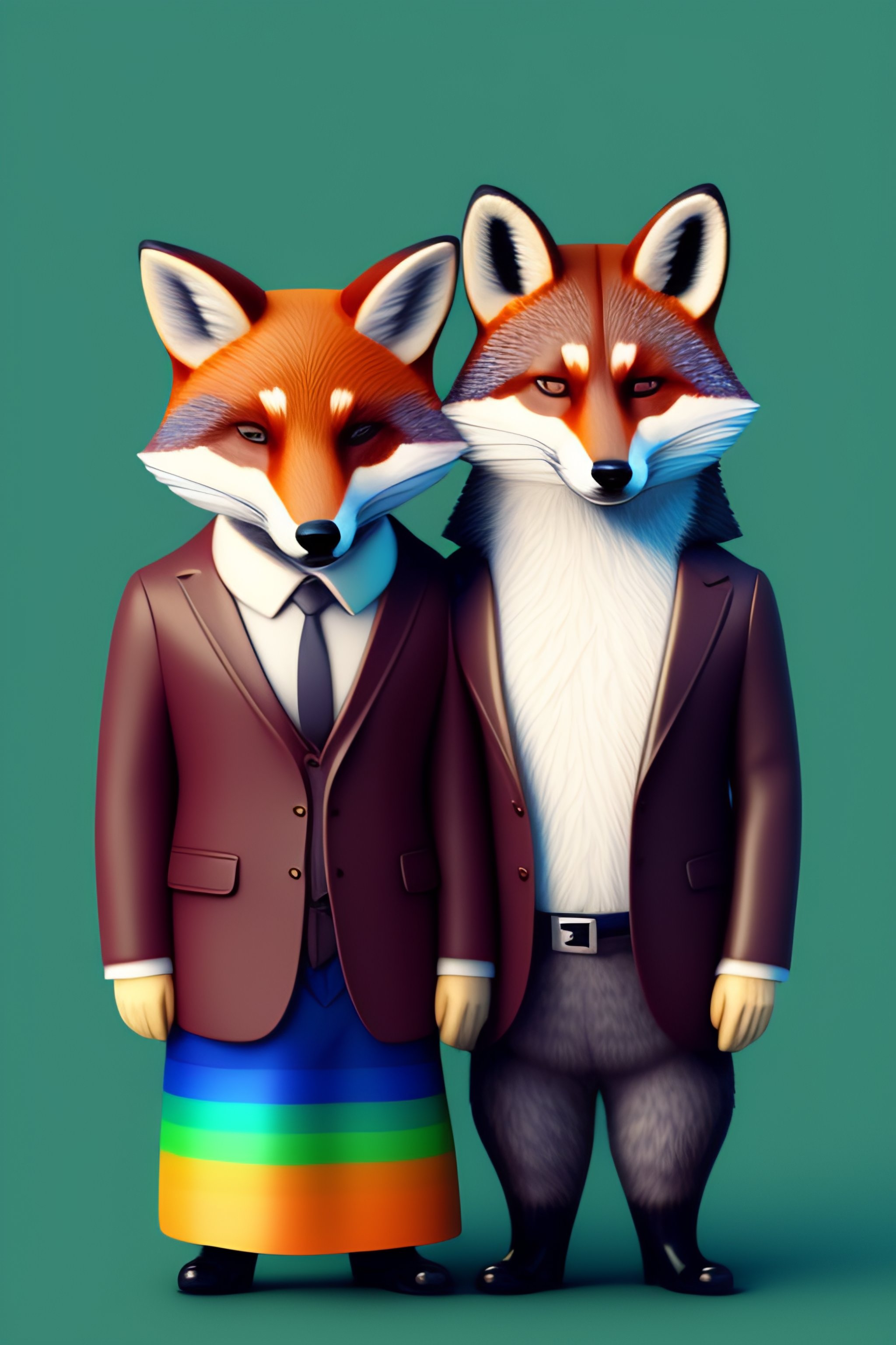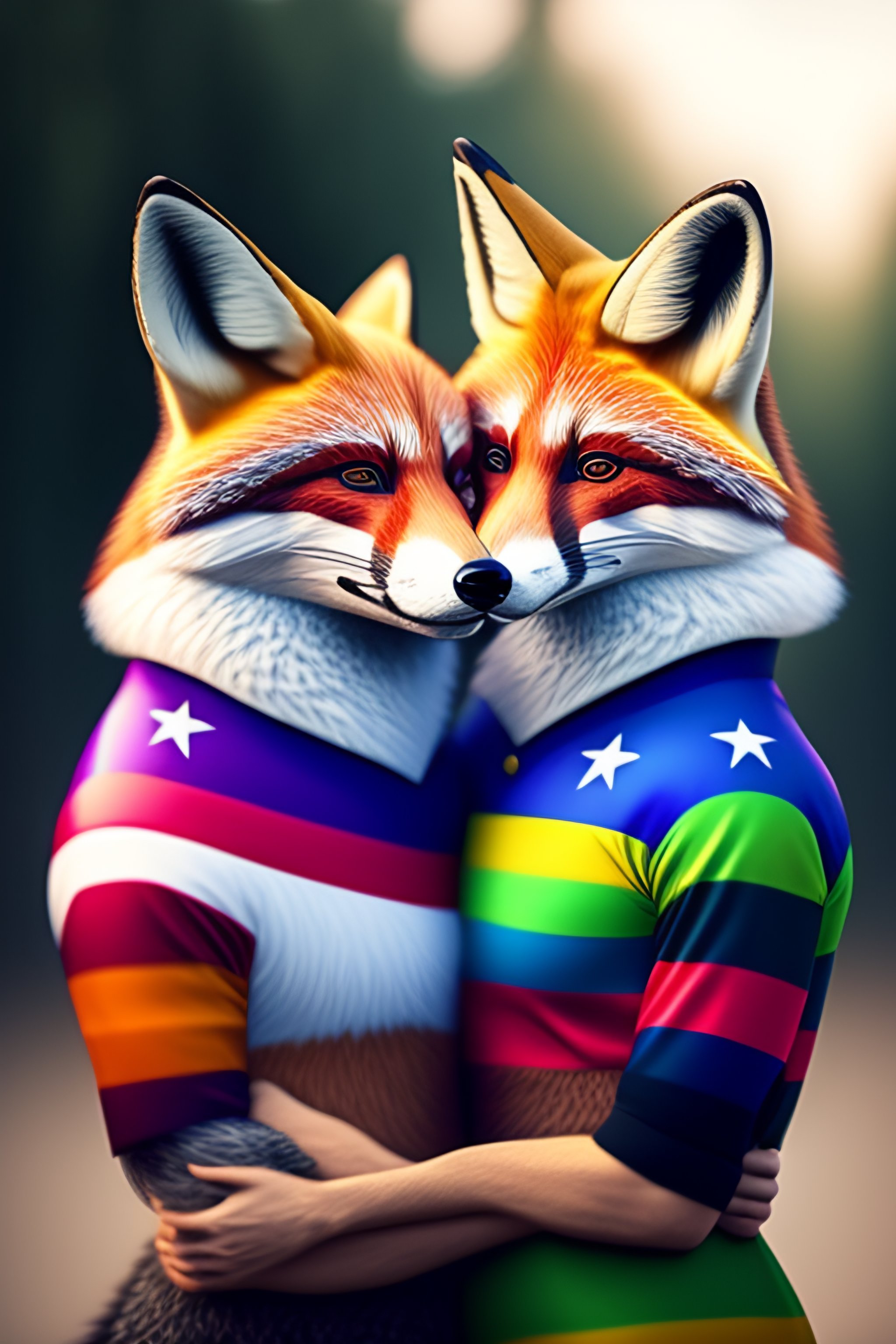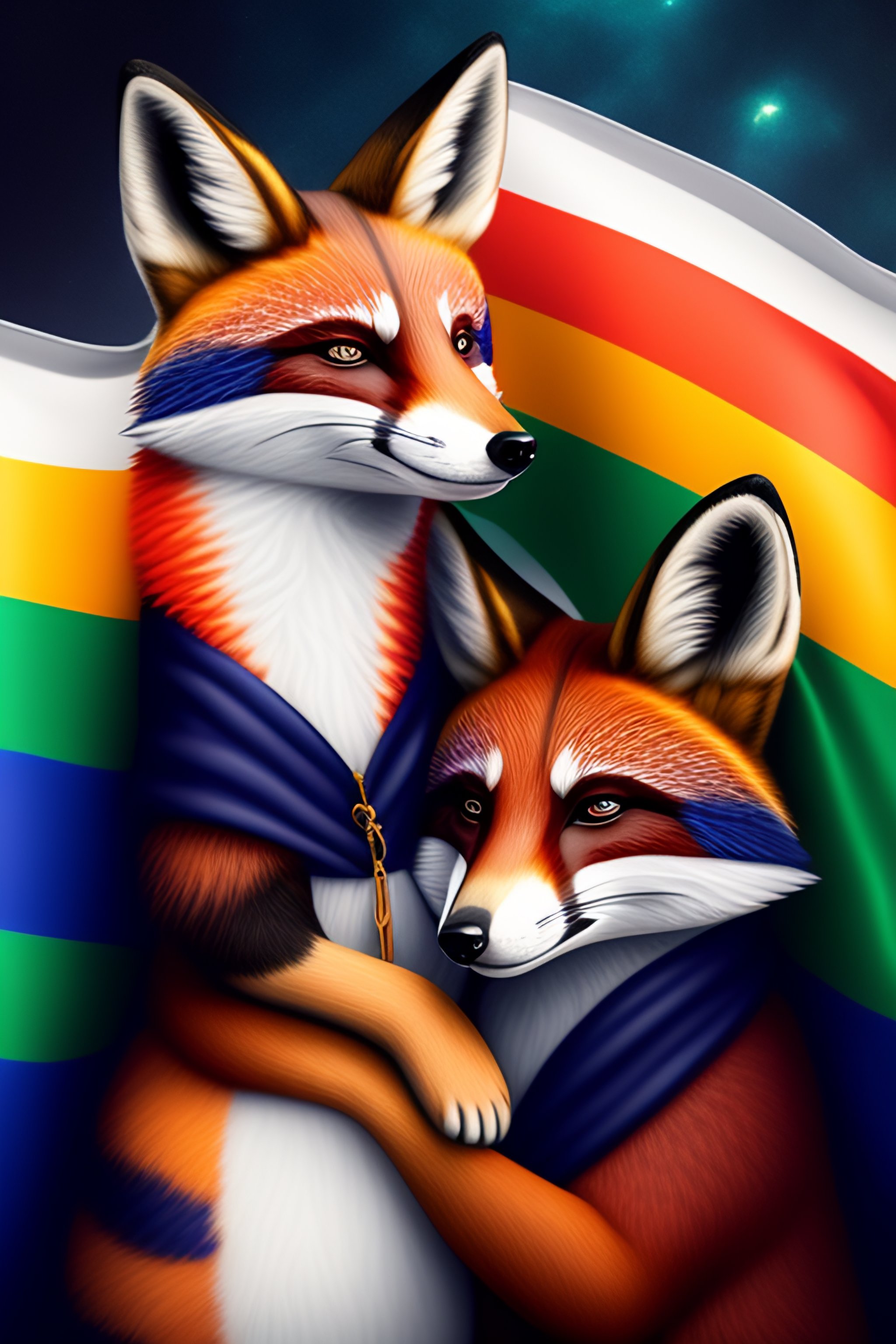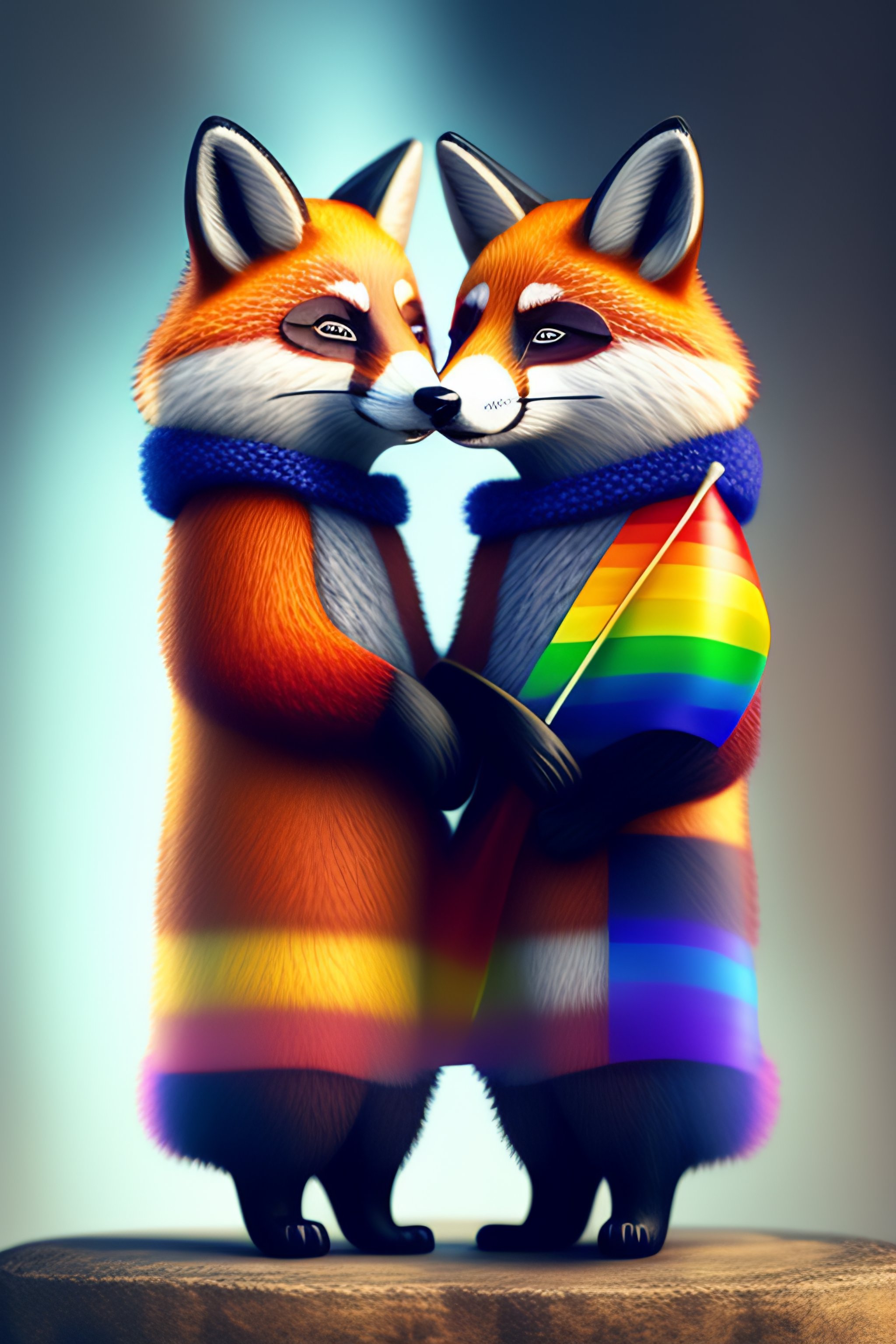 One manly fox and one manly raccoon as a gay couple holding together with the gay flag