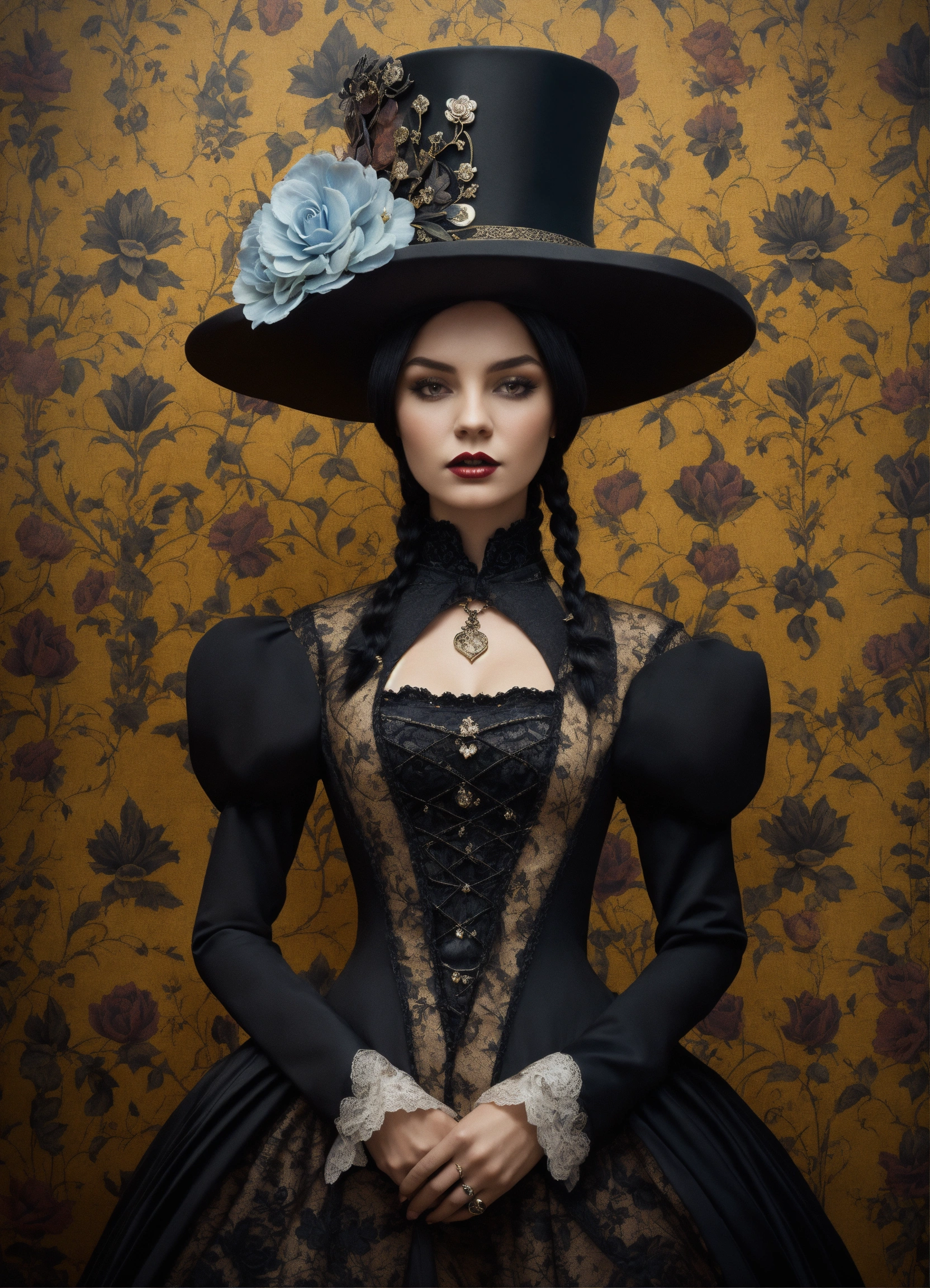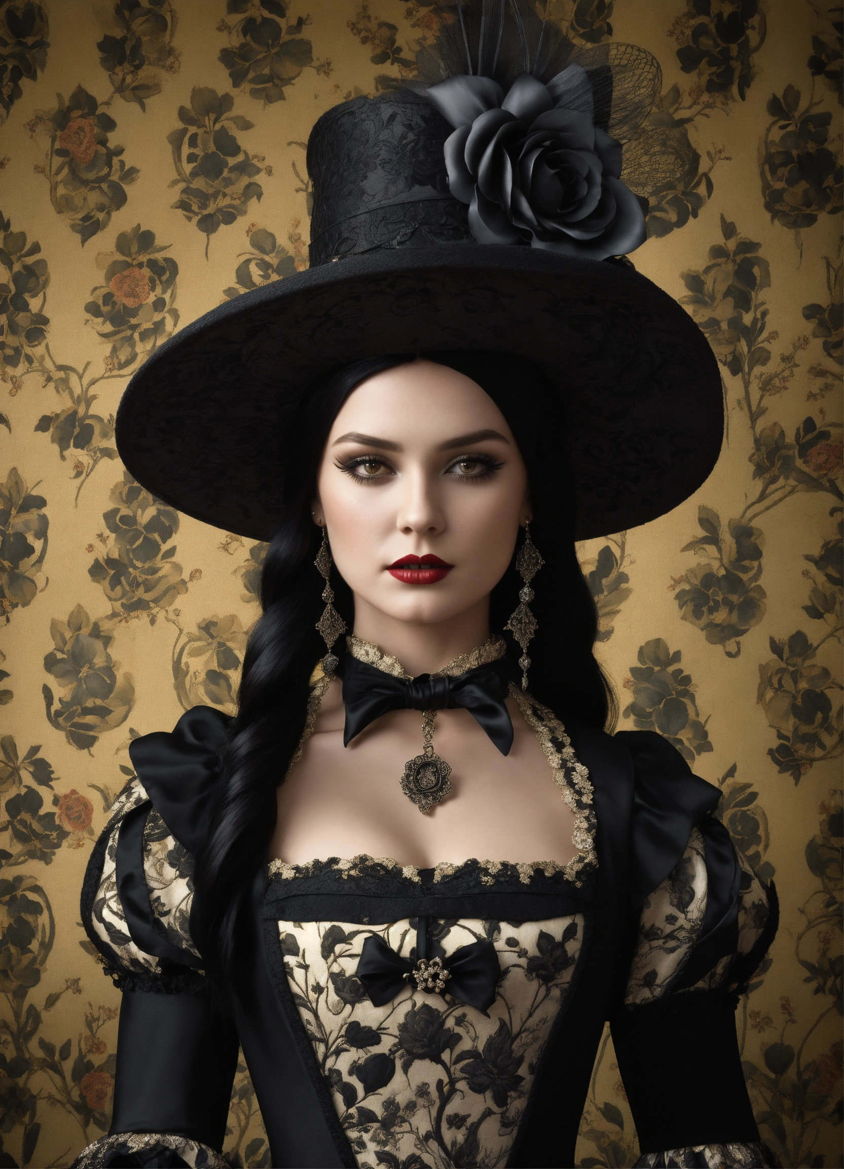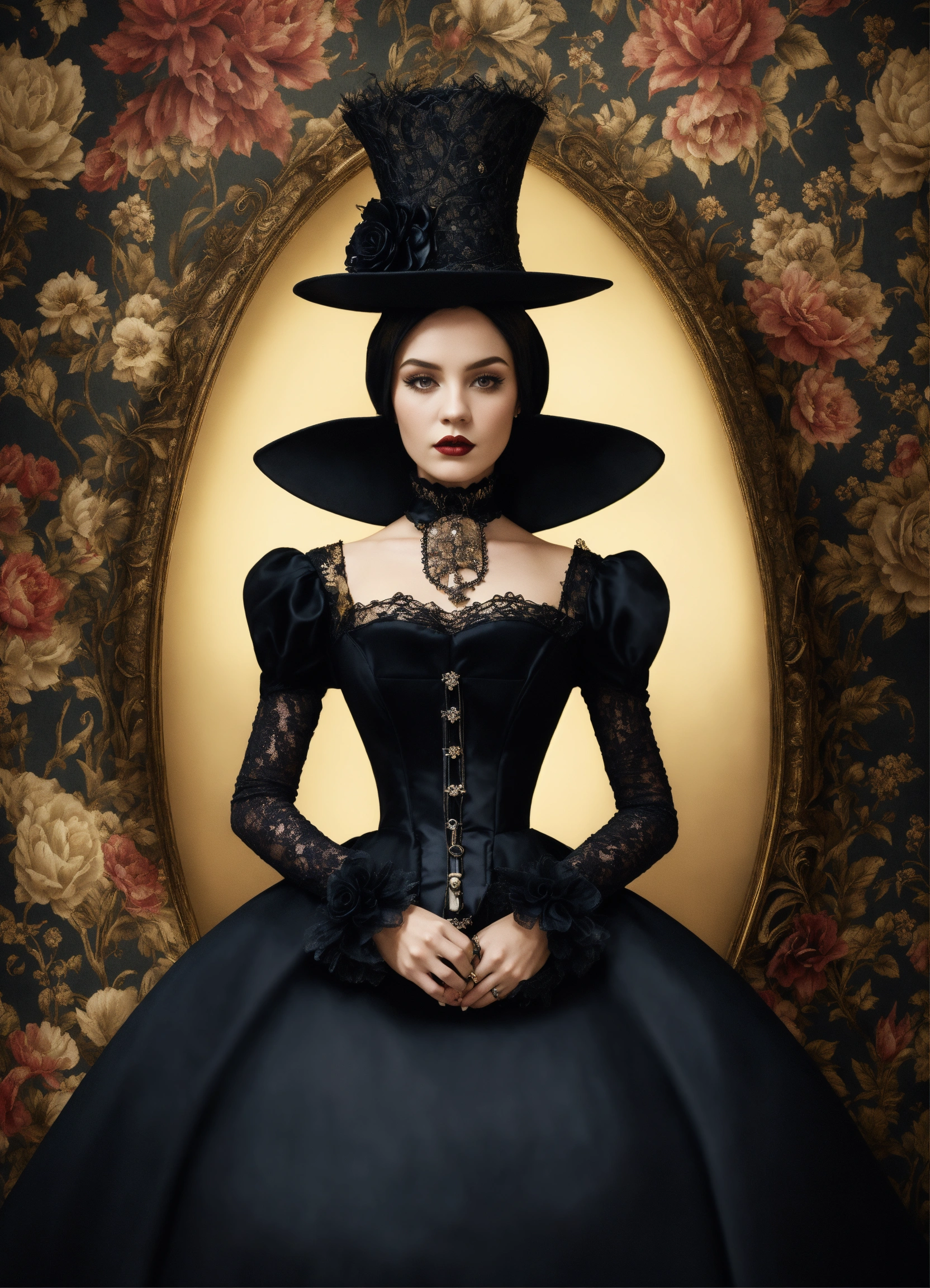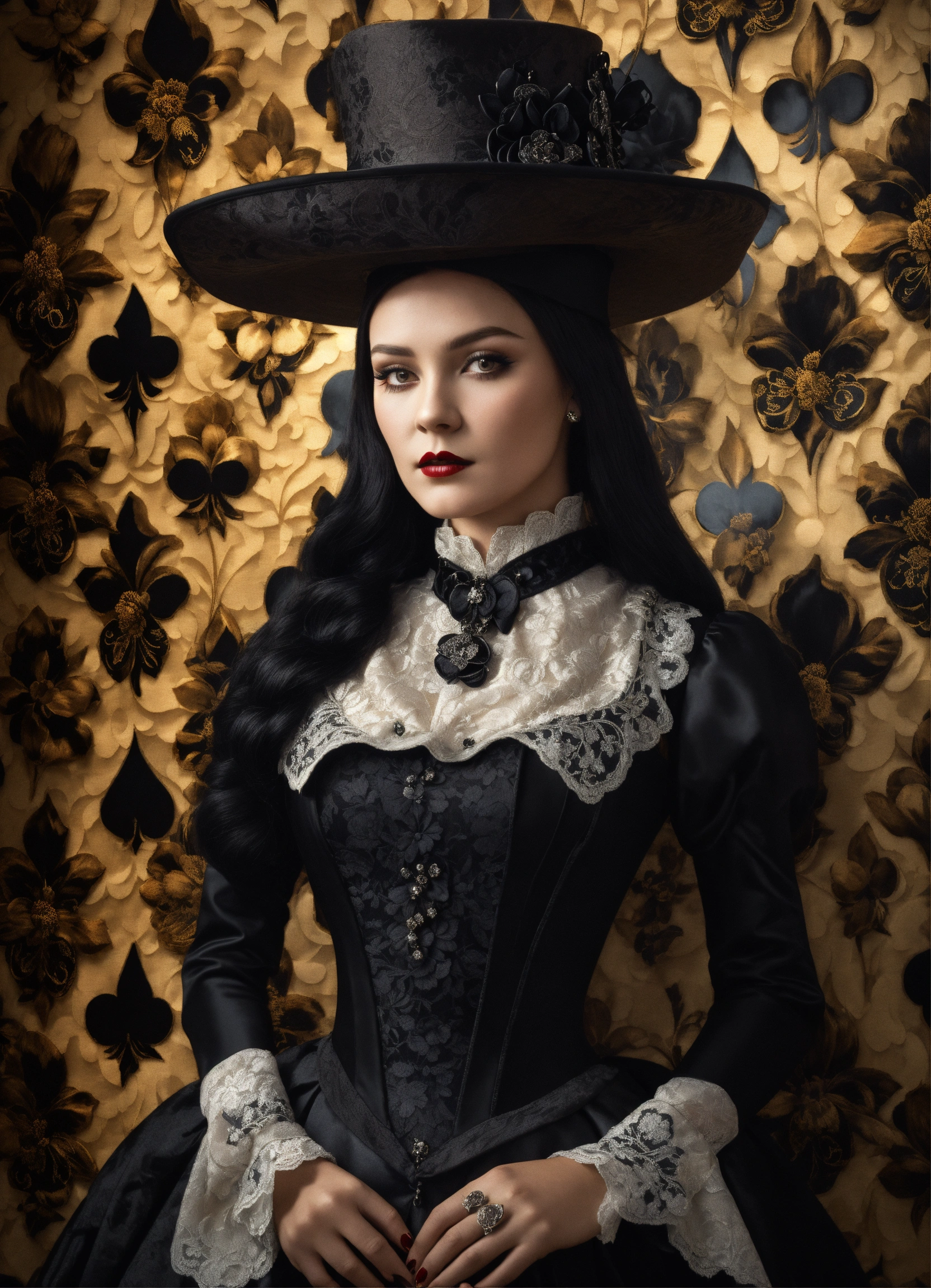 Elaborate gothic wednesday adams queen of spades in an elegant and intricate gothic costume and wearing a fascinating hat, background with flower patterned wallpaper, 3d, 32k, photorealistic and very detailed.
