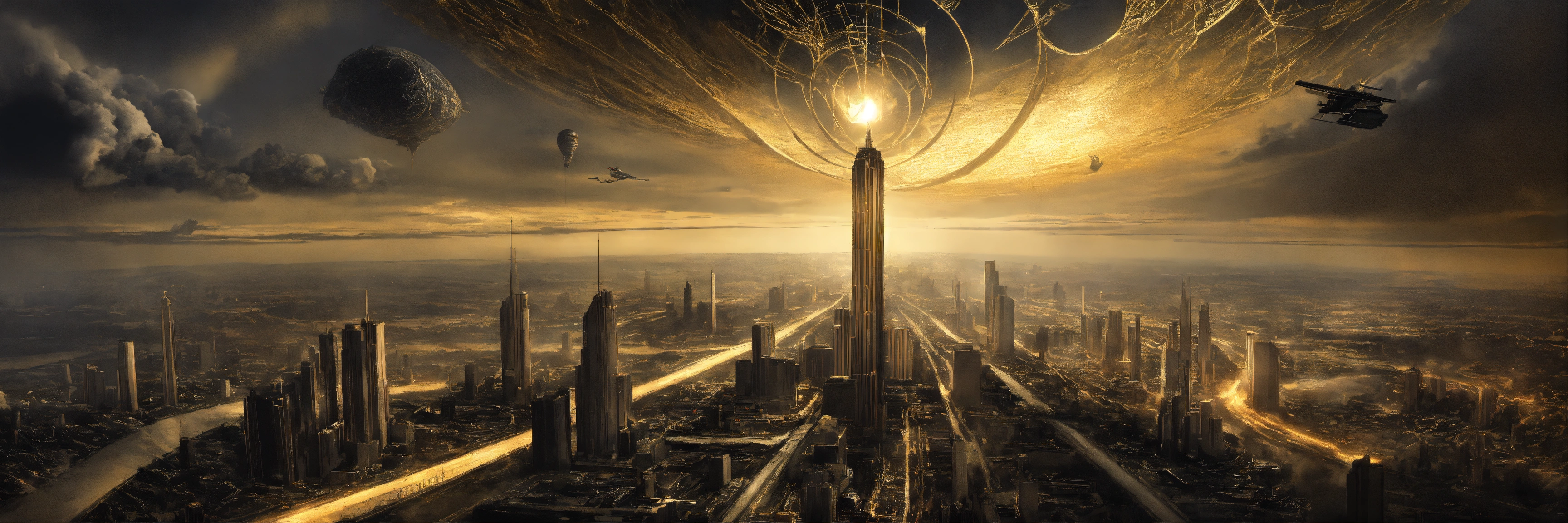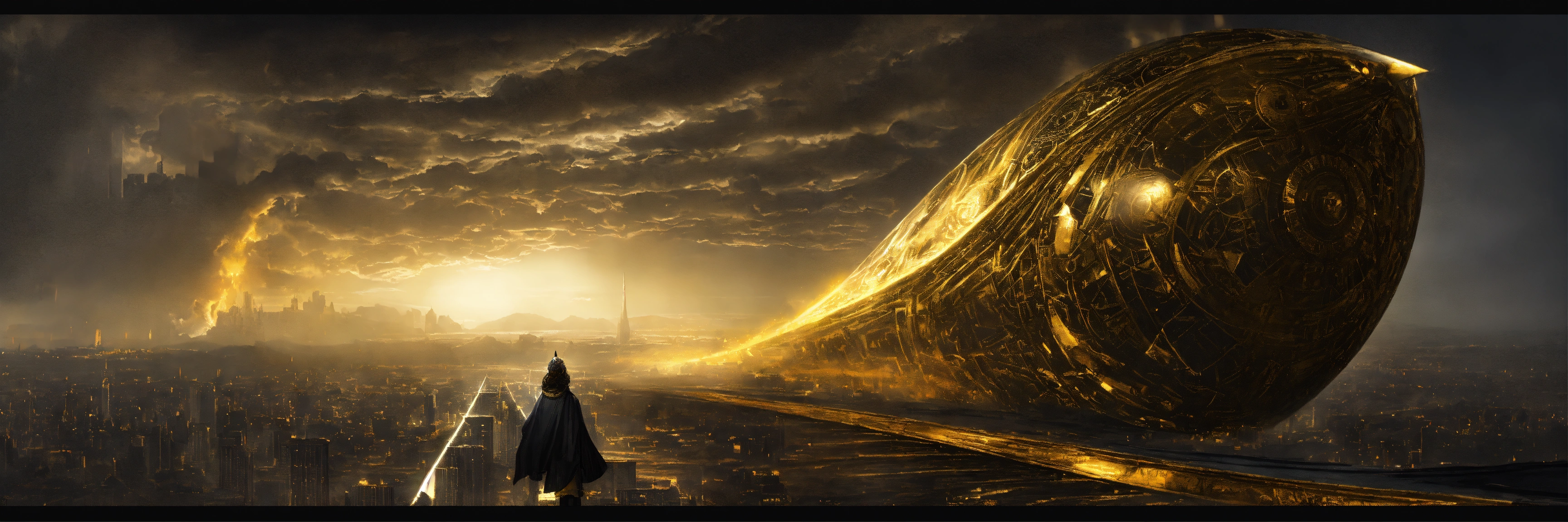 Divinely inspired prophetic representation of armageddon, rise of son of perdition, extremely creative and unique, highly detailed and mildly futuristic, created by apollyon and eli, revelations 911, high technology, cast in black, greyscale and gold