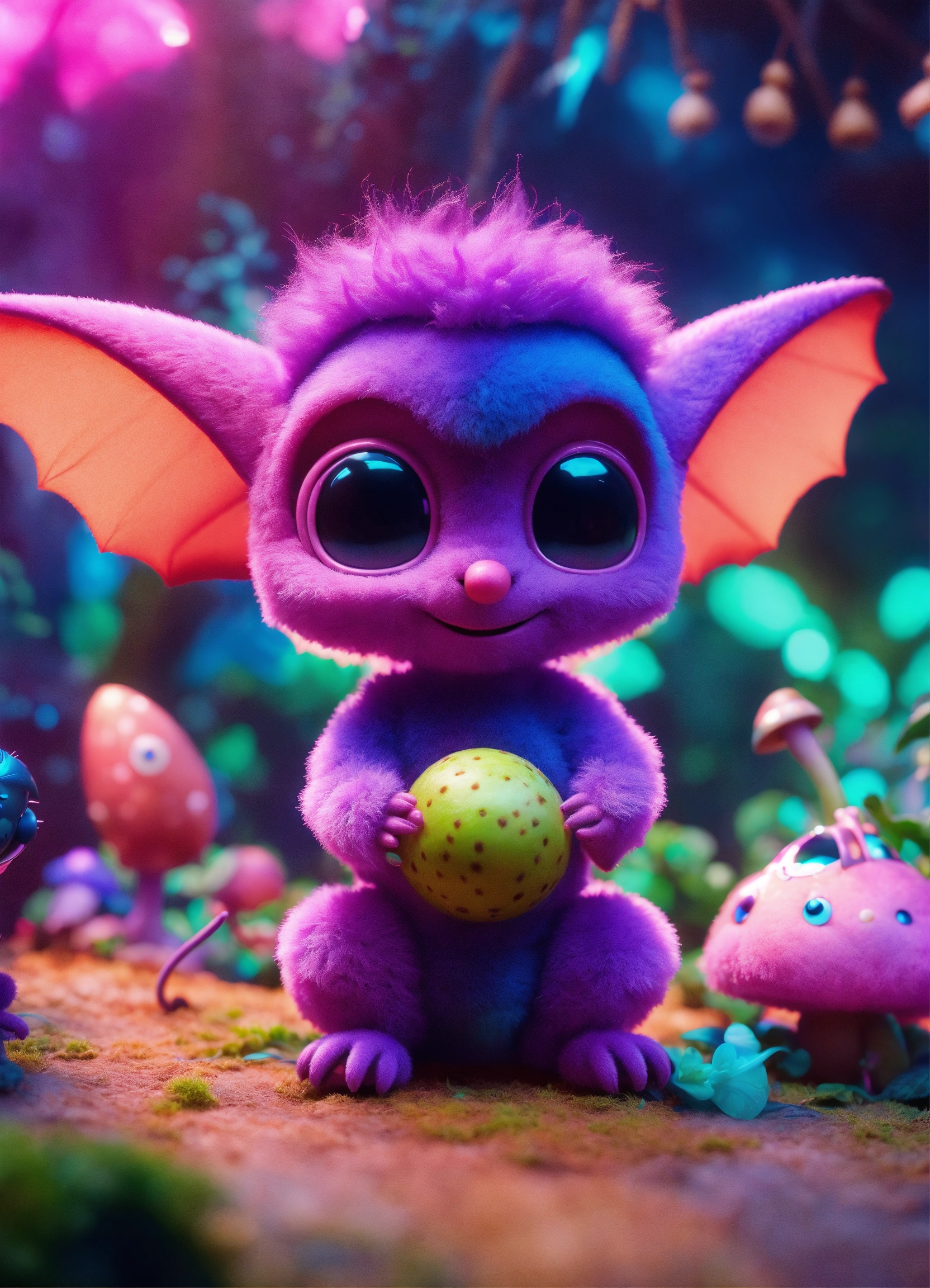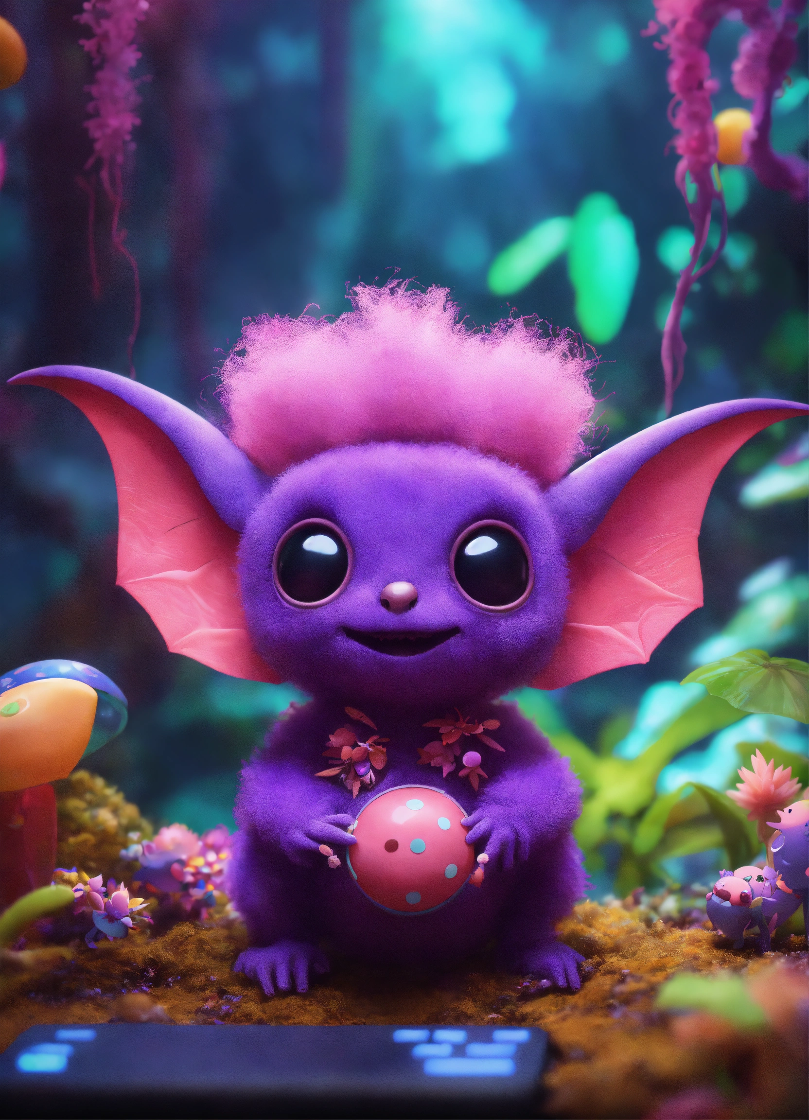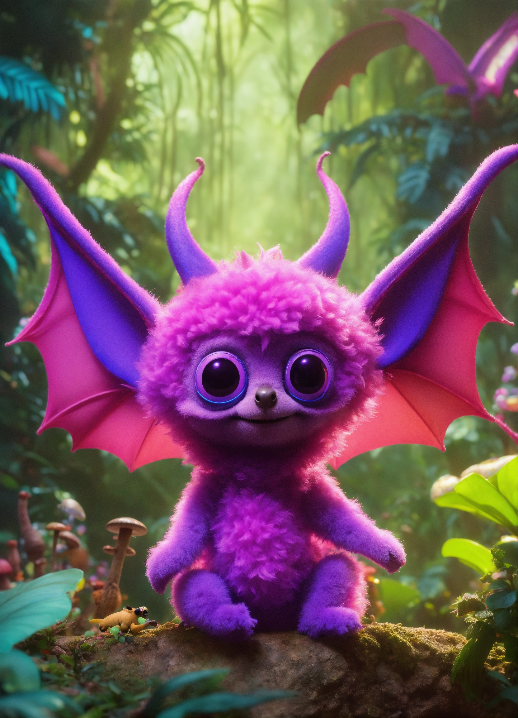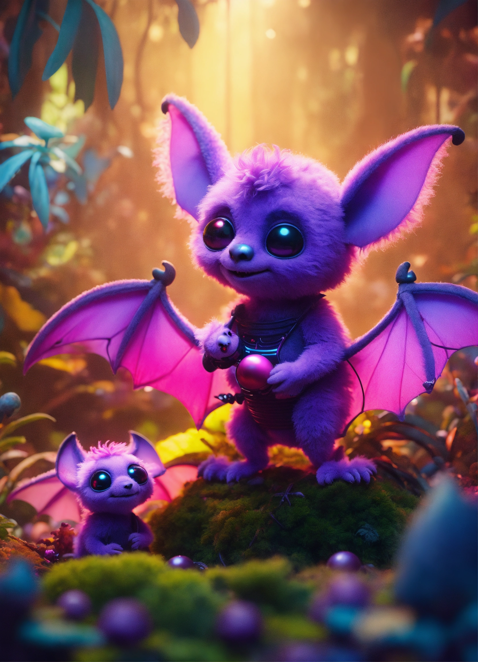 Band of 3 cute fuzzy pink and purple alien fruitbat characters with big ears, bat wings, purple mohawk, in an exotic alien jungle playing with a toy synthesizer, psychedelic mushrooms, cosmic, disney, pixar, realistic, 8k