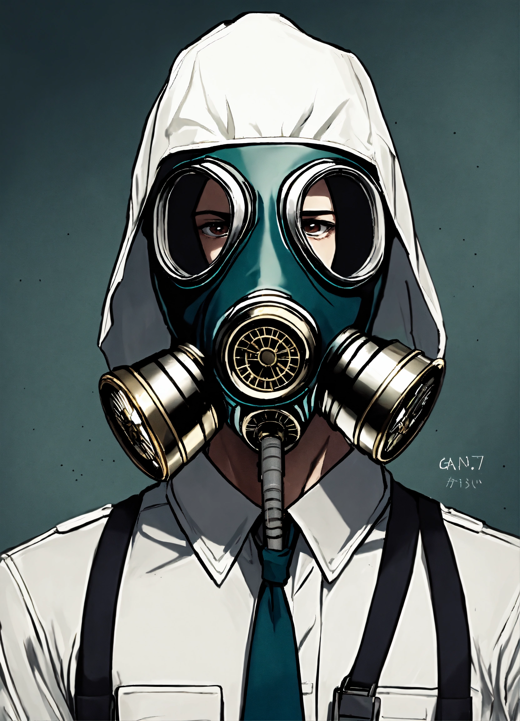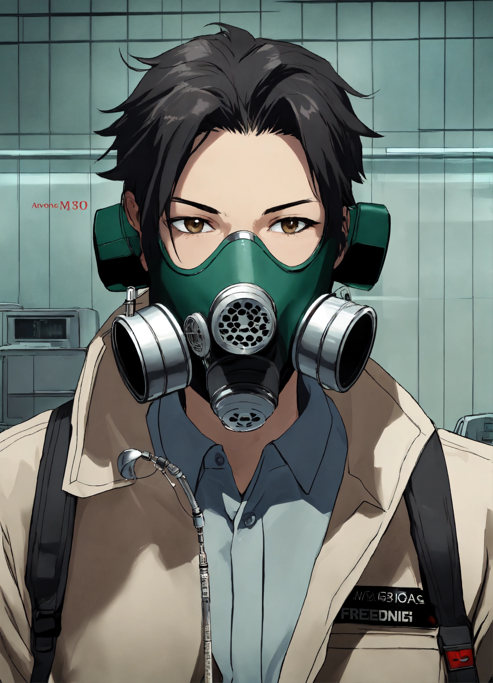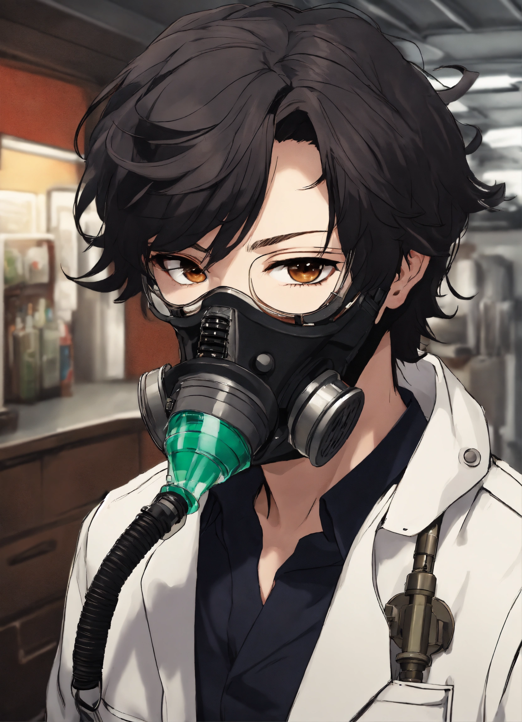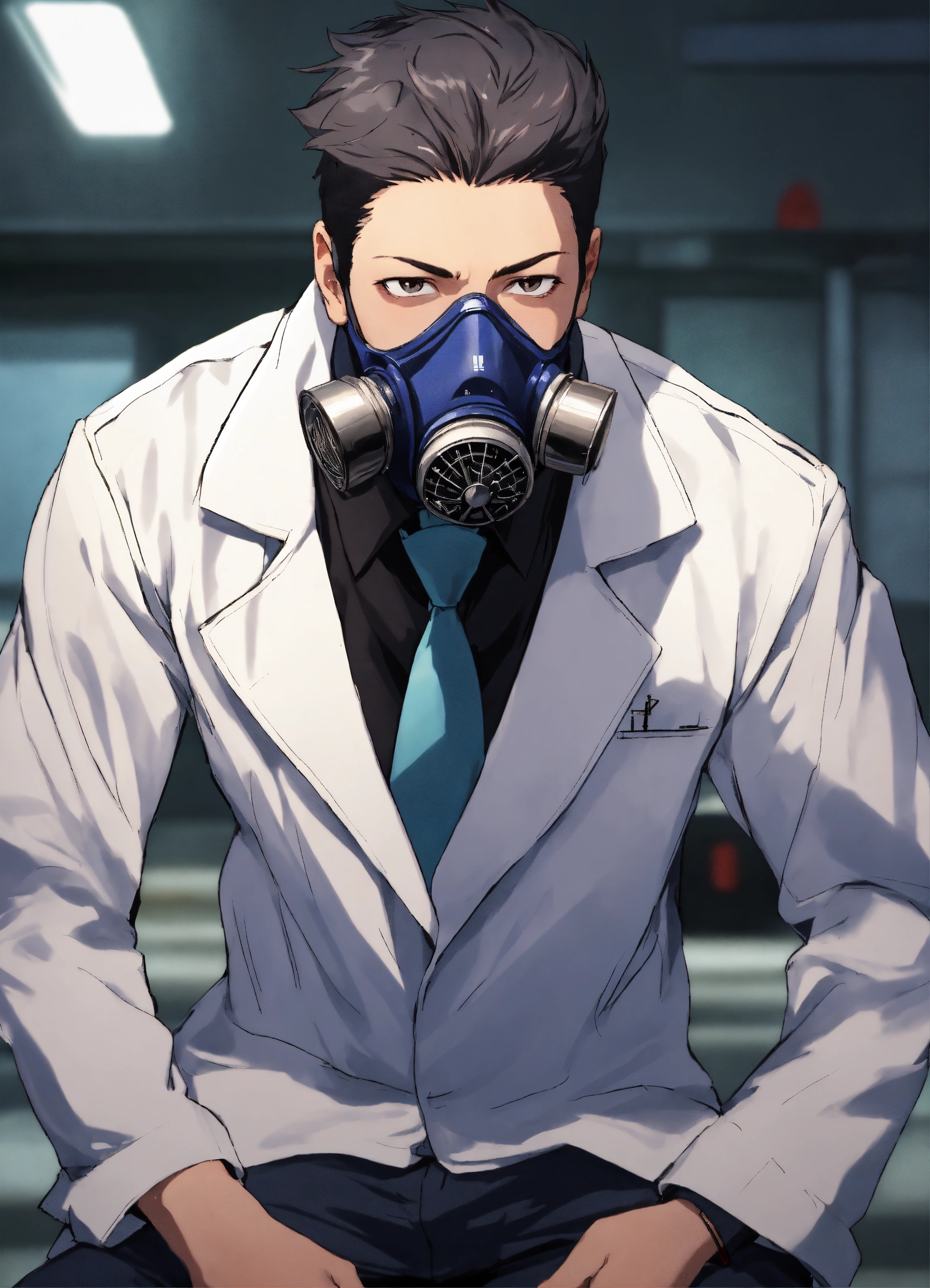 An extremely average-looking man of european descent and average height. he wears an avon m50 gas mask hiding his face, and his straight, slicked-back dark brown hair is medium length. he wears business casual attire with black slacks dress shoes a dress shirt and a plain tie with a white lab coat over top of those clothes. white lab coat. holding a syringe, holding a needle. full face avon m50 gas mask. anime style, kohei horikoshi. my hero academia
