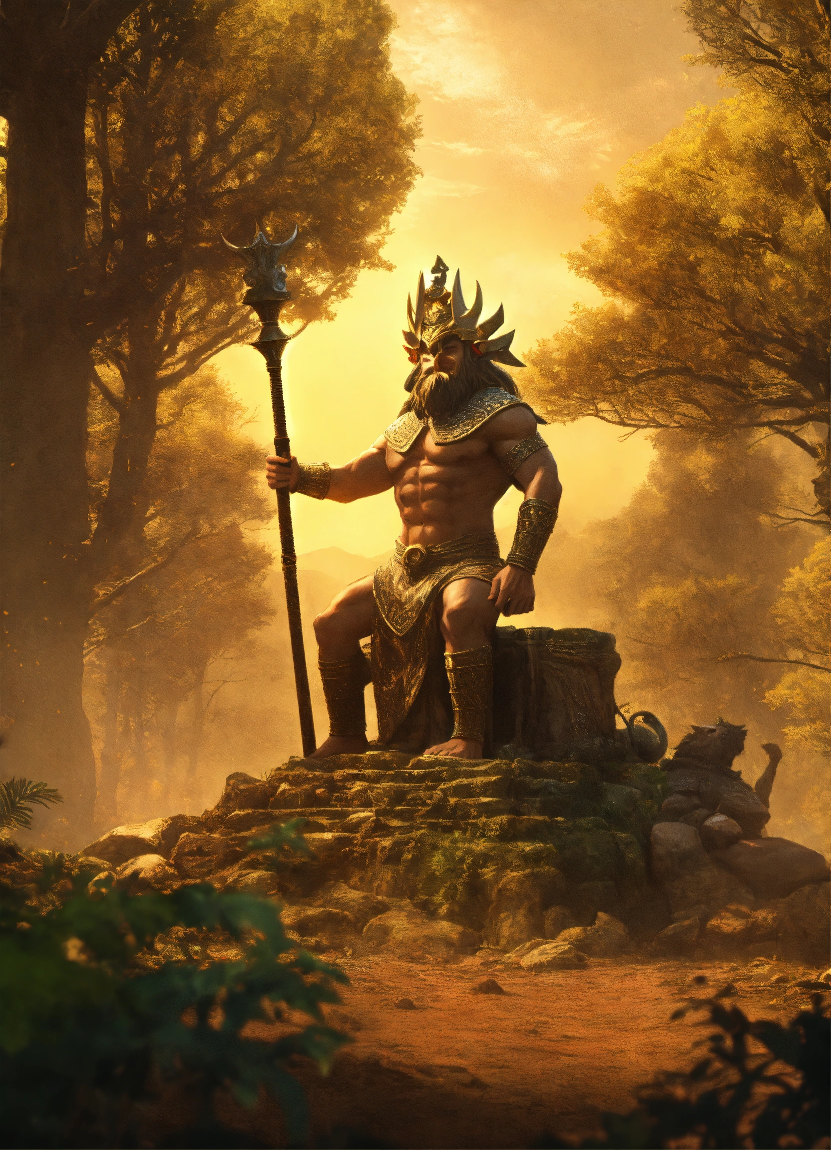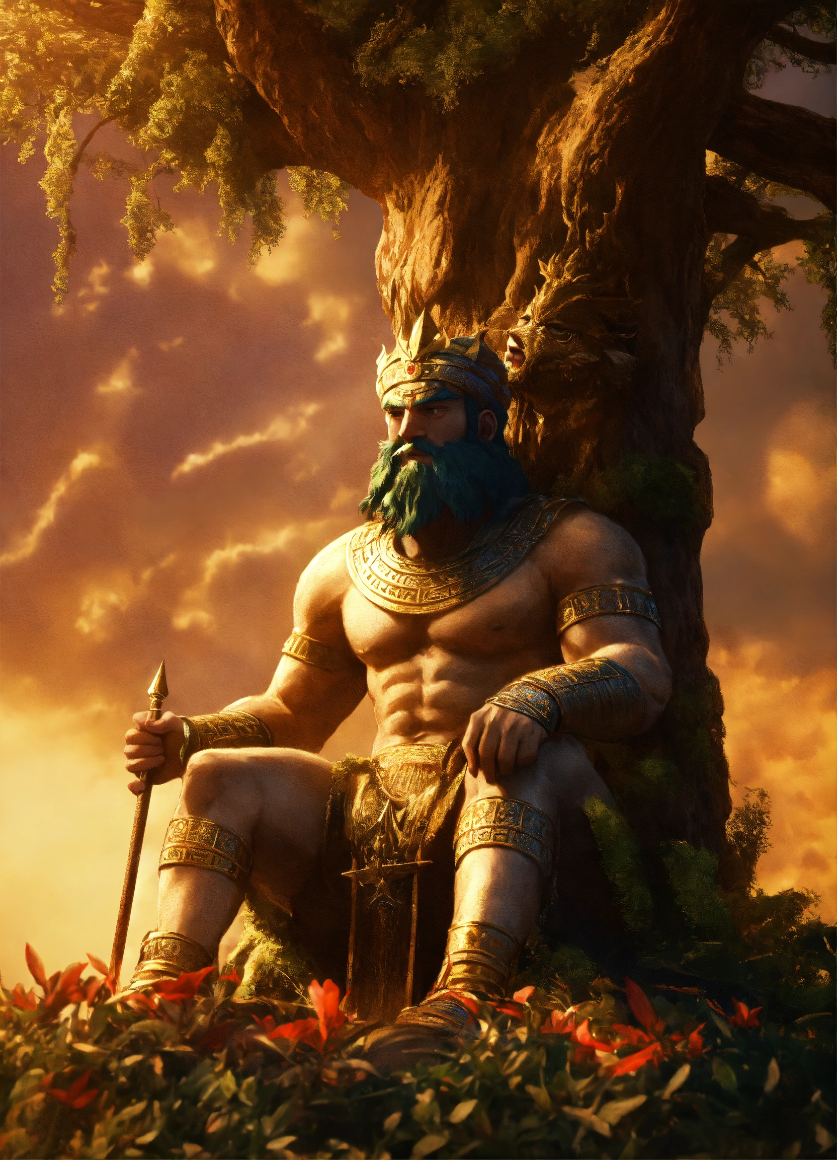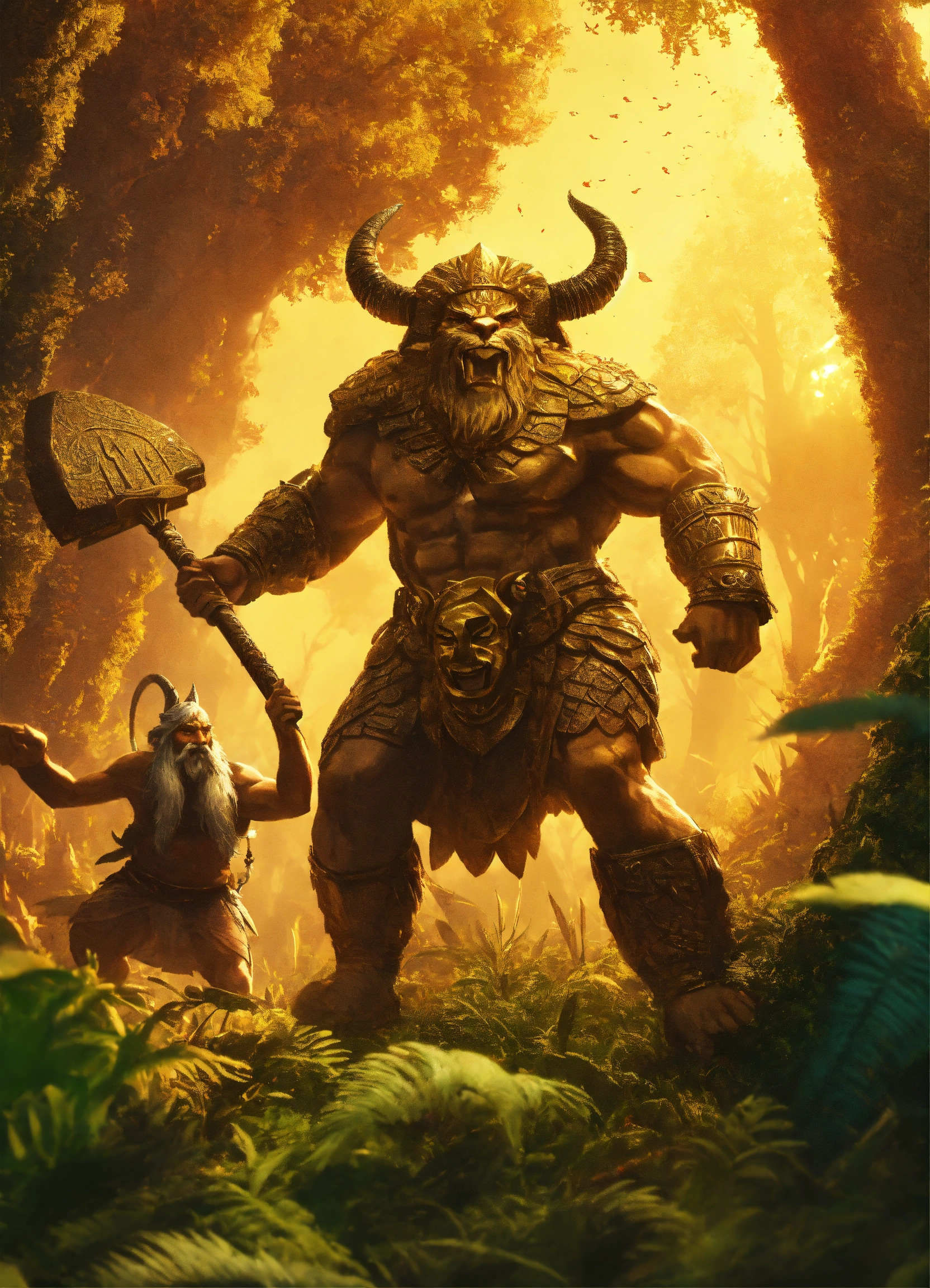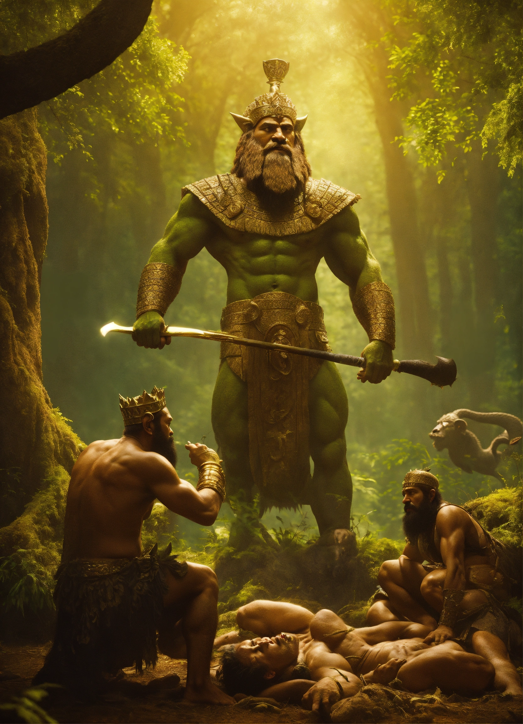 Sumerian king gilgamesh kills the monster humbaba, who lives in the cedar forest with his friend enkidu, cinematic, 8k