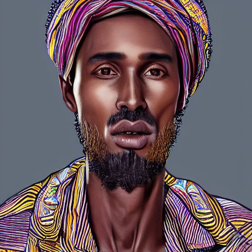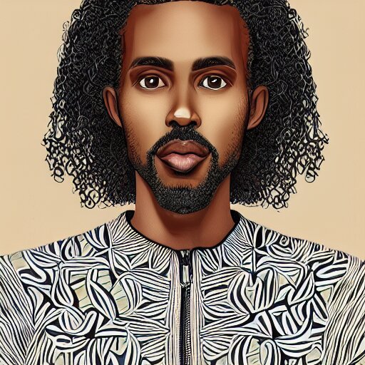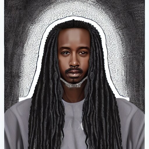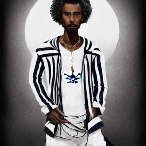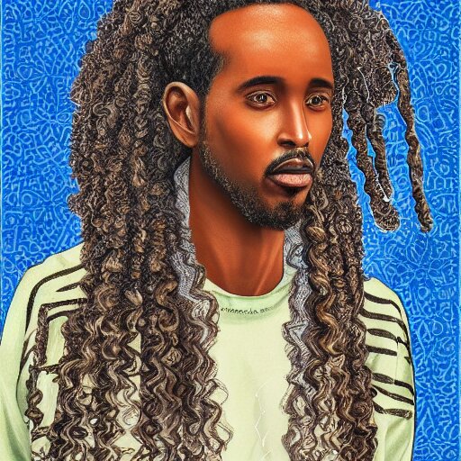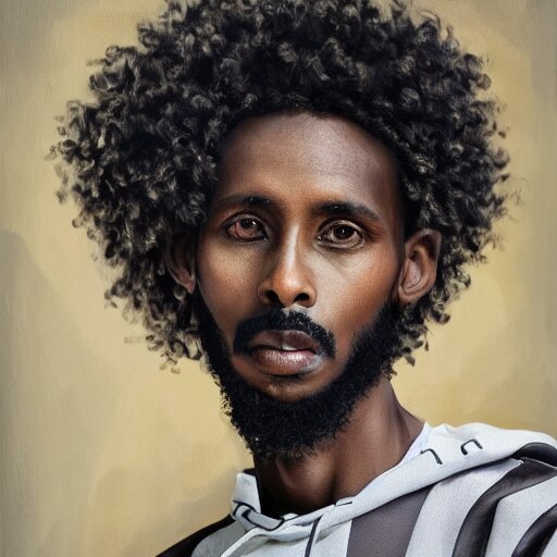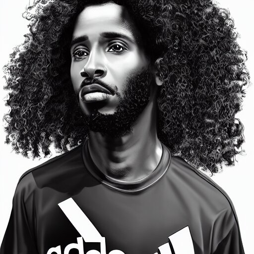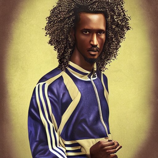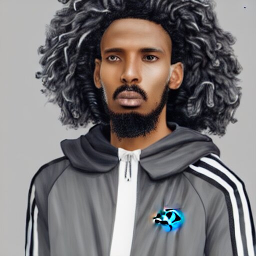 A somali man with long curly hair, dressed in adidas clothing, intricate, elegant, highly detailed, centered, digital painting, smooth, cinematic