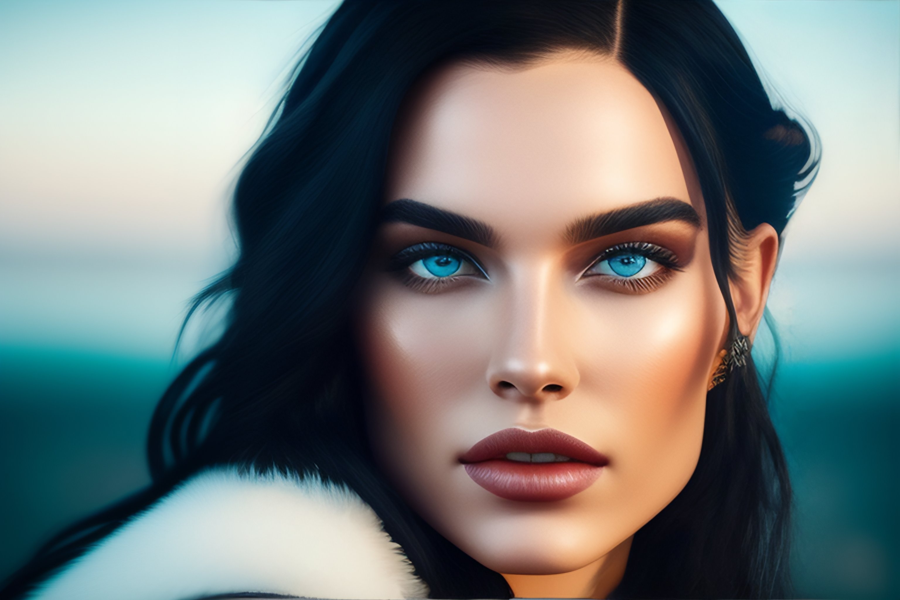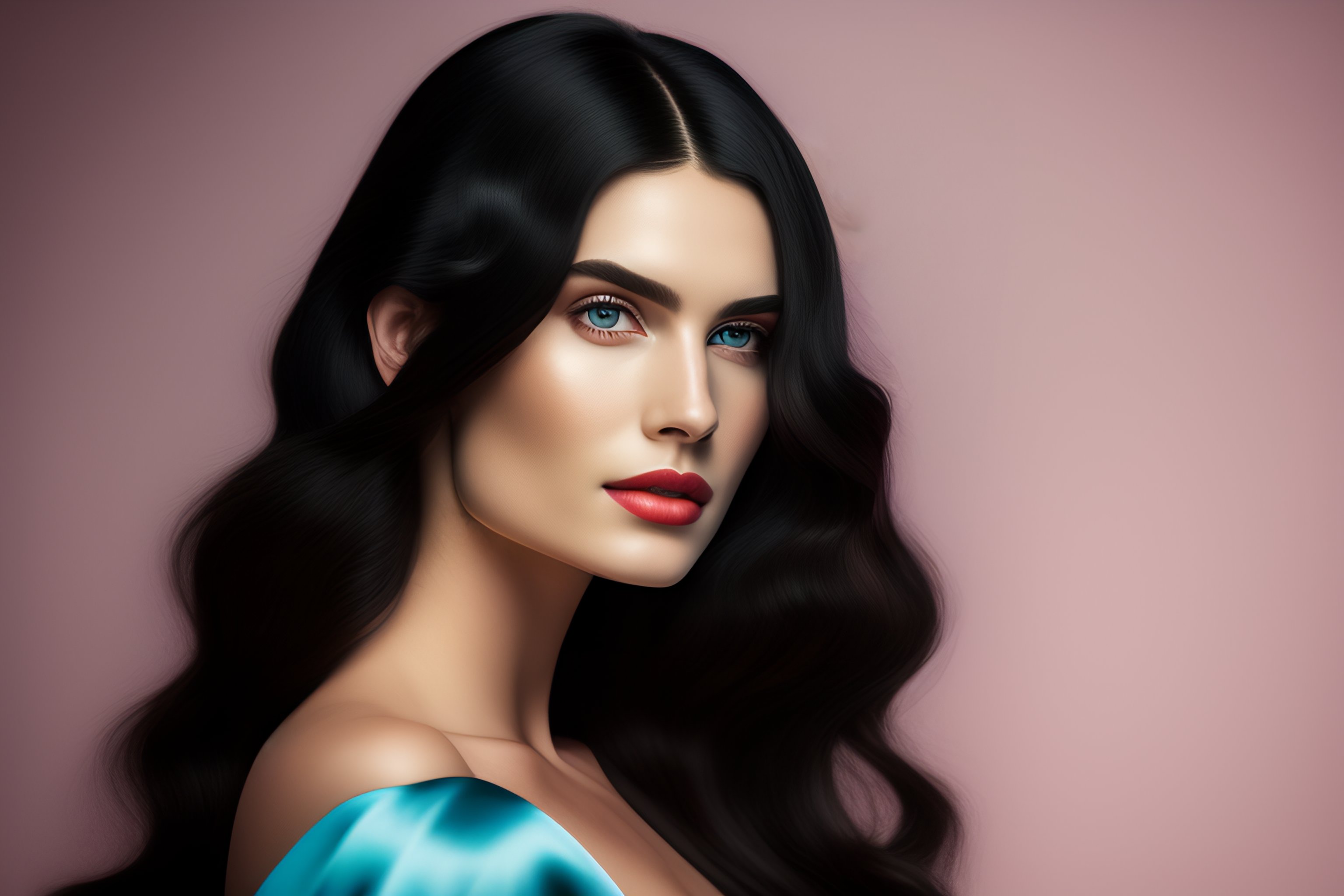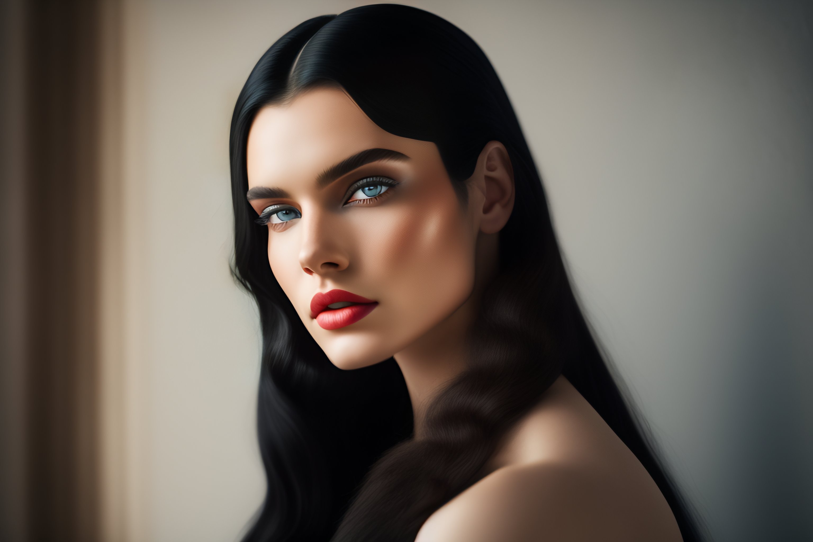 A portrait of a hot white girl, long straight raven black hair, stunning ice blue eyes, fine - art photography, soft portrait shot 8 k, mid length, ultrarealistic uhd faces, unsplash, kodak ultra max 800, 85 mm, intricate, casual pose, centered symmetrical composition, stunning photos, masterpiece, centered composition, ((thin red lip)), fine eyebrows, pale skin