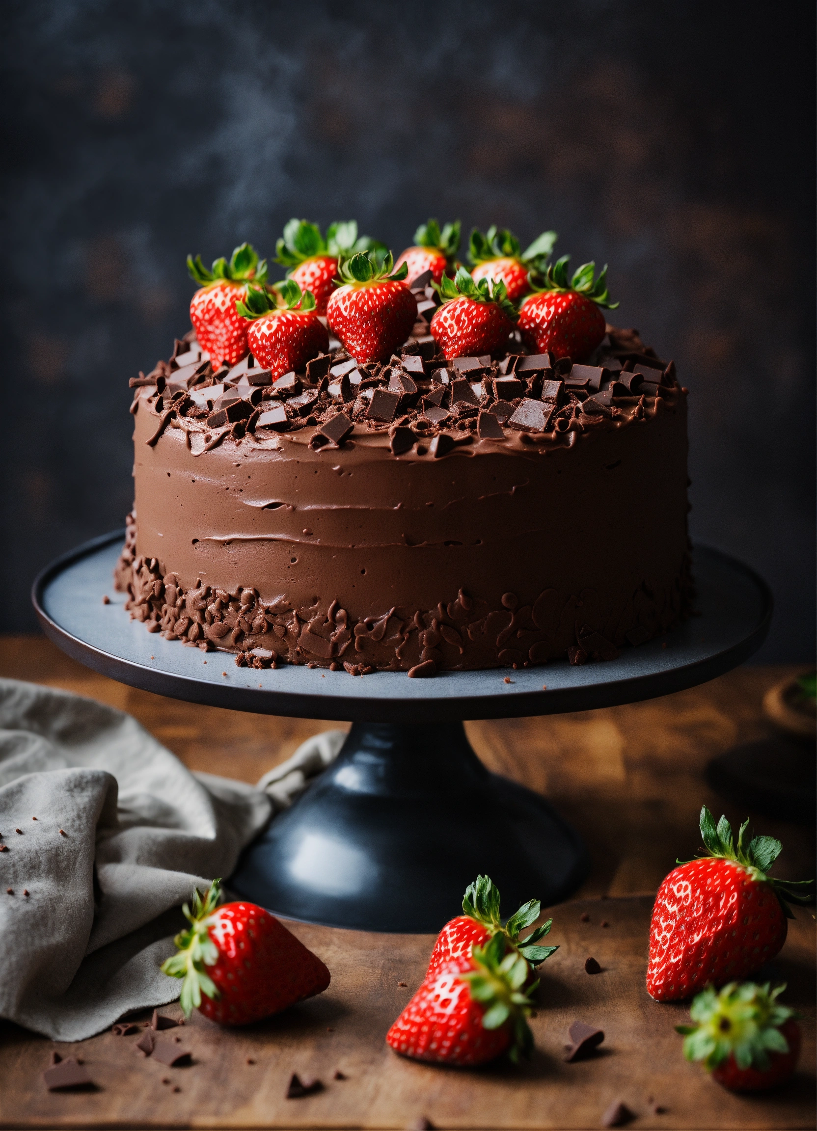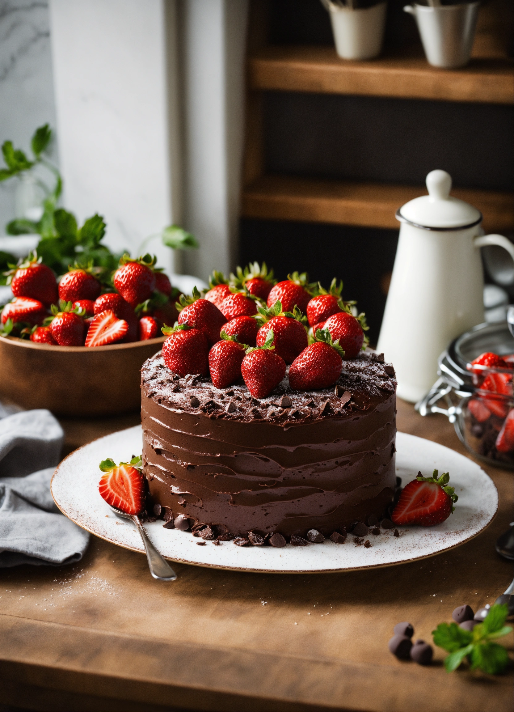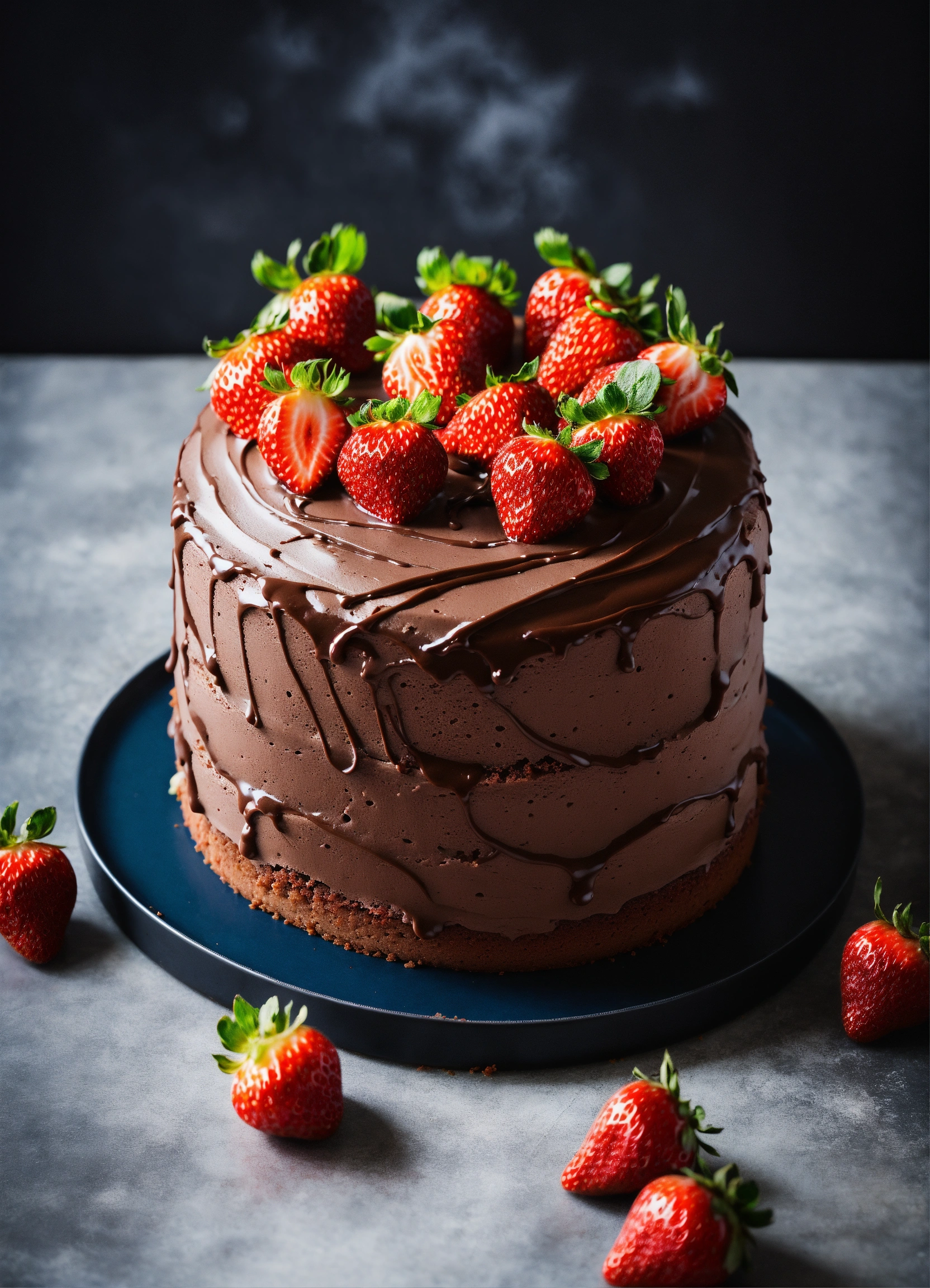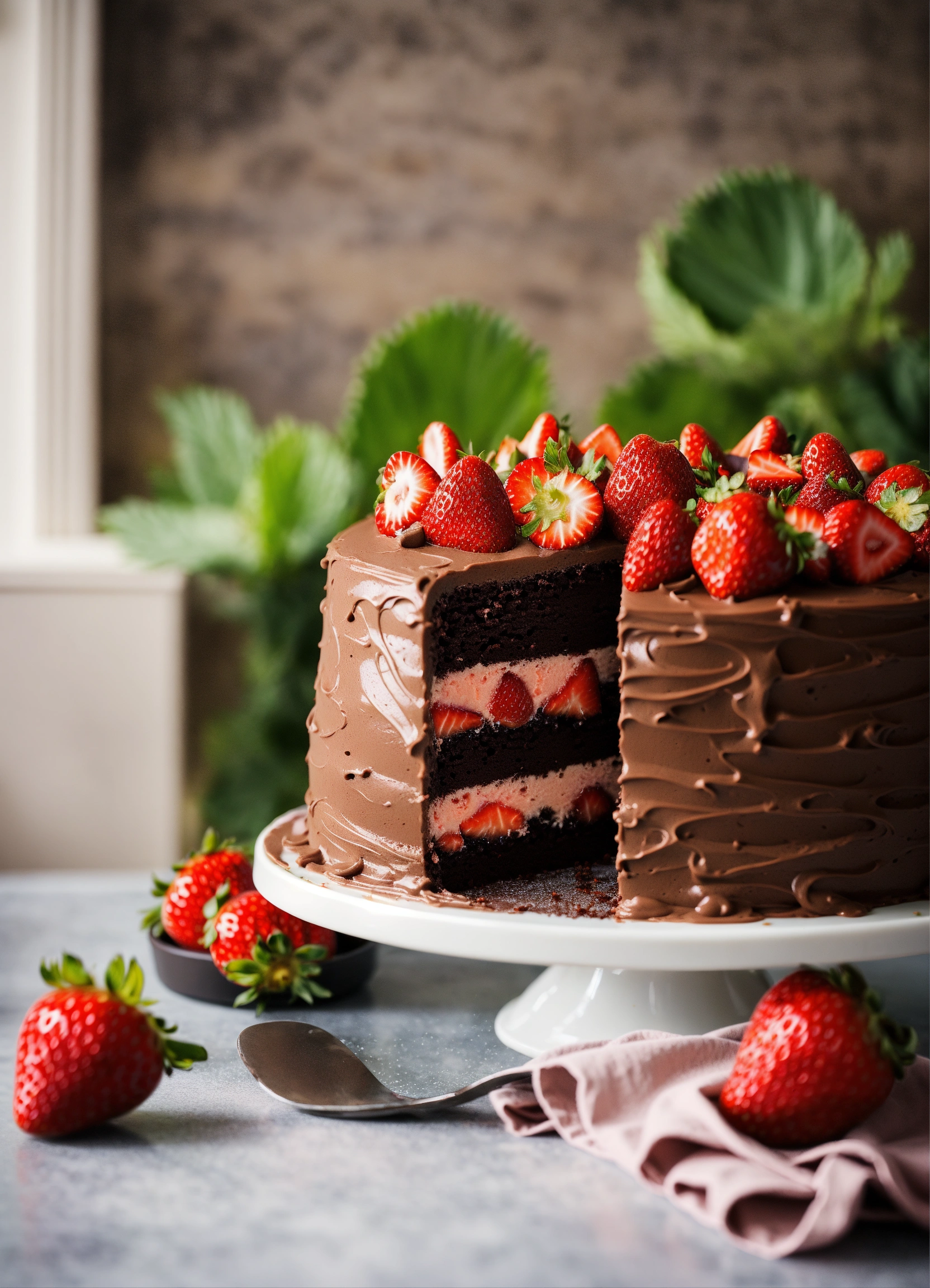 Stylish chocolate strawberry cake in a kitchen