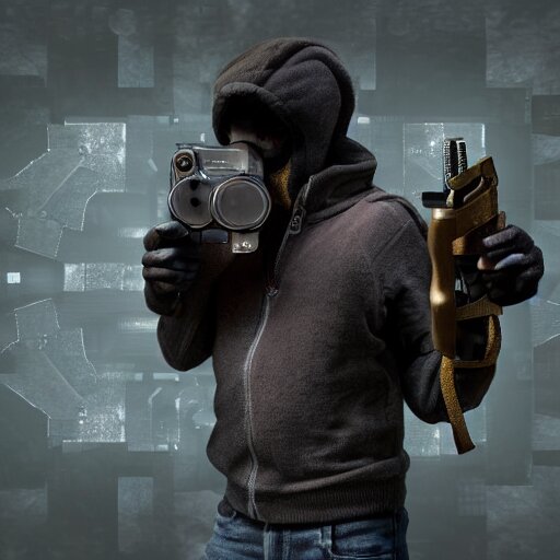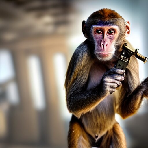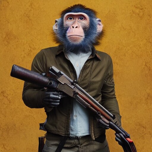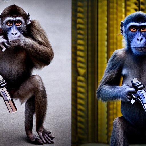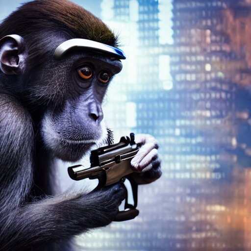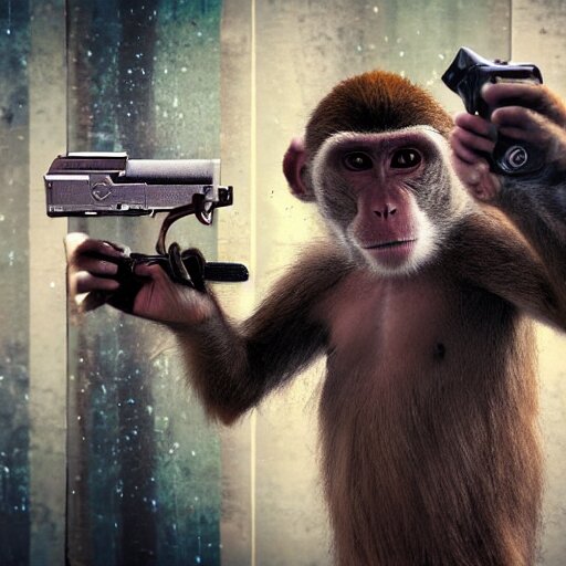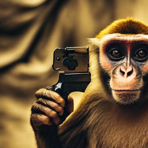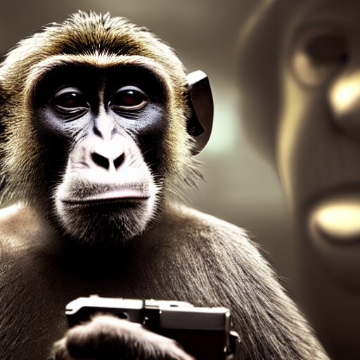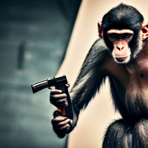 A monkey with a revolver in his hands, human man with camera stands behind the monkey, real life photo, 4 k, cyberpunk, highly detailed, sharp focus - h 8 0 0