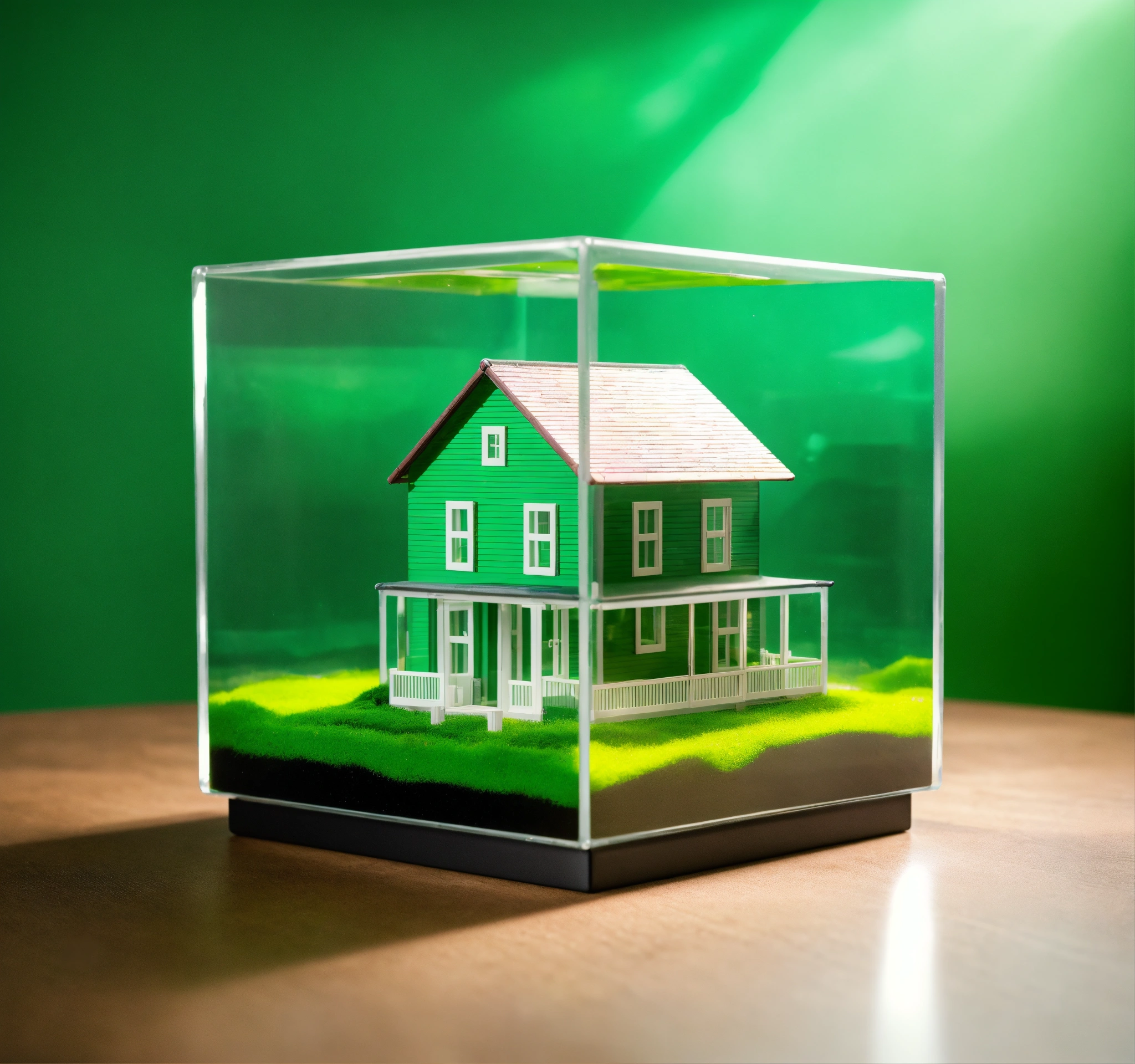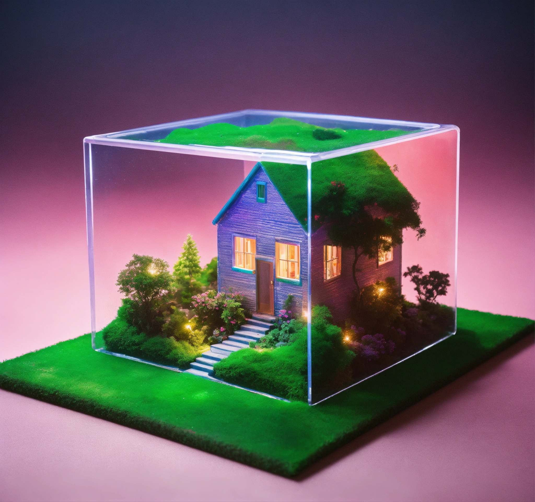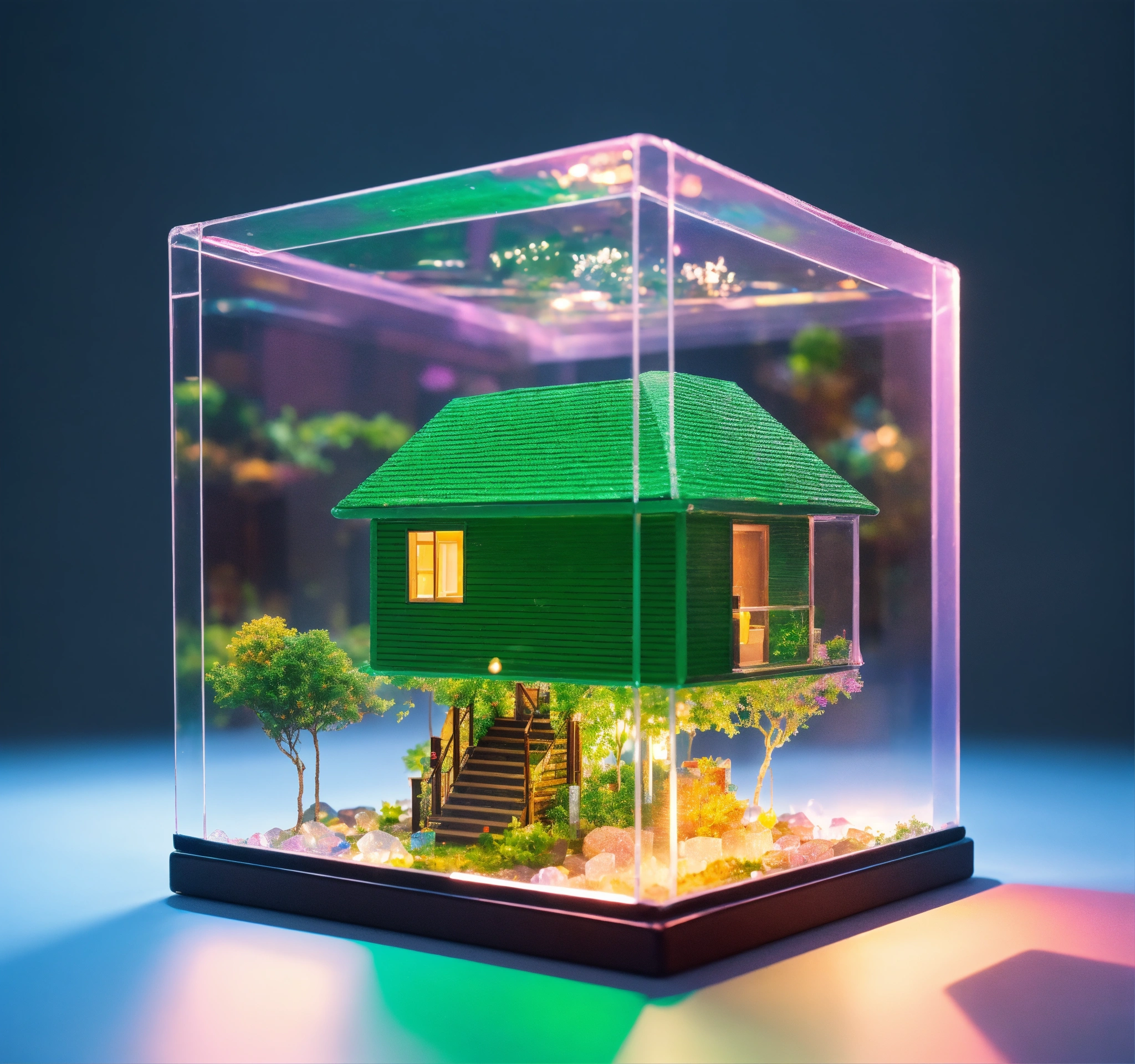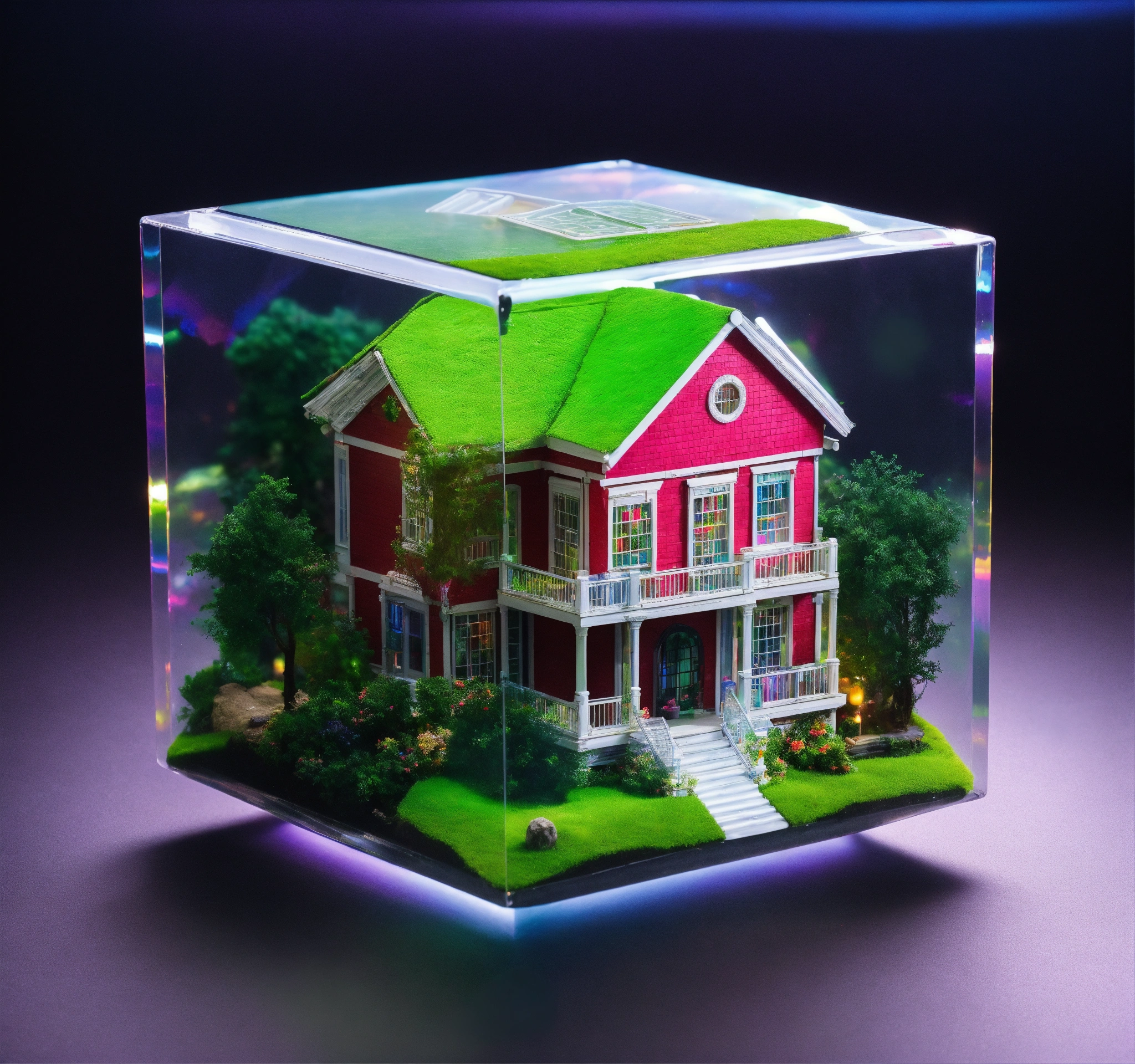 Cube, 4k, small house inside cube!, clear plastic, iridescent, studio photography, solid color background! table top photography! realistic! green!