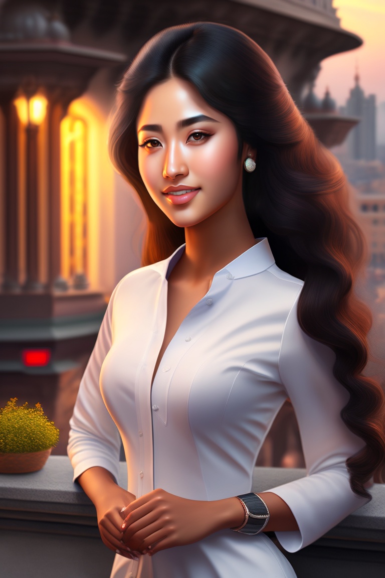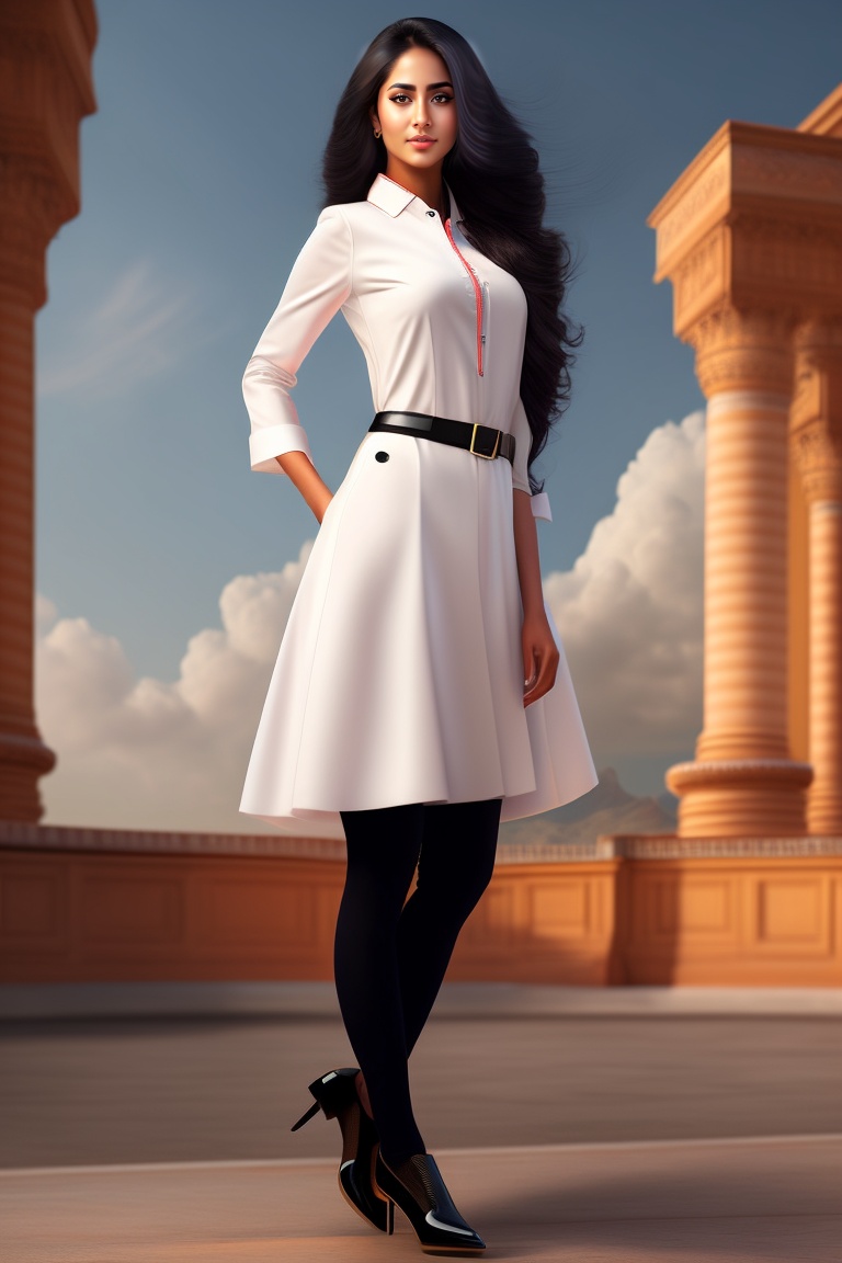 Beutiful indian girl with 36, 28, 36 figure, with white kurta and black leggings with long hair standing on a rooftop