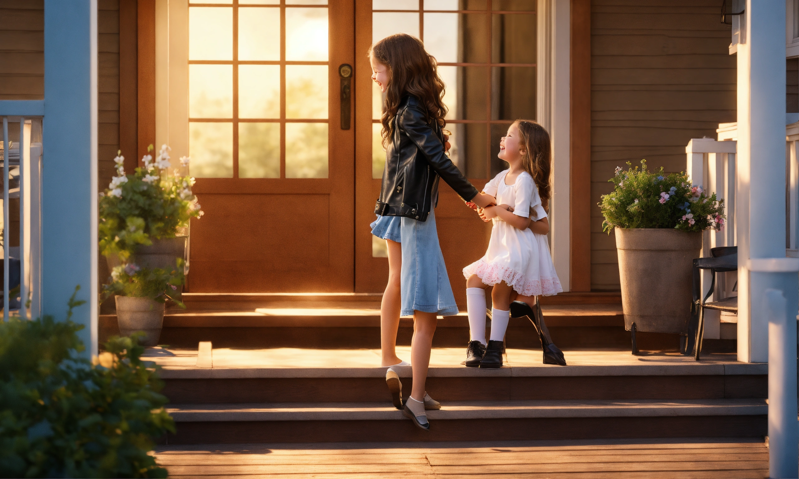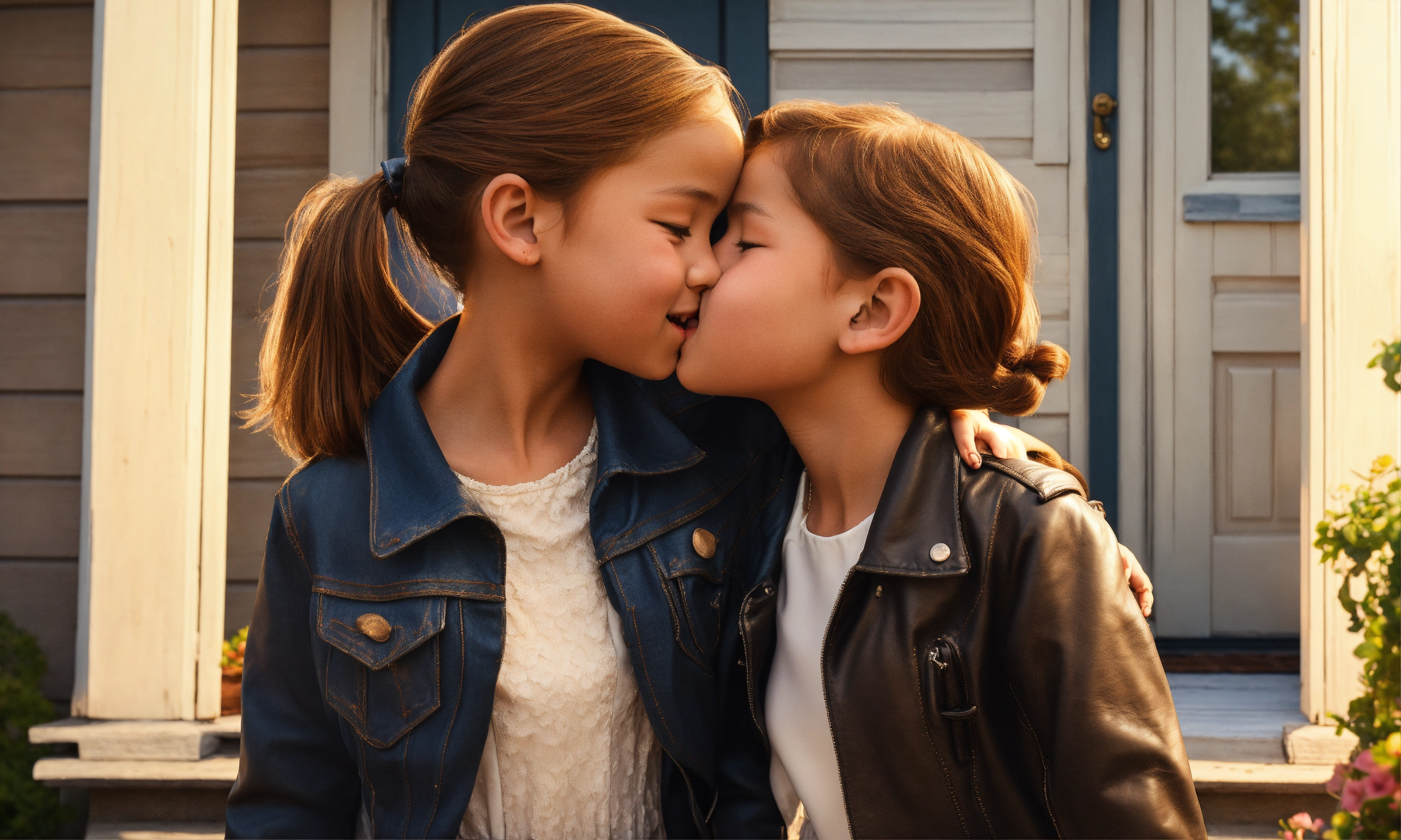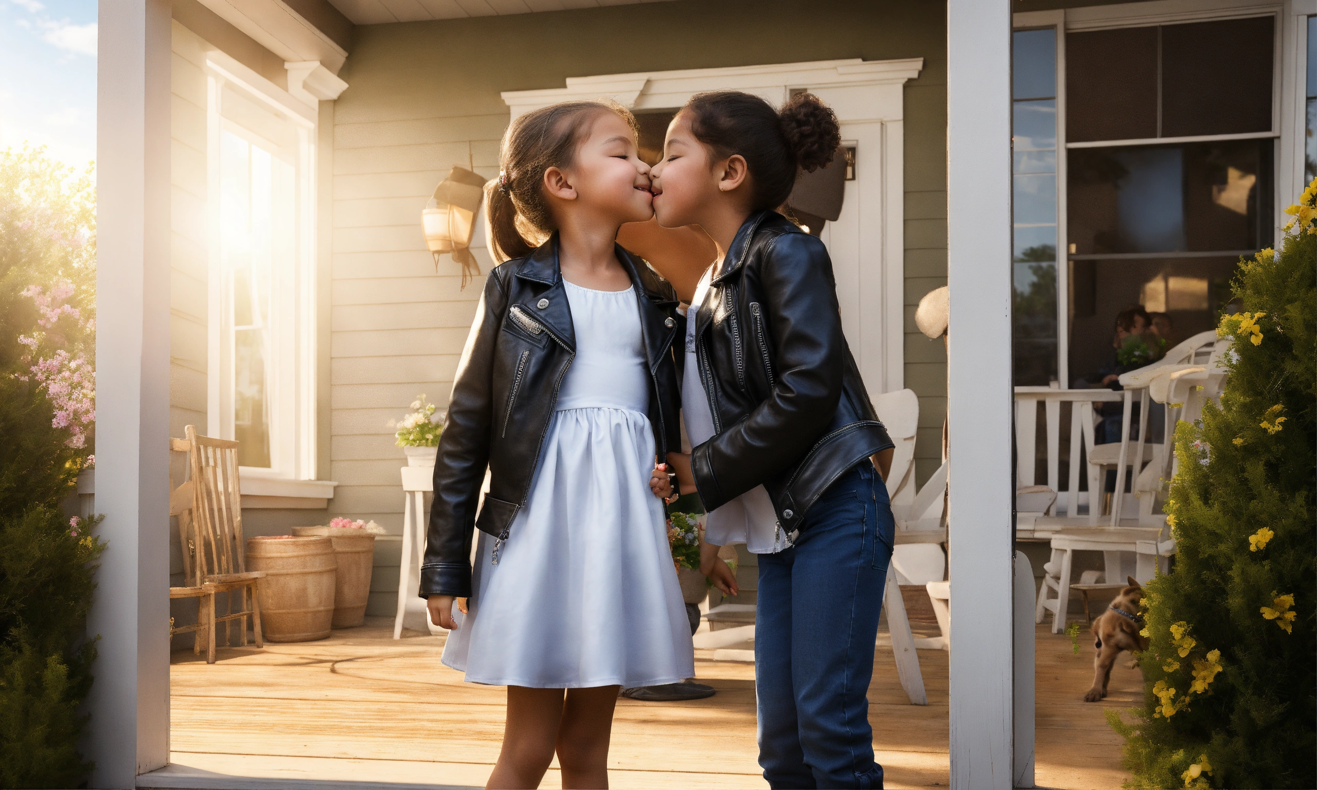 A 10-year-old girl wearing jeans and a black leather jacket holds and kisses her 10-year-old female best friend, who is wearing a simple white dress. they stand on the front porch of a house. loving and joyful. realistic, full body render.
