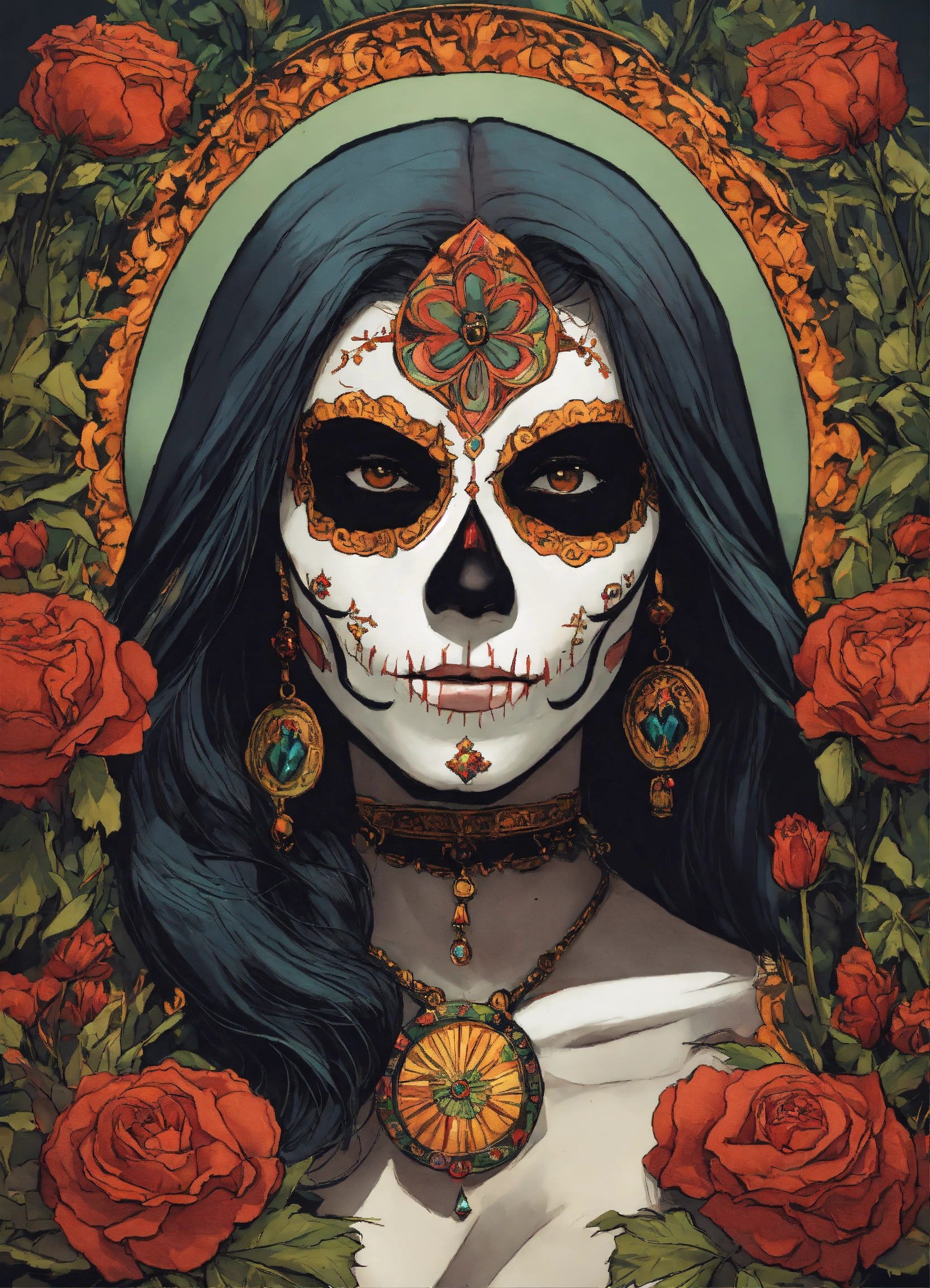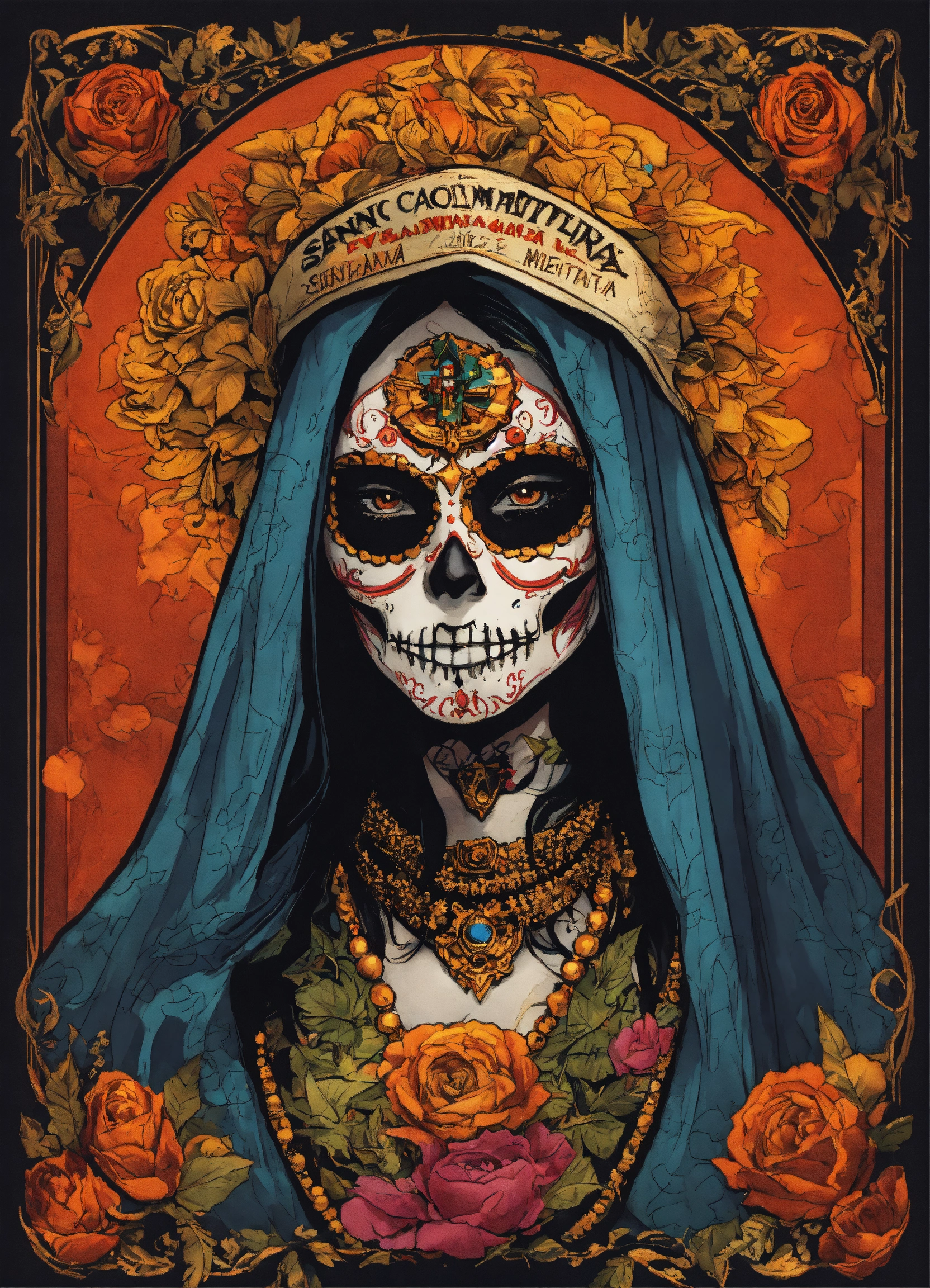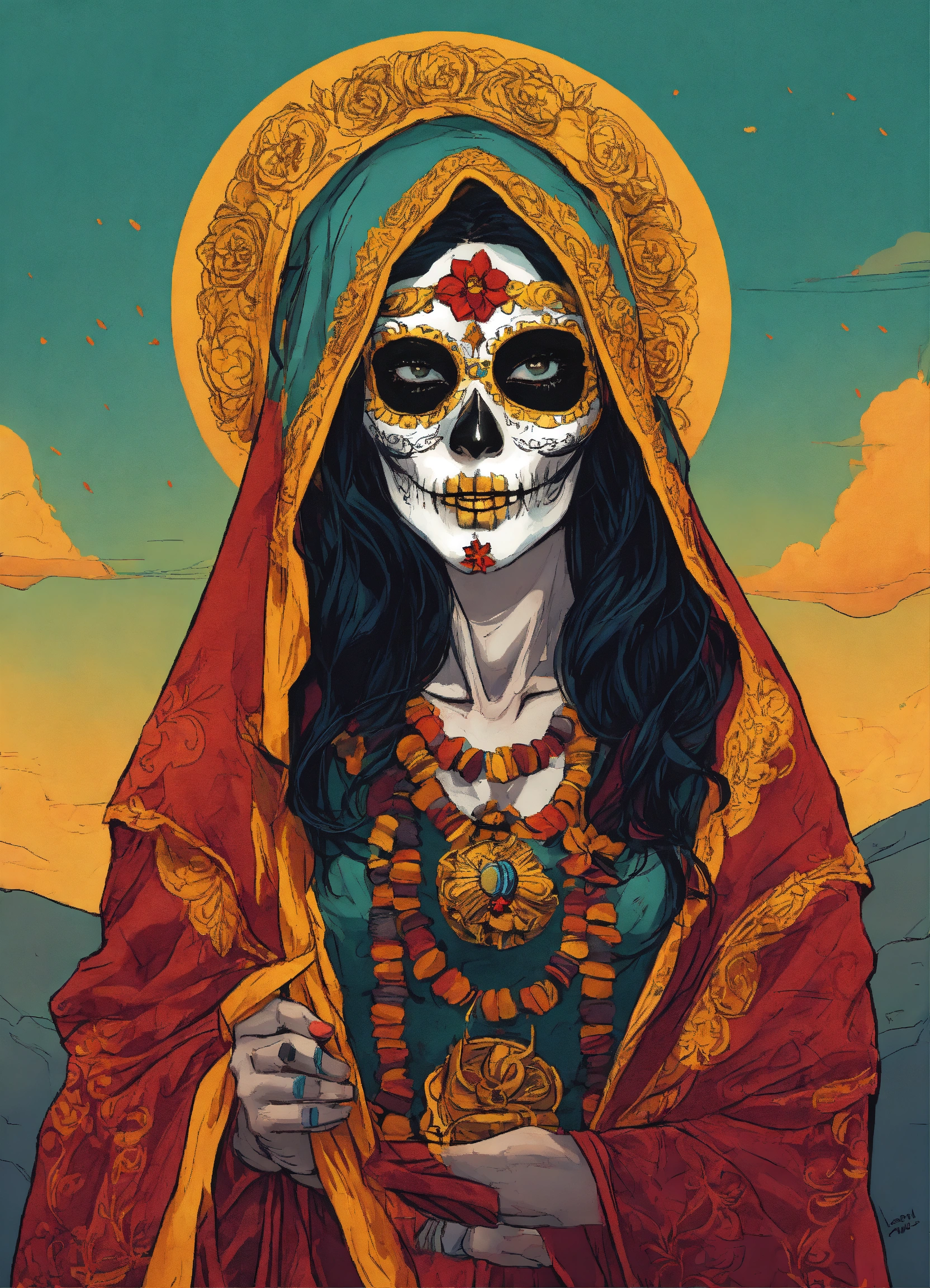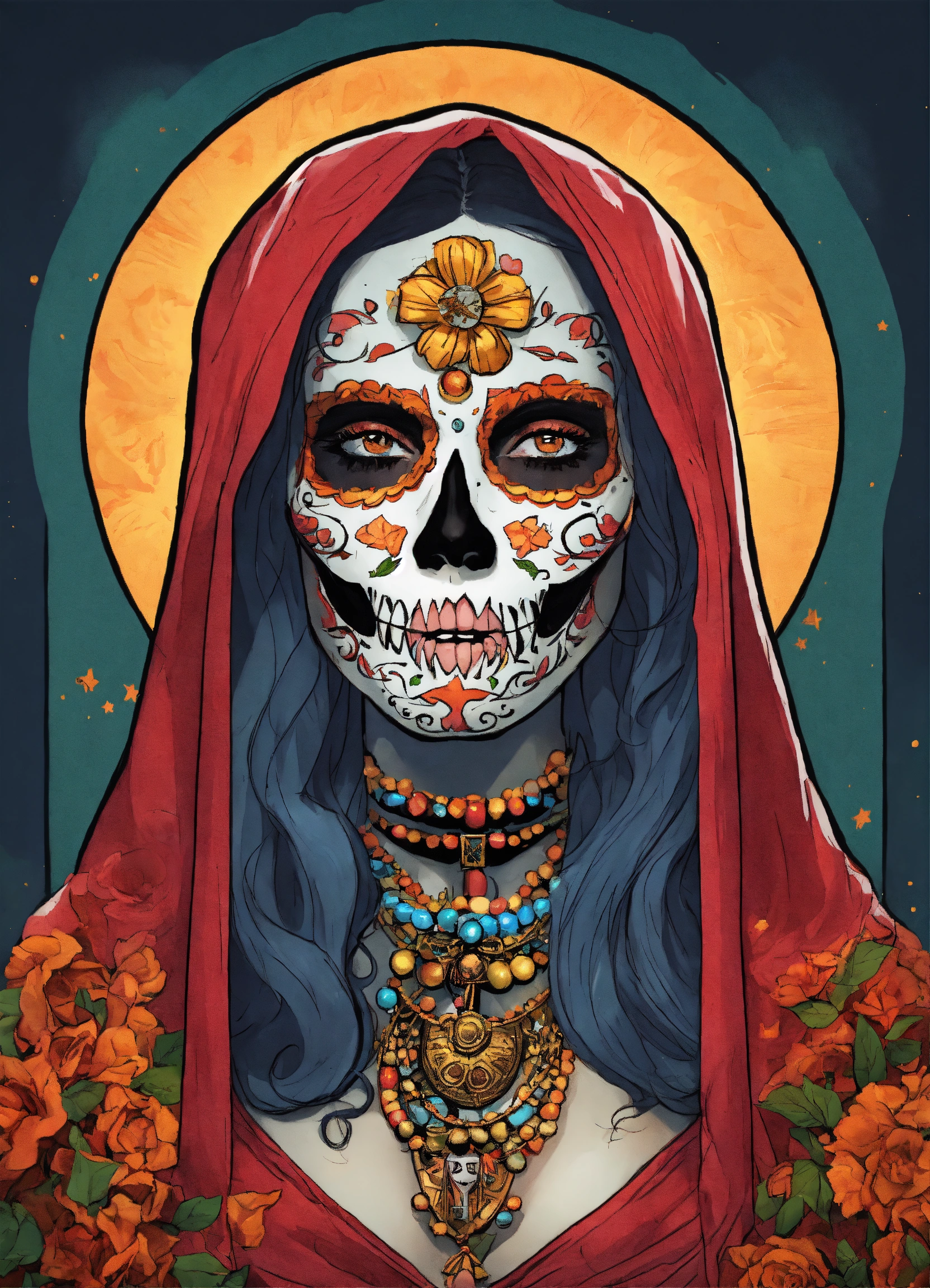 A comic drawing santa muerte face of a latina