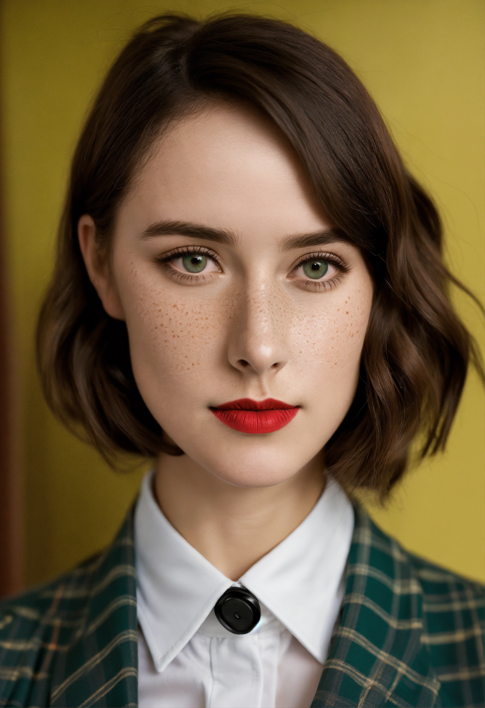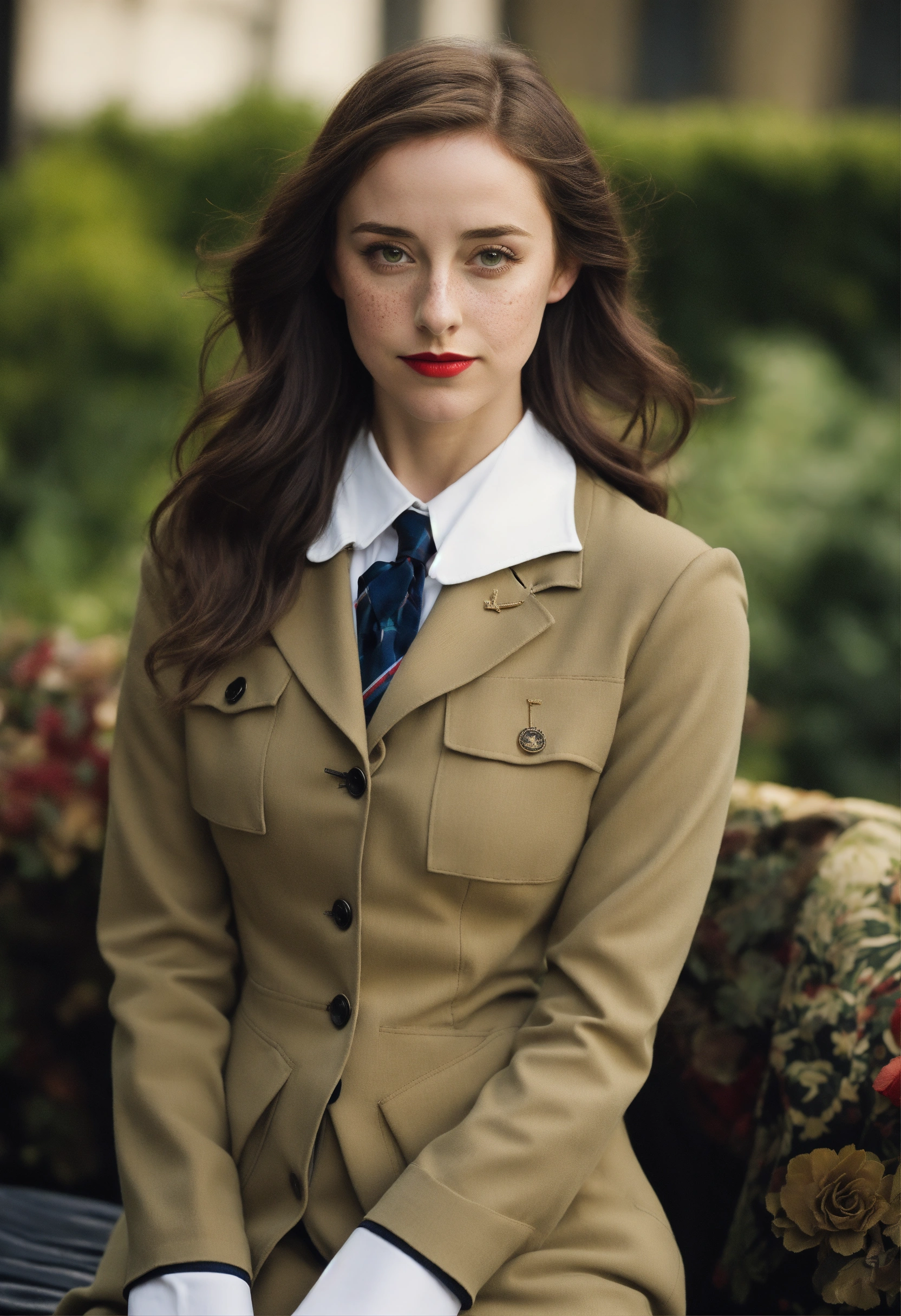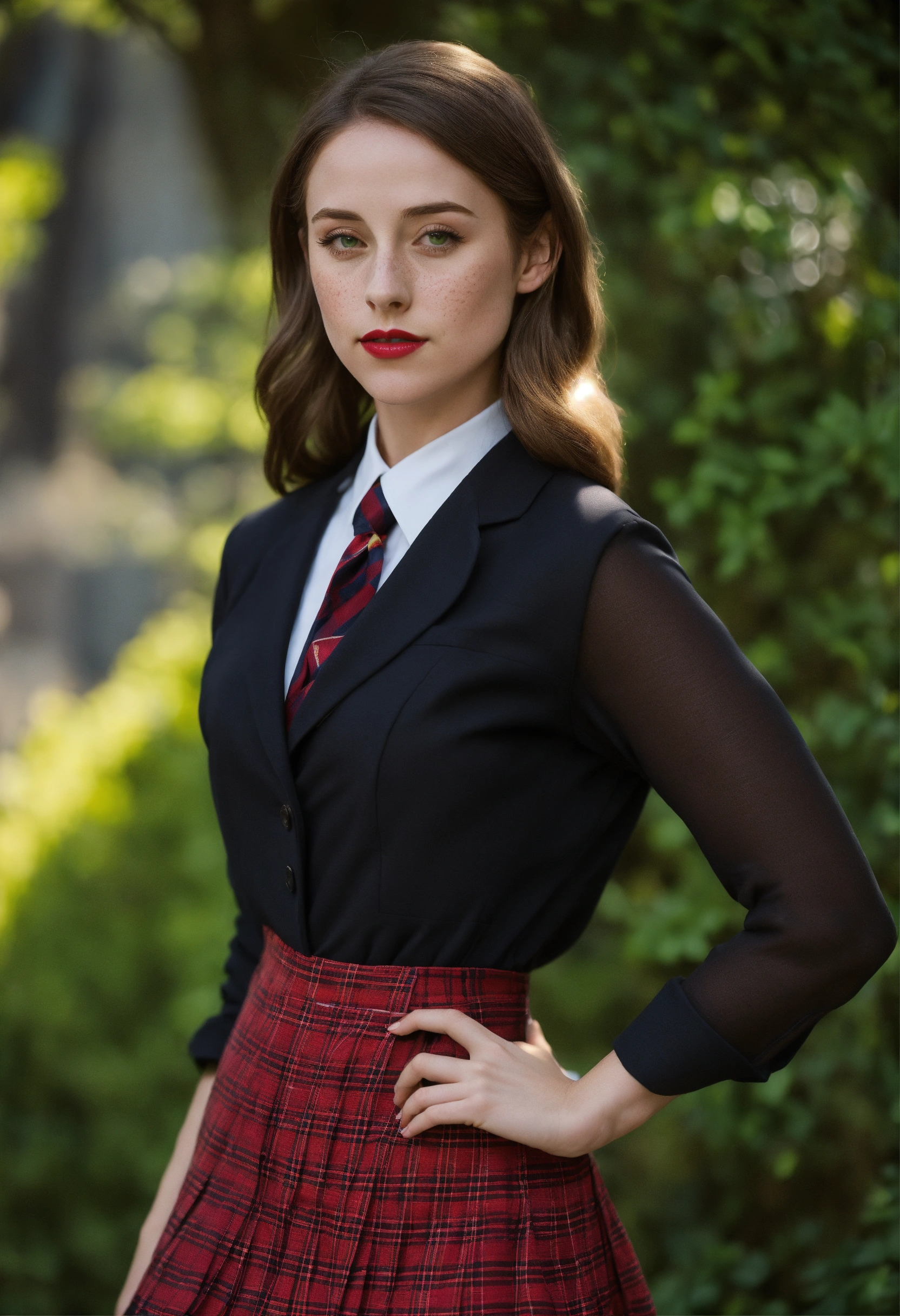 A young version of alison brie with saoirse ronan photographic portrait of a youthful woman with neck lengthened, she is 25 years old, greater bust, tight shirt, wide bust, she has green eyes, freckles on her face and red lipstick, form-fitting, curve-hugging, snug, tailored, close-cut, sculpted, defined, pronounced curves, shapely, casual, relaxed, laid-back, undone, informal, nonchalant, easygoing, disheveled, carefree, unbuttoned, unstructured, effortless, she wears a black suit jacket with a white shirt and black tie. her head is triangle shaped, preppy, elite, well-dressed, polished, sophisticated, form-fitting shirt, pleated, knee-length, a-line, high-waisted, pencil skirt, hosiery, knee-high socks, thigh-high stockings, nylon, opaque, sheer, tartan, uniformed, dress code, academic attire, preppy, classic, traditional, schoolgirl.