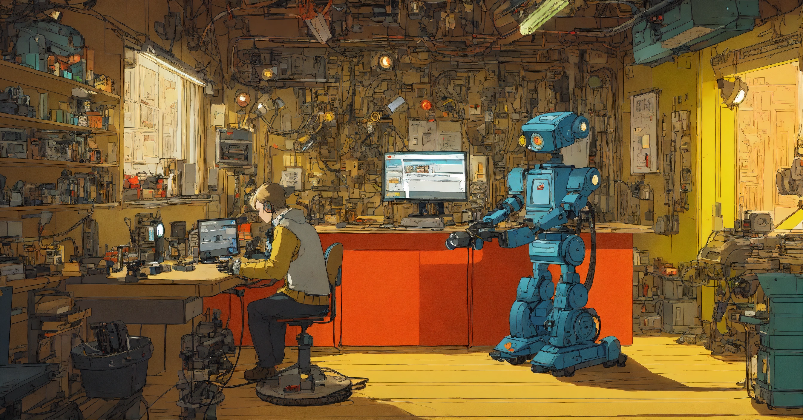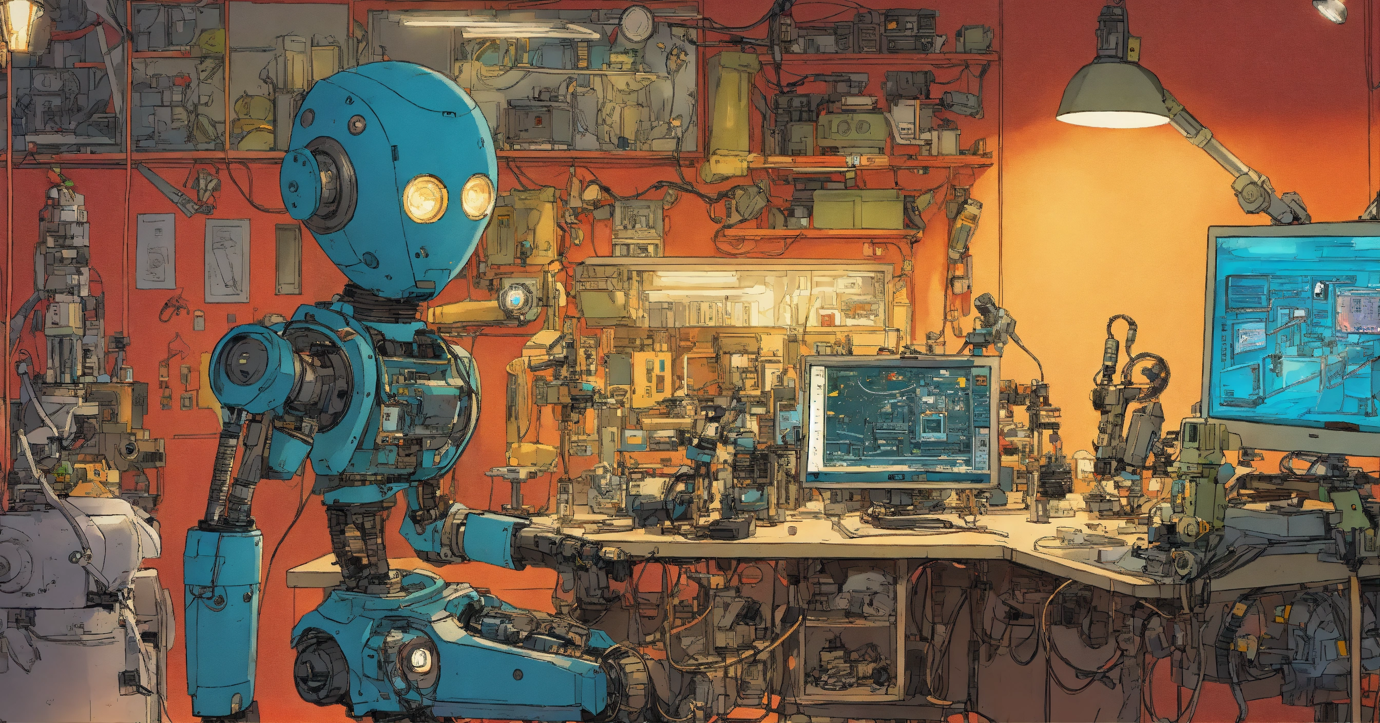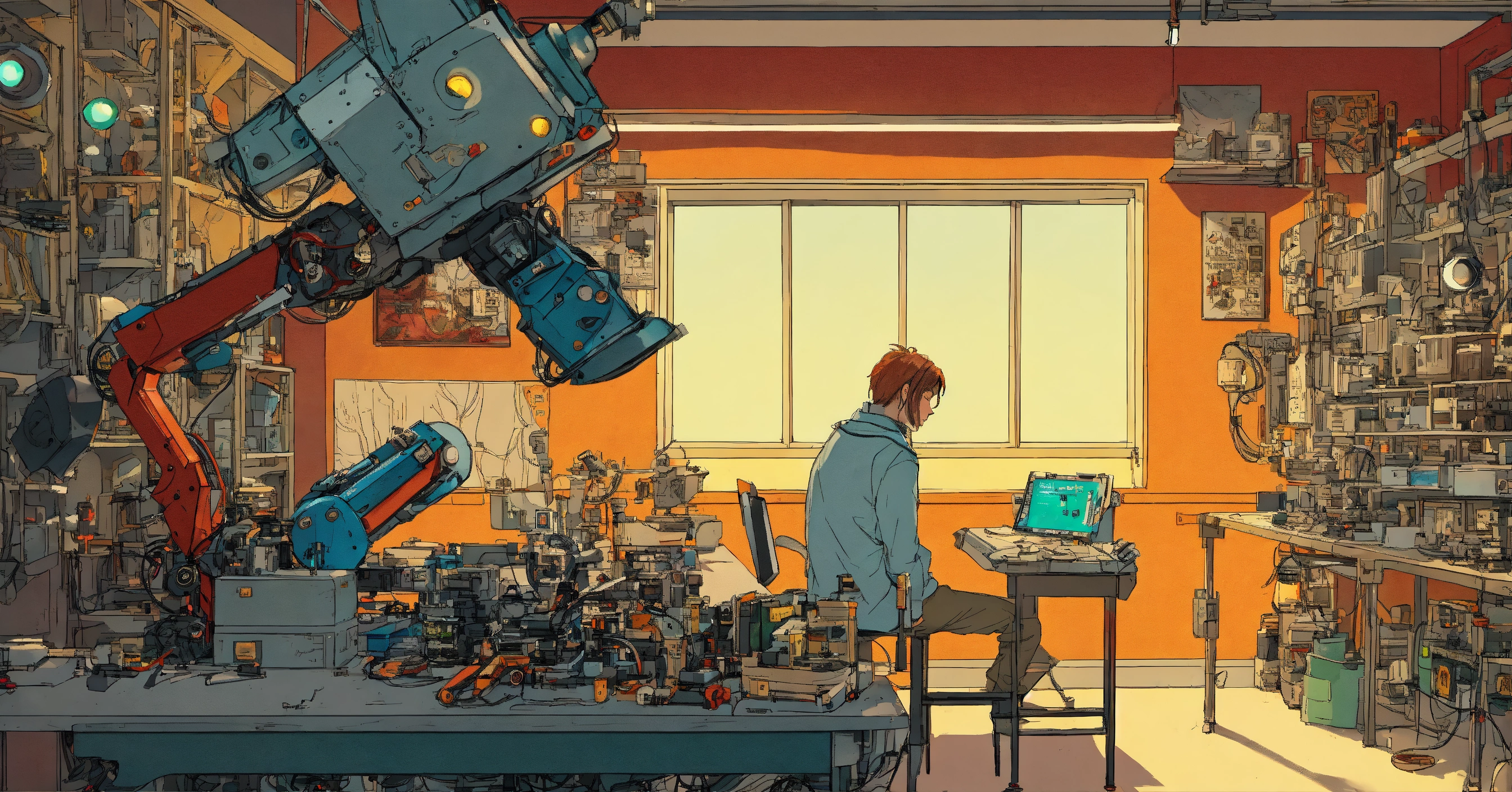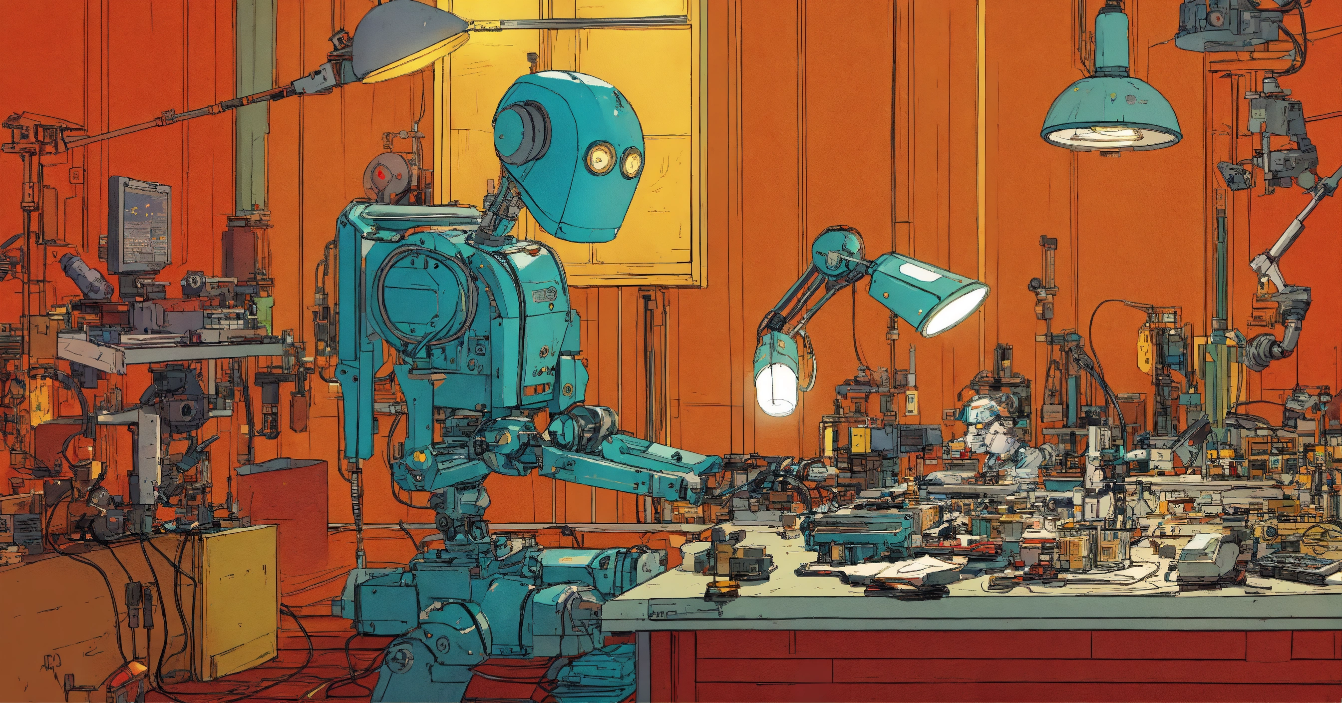Futurepunk the central figure, is building a robotic arm on the workbench desk. par can lights focus on the performer, while bold and striking primary colors add a sci-fi ambiance to the atmosphere. the camera zooms in on the central figure portrait. by mattias adolfsson.