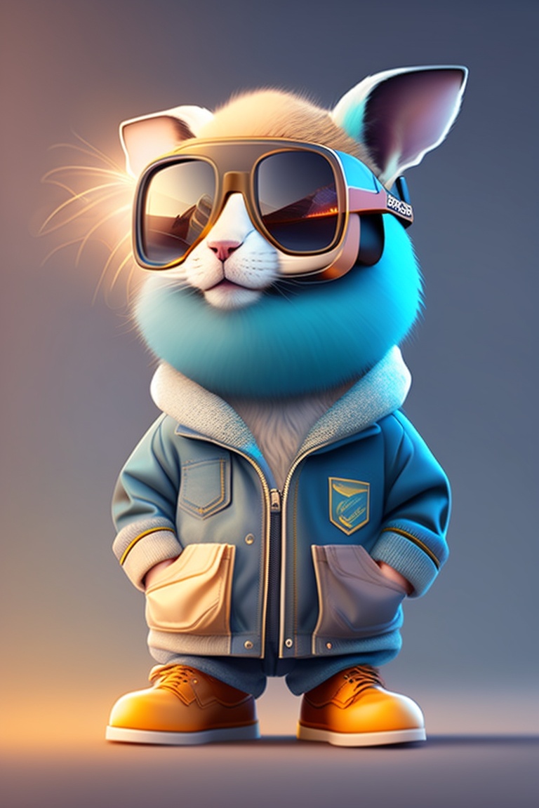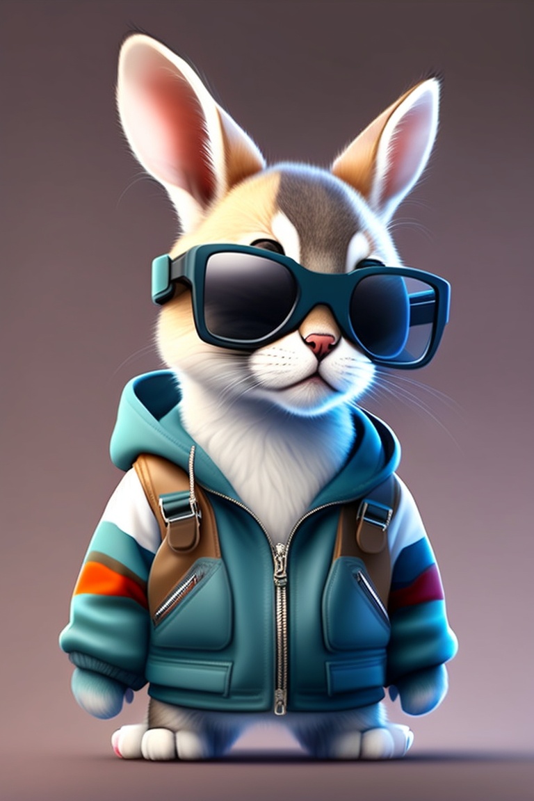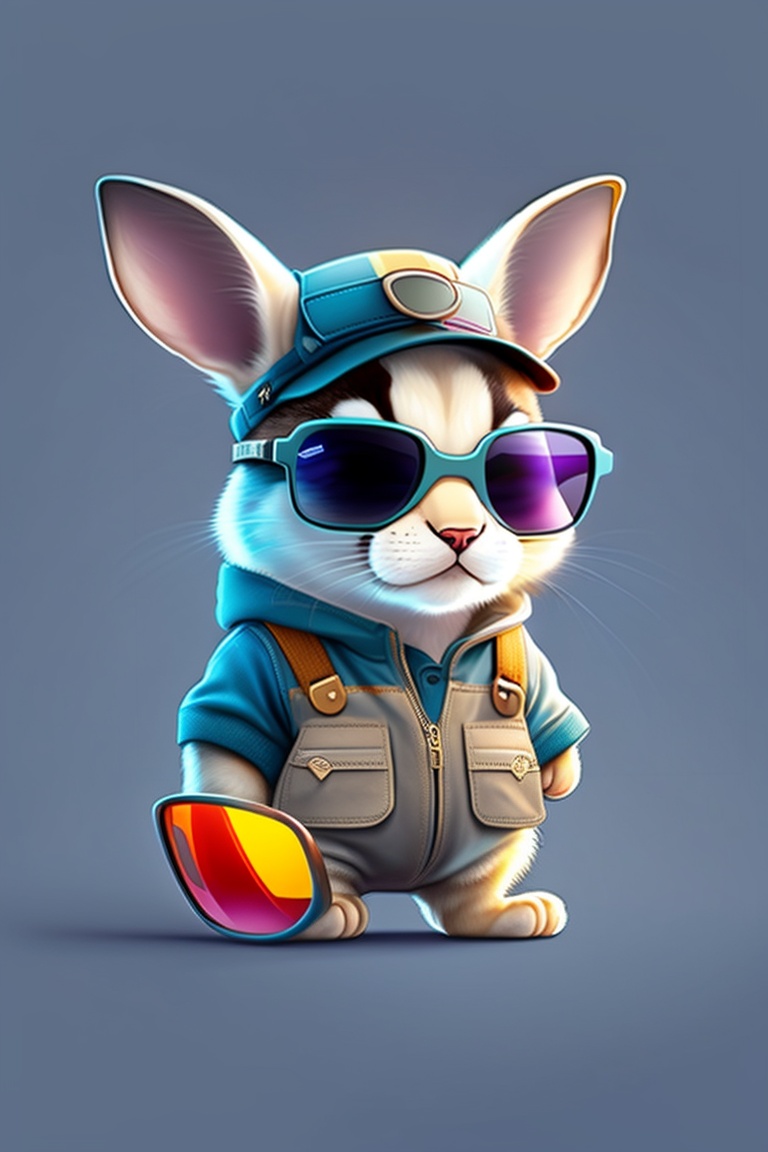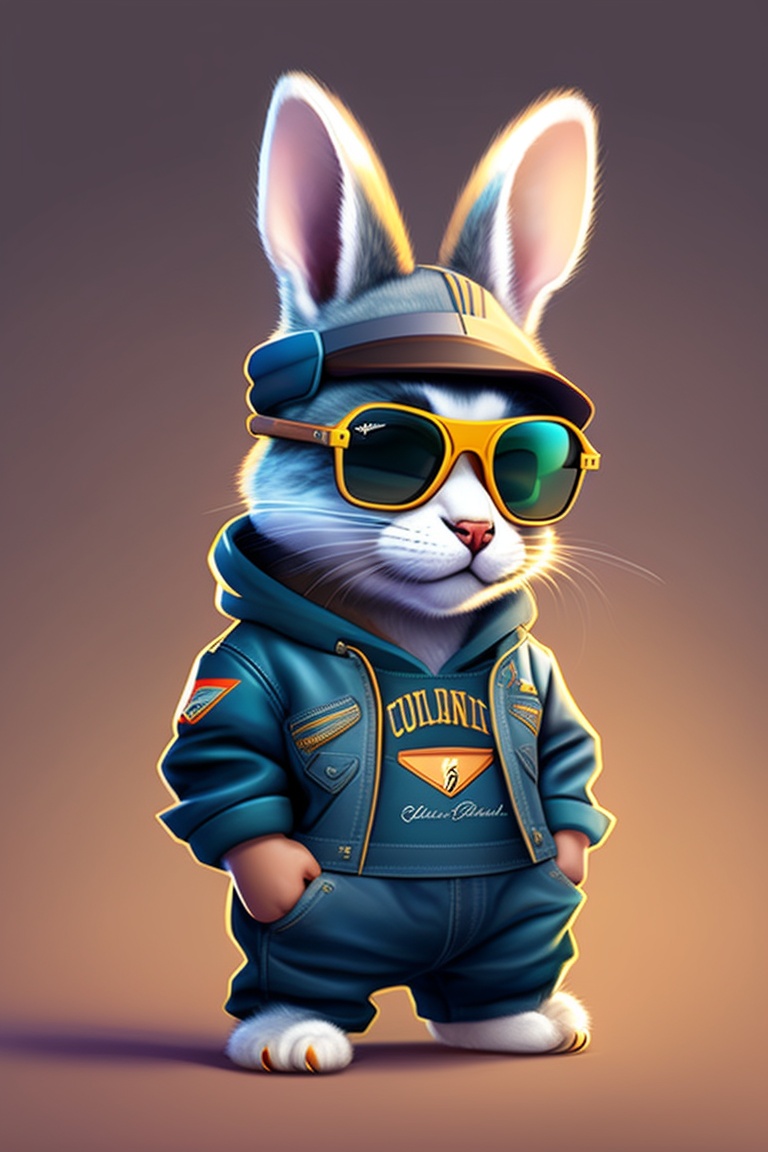 A cute gangsta bad bugs bunny in overalls with ray ban sunglasses, the ears are twisted and hanging down