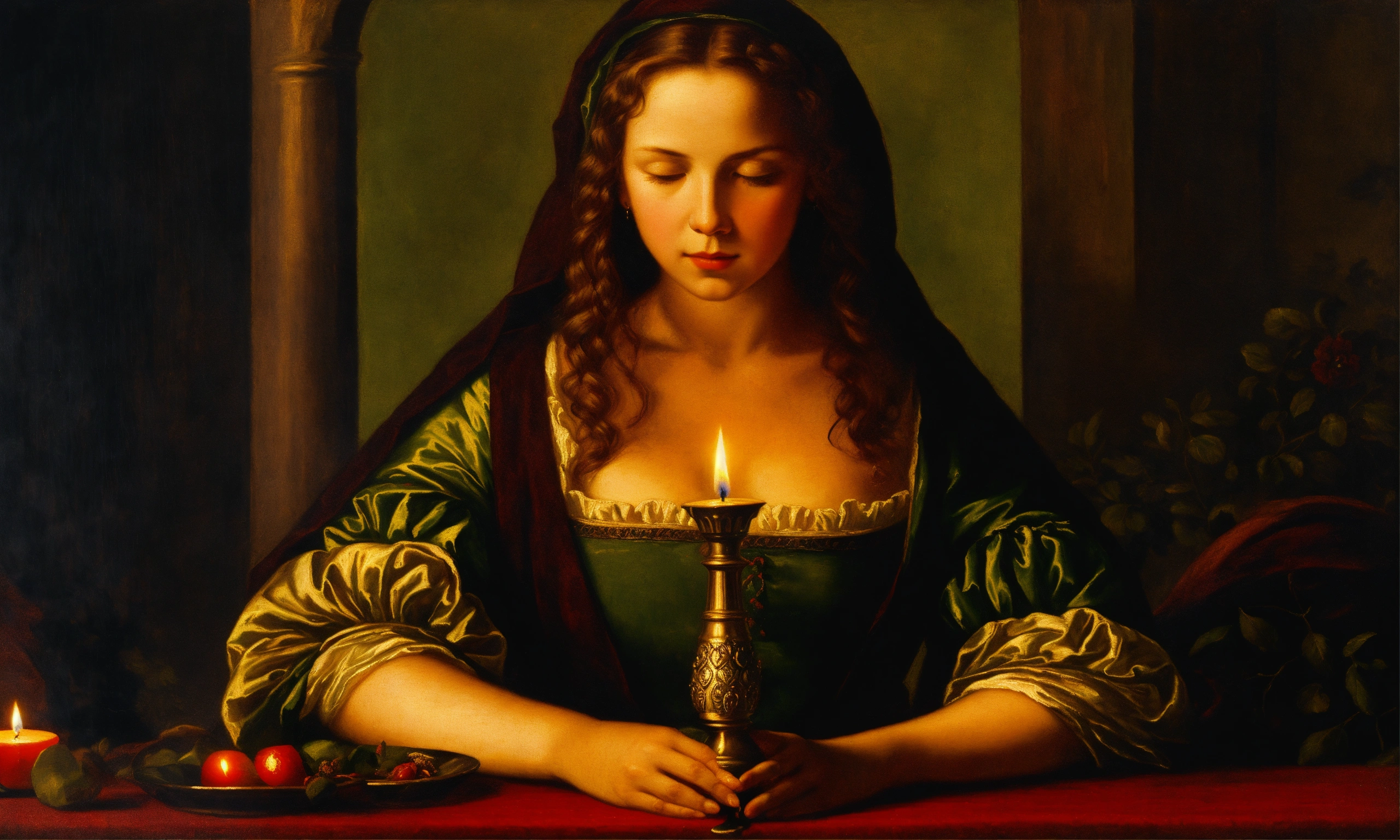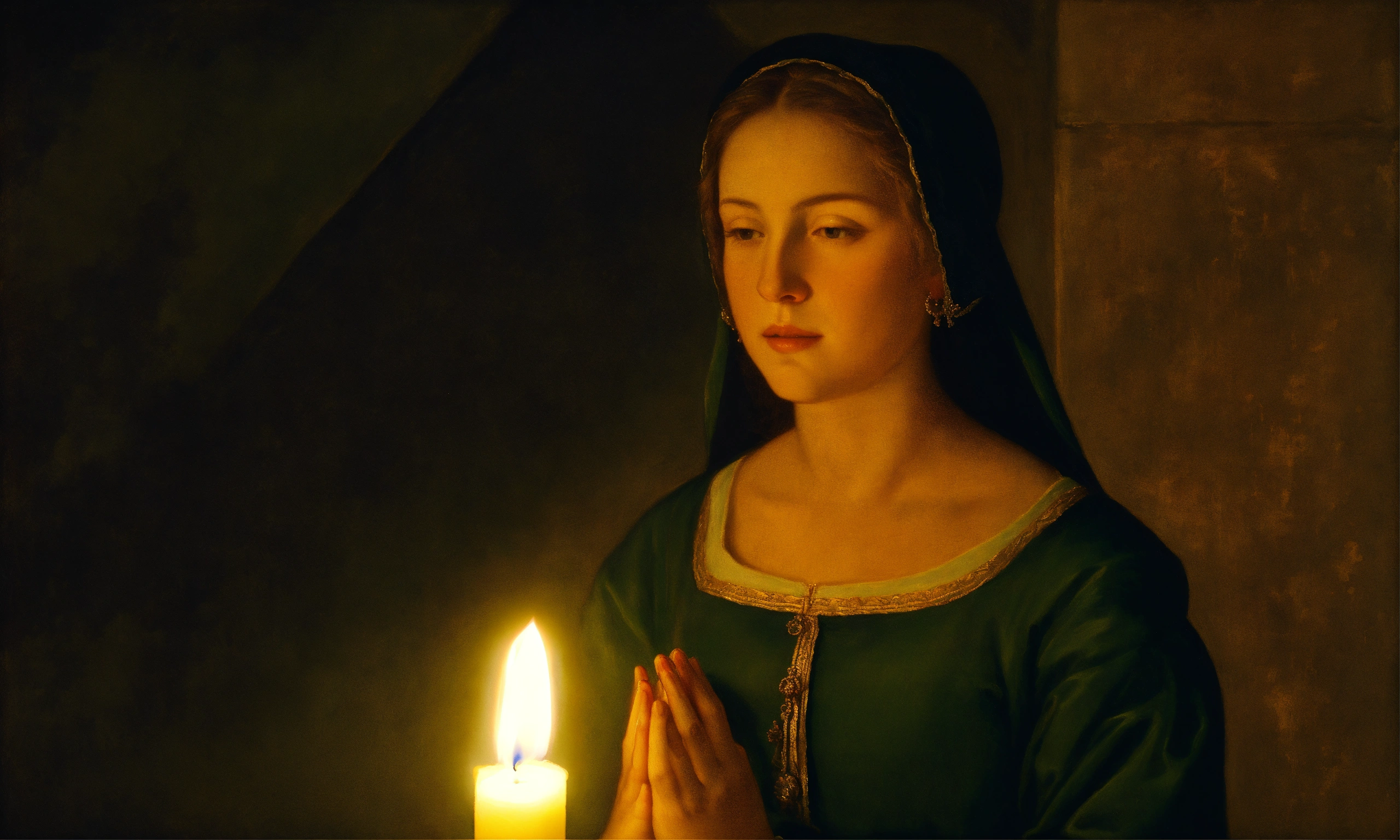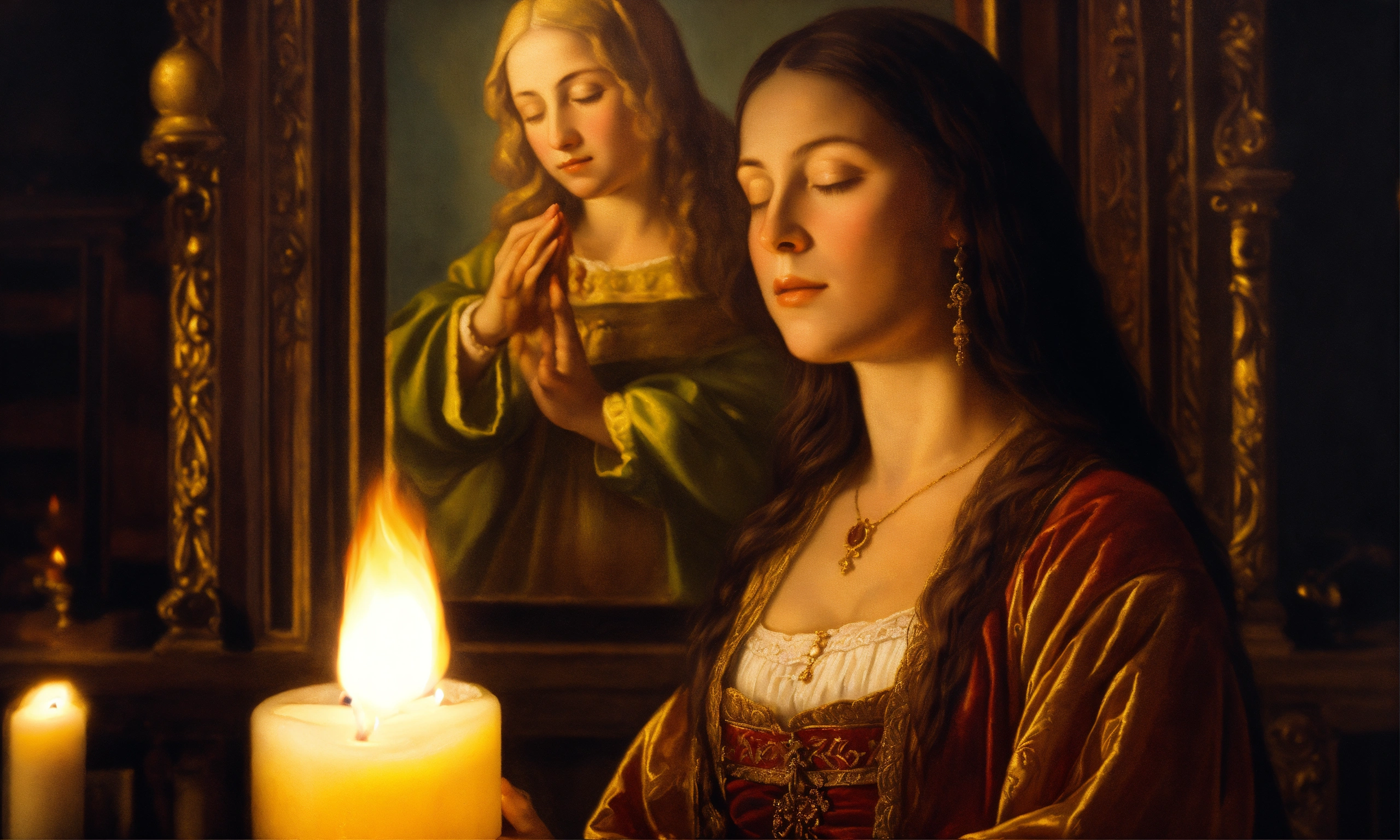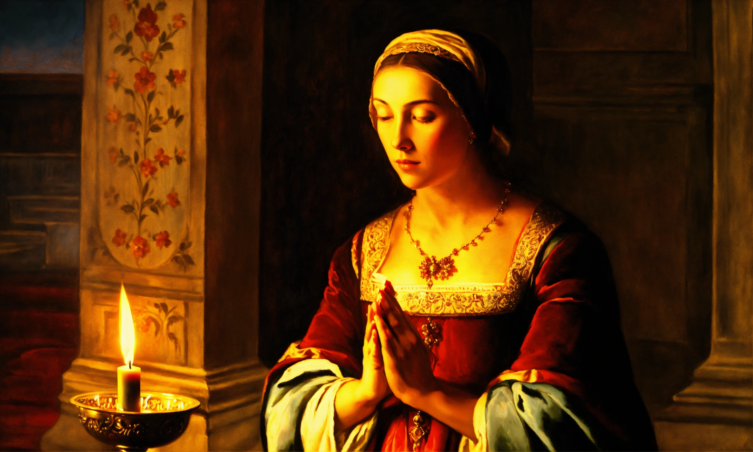 Renaissance oil painting of a woman holding a candle to pray