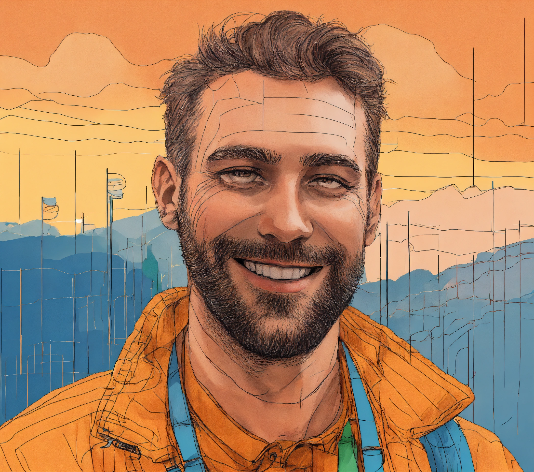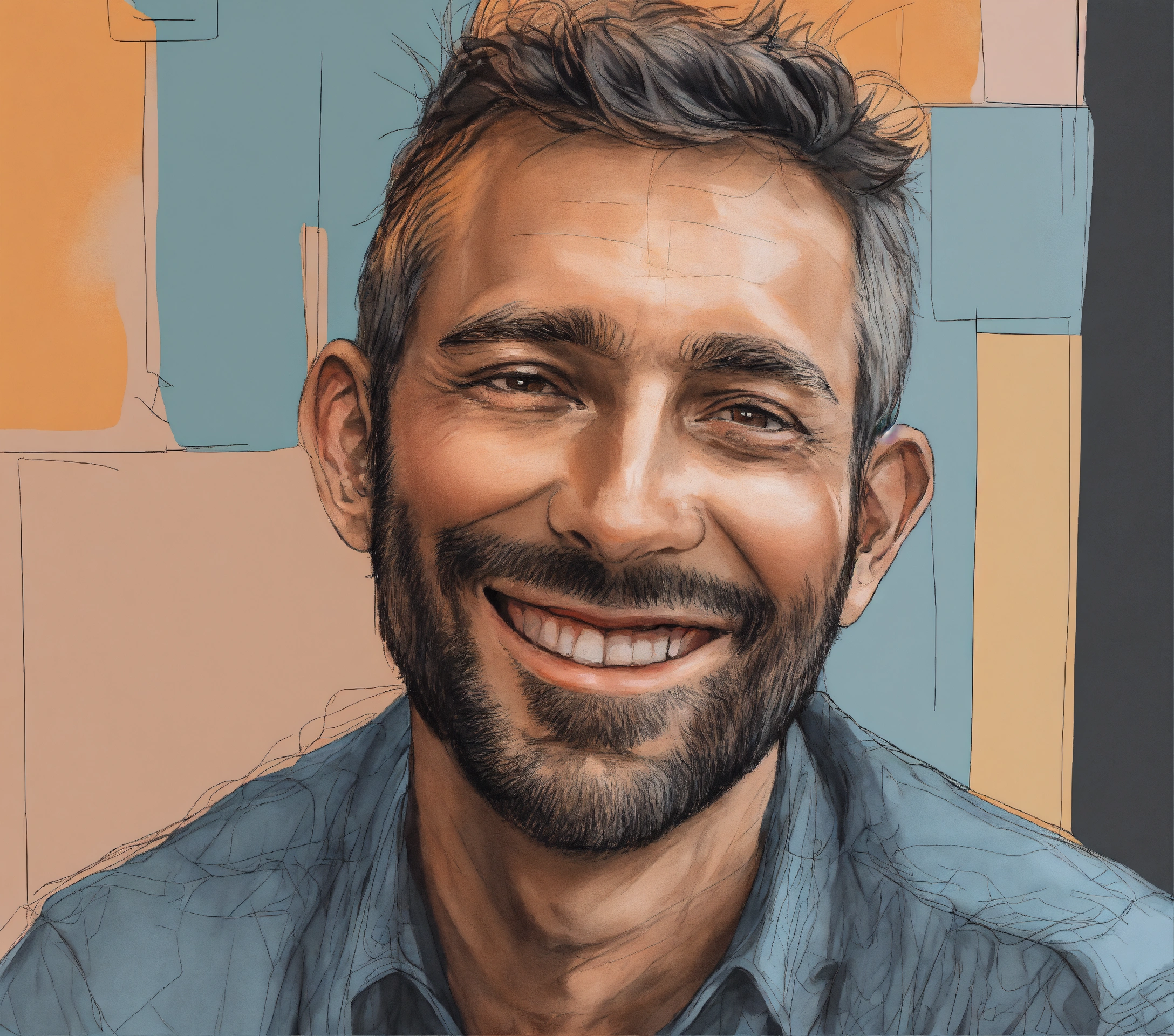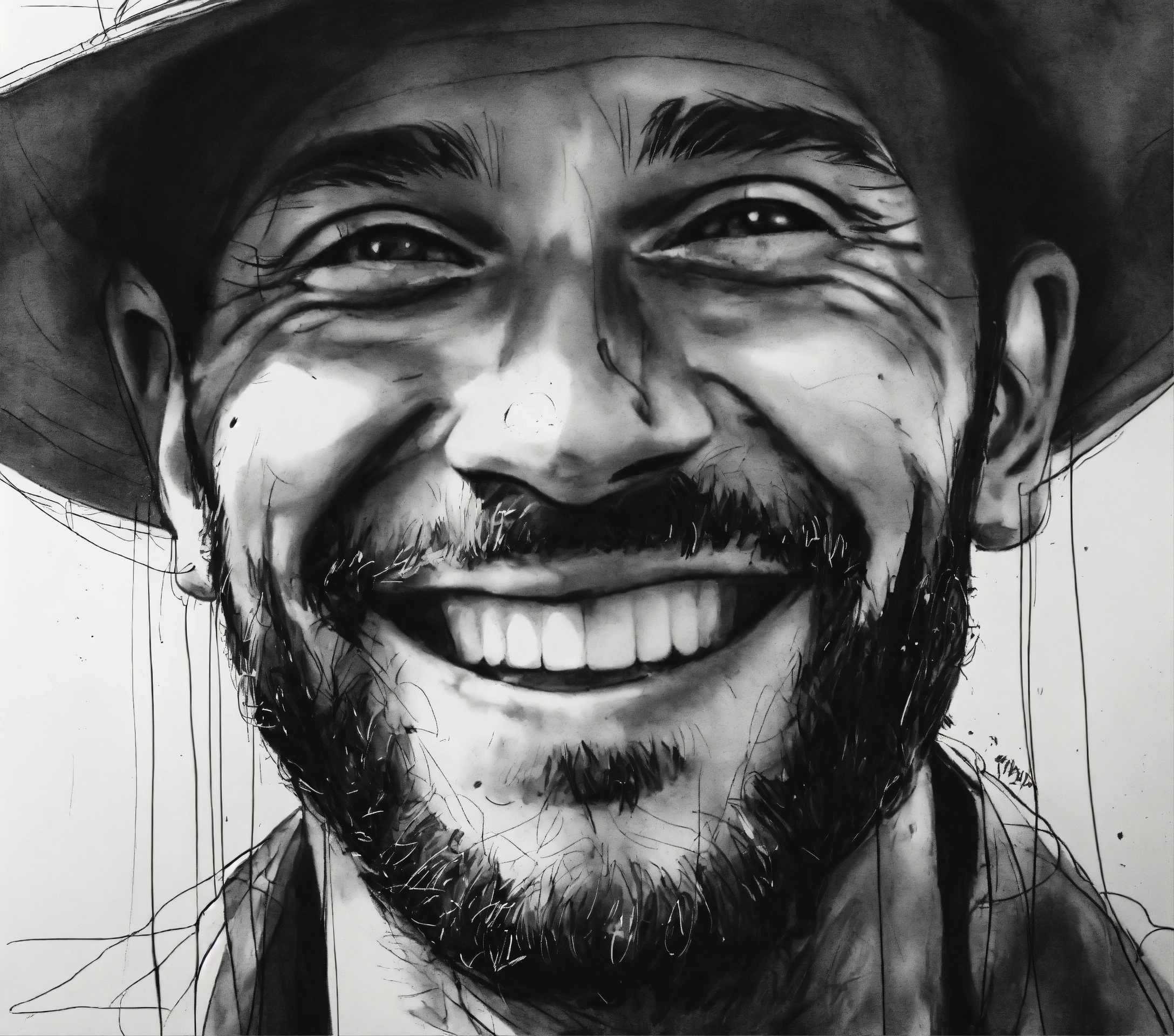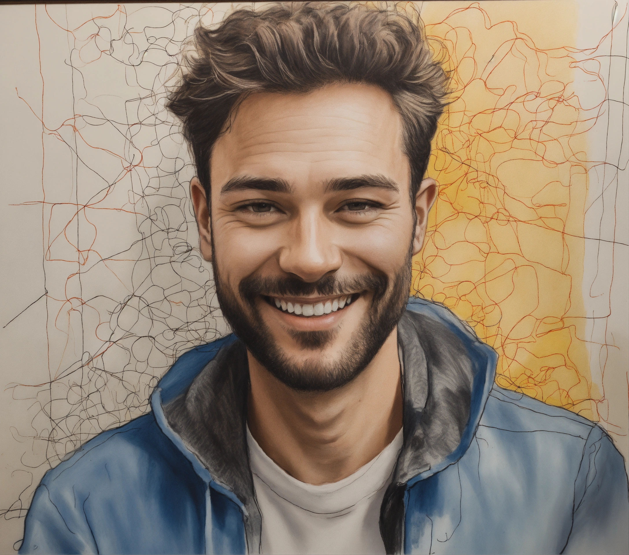 Un portrait en style "one line art" d'un homme souriant dans la trentaine réalisé avec un crayon