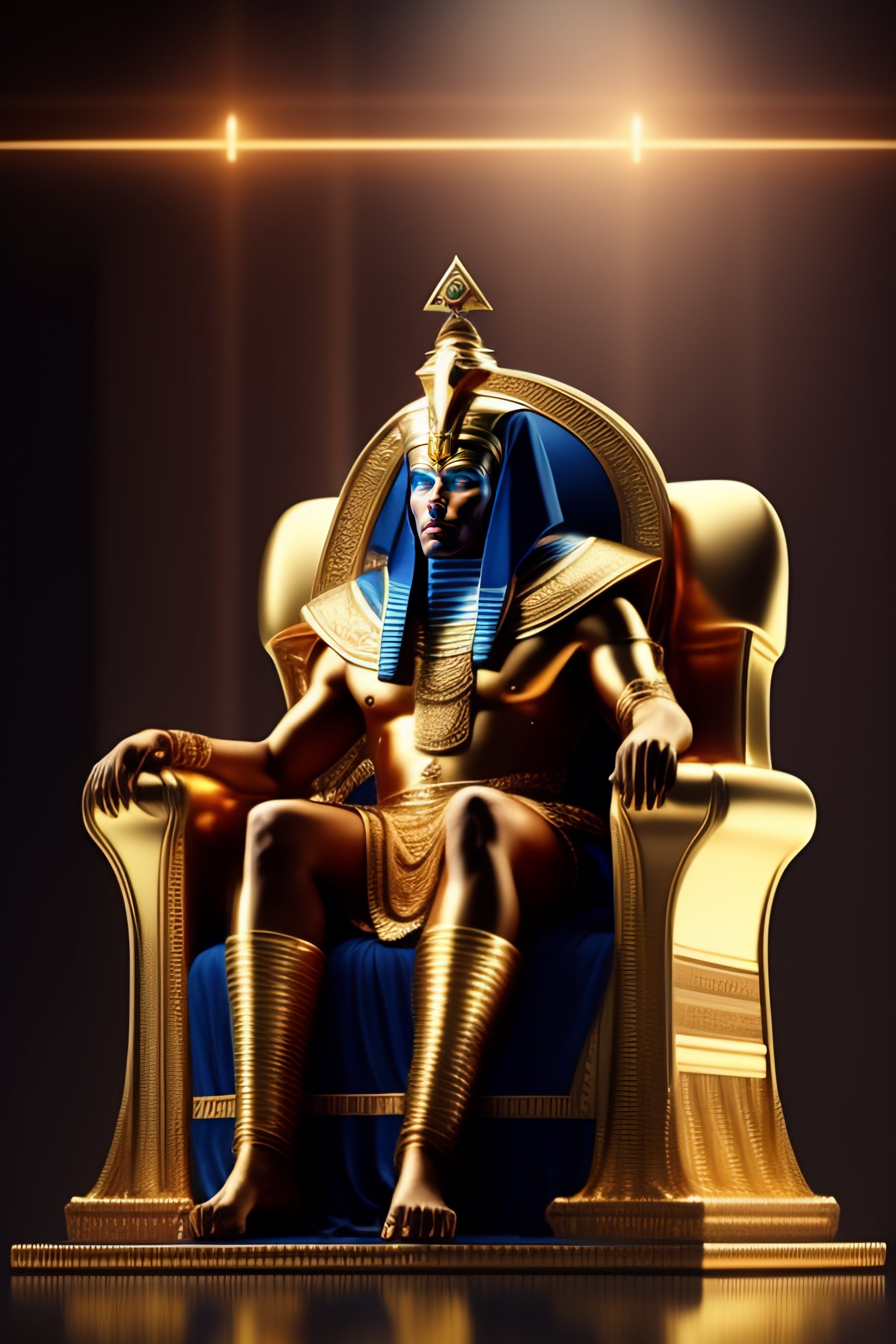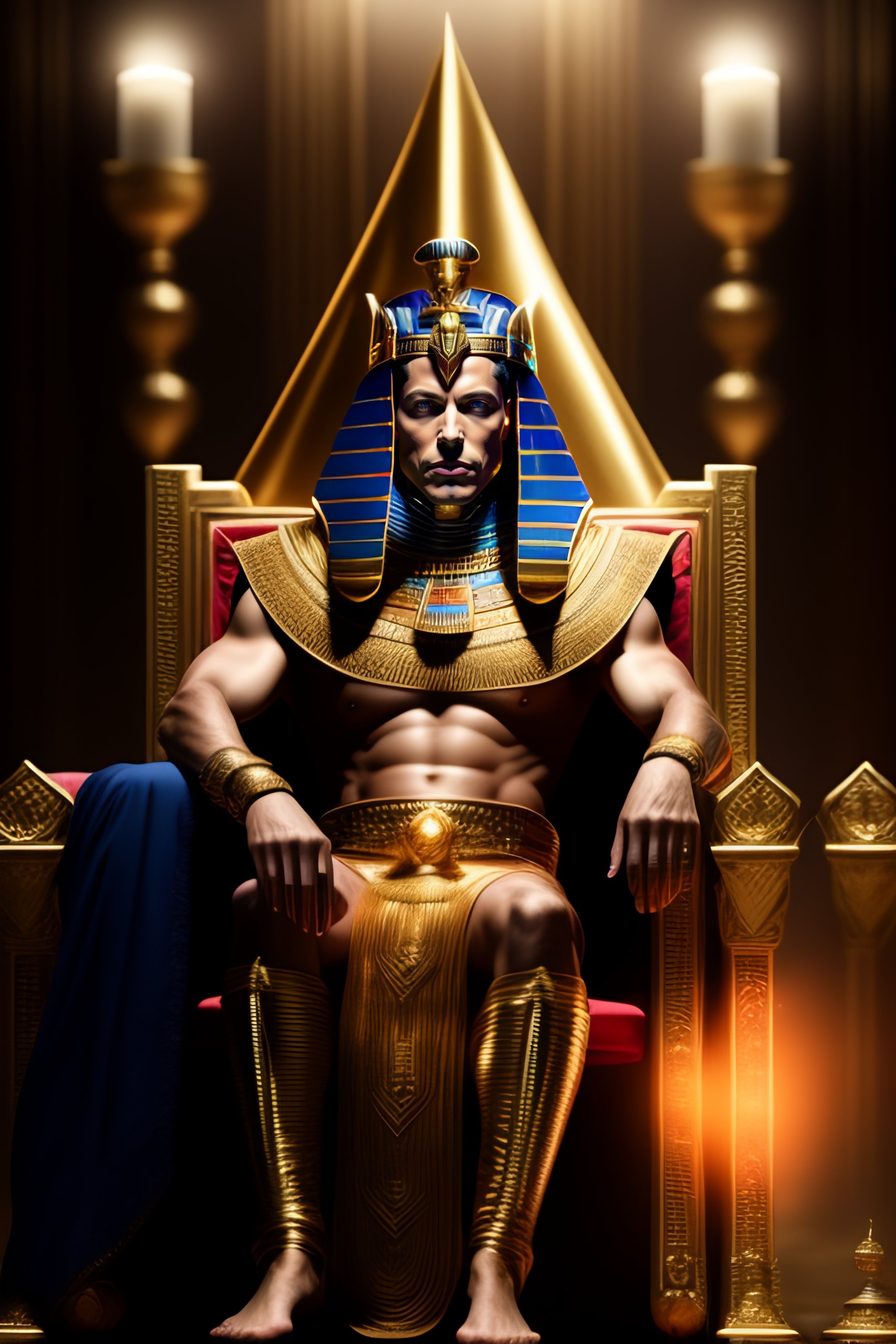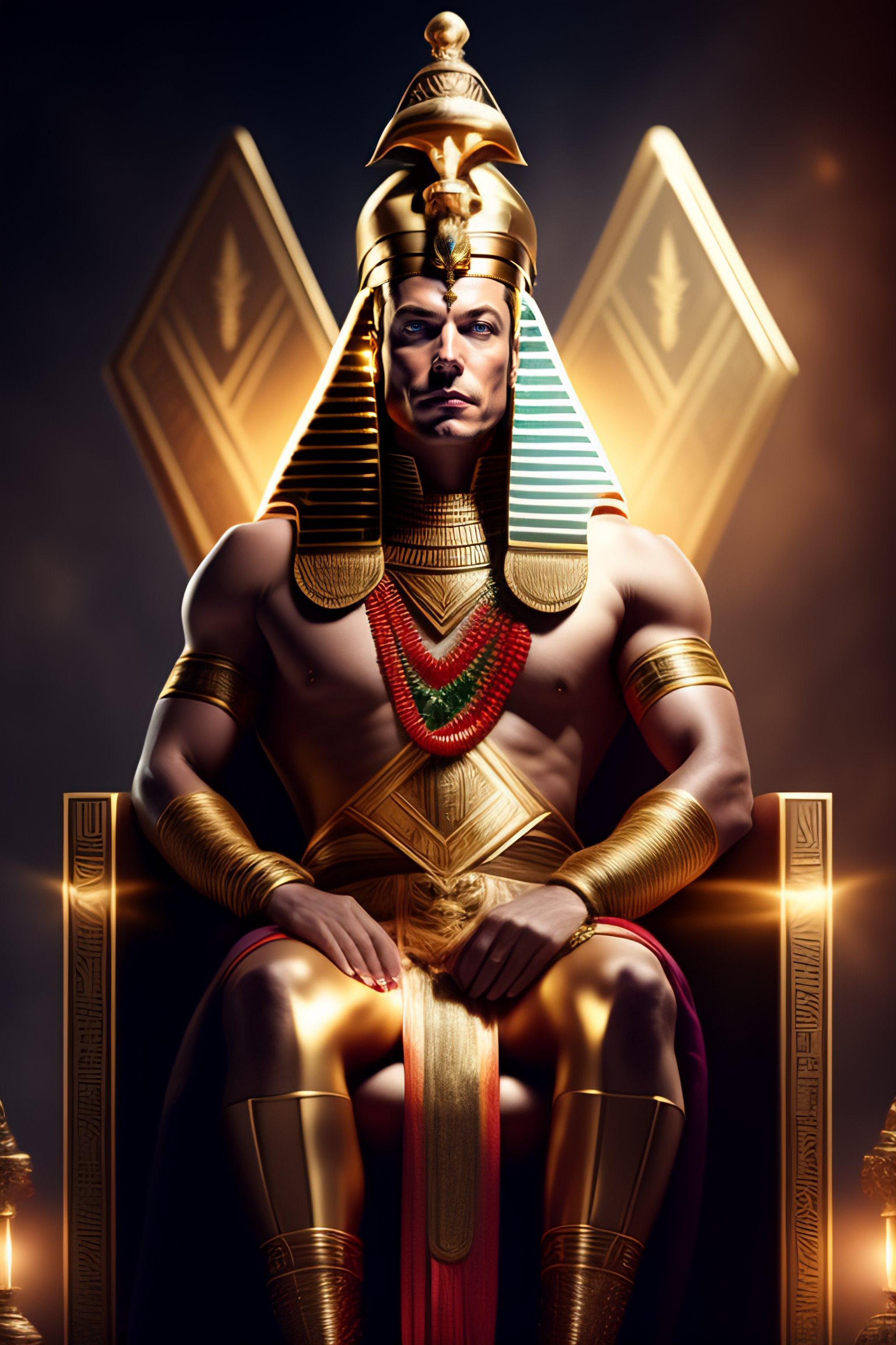 Elon dressed as an egyptian pharaoh sitting on a throne in a dark lit room with the tesla logo on his chest, ultra realistic, 4k