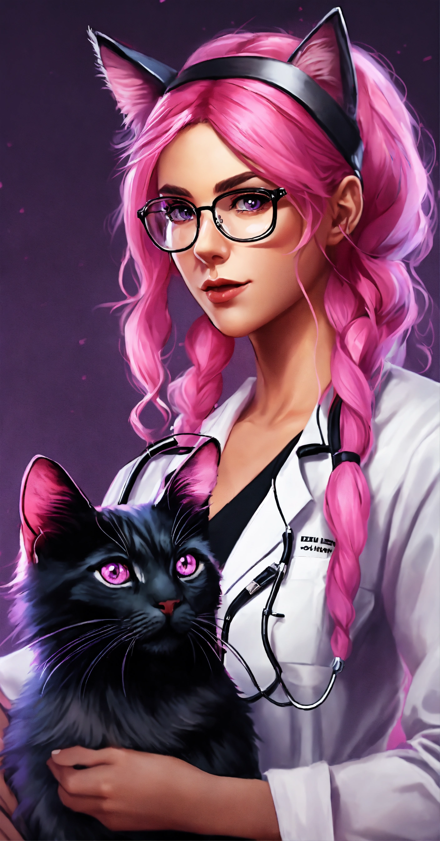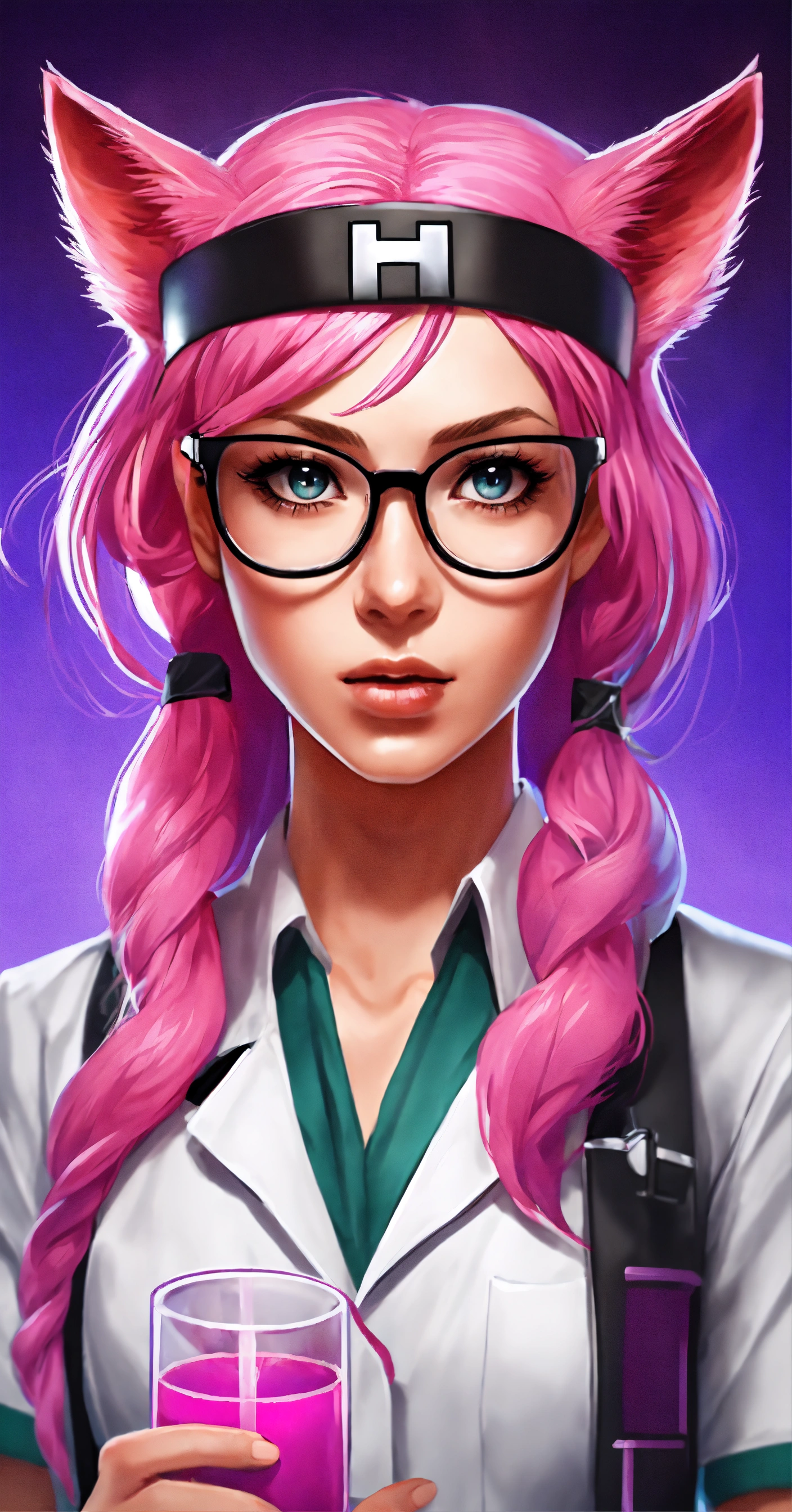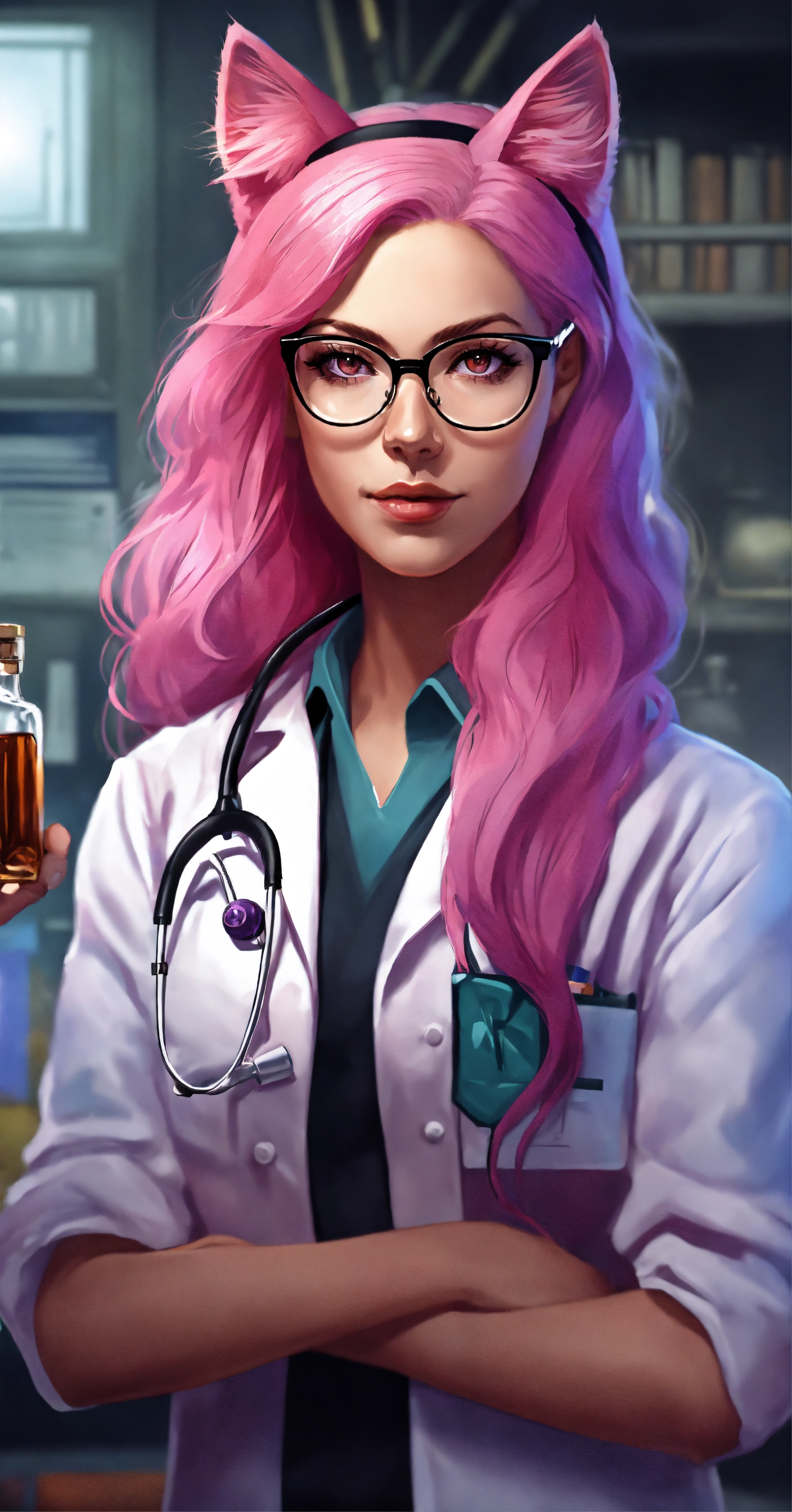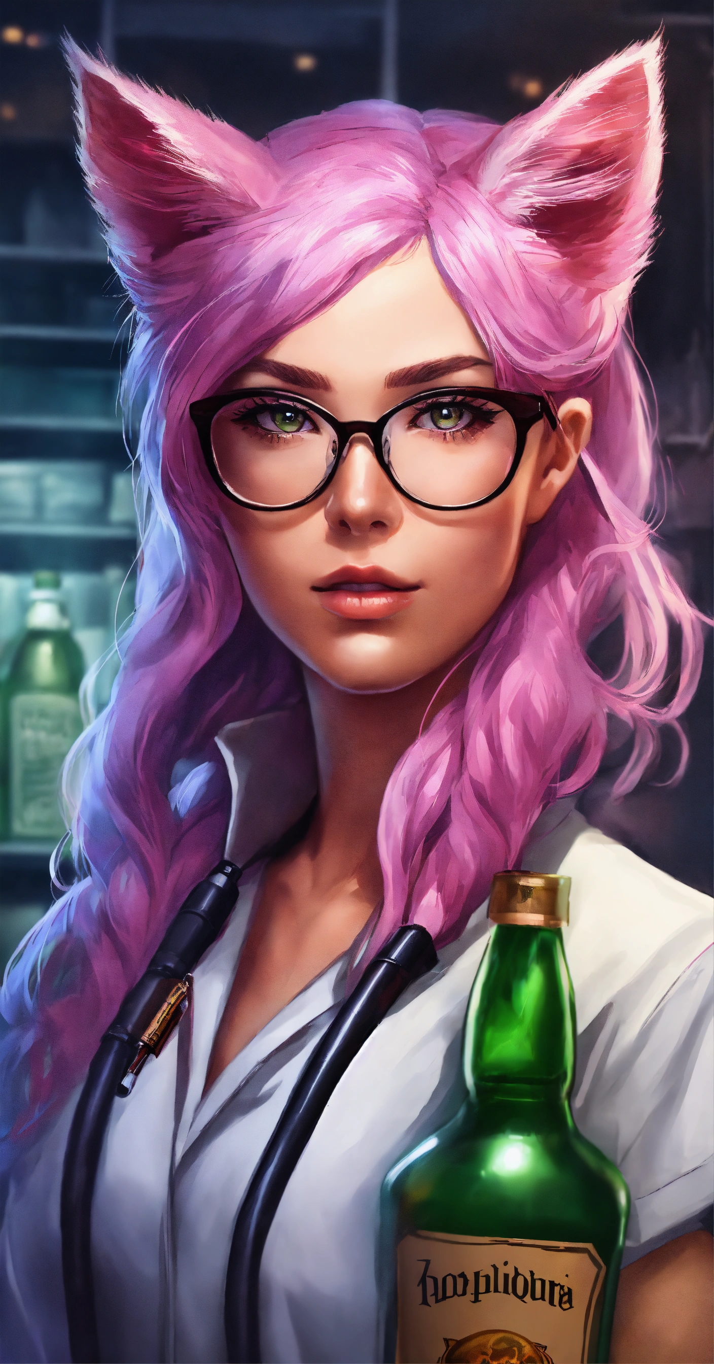 Female doctor, with long pink hair, with cat ears color black on her head, glasses and purple-pink eyes in hospital, realistic style with whiskey bottle