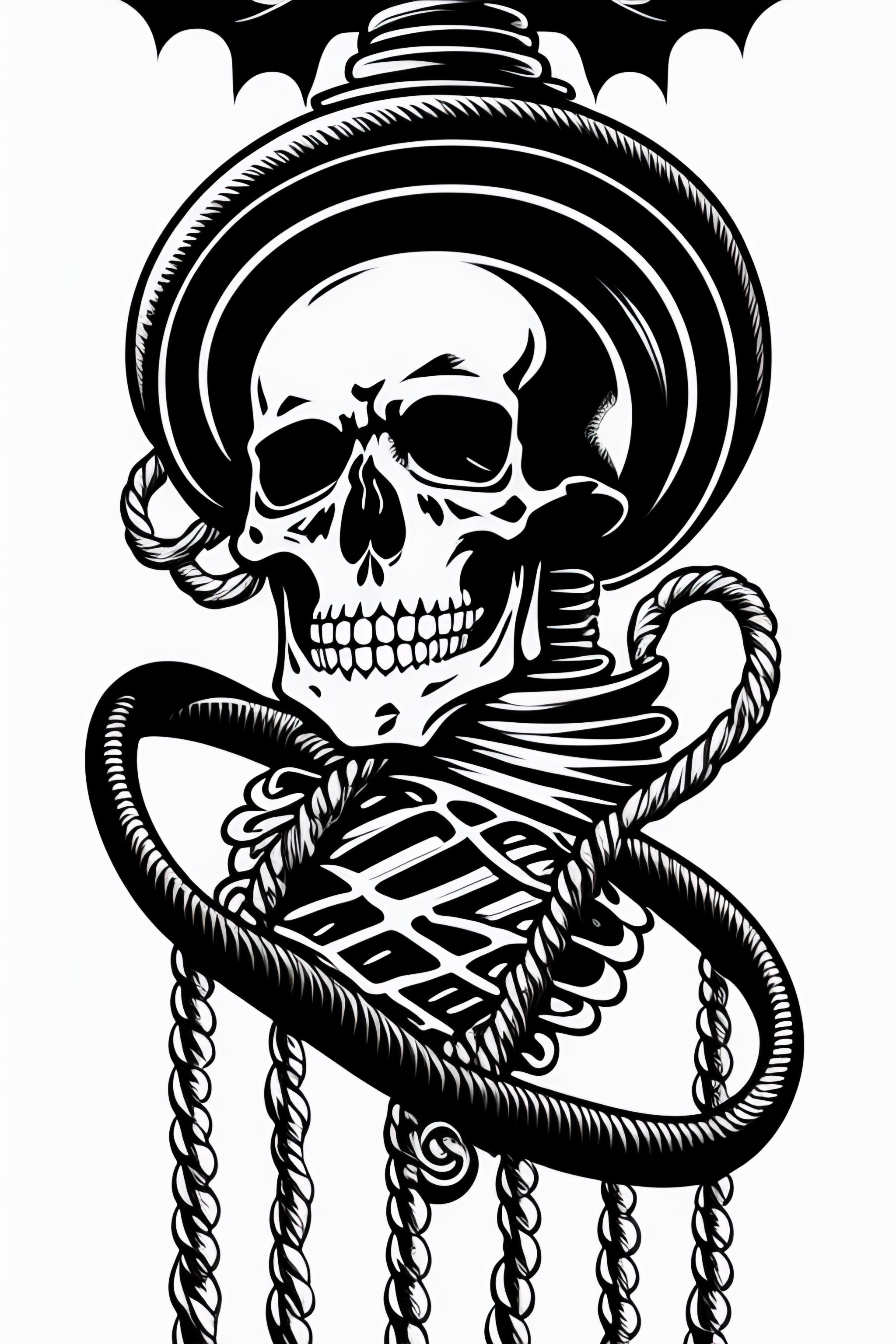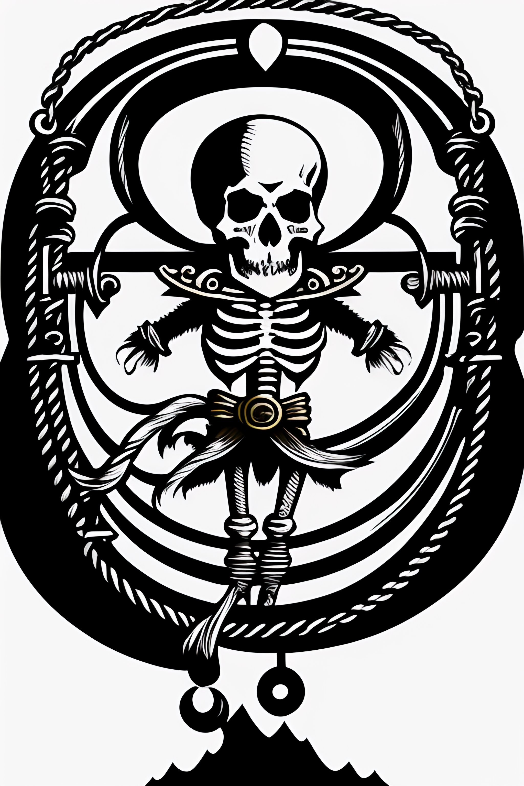 A skeleton pirate being hung on a rope at the gallows, glare, black and white, white background, no background, ink fine line art stylized, vector, design for tattoo, ignorant style