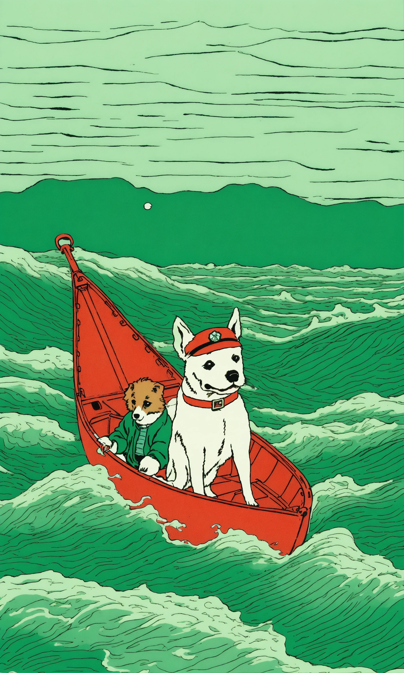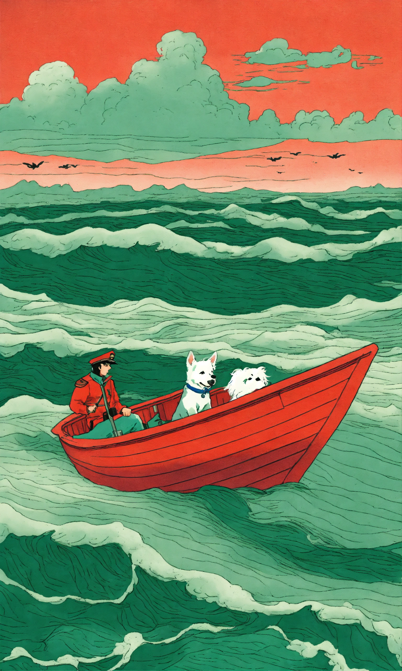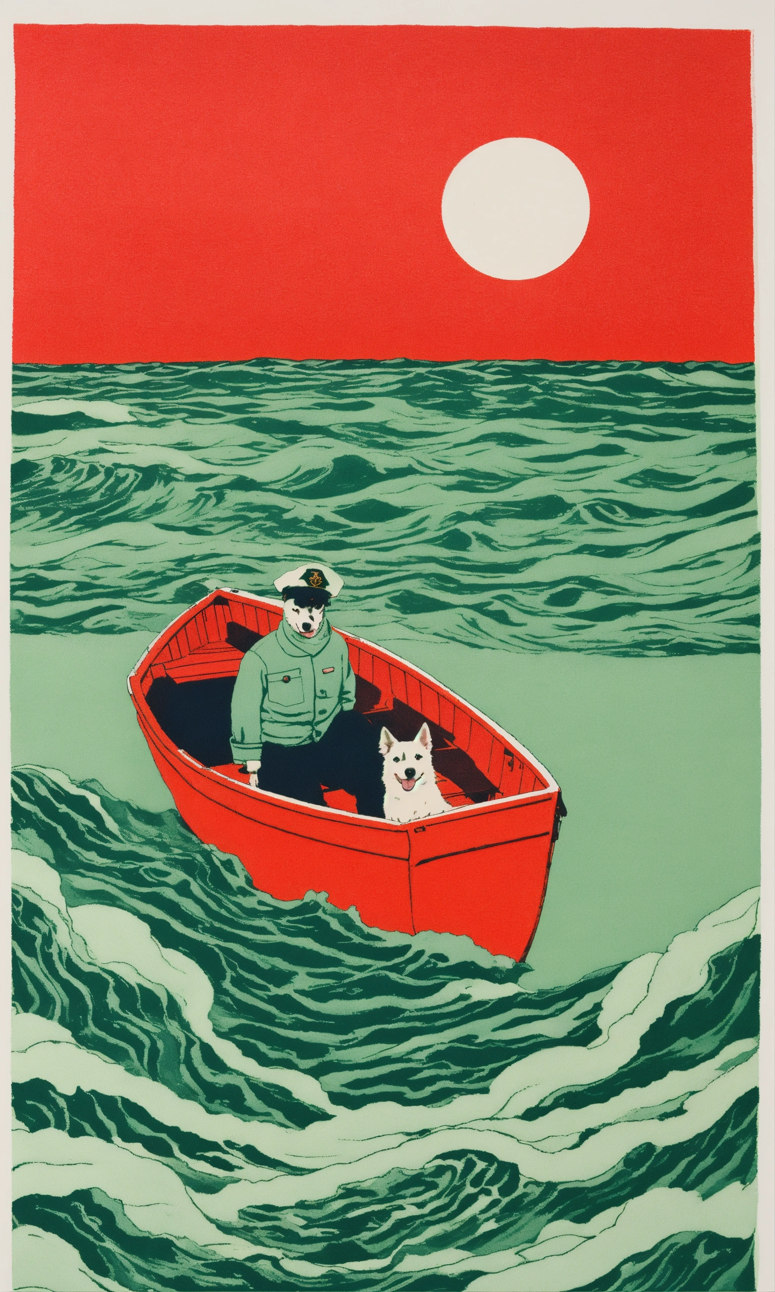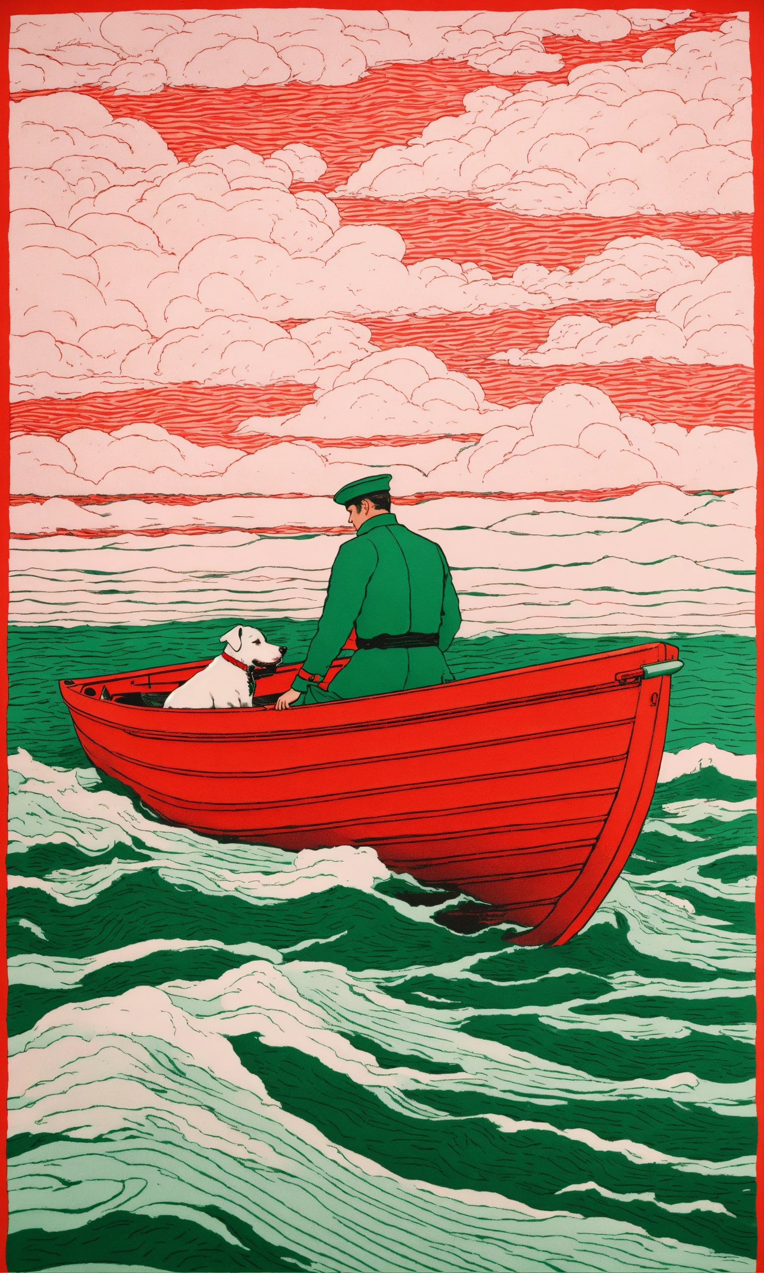 Captain and white dog in small red boat in stormy sea green tint risograph