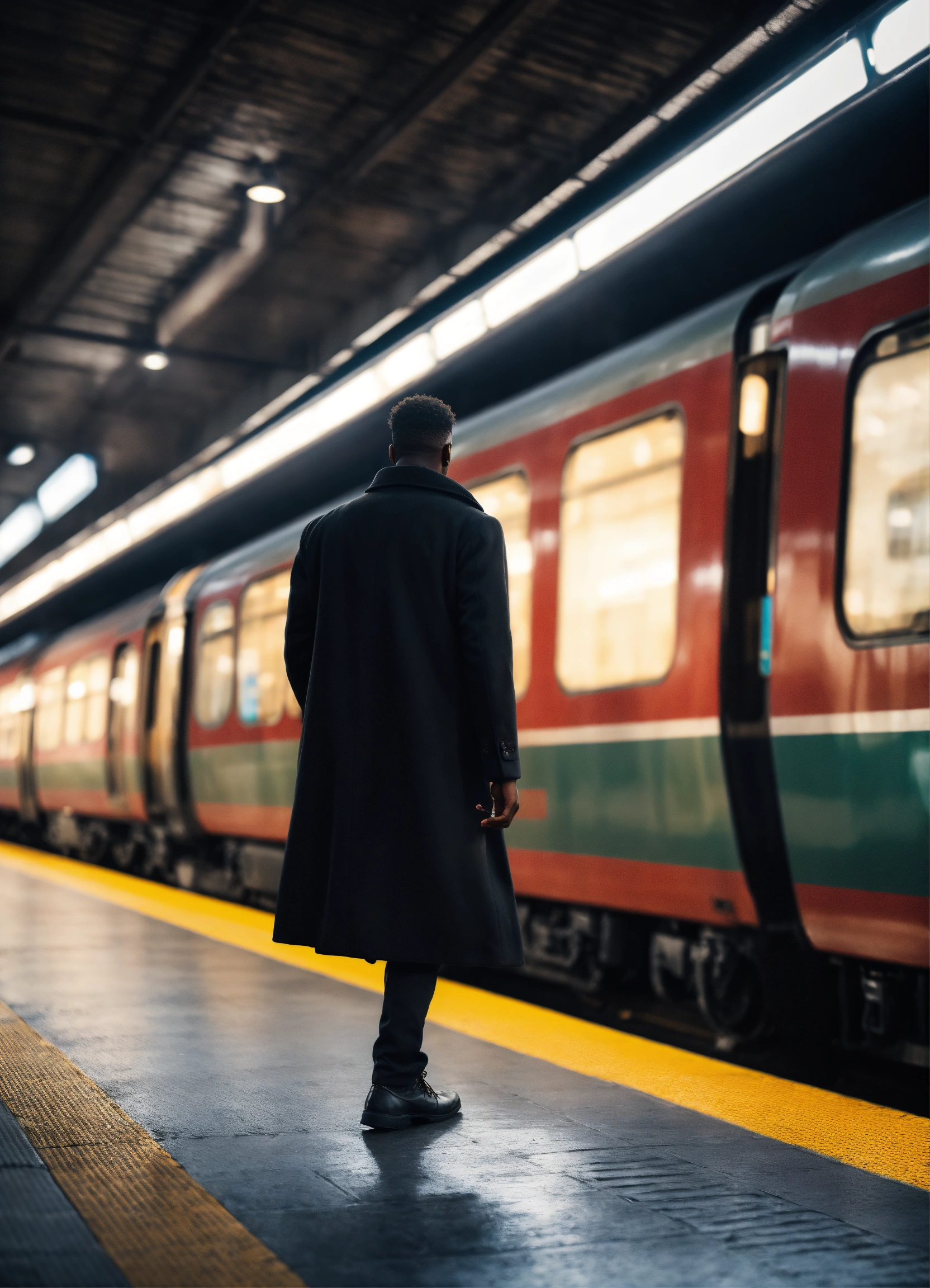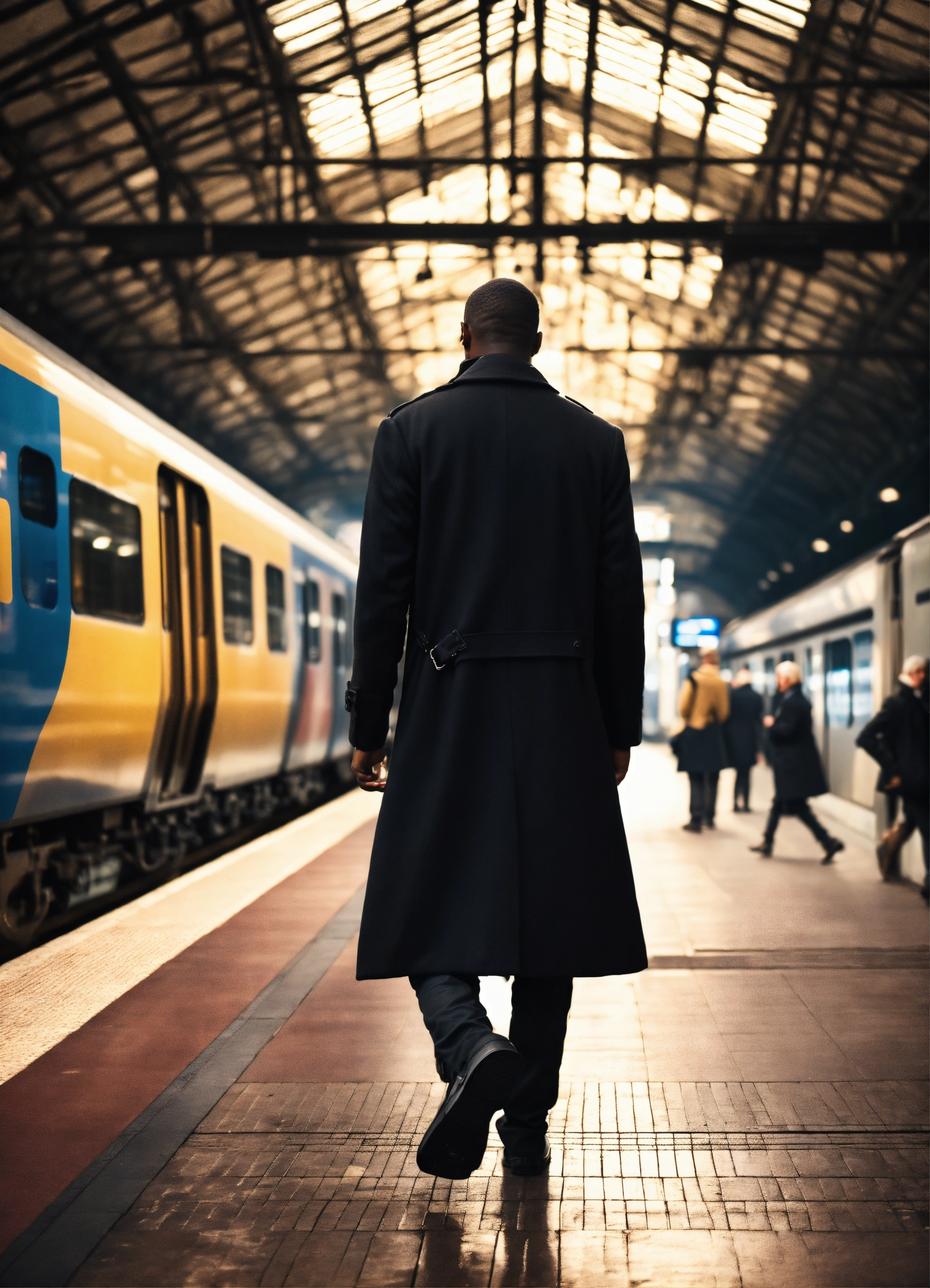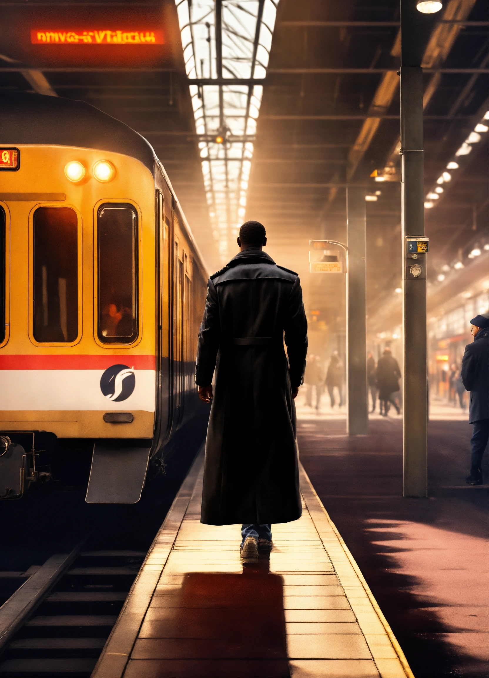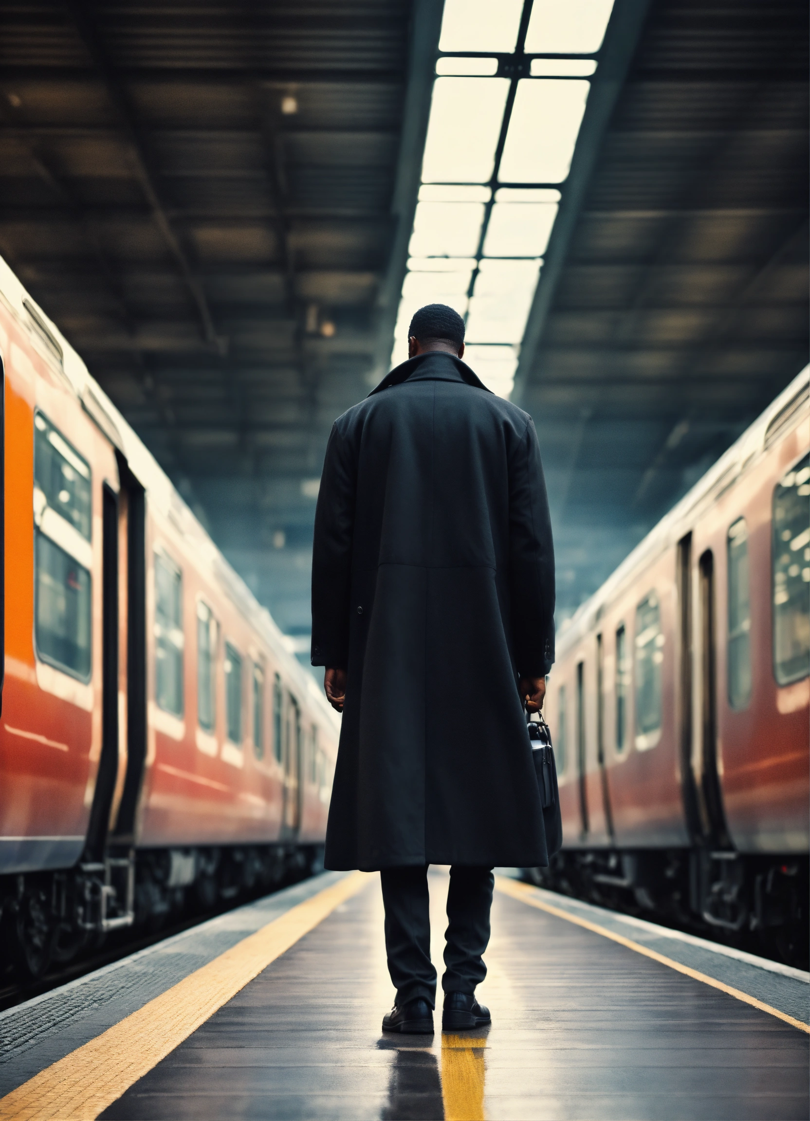 Realistic style. a black man with black long coat from behind in a train station. in fron of him there is a blurry train passing with velocity, behinda there are people passing