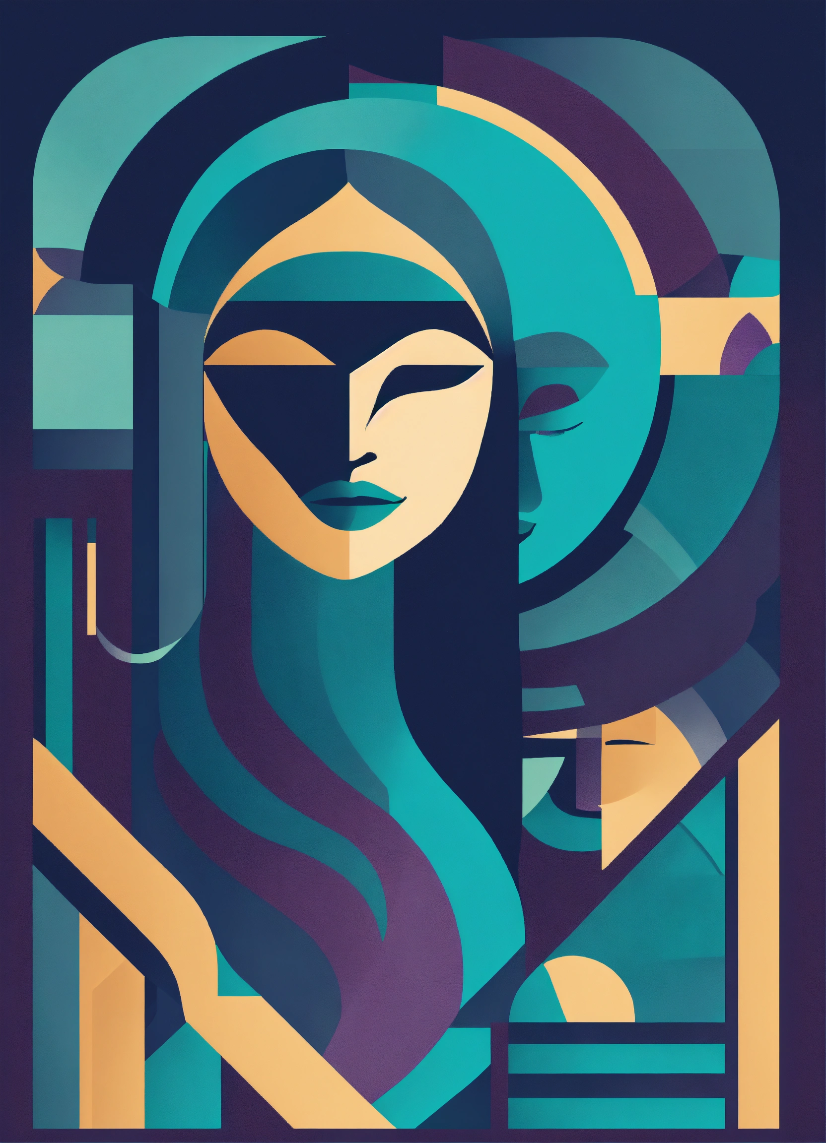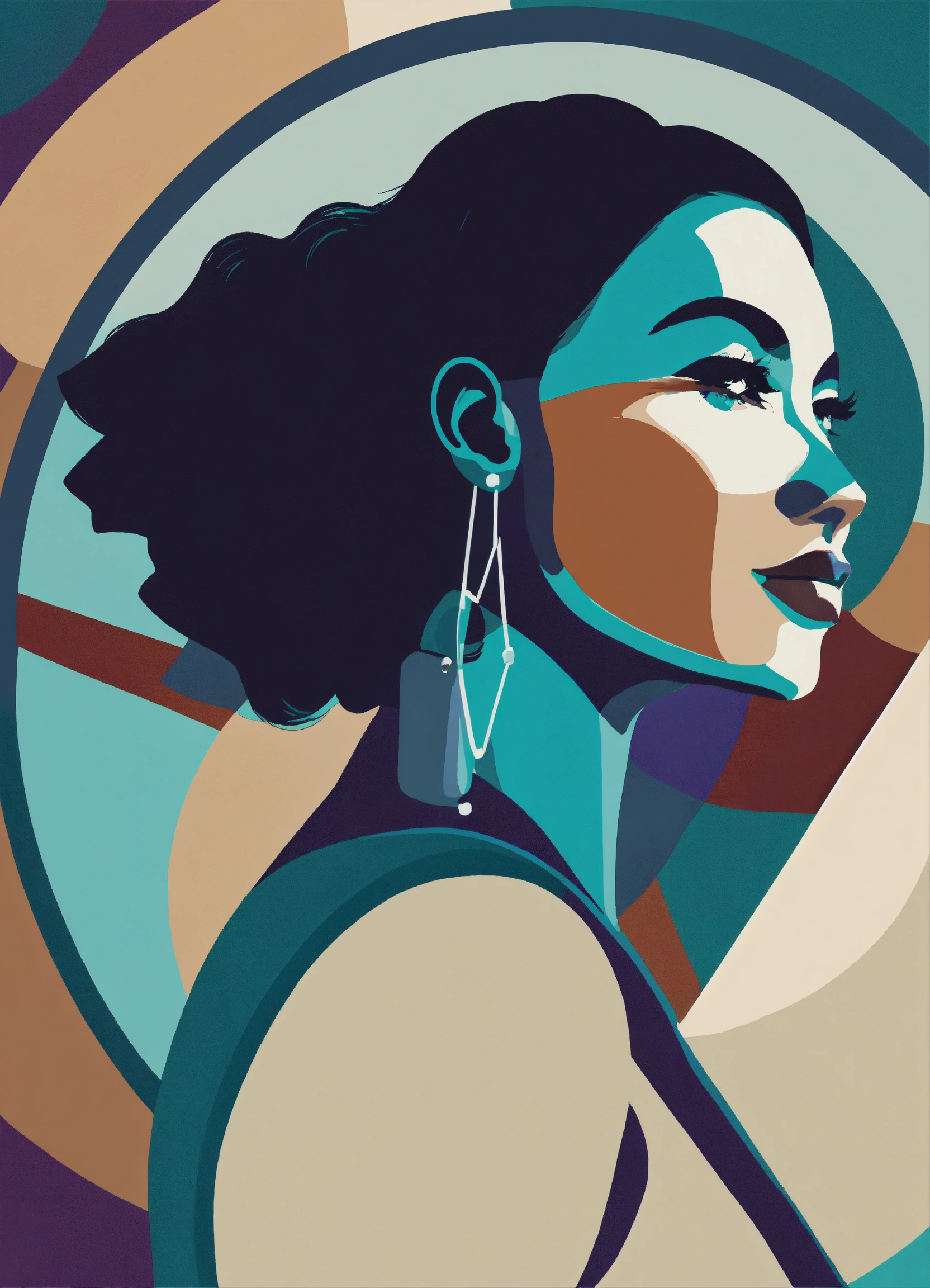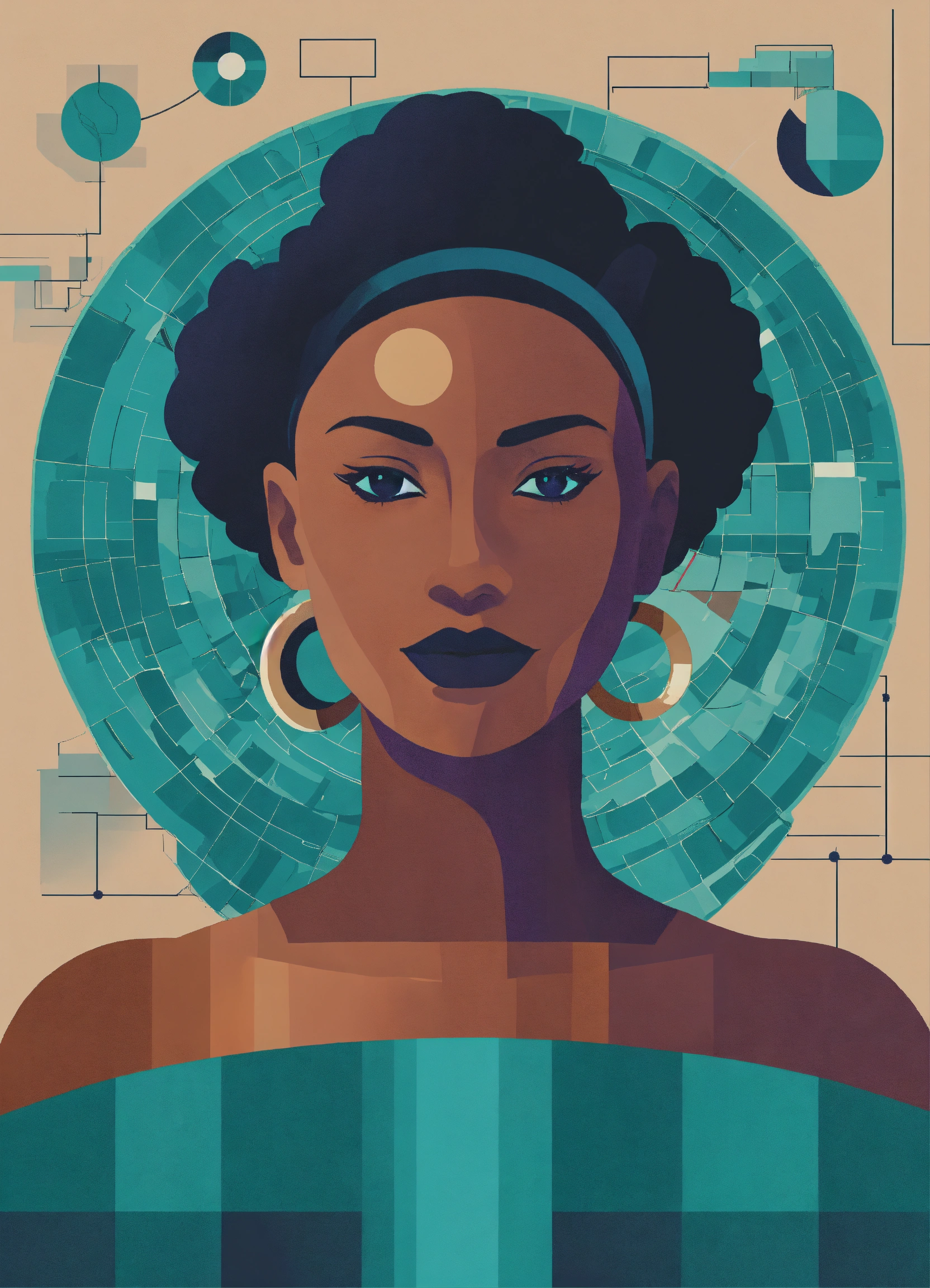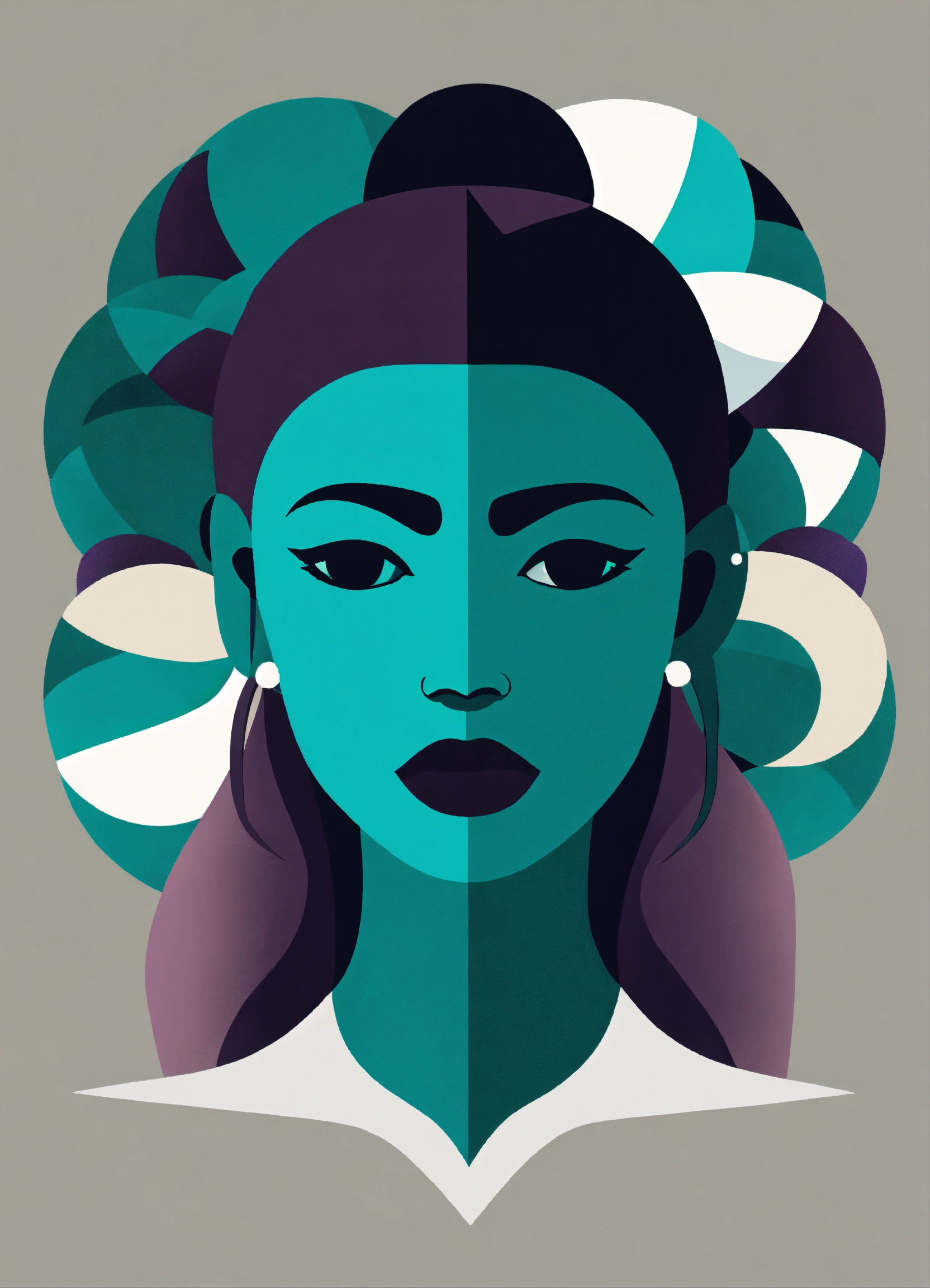 Vector icon that represents a woman of diversity ethnicites engage in internal circles in the stem industry. the color scheme of teals, dark blue, dark purple and black