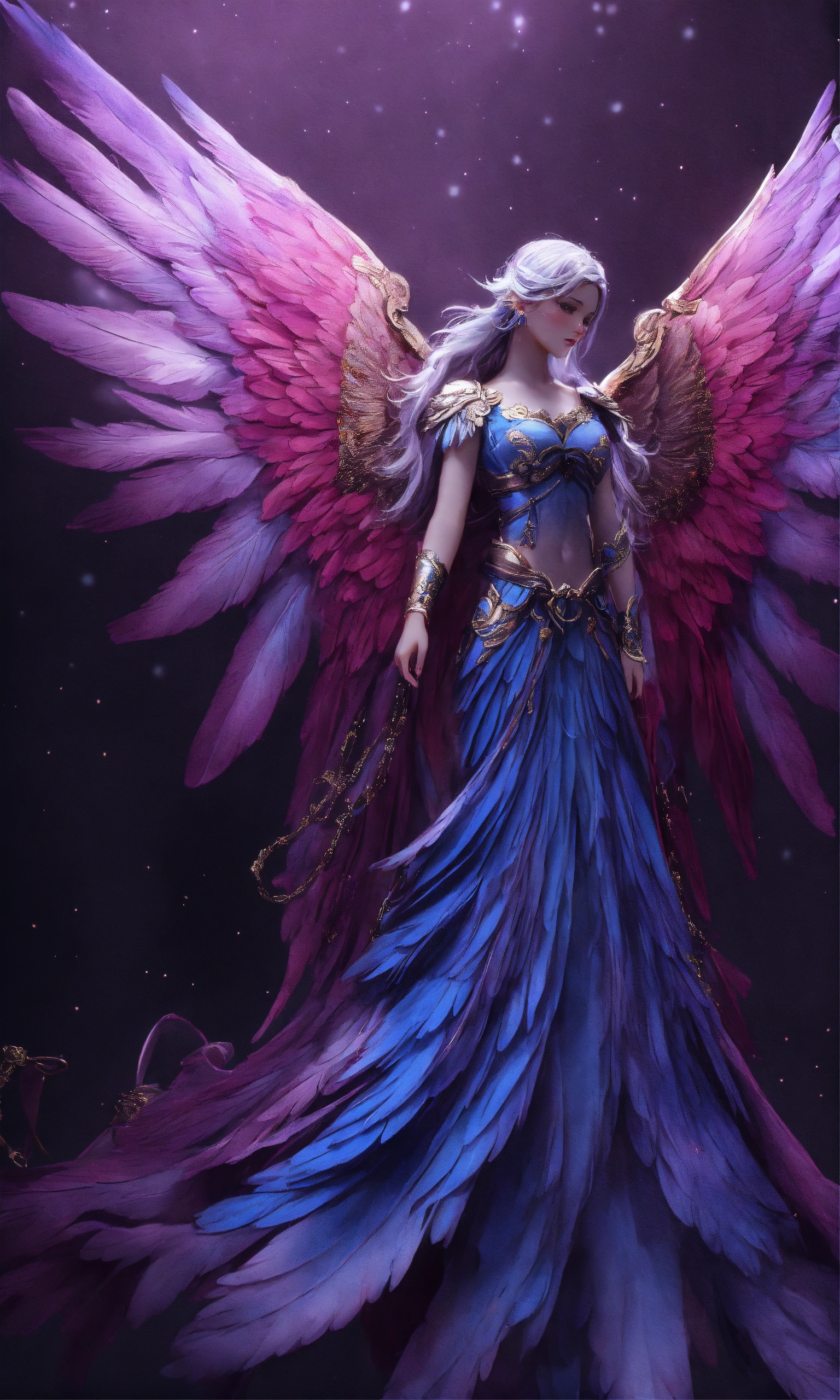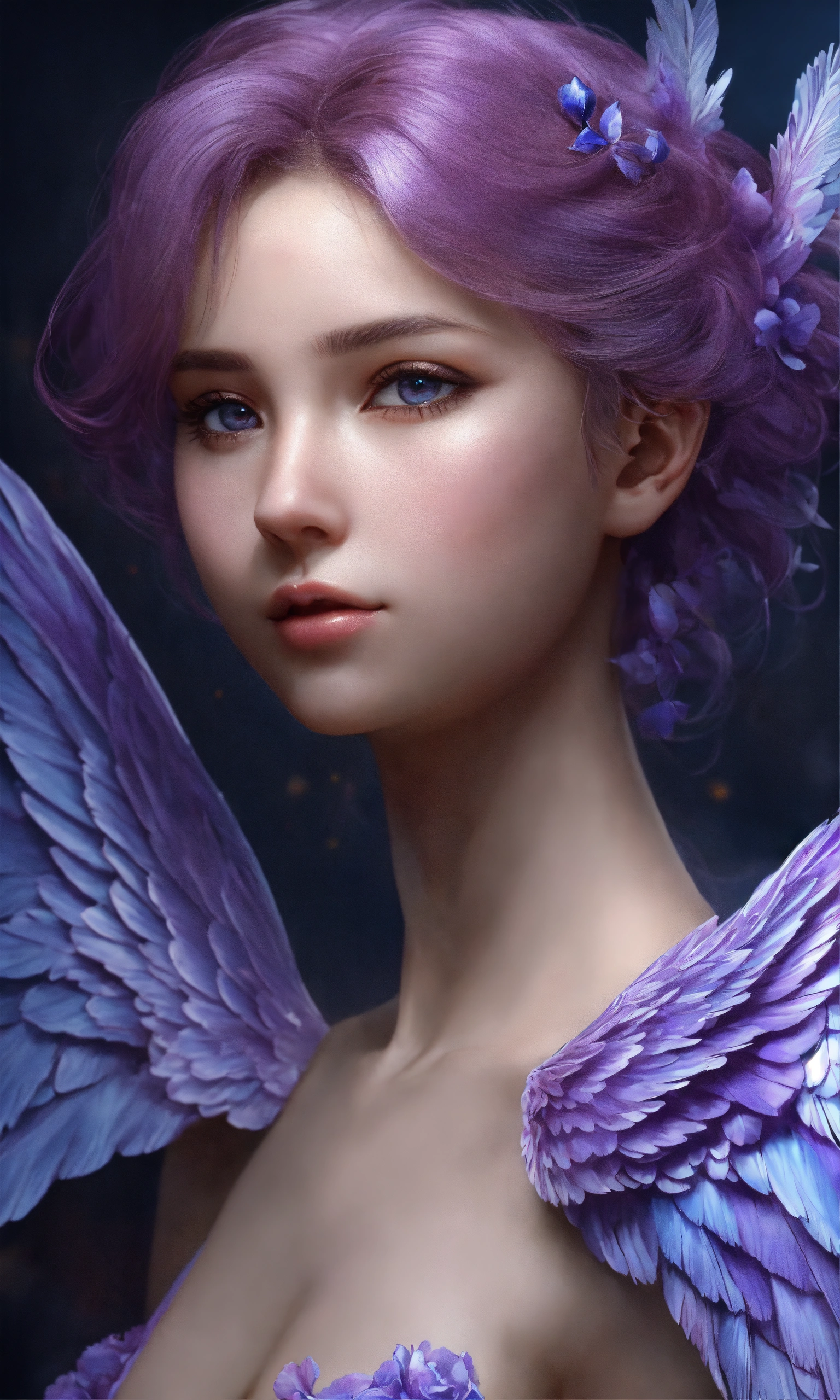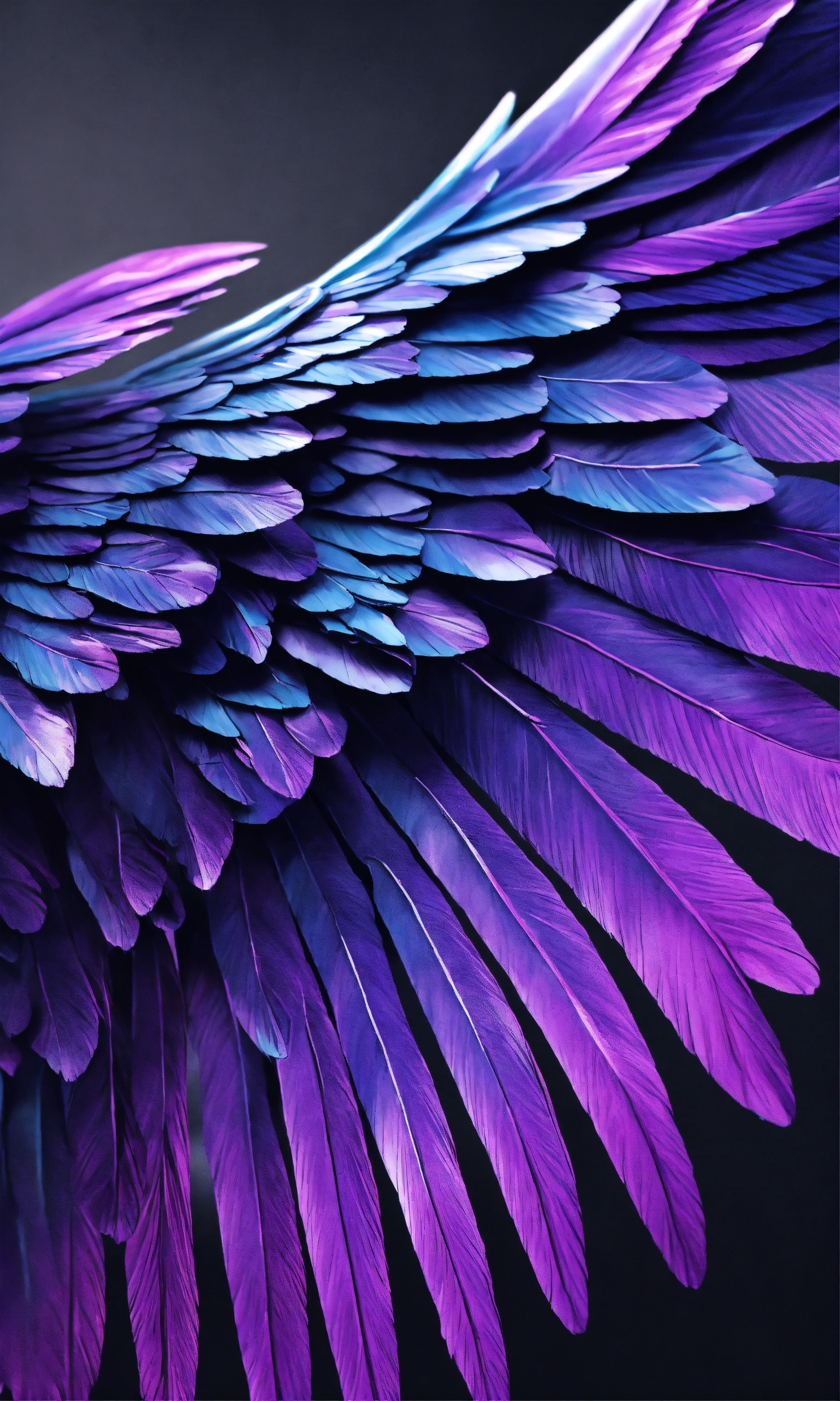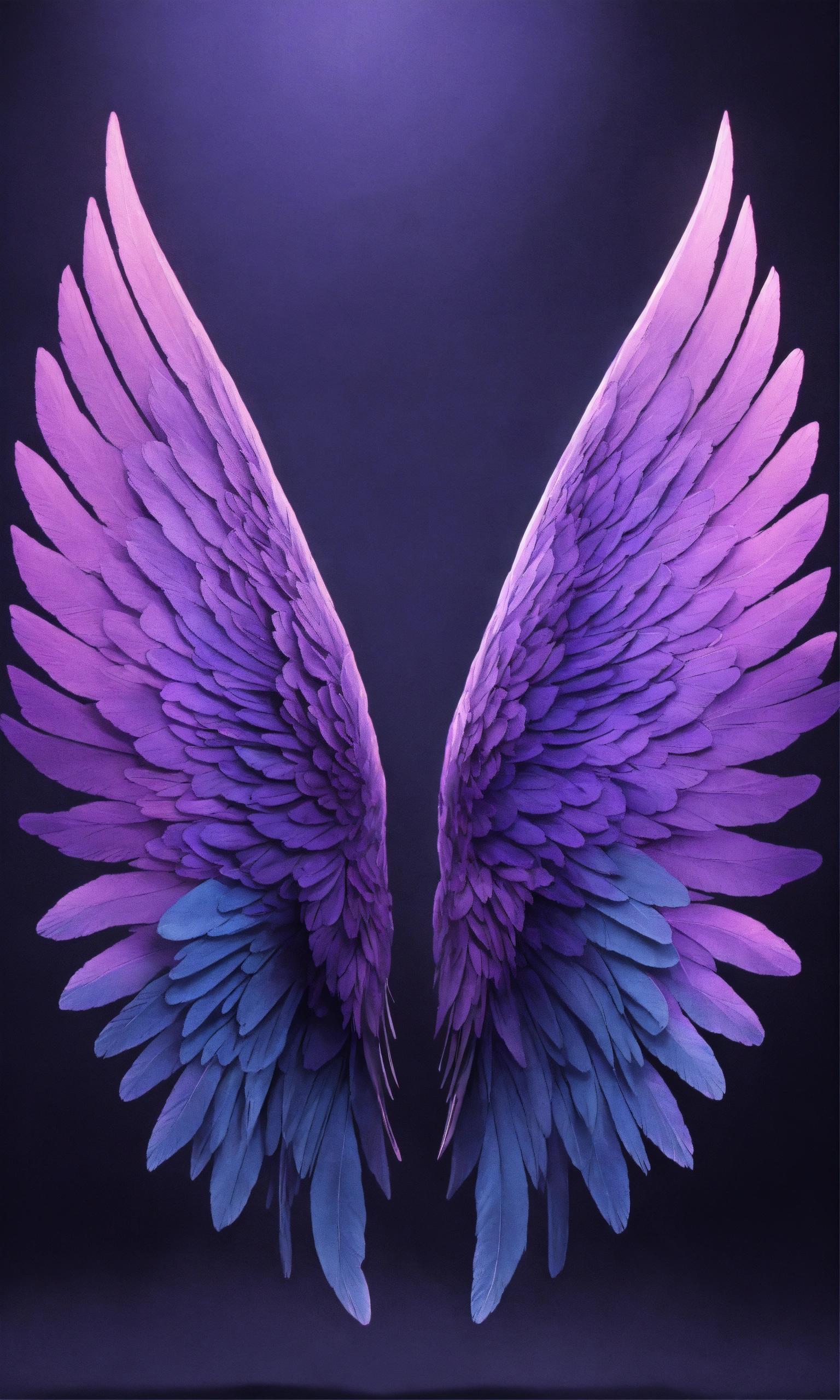 Beautiful and perfect small angel wings of violet color with detailed and defined and at the same time some details. just a pair of small, violet-colored wings with small, complete blue. hyper-detailed and hyper-realistic wings. wings with a slight decoration in shades of violet and white. small wings complete both the right wing and the left wing, the background is dark blue, 3d, masterpiece. hd. realism. high resolution. high quality. digital art. 8k