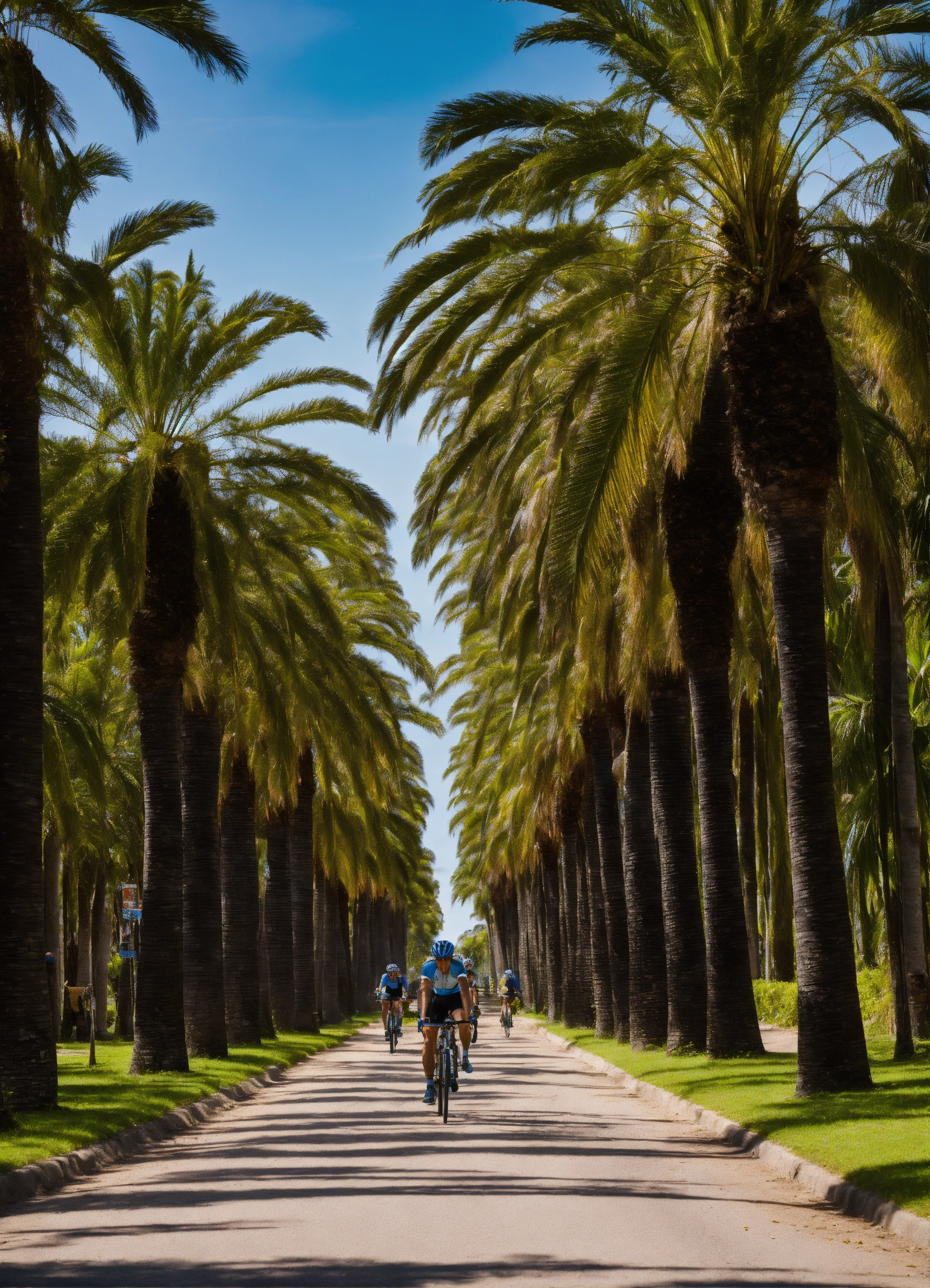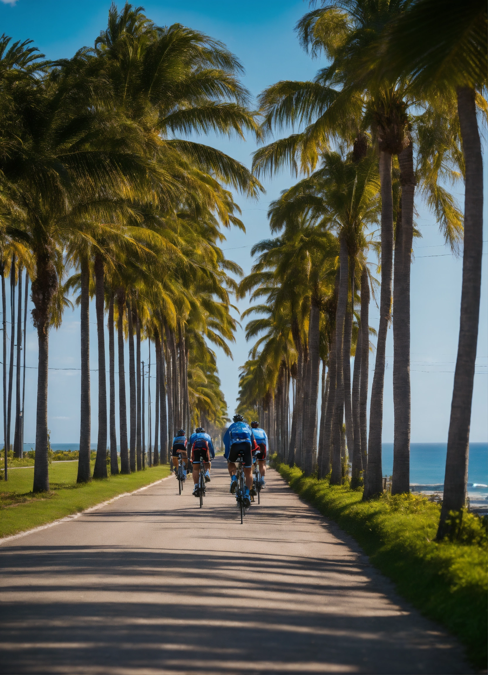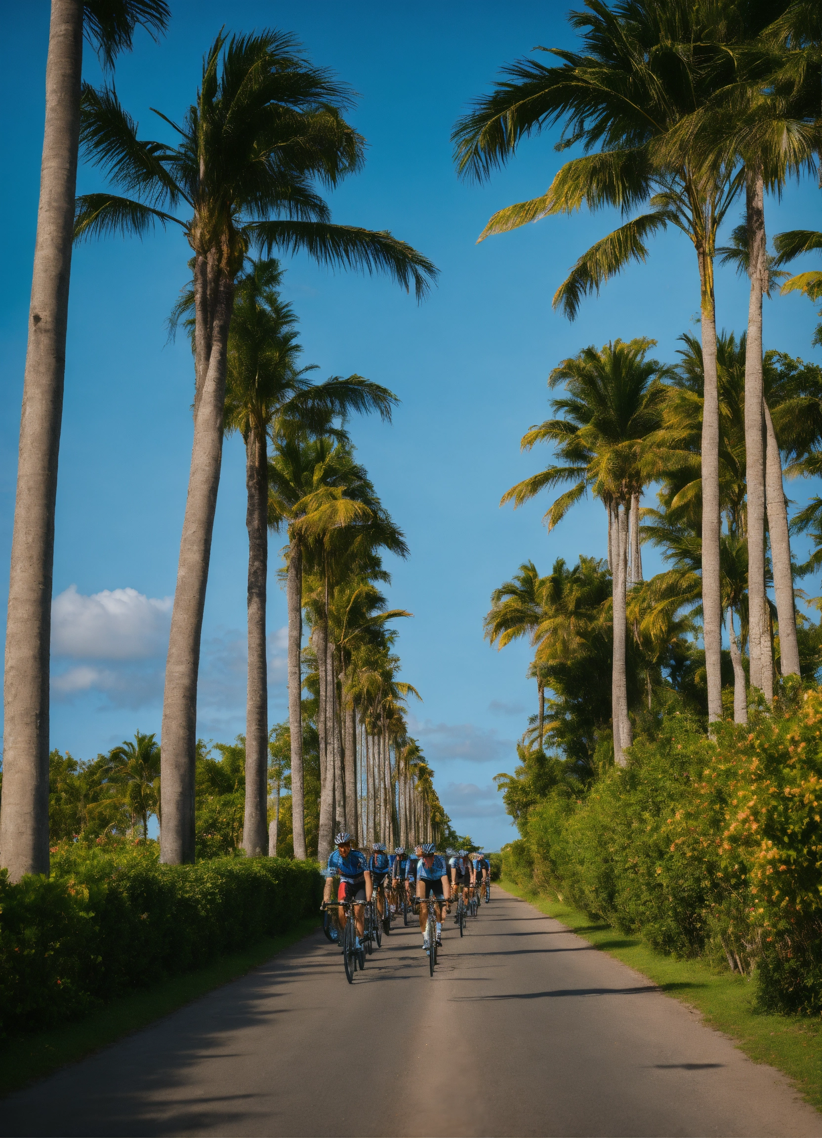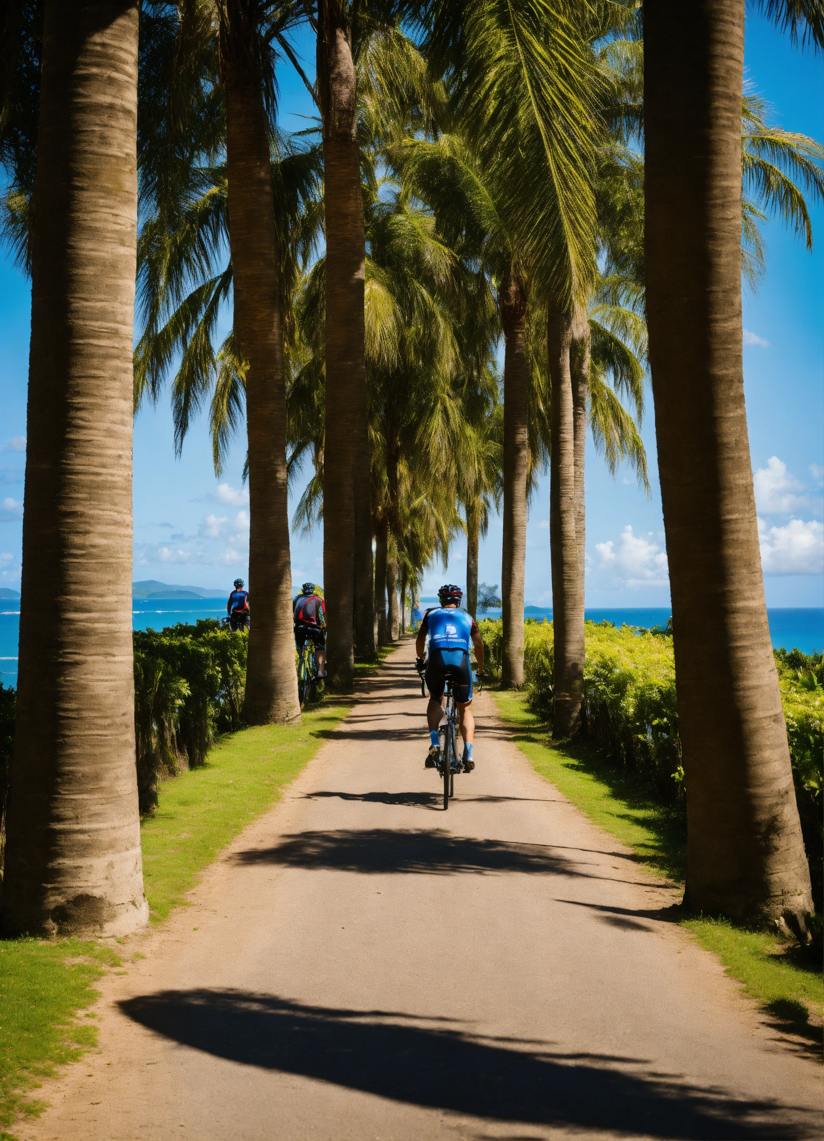 Focus 50mn on the men face outside cycling, there is a raw of palms on the right an the left forming is like allée du manoir in guadeloupe an alley, the ground is like a road, the sky is blue