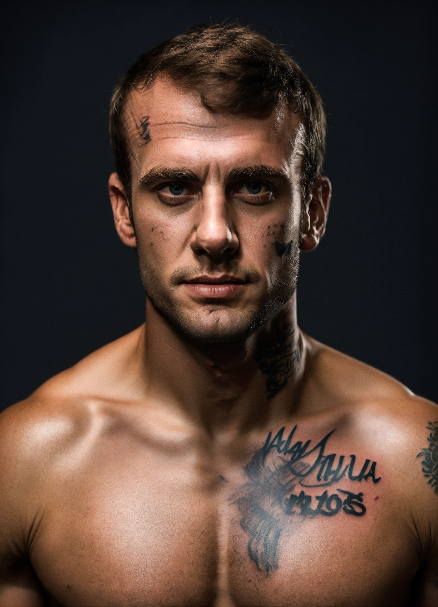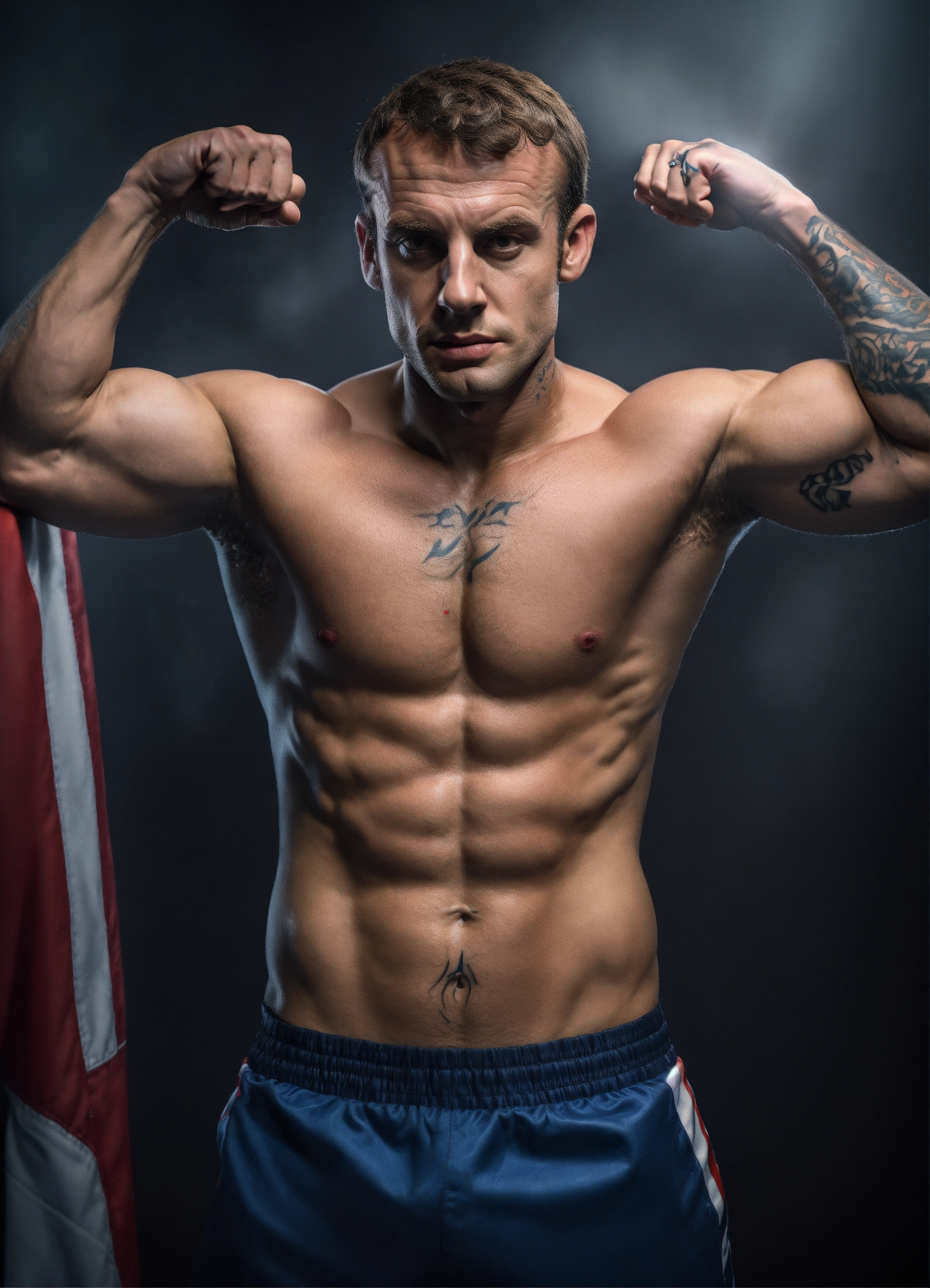 Photographic realistic, ultra detailed, emmanuel macron text "alors les fiotes 49-3 " emmanuel macron in the style of an mma fighter, muscular fit, tattoos, bruises, dead stare, mug shot, studio lighting, promo photo, mma poster, cinematic, product emmanuel macron in the style of an mma fighter, muscular fit, tattoos, bruises, dead stare, mug shot, studio lighting, promo photo, mma poster, cinematic, photo with canon eos 5d mark iv, cinematic, realistic, black background, photo fusion, sfx photo, animated, cinematic