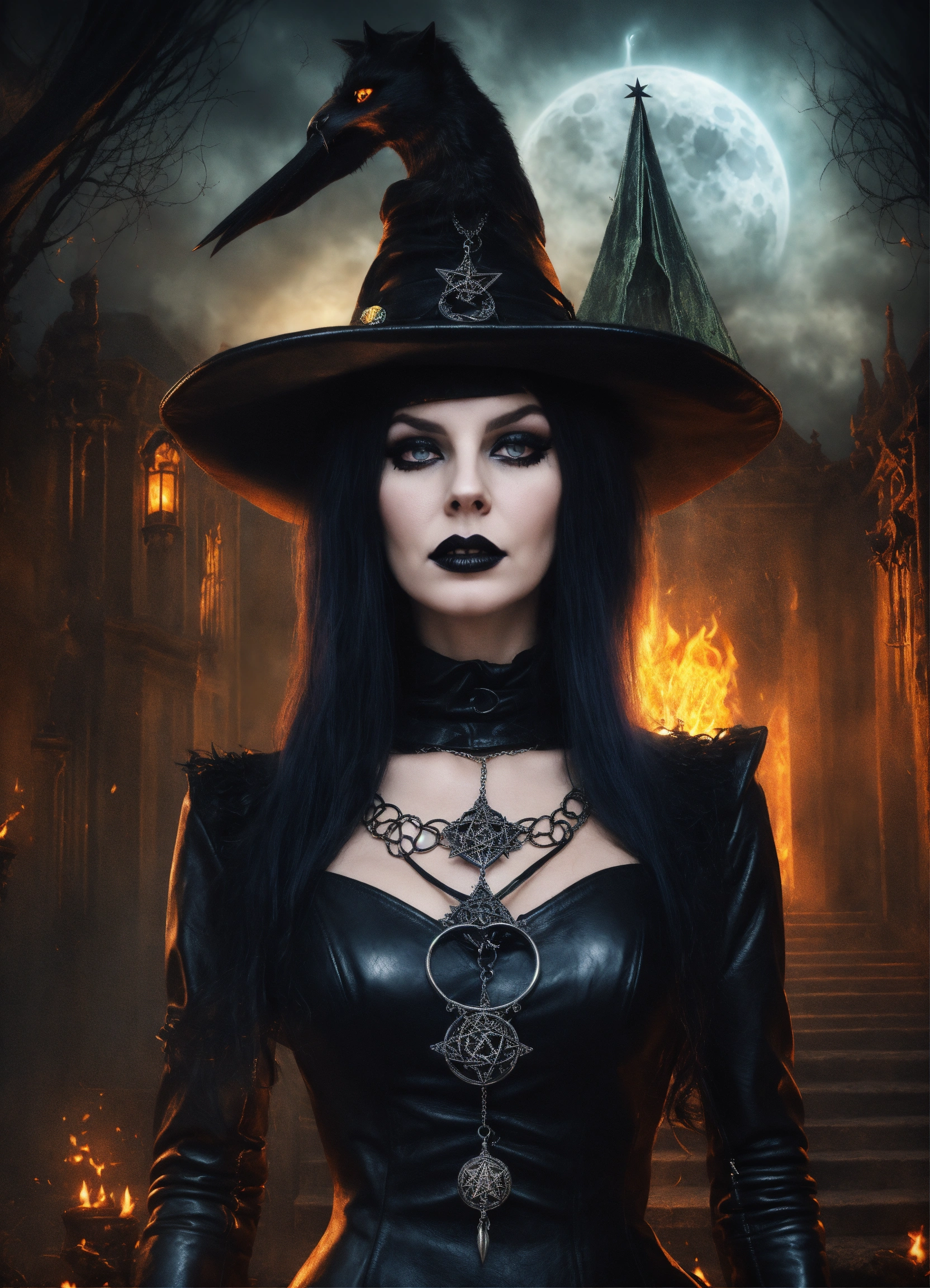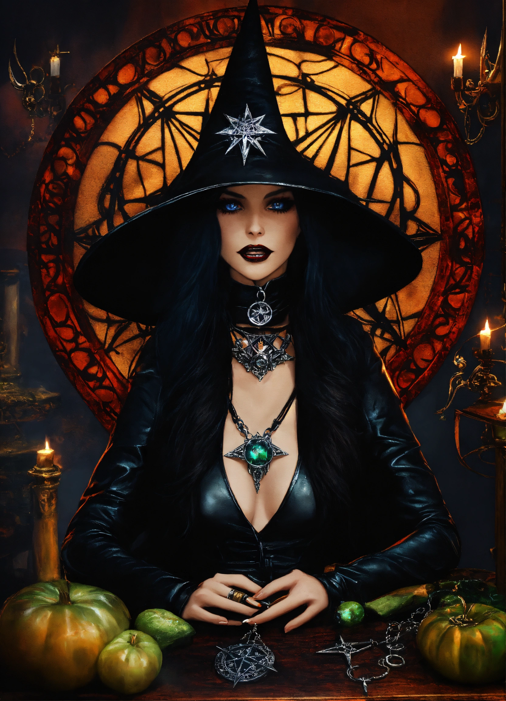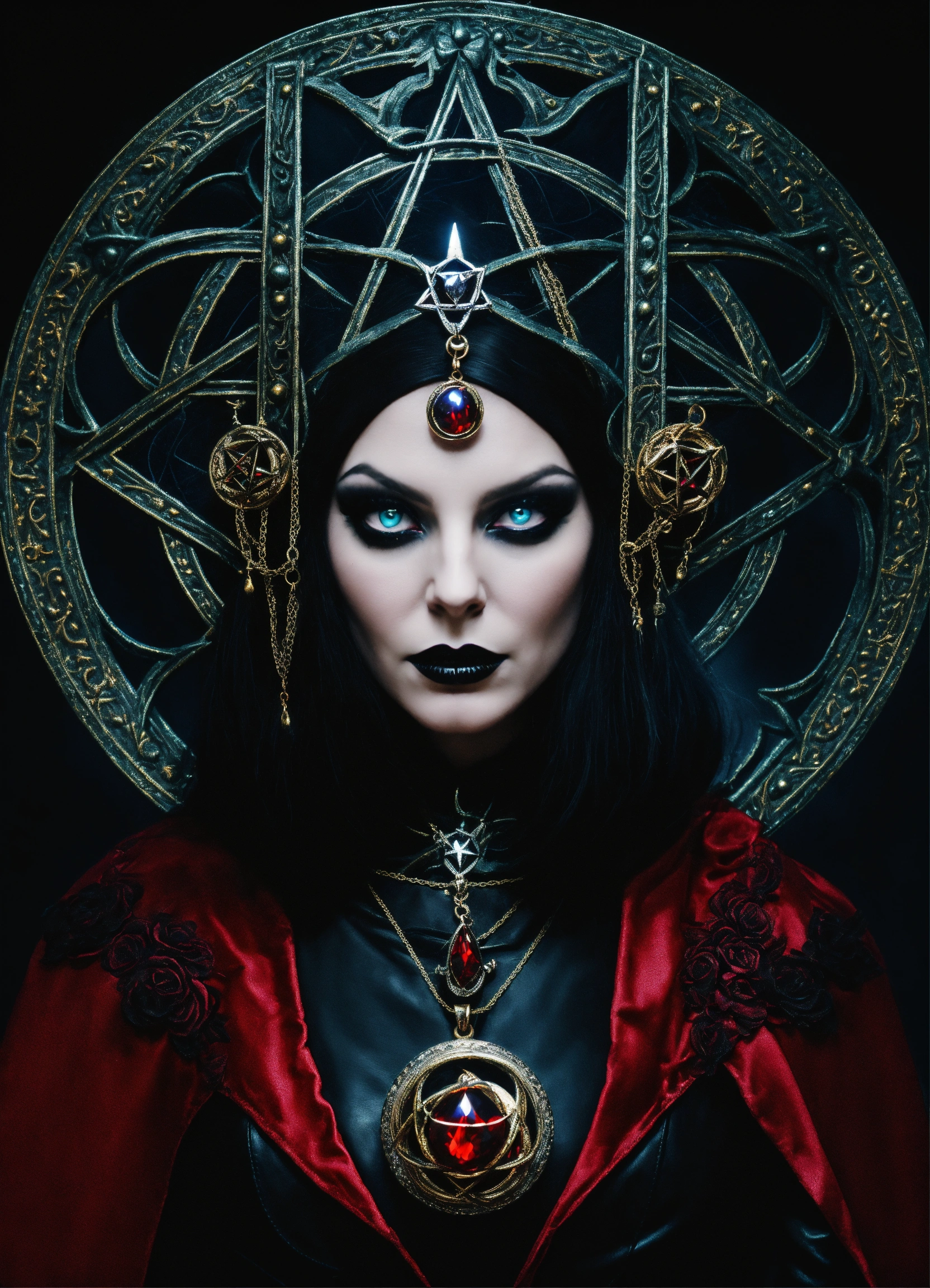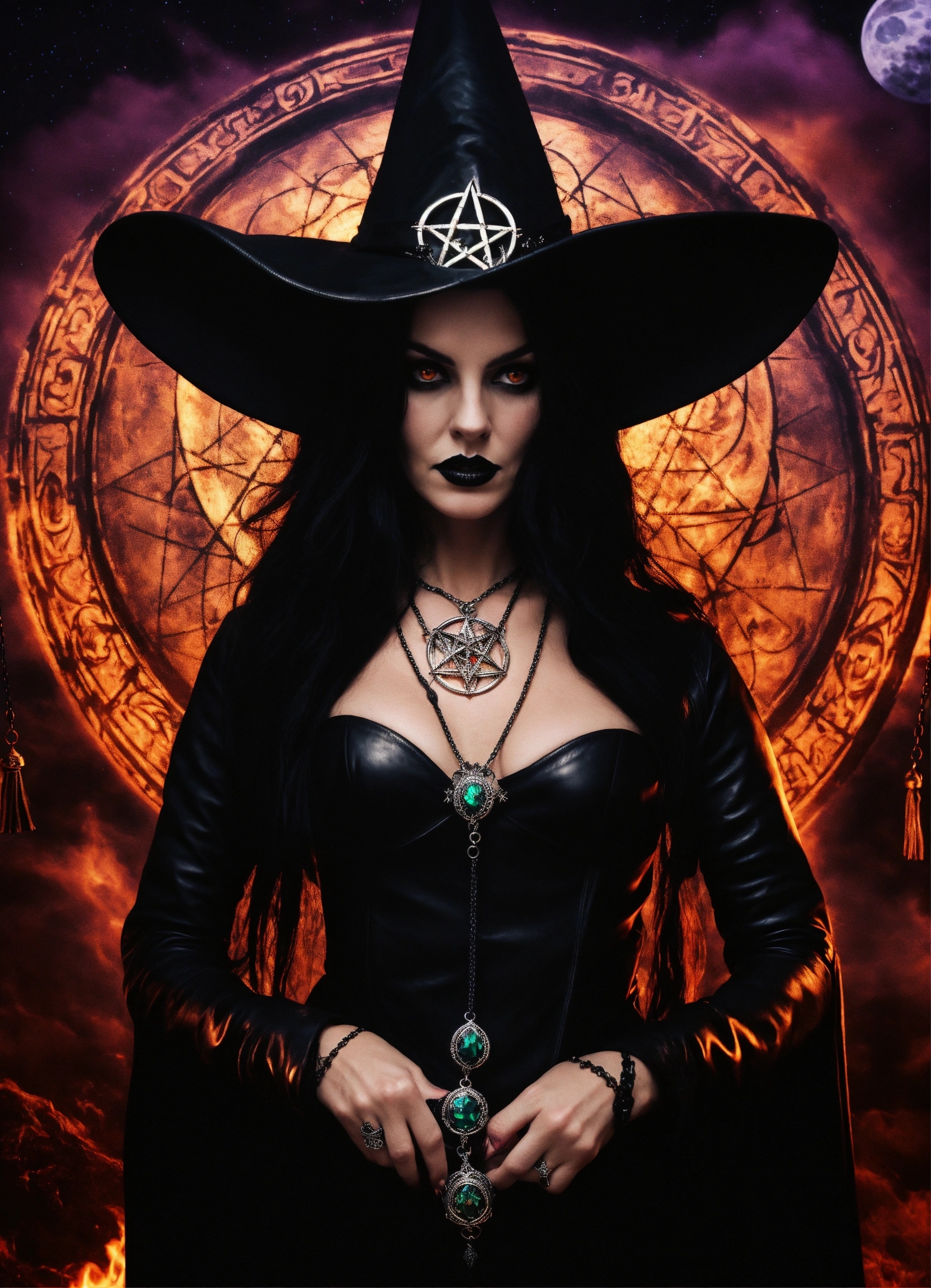 Beautiful extremely evil wicked satanic goth occult dark evil magic witch "morganna shadowmoon" mesmerizing you wearing black leather, evil diabolical wicked extremely powerful hypnotizing "endora ursula medusa" "doom gaze eyes", 5-point pentagram pendant necklace, "black magic"sorceress who rules the universe all realms & all dimensions, wearing powerfully hypnotic jewelry, witch controls everyone's mind