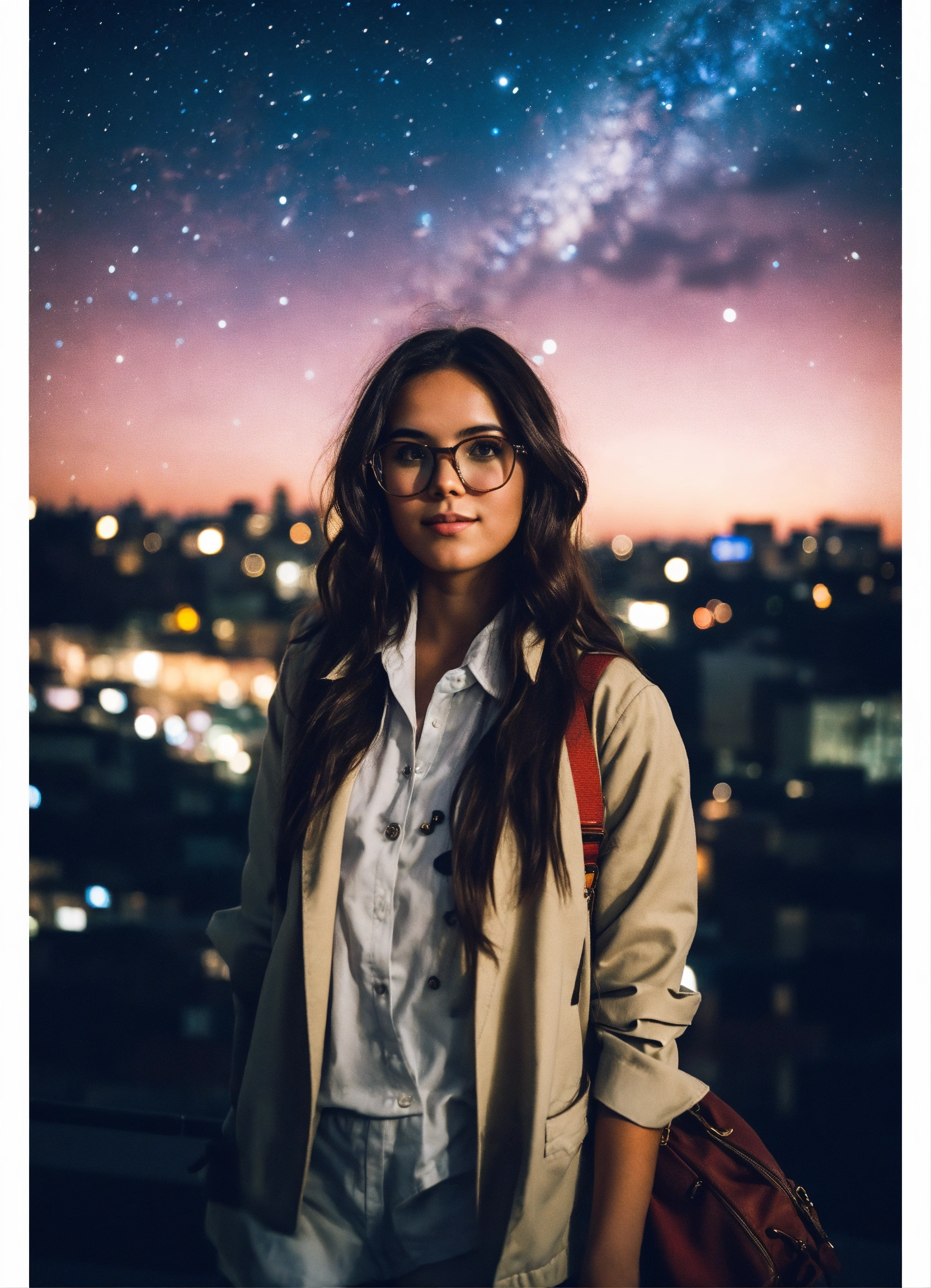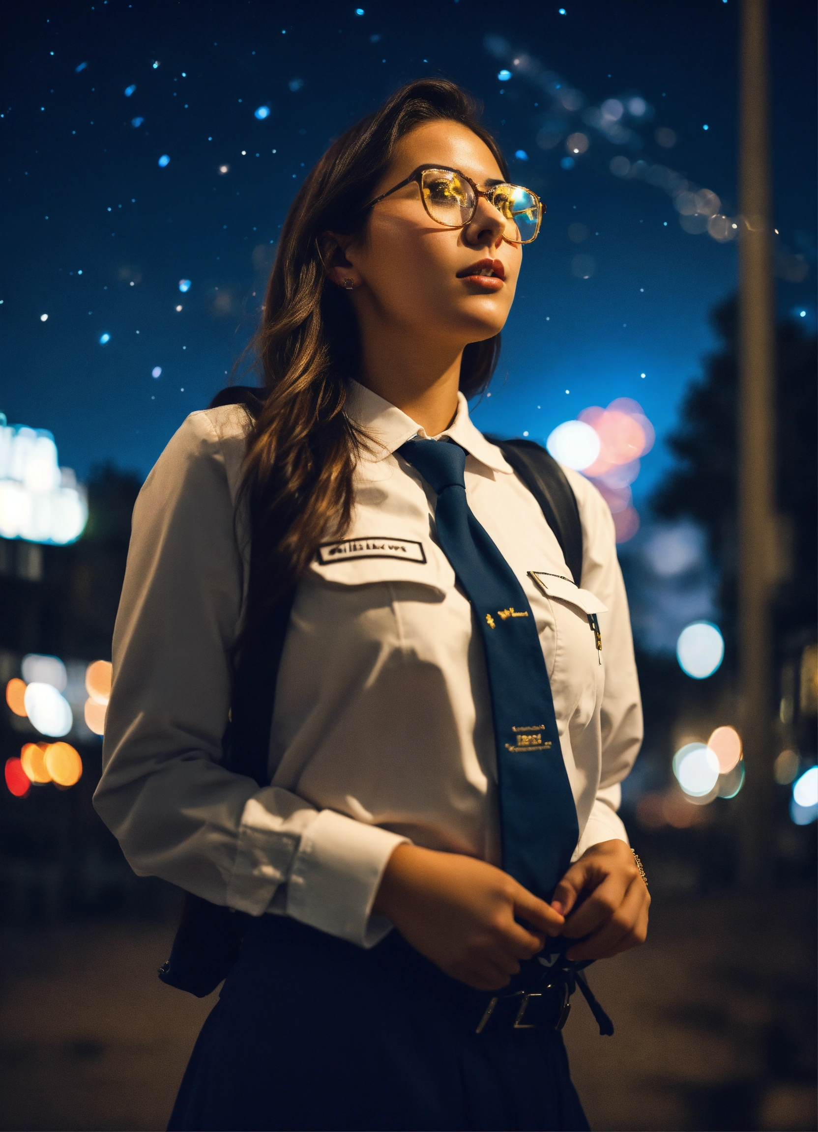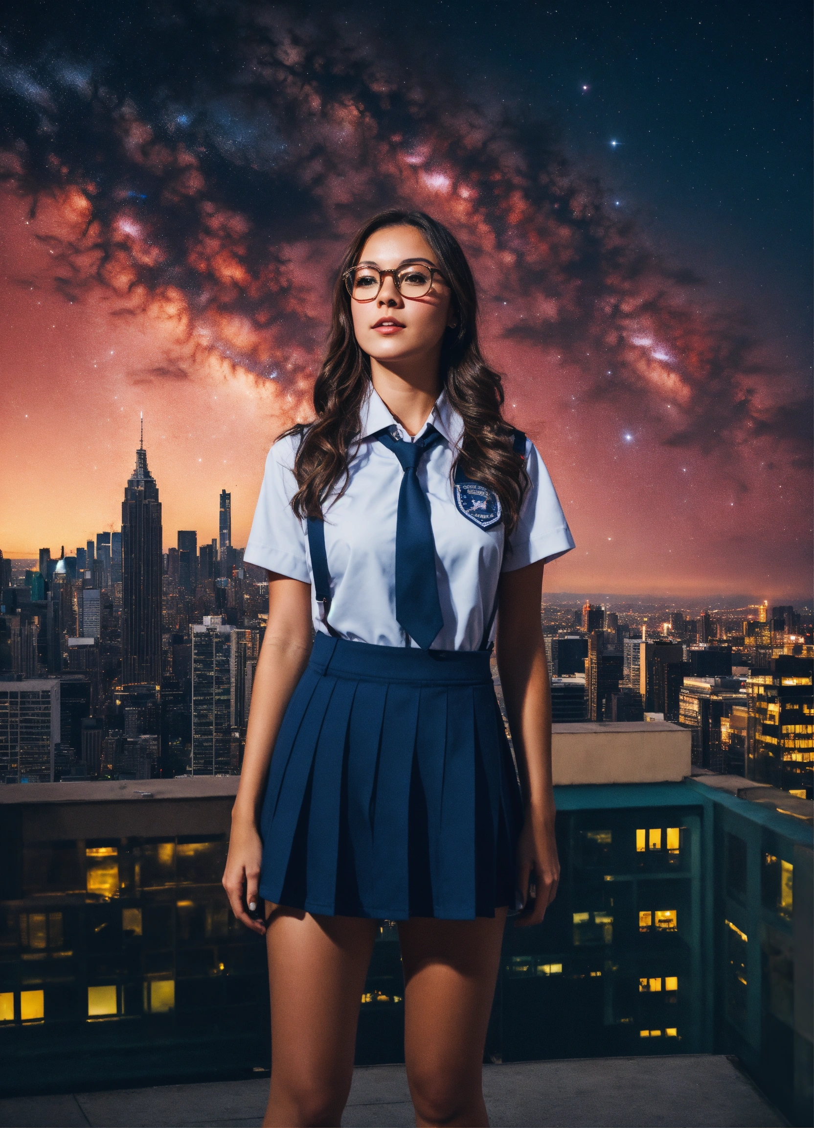 A real photo of a cute 28 year old hot brunette girl wearing a hot schoolgirl uniform hot glasses standing in a city, in the sky we see the milky-way