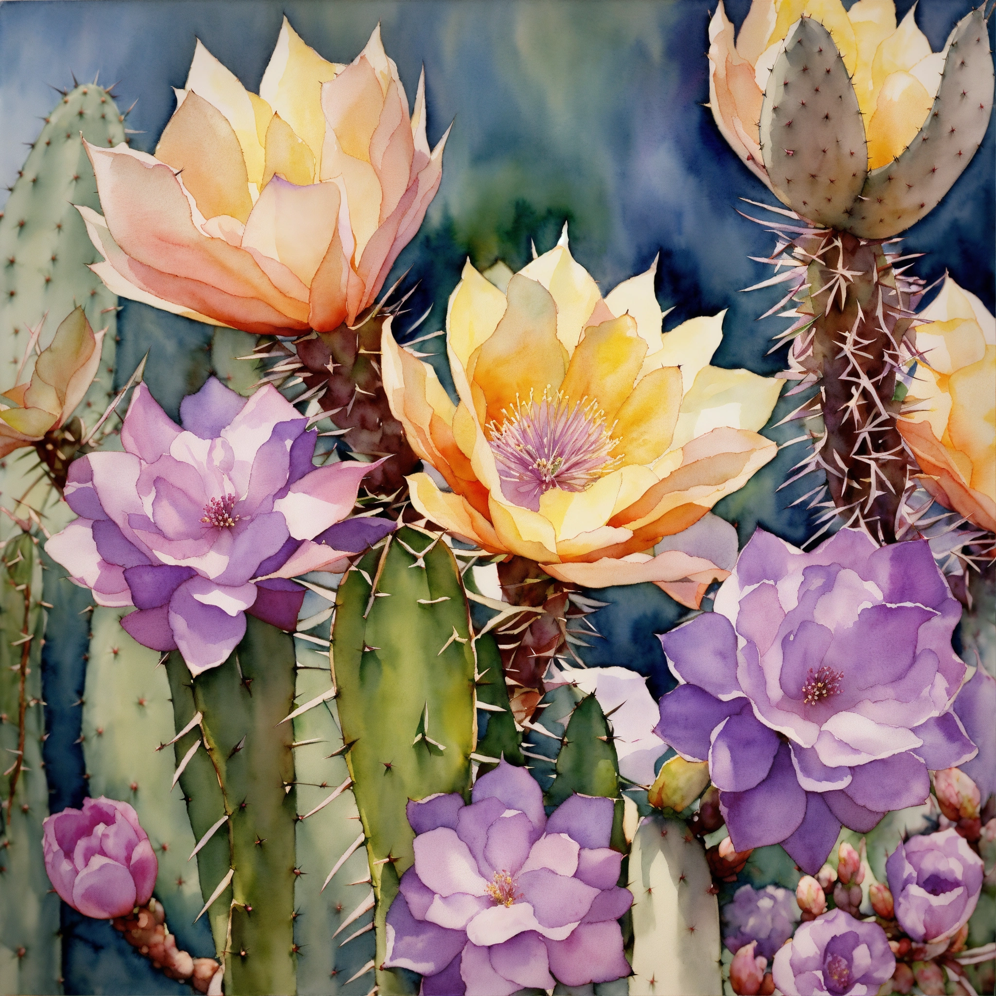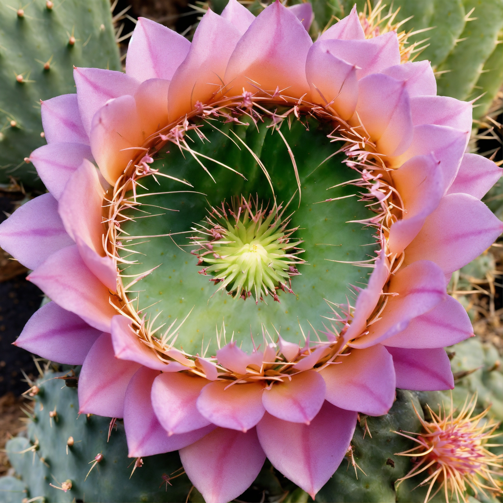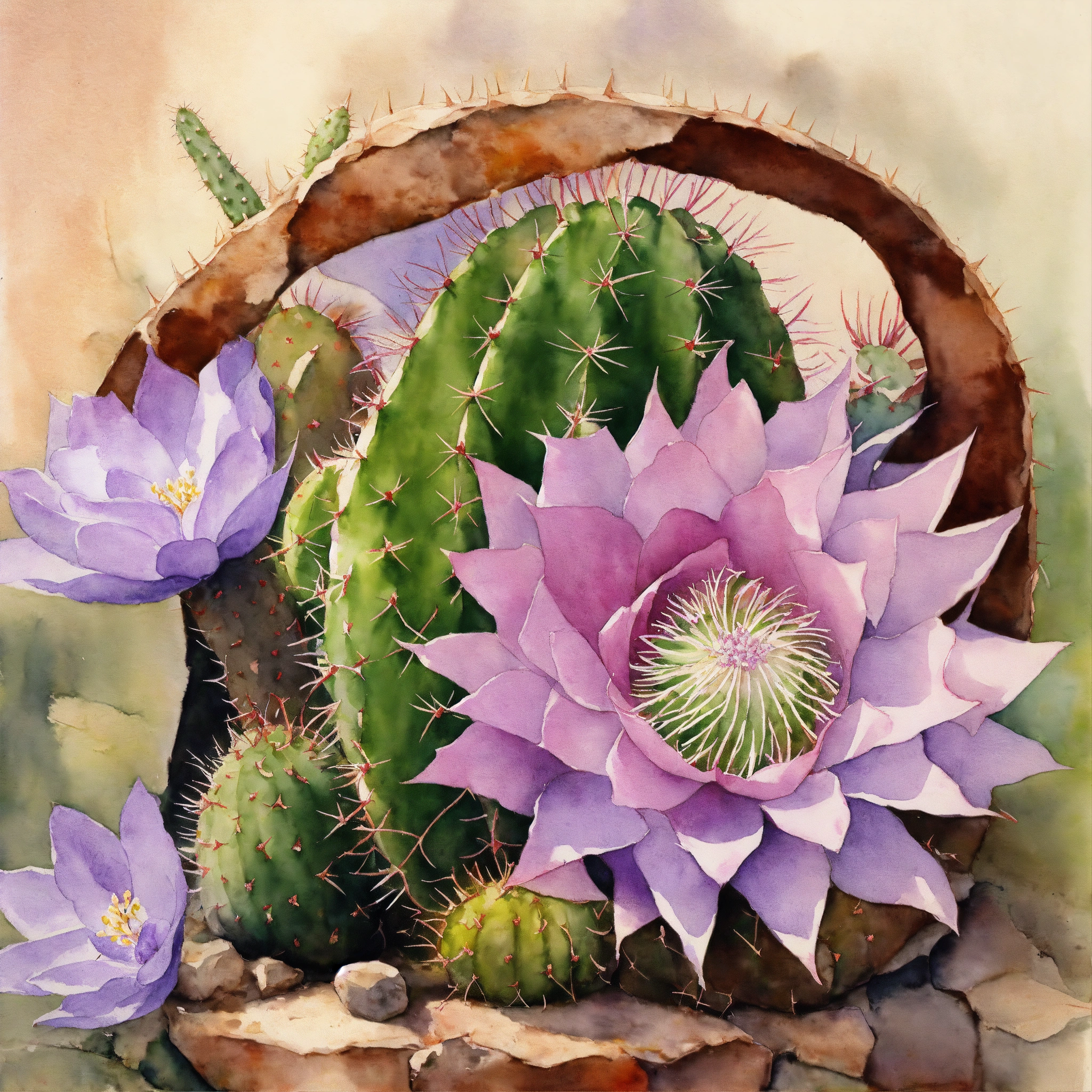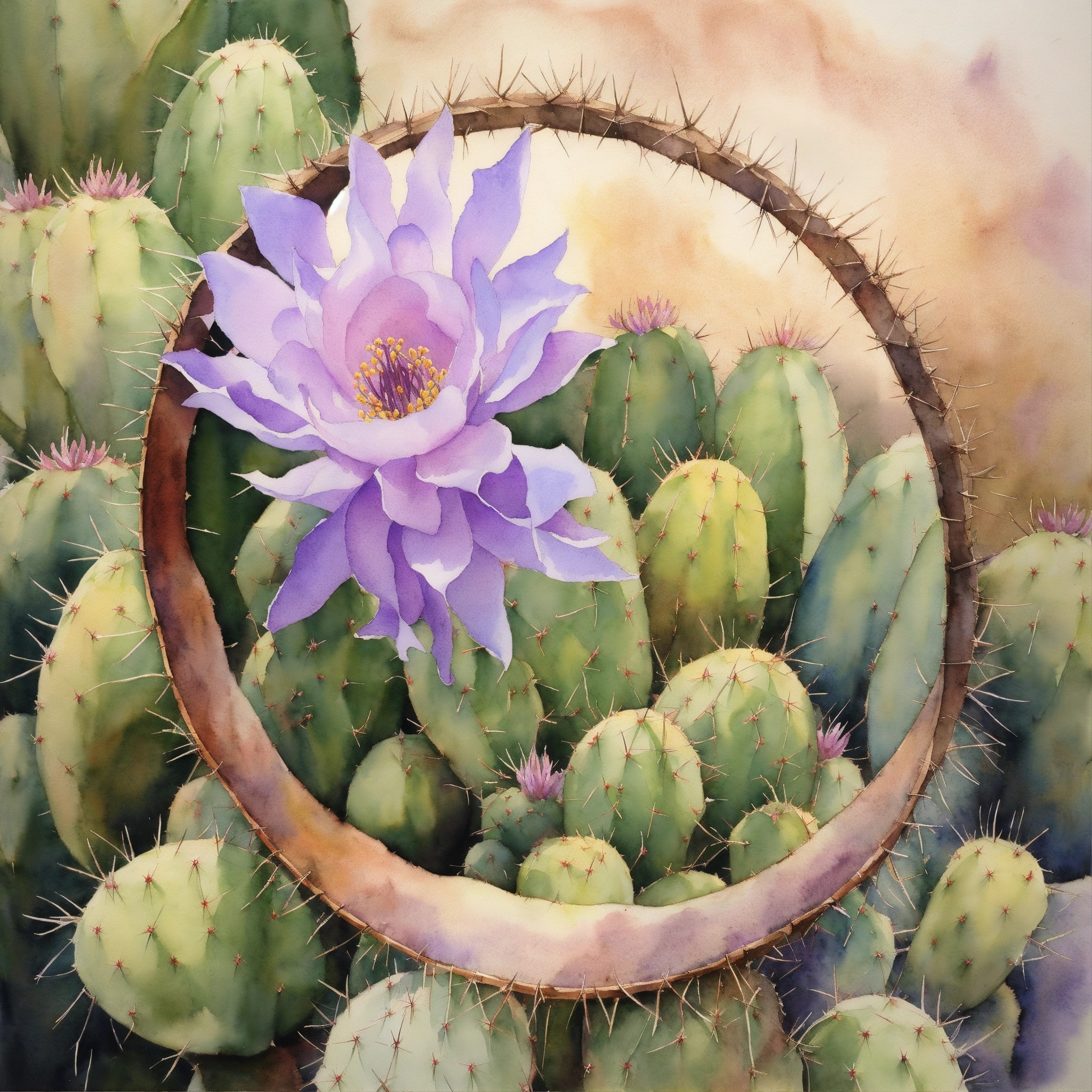 Old-world botanical sketch, subtle watercolor touches, (a cactus, thorns, delicate lilac blooms, in the mesmerizing form of a möbius strip), nature’s diverse beauty, mathematical intrigue