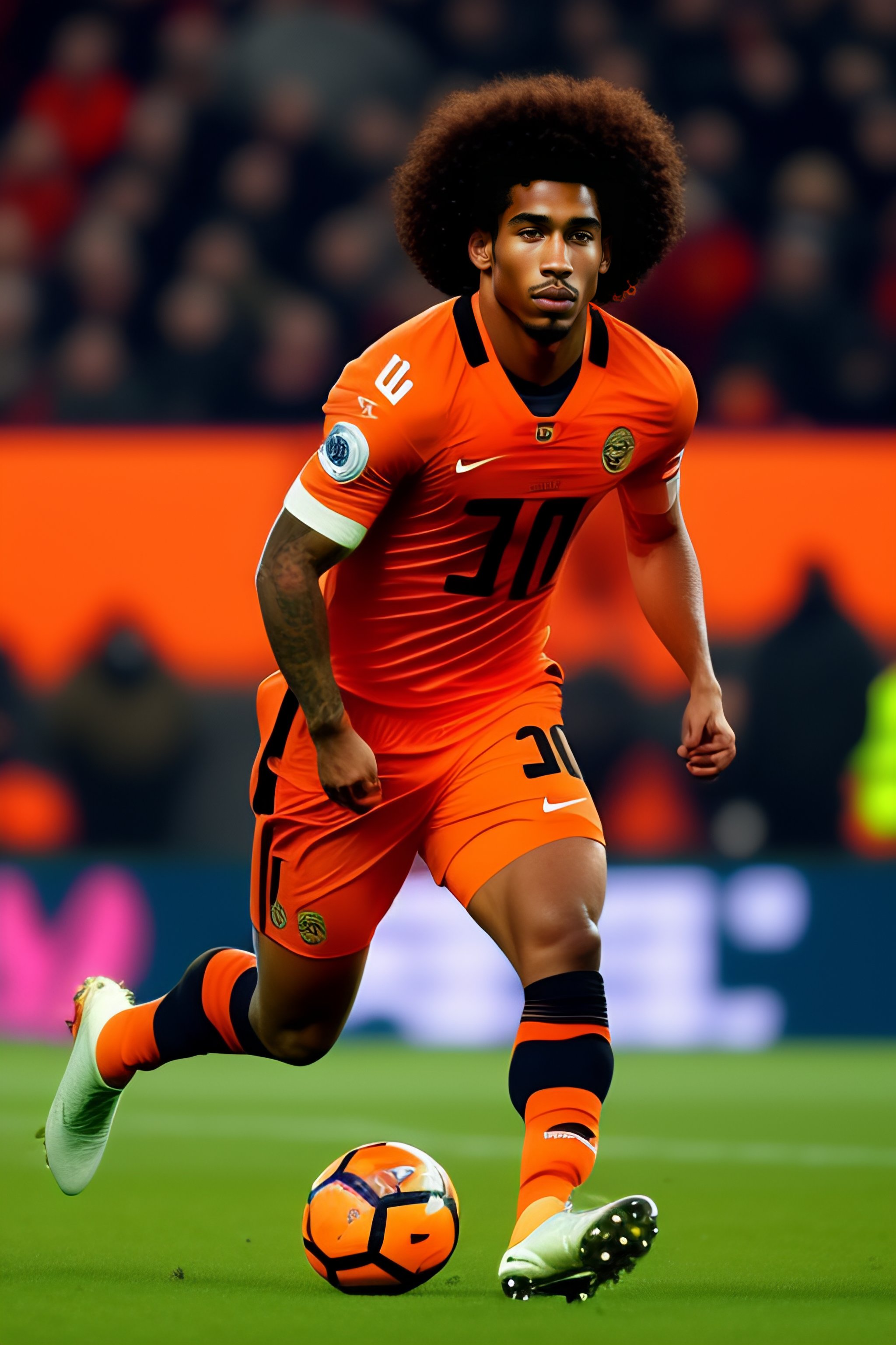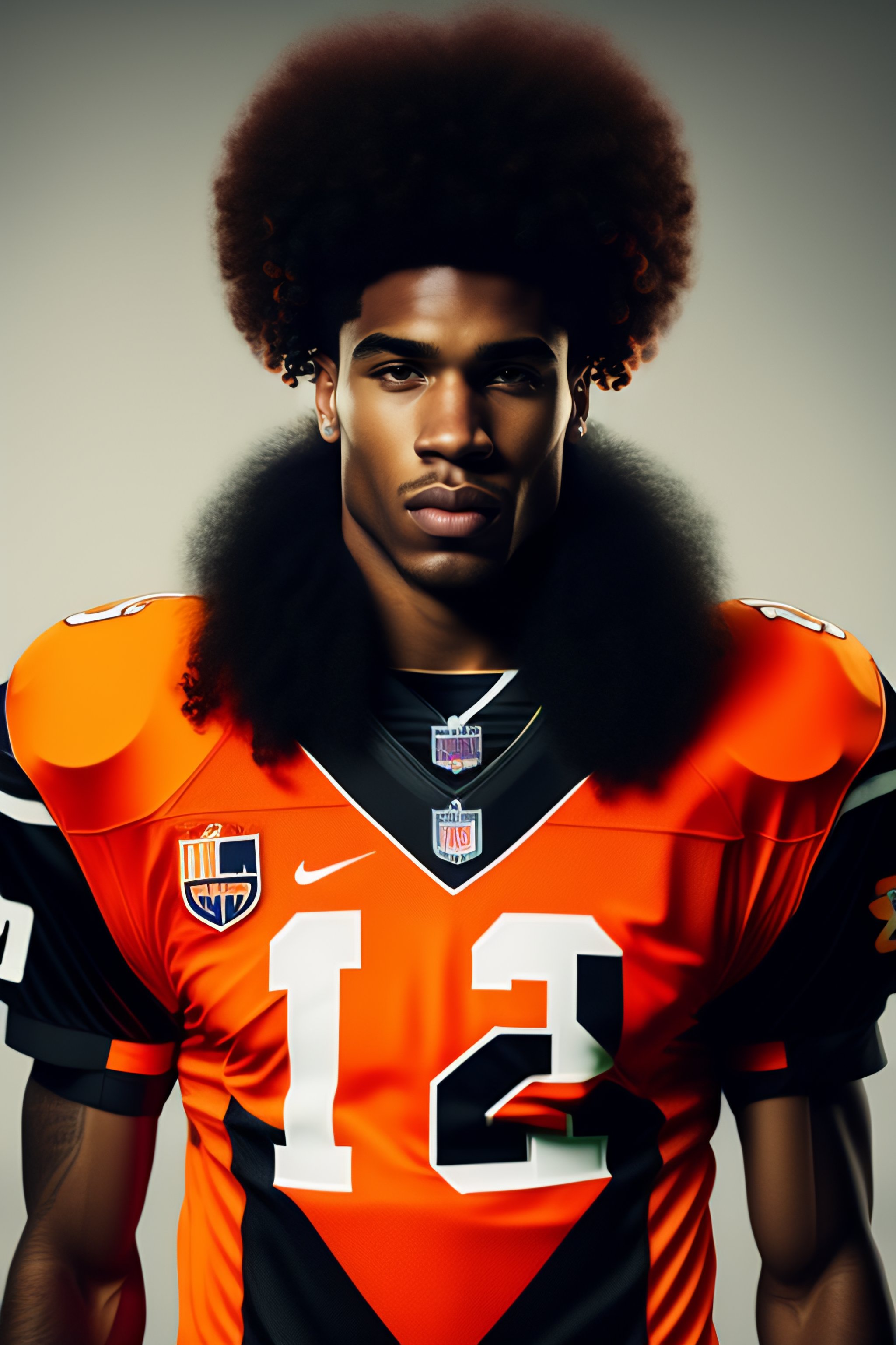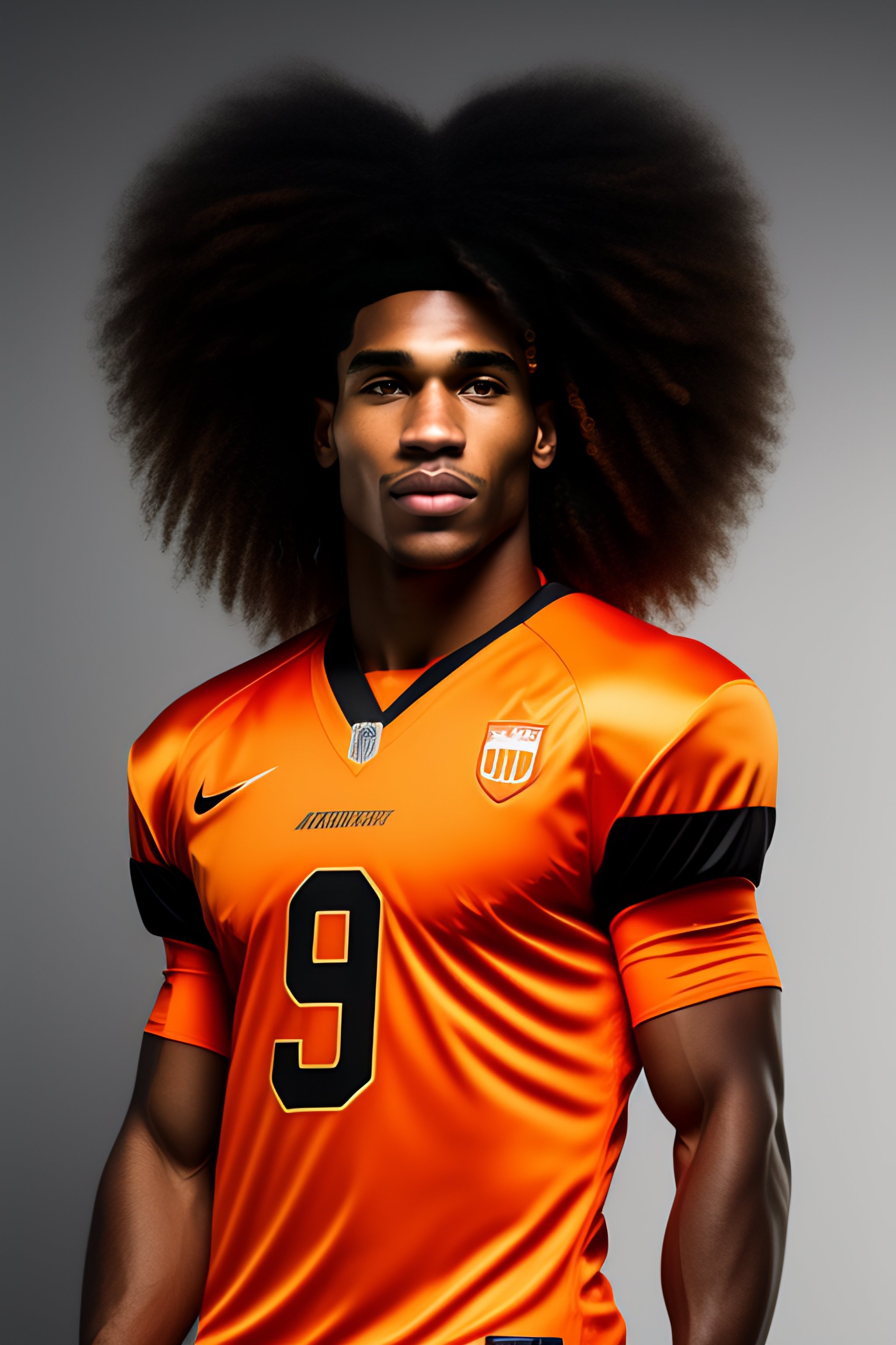 Biracial football player with curly hair and black and orange outfit