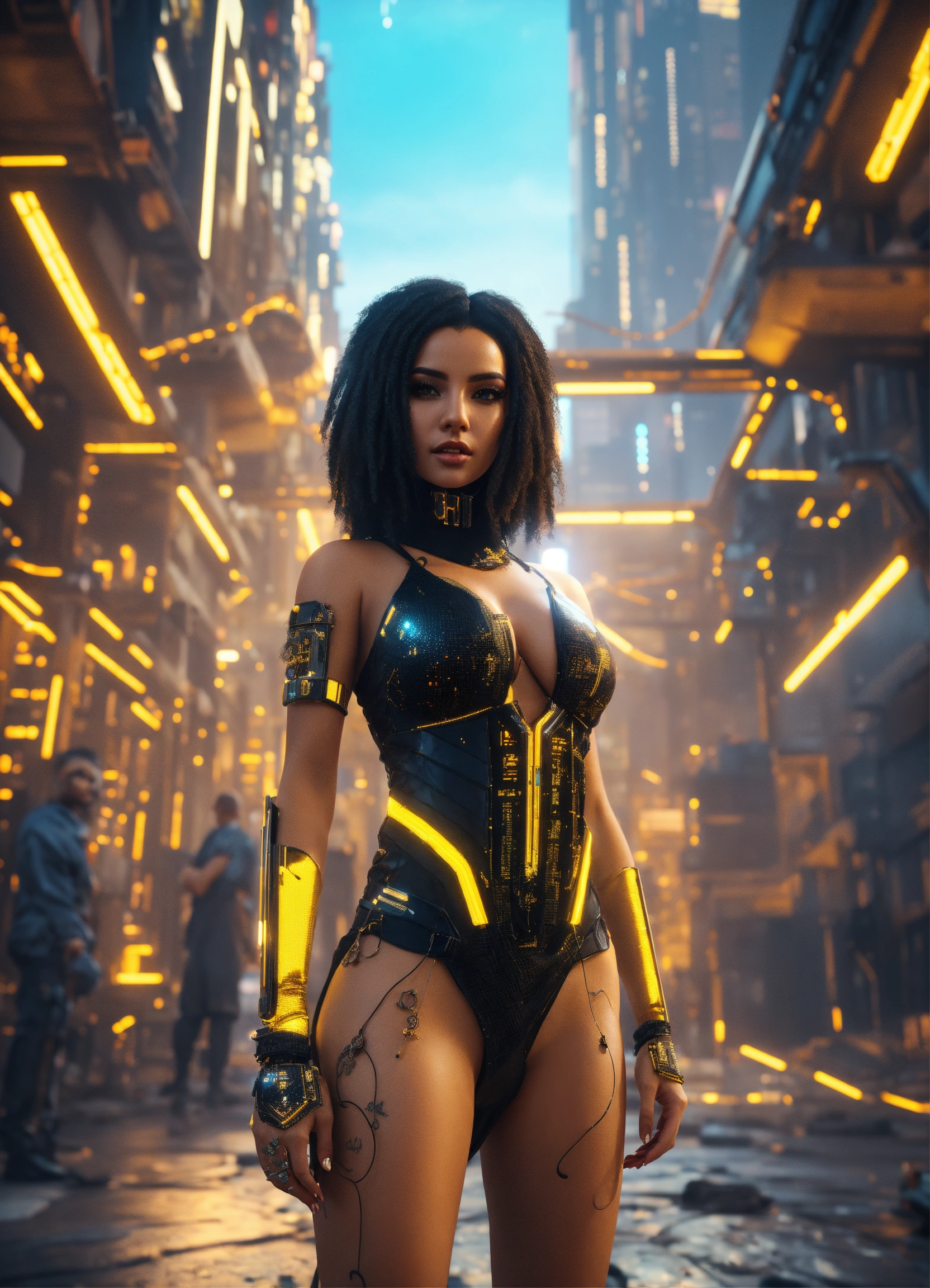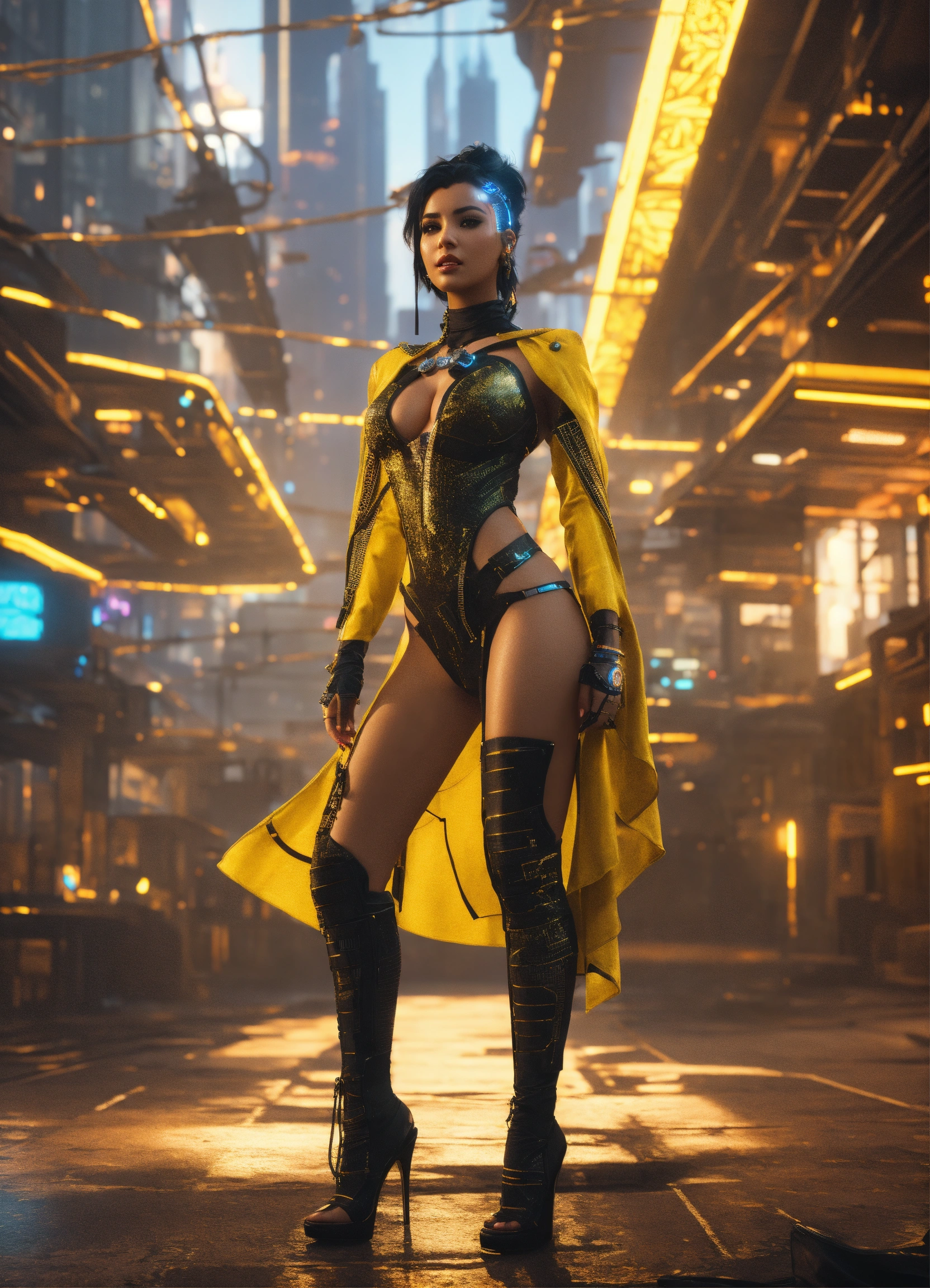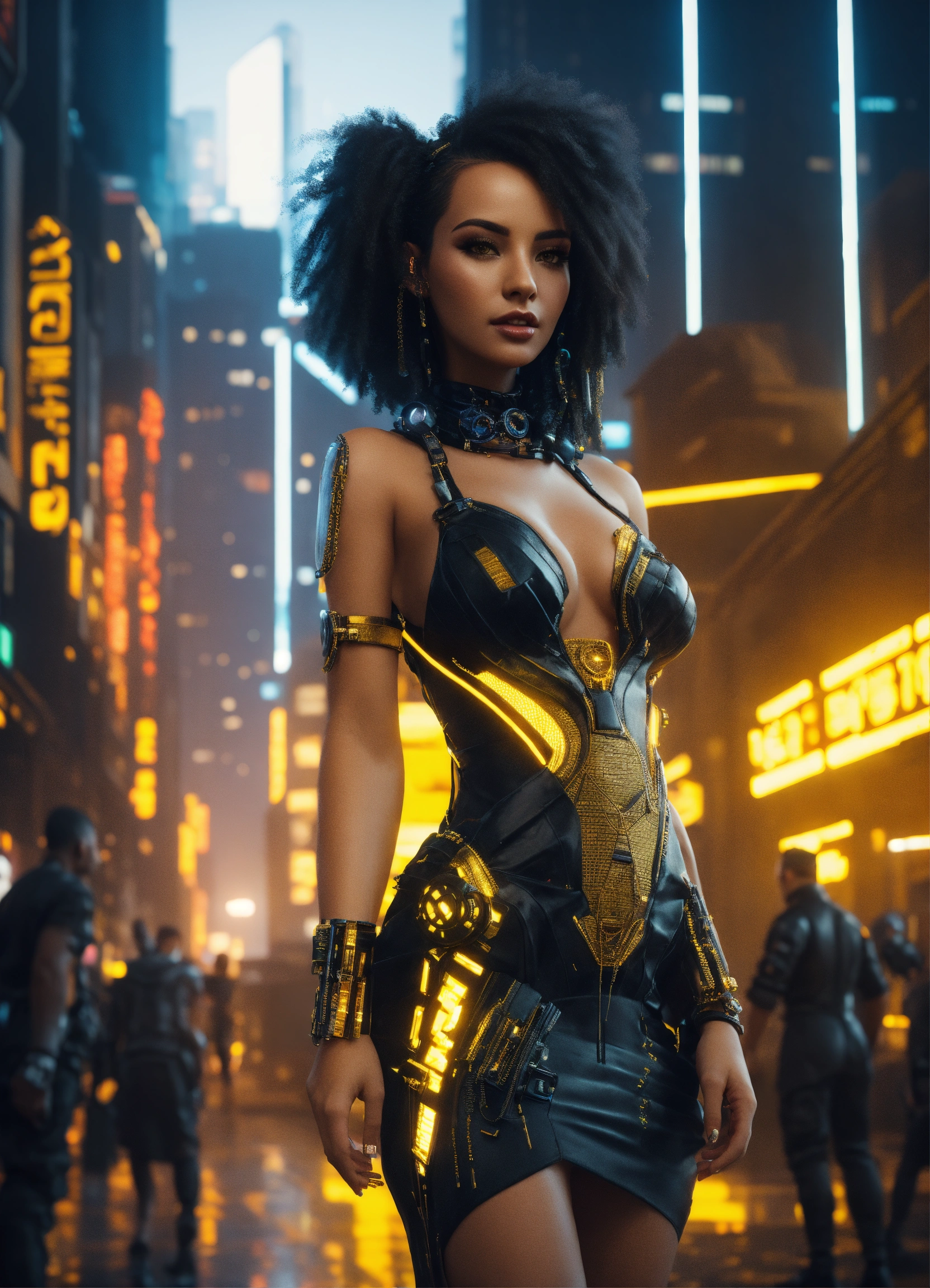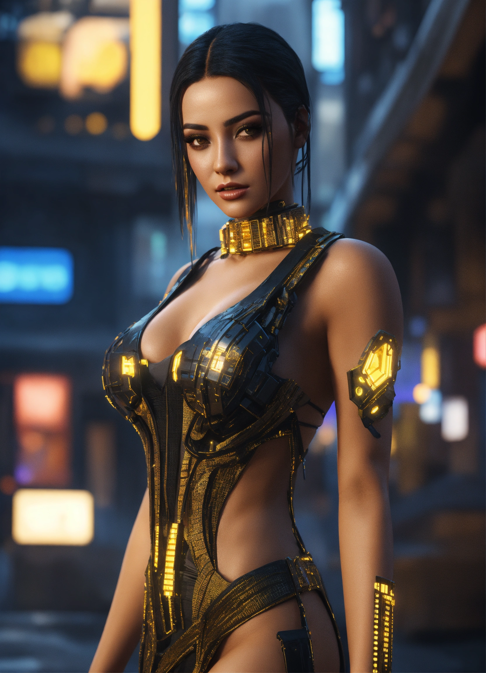 Beautiful egyptian bimbo wearing a low cut black and citrine dress, cyberpunk, in a futuristic cityscape, hyper detailed, digital art, cyberpunk style, cybercinematic lighting, studio quality, smooth render, unreal engine 5 rendered, octane rendered, face view
